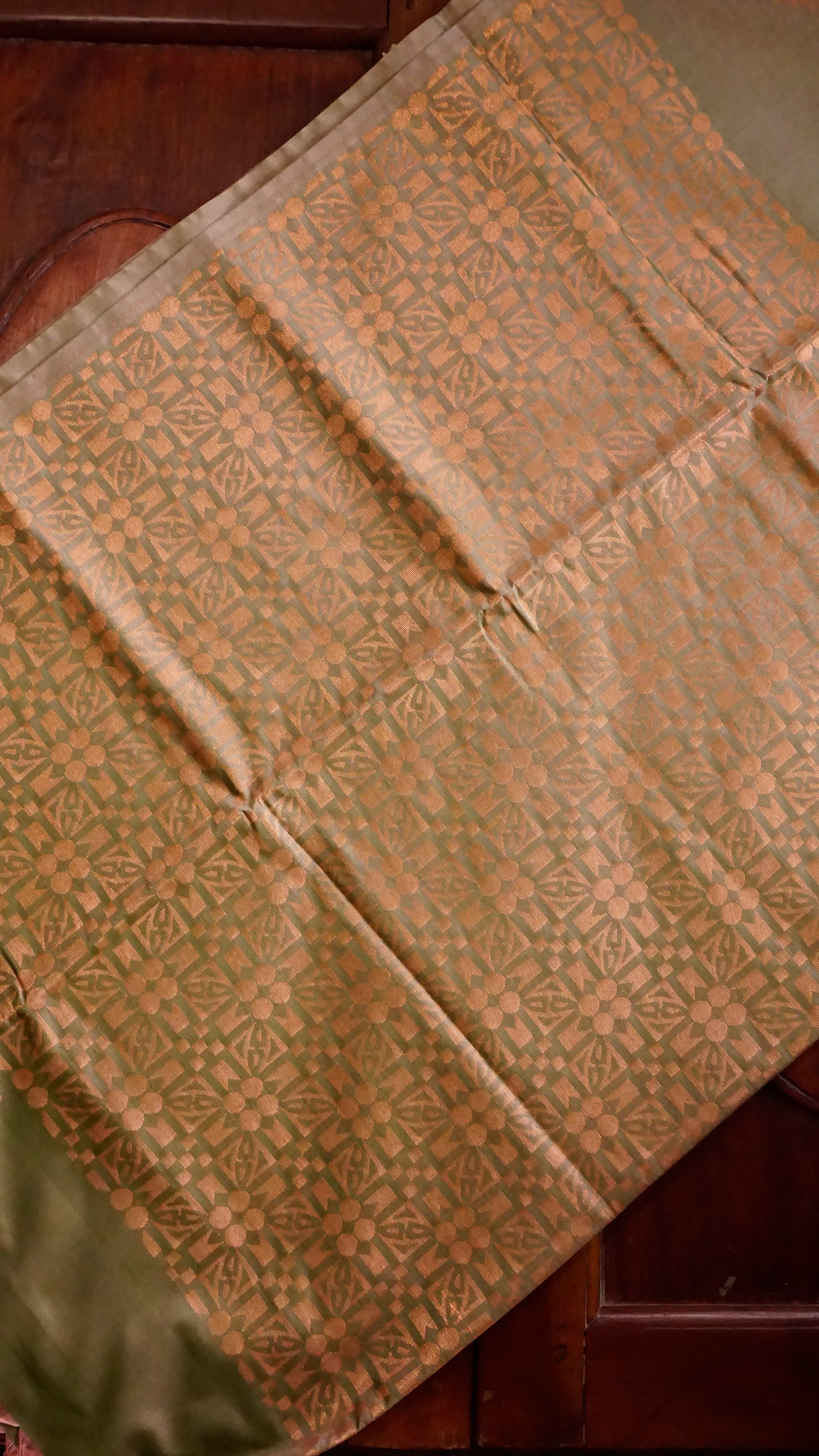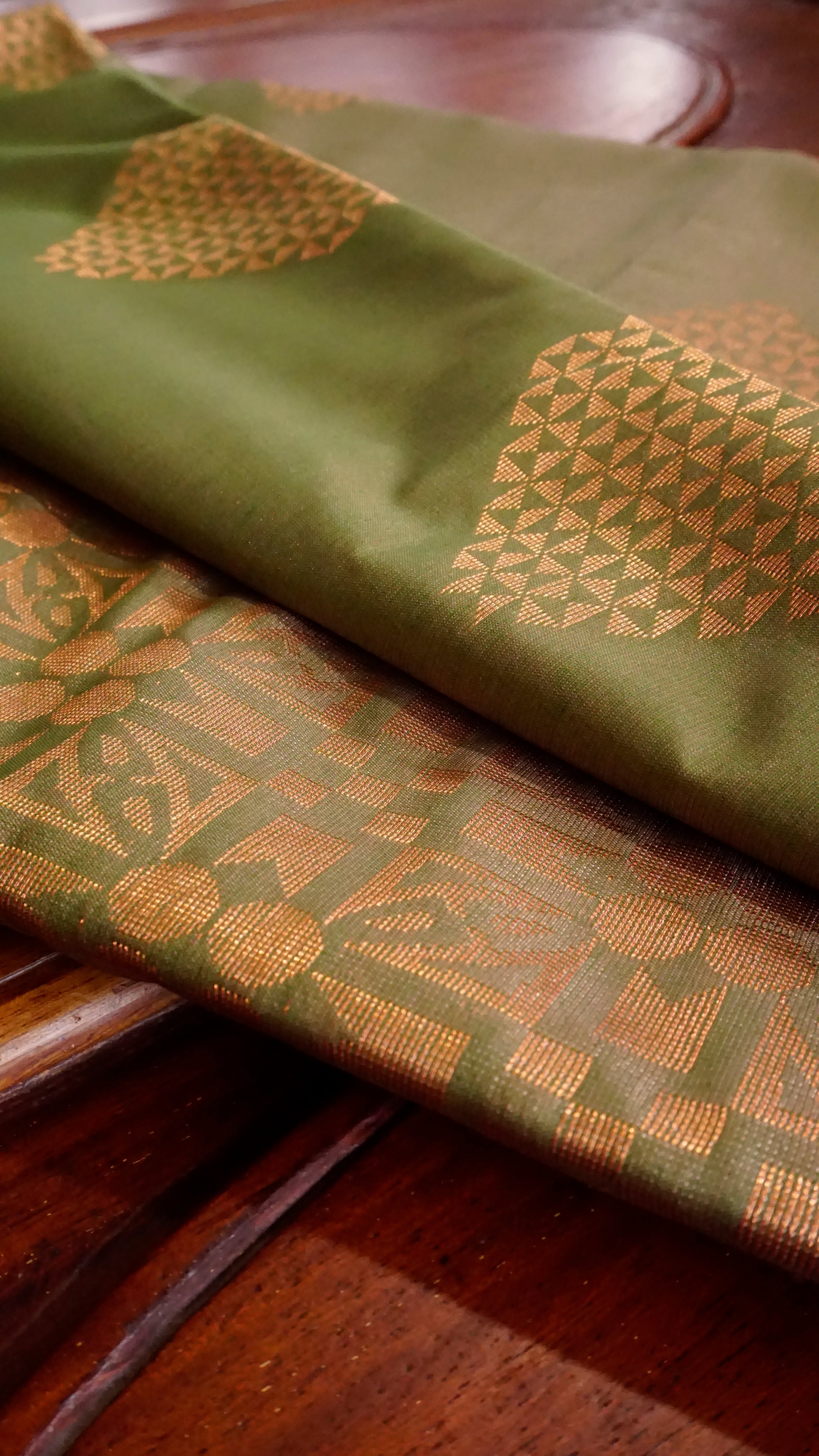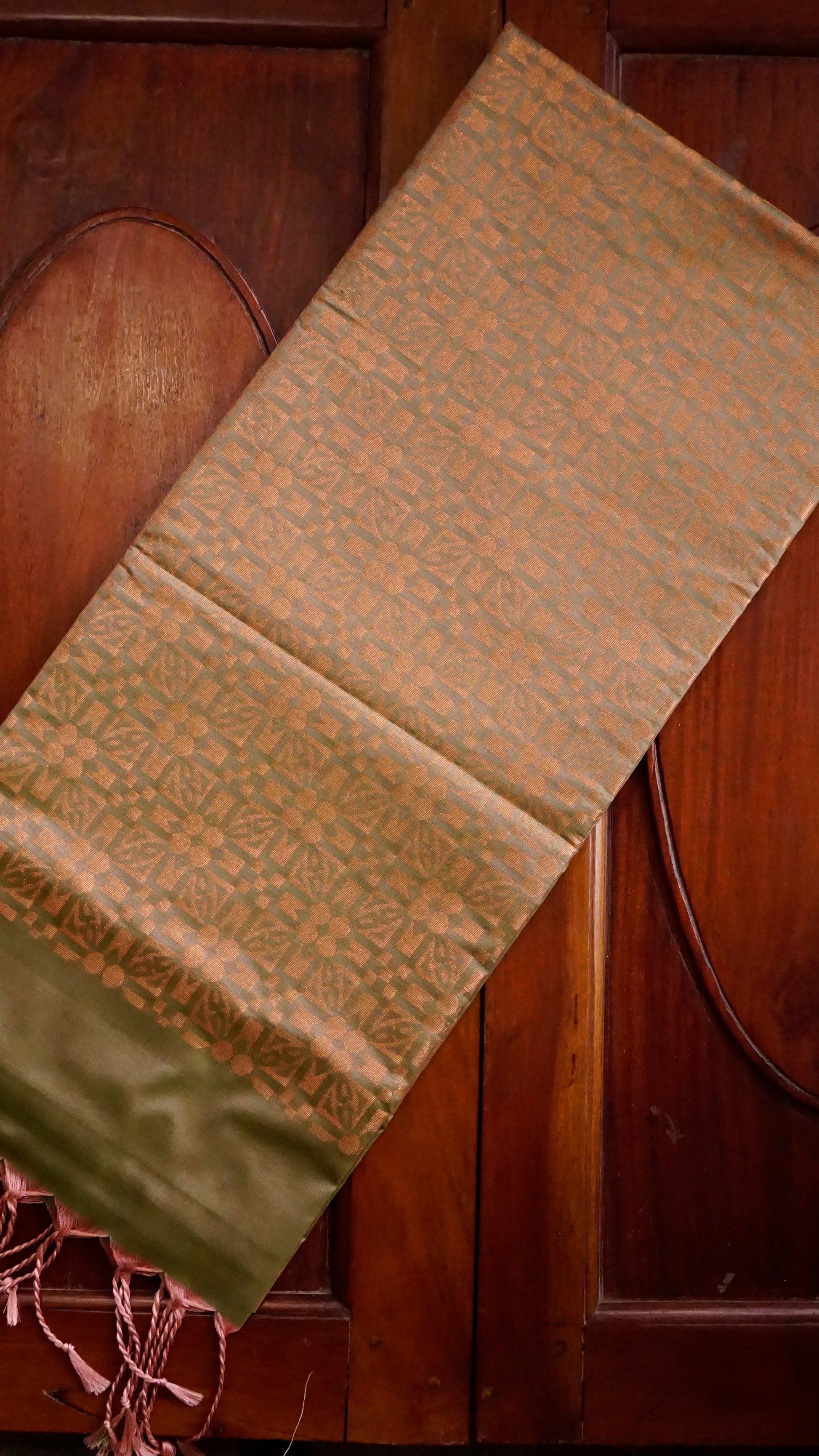 By its gorgeous copper zari floral and geometric weaving across the body and pallu, this olive green semi-silk saree exudes elegance. The saree has a rich yet understated beauty thanks to its tasteful fusion of traditional elements in a contemporary style.