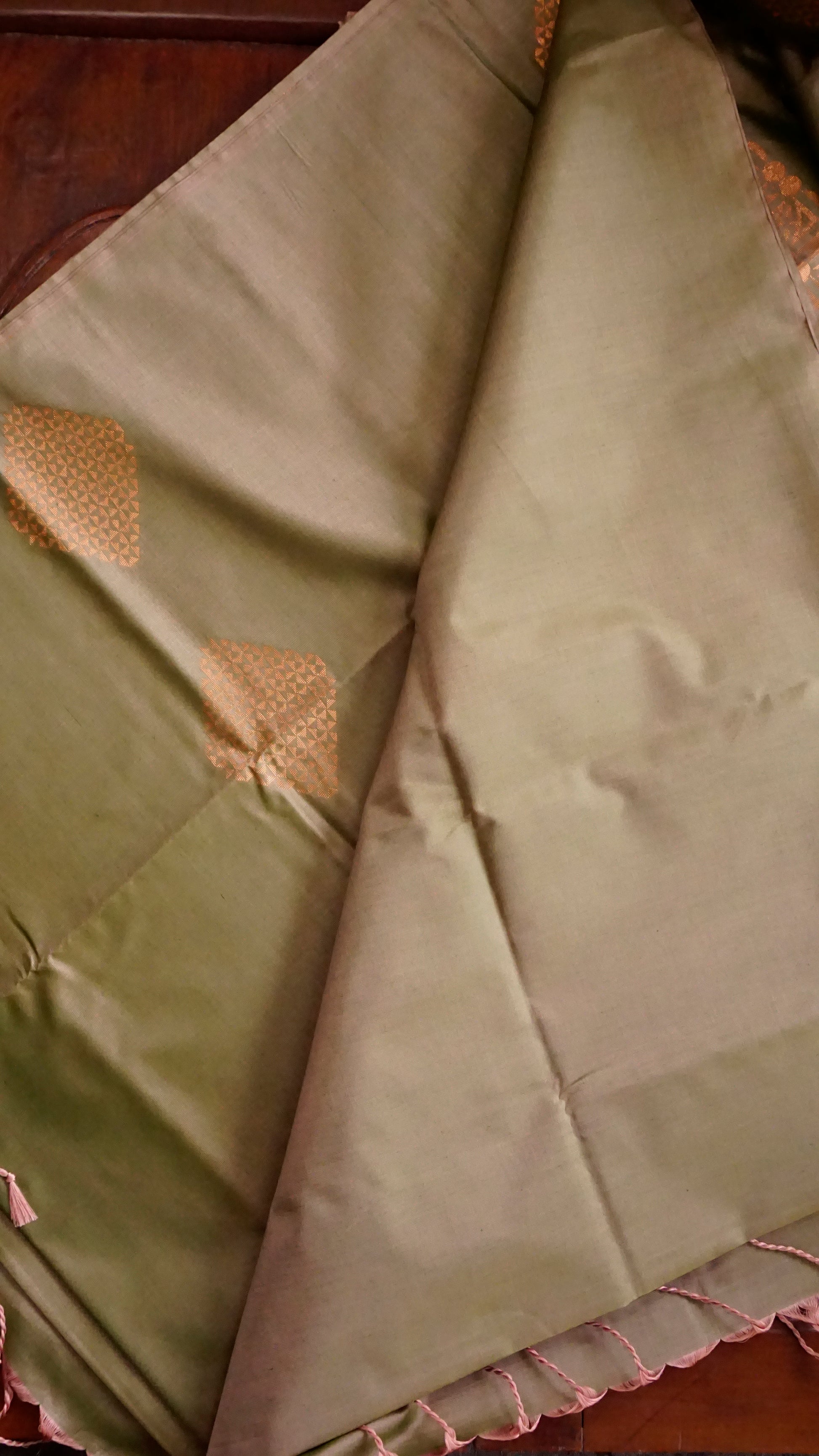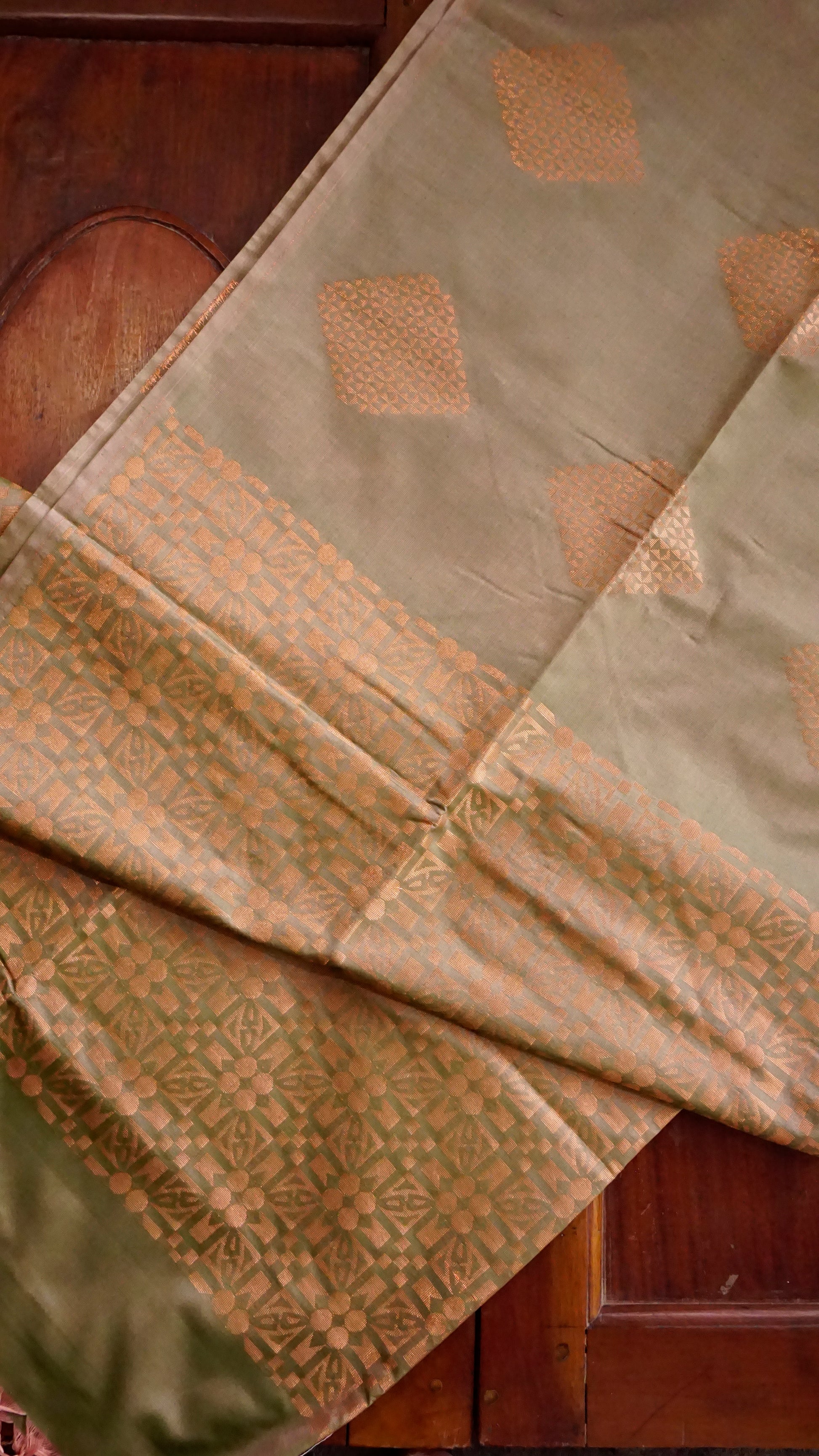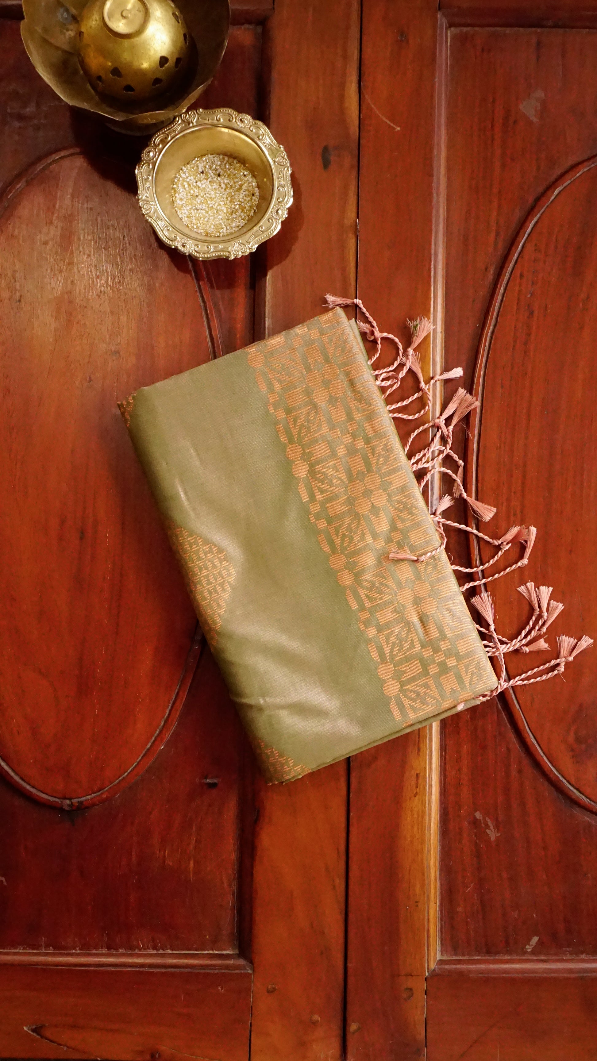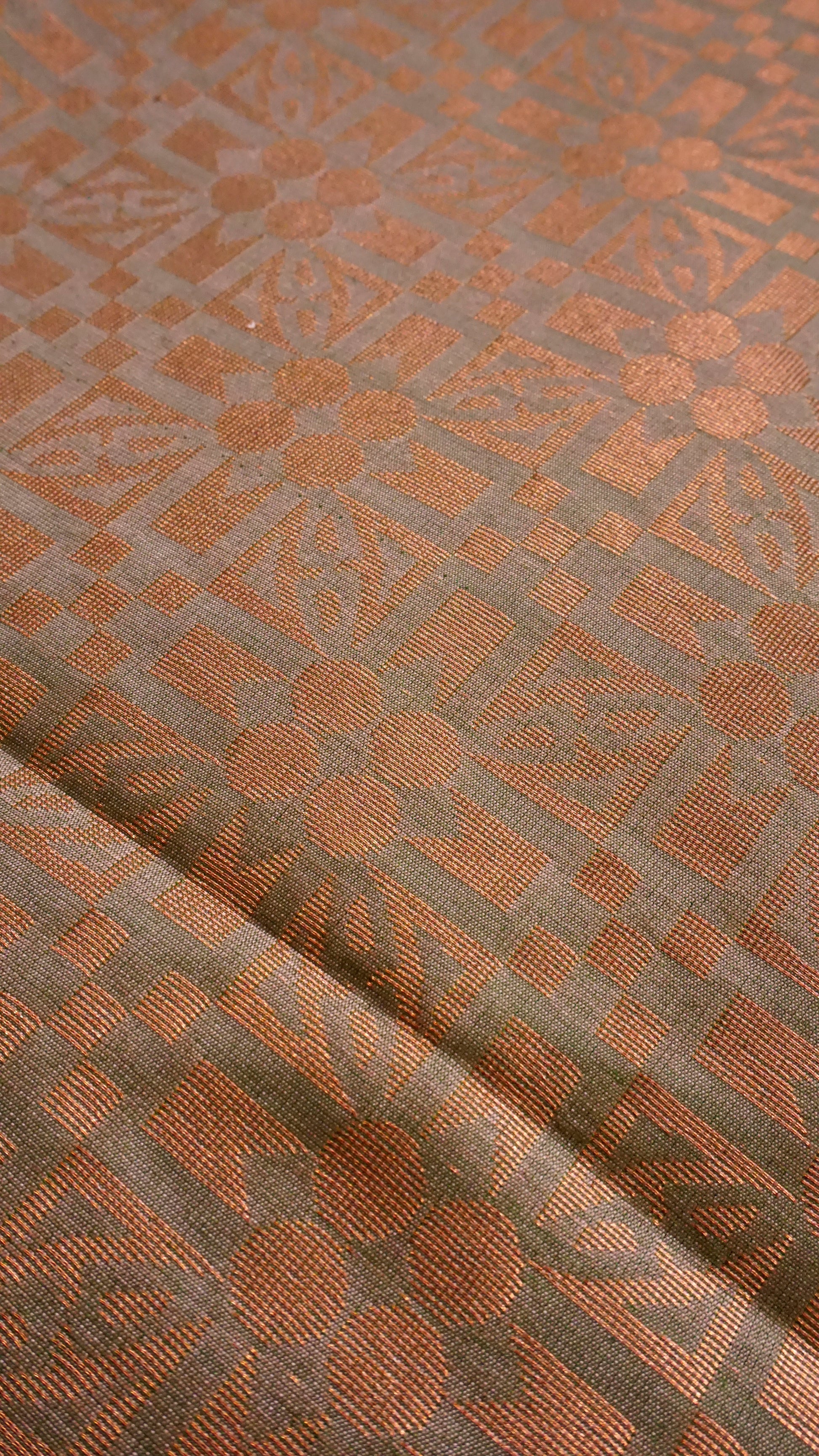 By its gorgeous copper zari floral and geometric weaving across the body and pallu, this olive green semi-silk saree exudes elegance. The saree has a rich yet understated beauty thanks to its tasteful fusion of traditional elements in a contemporary style.