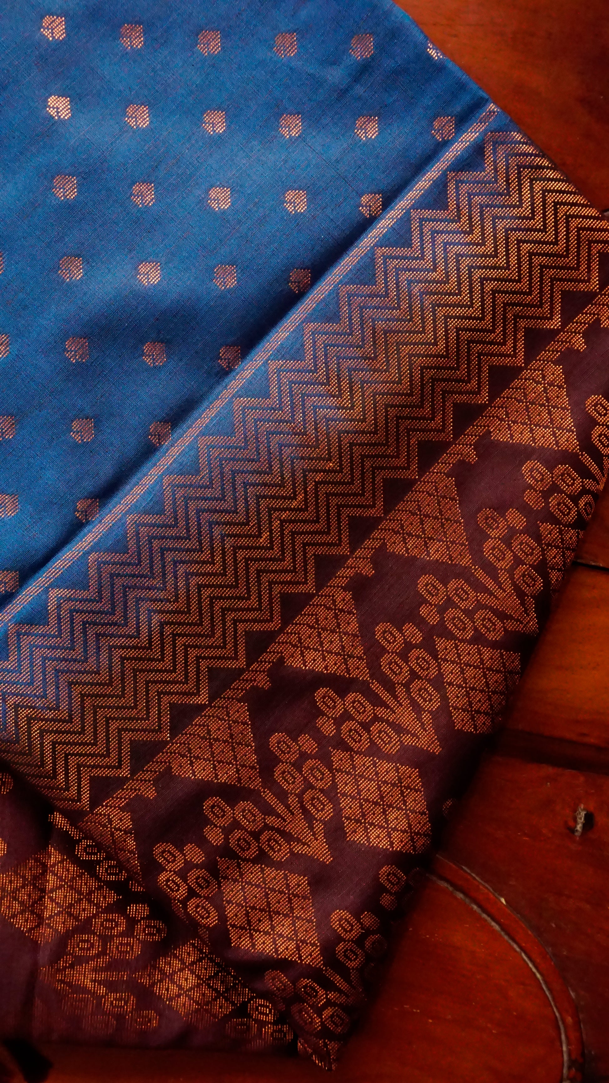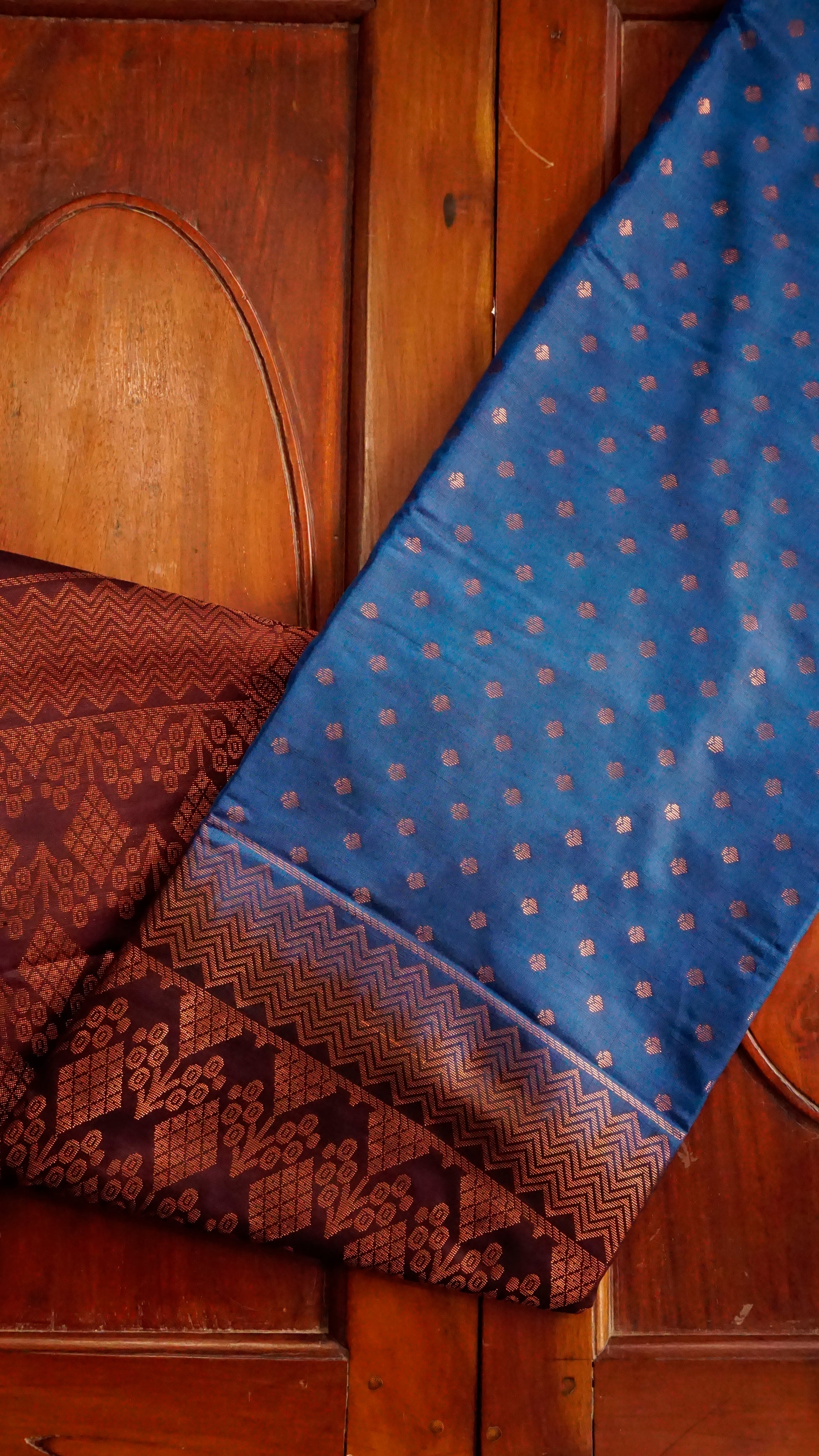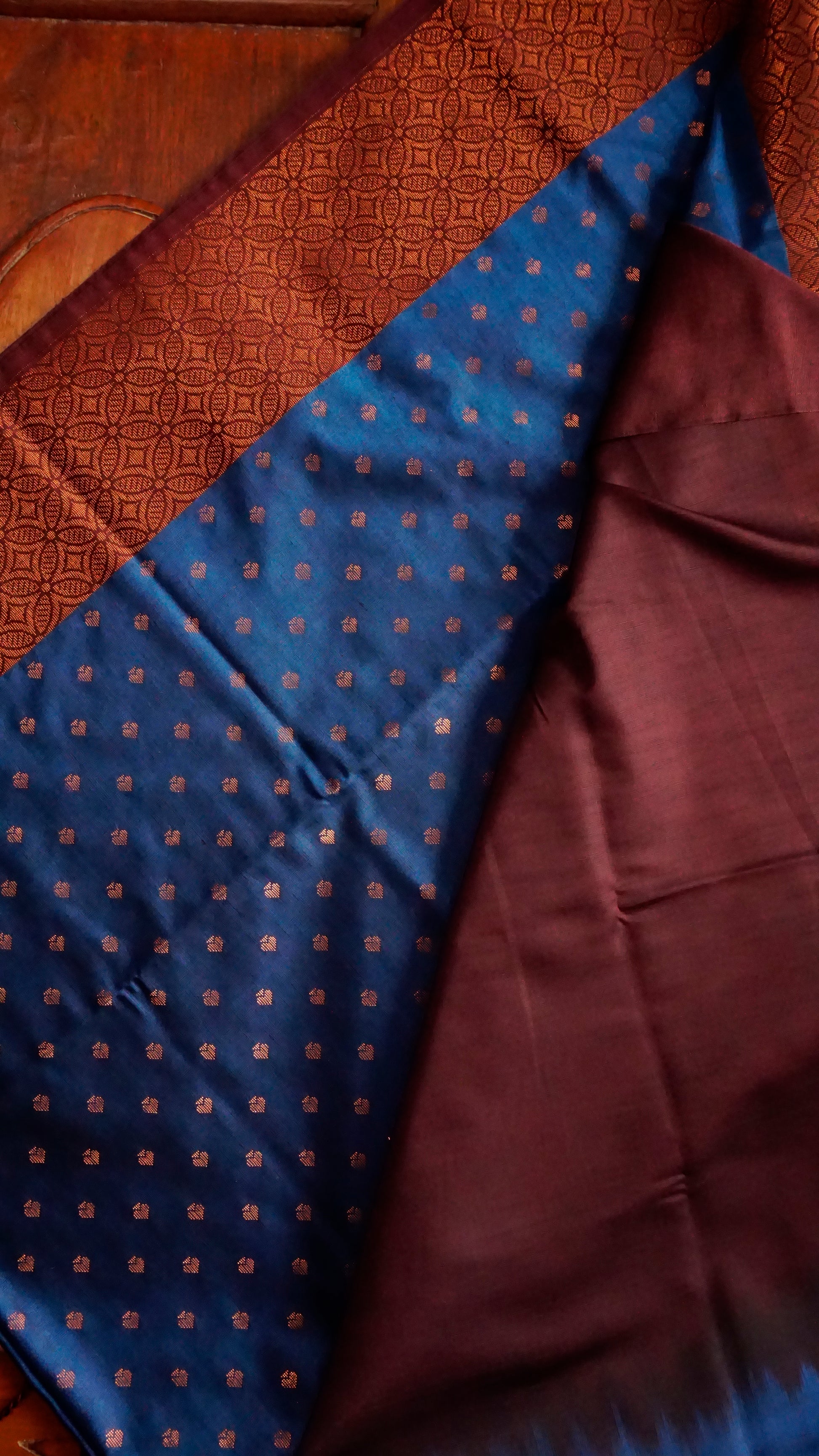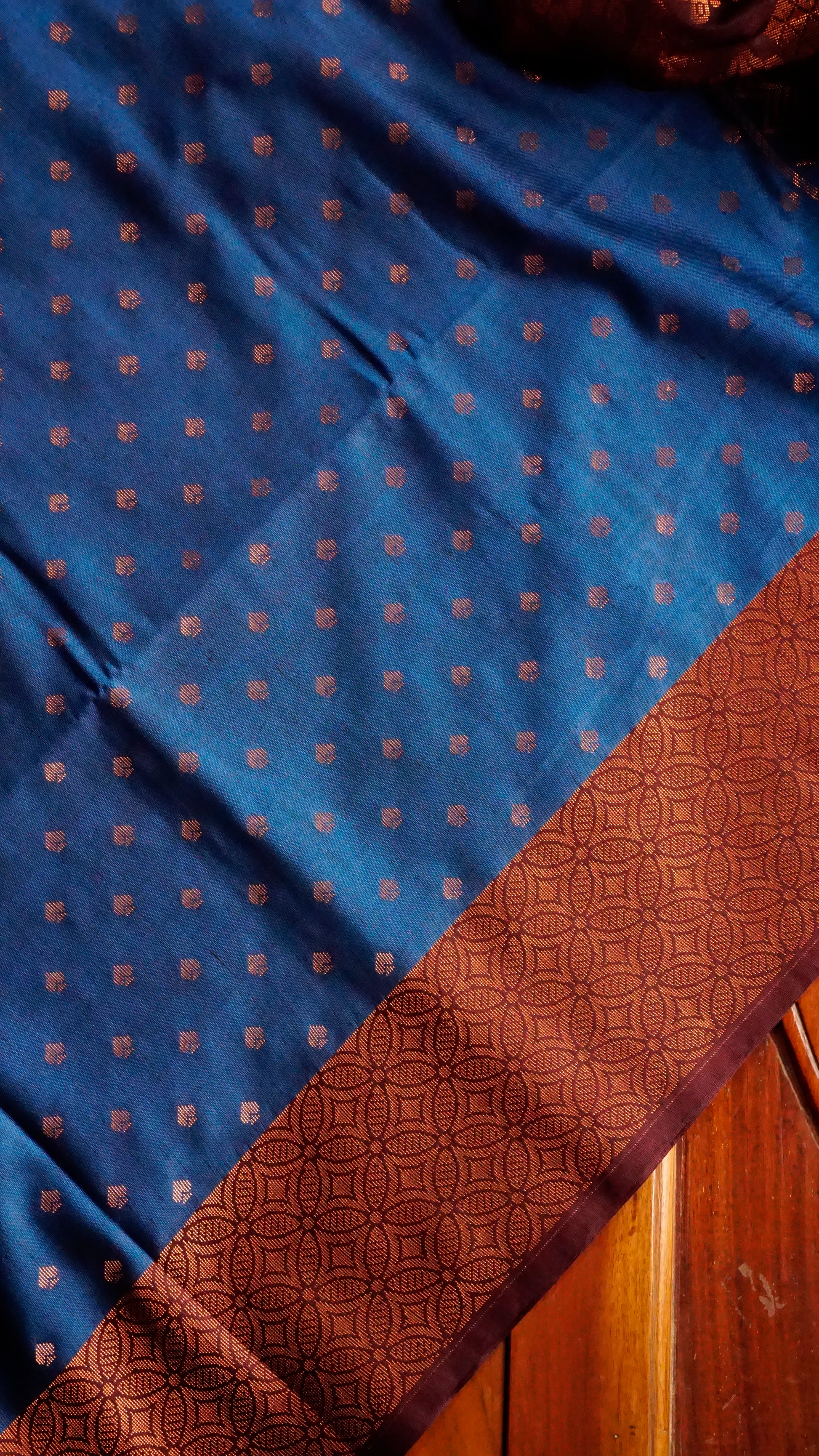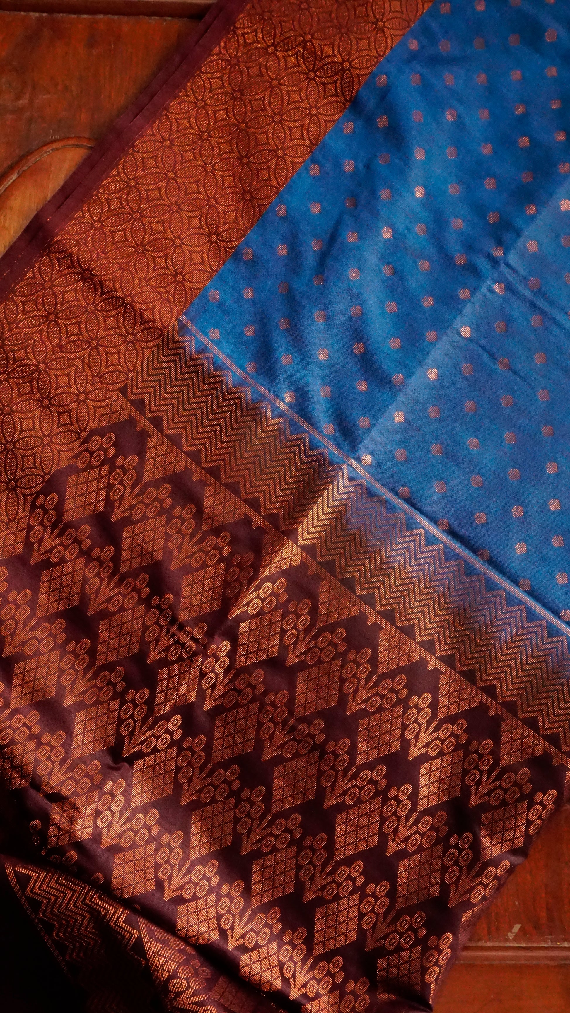 With its rich maroon woven border and copper zari buttas across the body, this royal blue semi-silk saree exudes elegance. The zari pallu's geometric and floral designs lend grandeur, and the rich blue and maroon contrast produces a regal appearance.