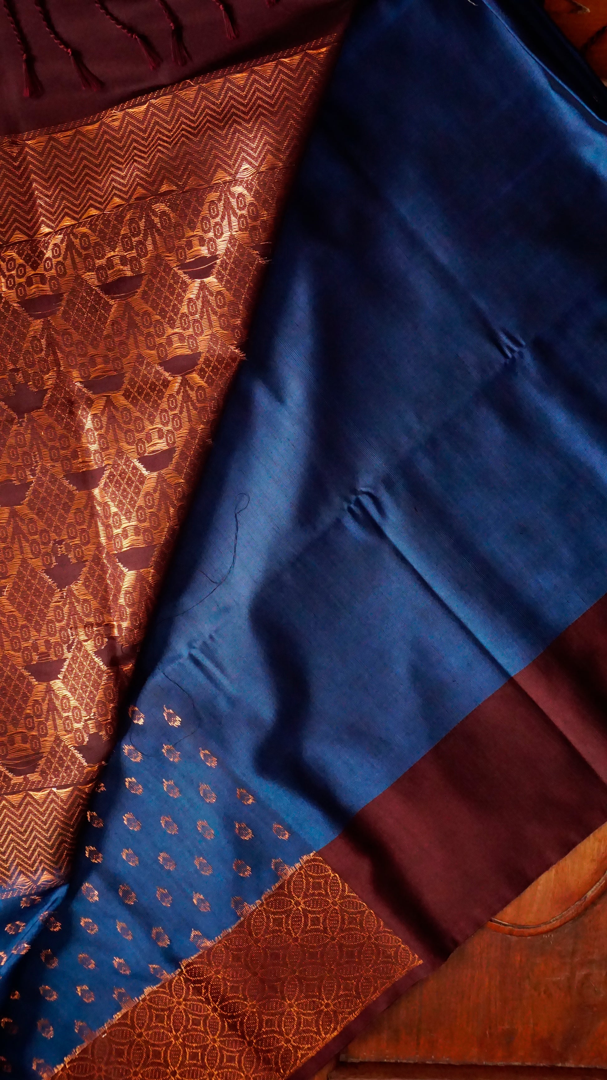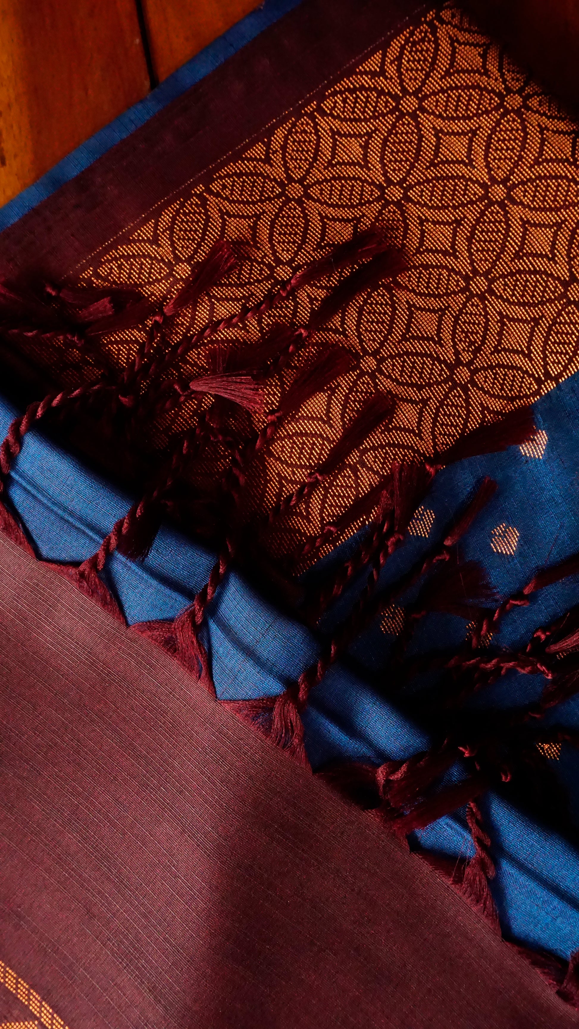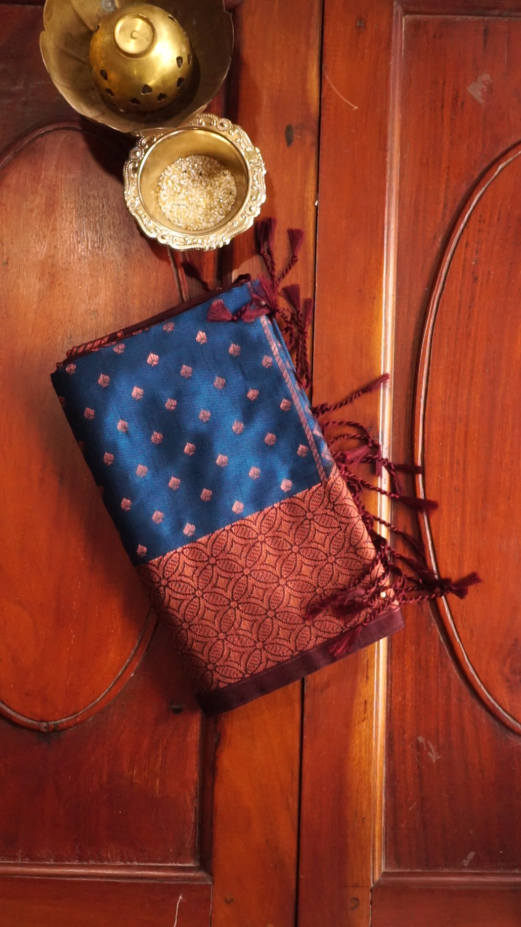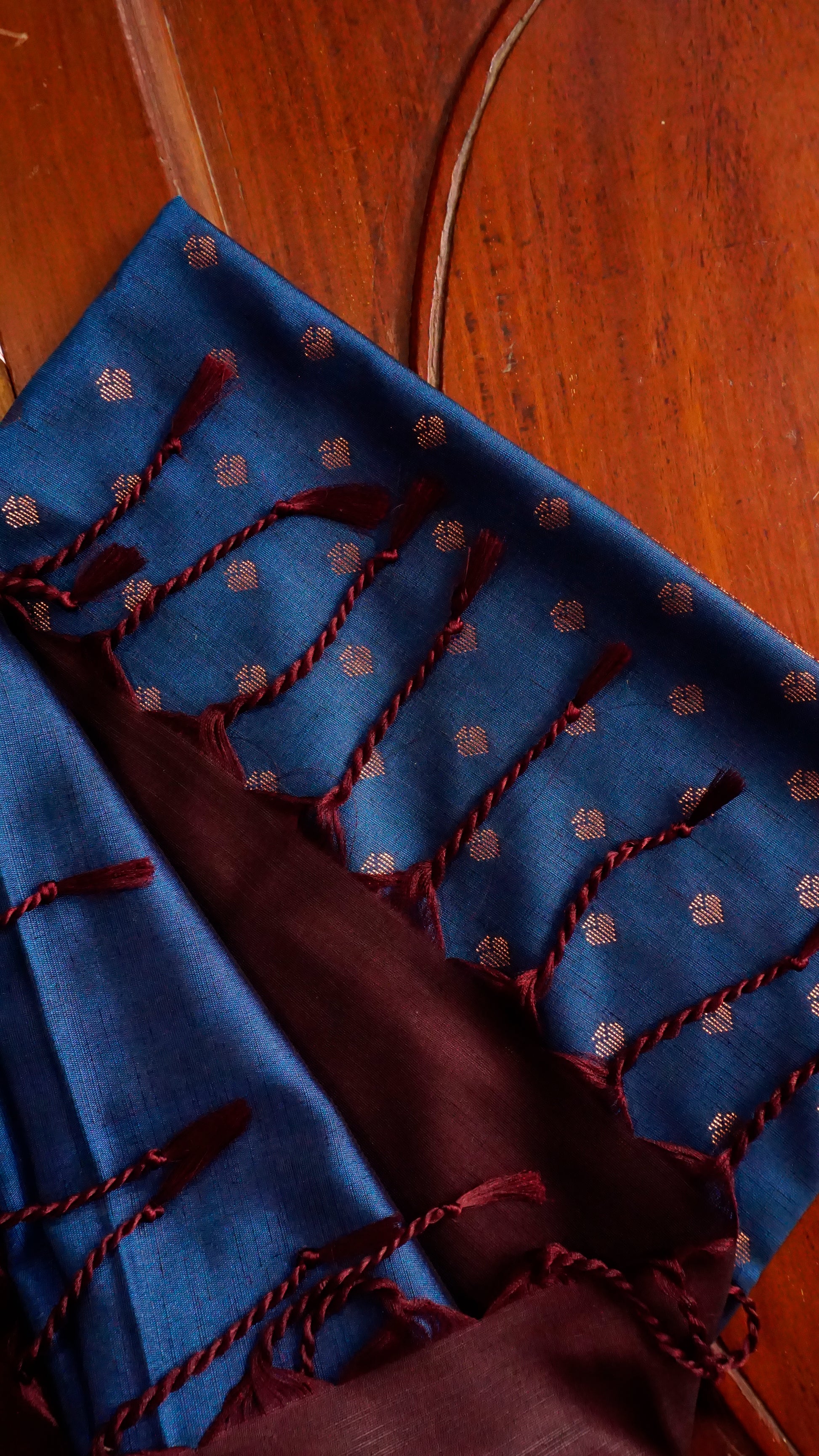 ✨ Material: Semi-Silk ✨ Color: Maroon Bordered Royal Blue ✨ Design: richly woven border around copper zari buttas ✨ Pallu: Detailed zari weaving with a tassel accent ✨ Events: Onam, festivals, weddings, and traditional gatherings