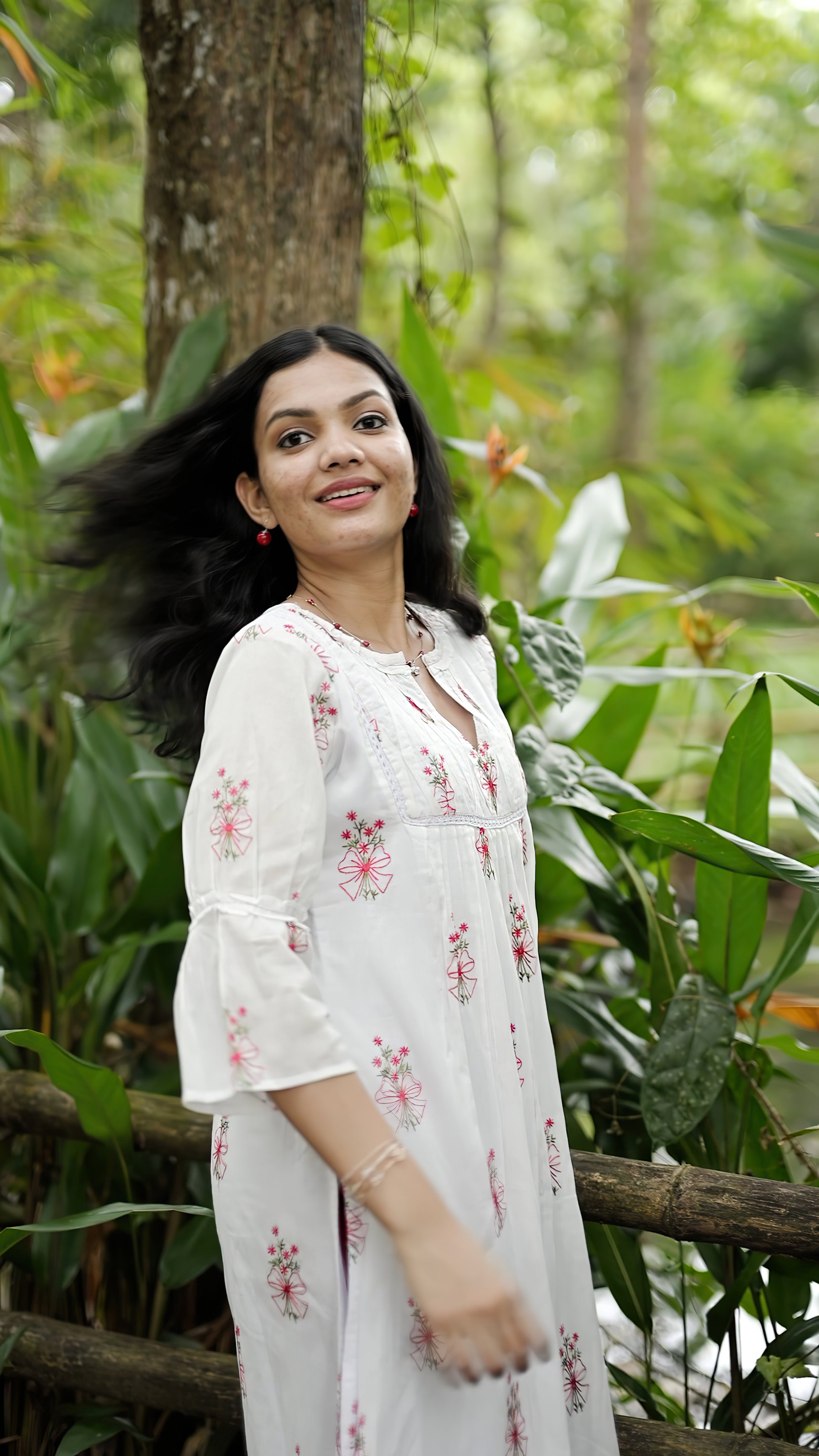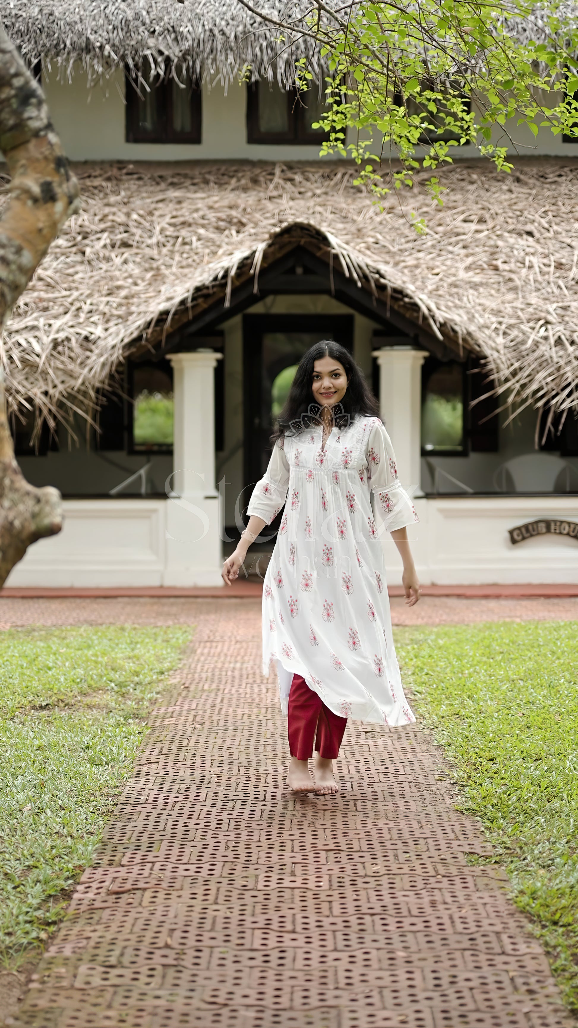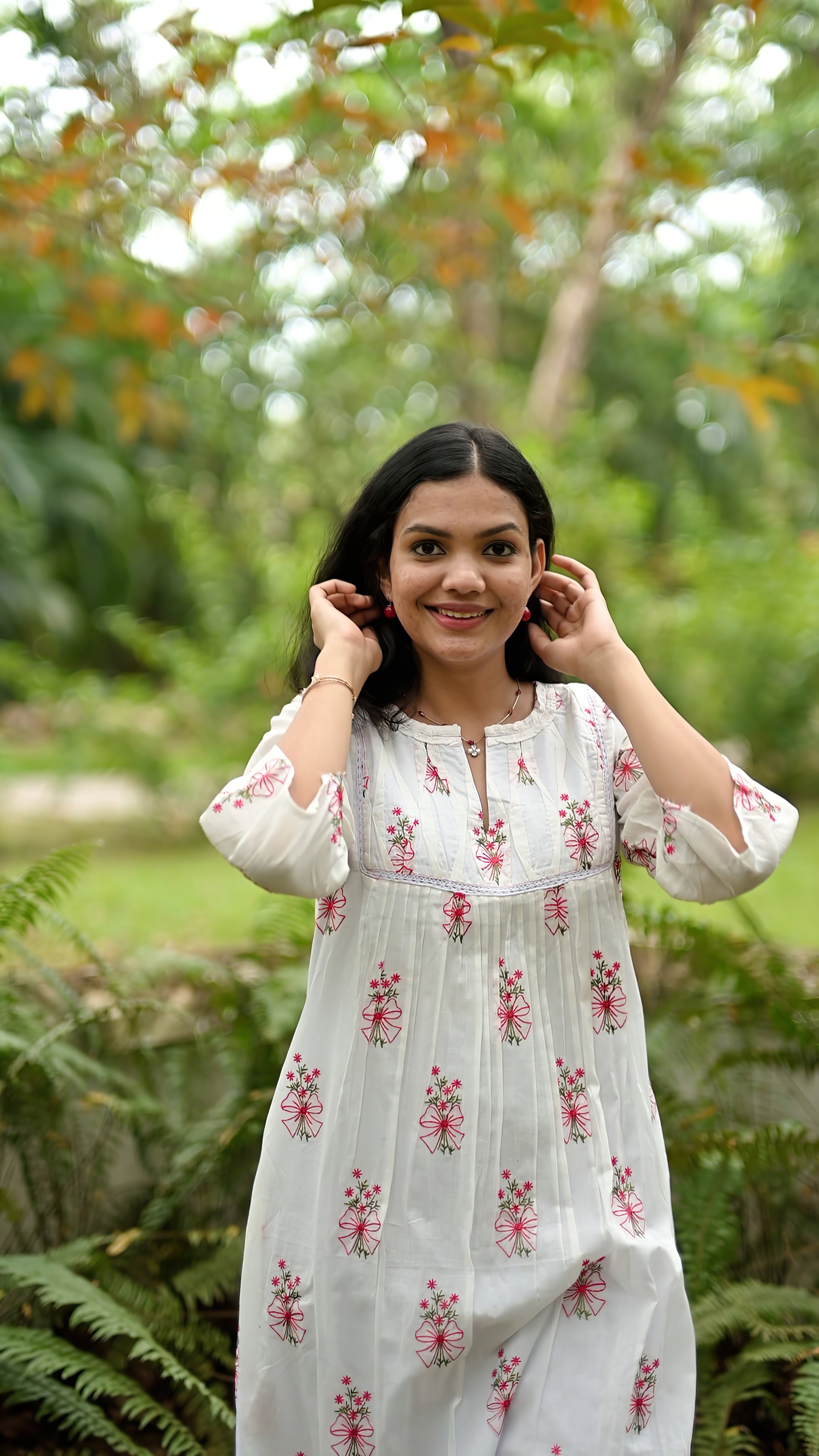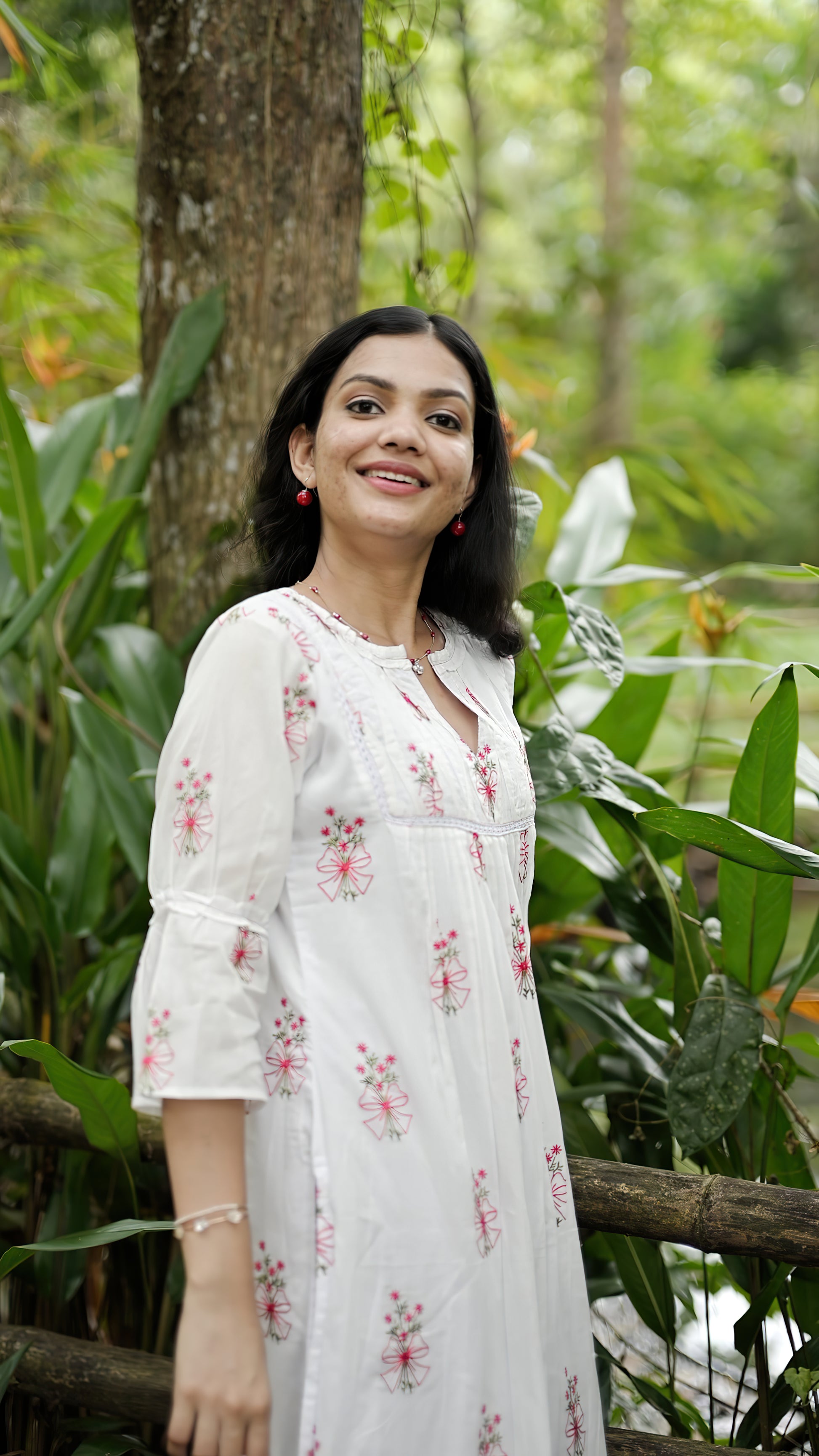 cotton kurti online, floral printed cotton kurti, white pink kurthi, breathable summer kurti, office wear kurti for women, casual ethnic kurti, comfortable daily wear kurti, soft cotton kurti, stylish kurti for girls