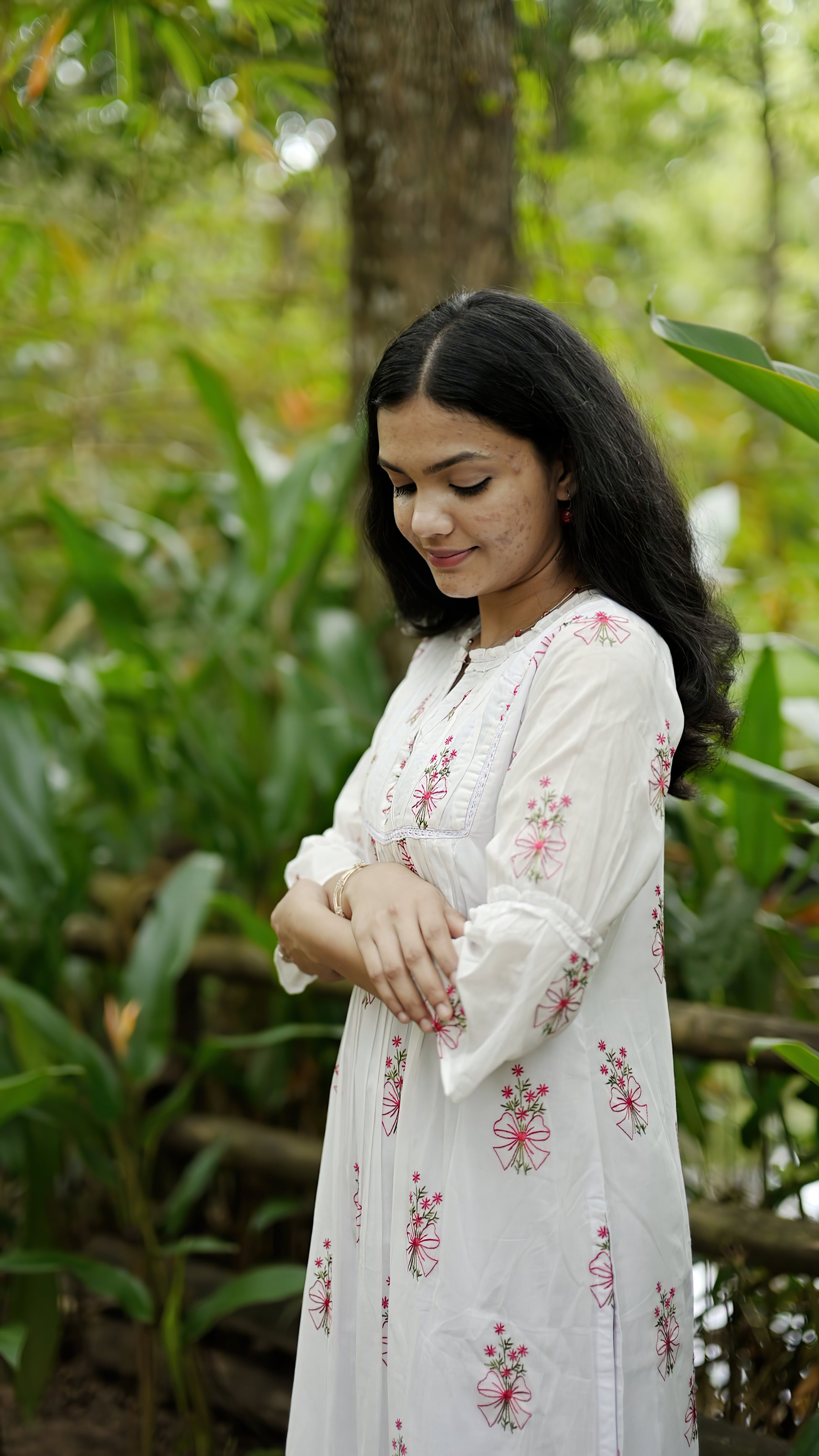 With our pure cotton printed kurthi, which is made for comfort and elegant everyday wear, you can effortlessly embrace elegance. This silky white kurthi has a three-quarter sleeve design that gives a refined, feminine touch, along with lovely pink traditional flower designs. Perfect for light events, casual get-togethers, or business attire.