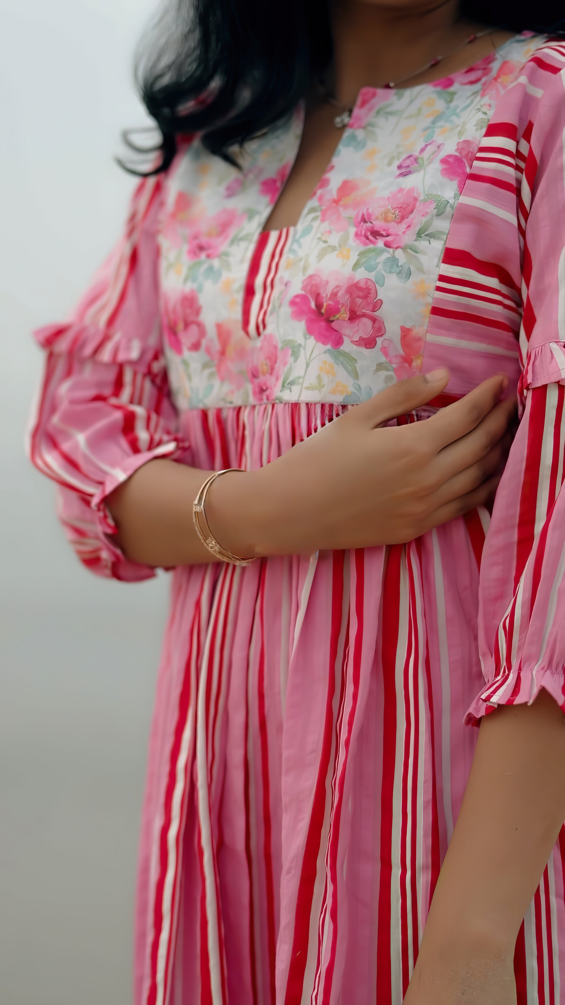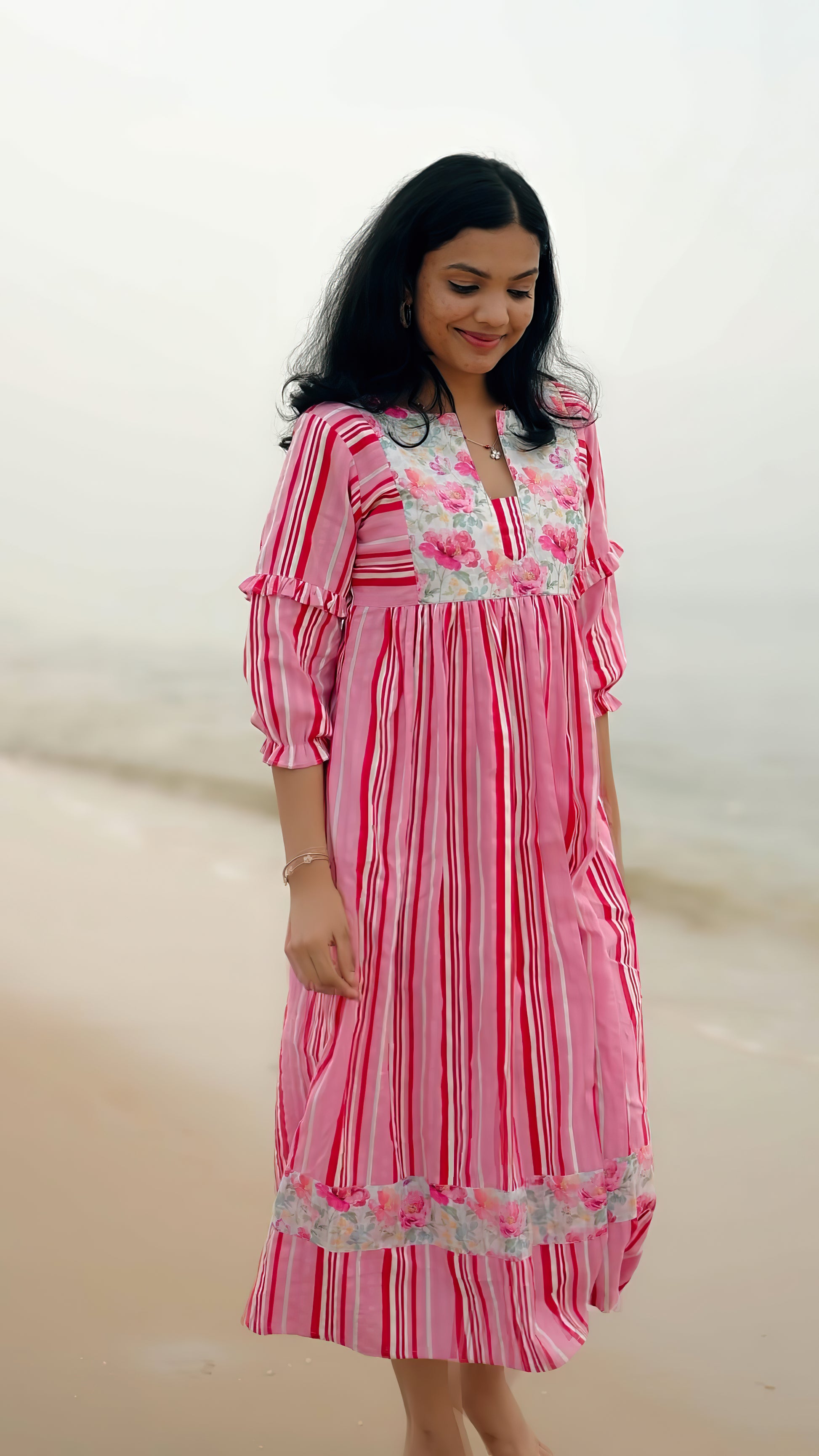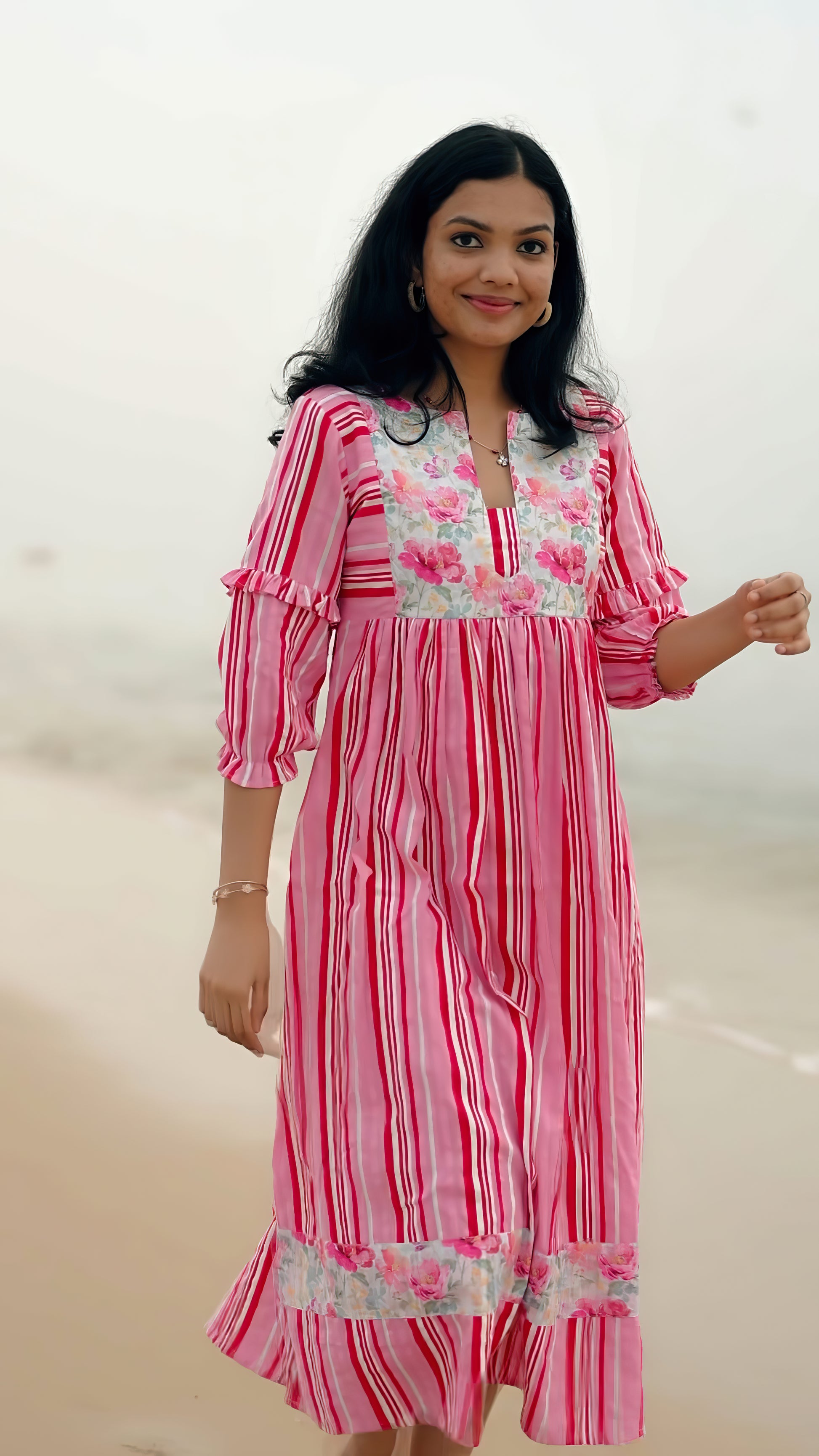Our Pink Printed Cotton Kurthi, made for ladies who enjoy comfort with a dash of flair, can let you step into elegance. This kurthi, which is made of soft, breathable cotton, has lovely Pink flowers Printed on the yoke and tassel tie-up details for a lovely, festive appearance.