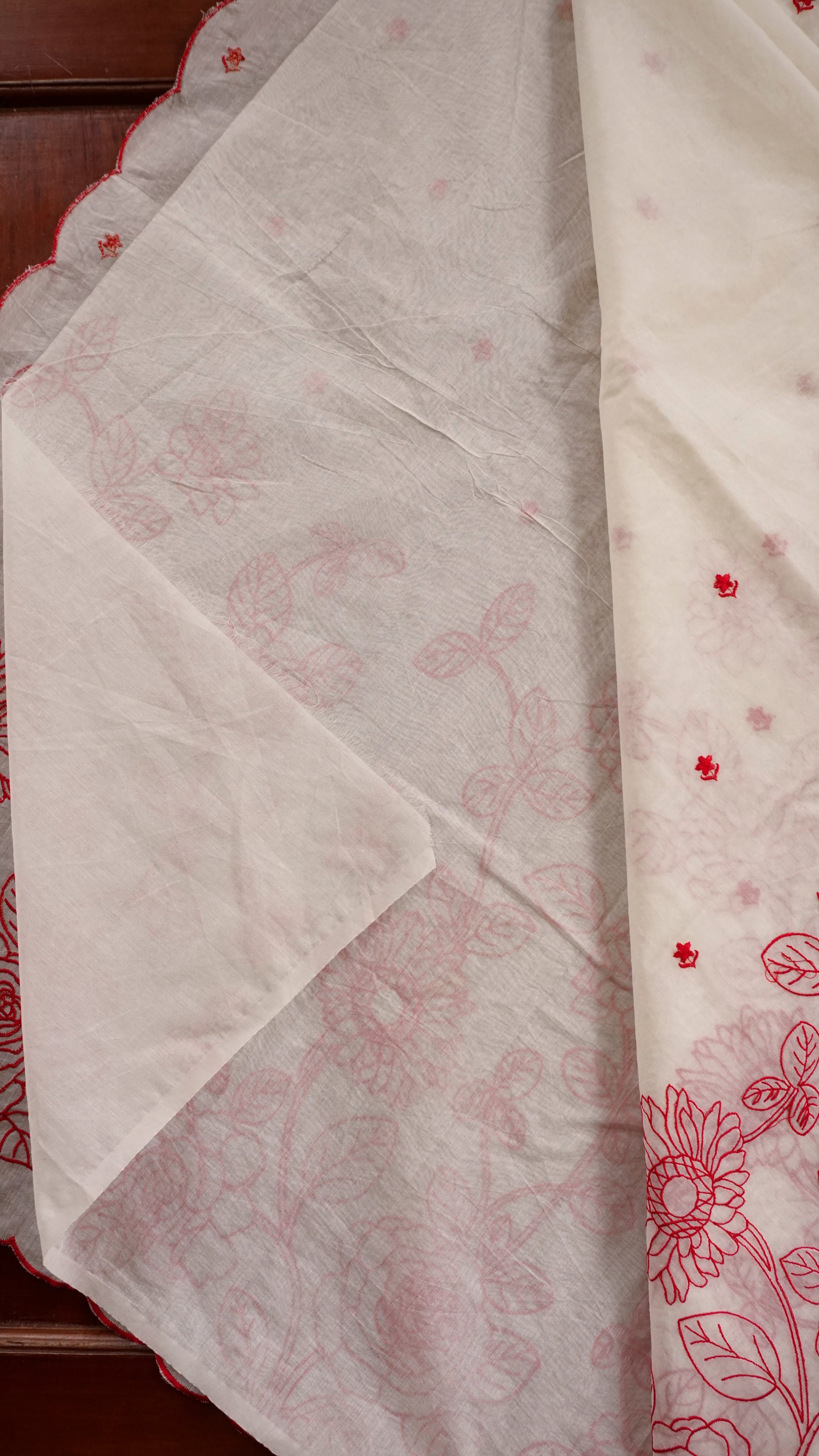 Celebrate elegance with our Mal Chanderi Saree, crafted in a soft off-white shade and beautifully enhanced with delicate red floral embroidery along the borders.