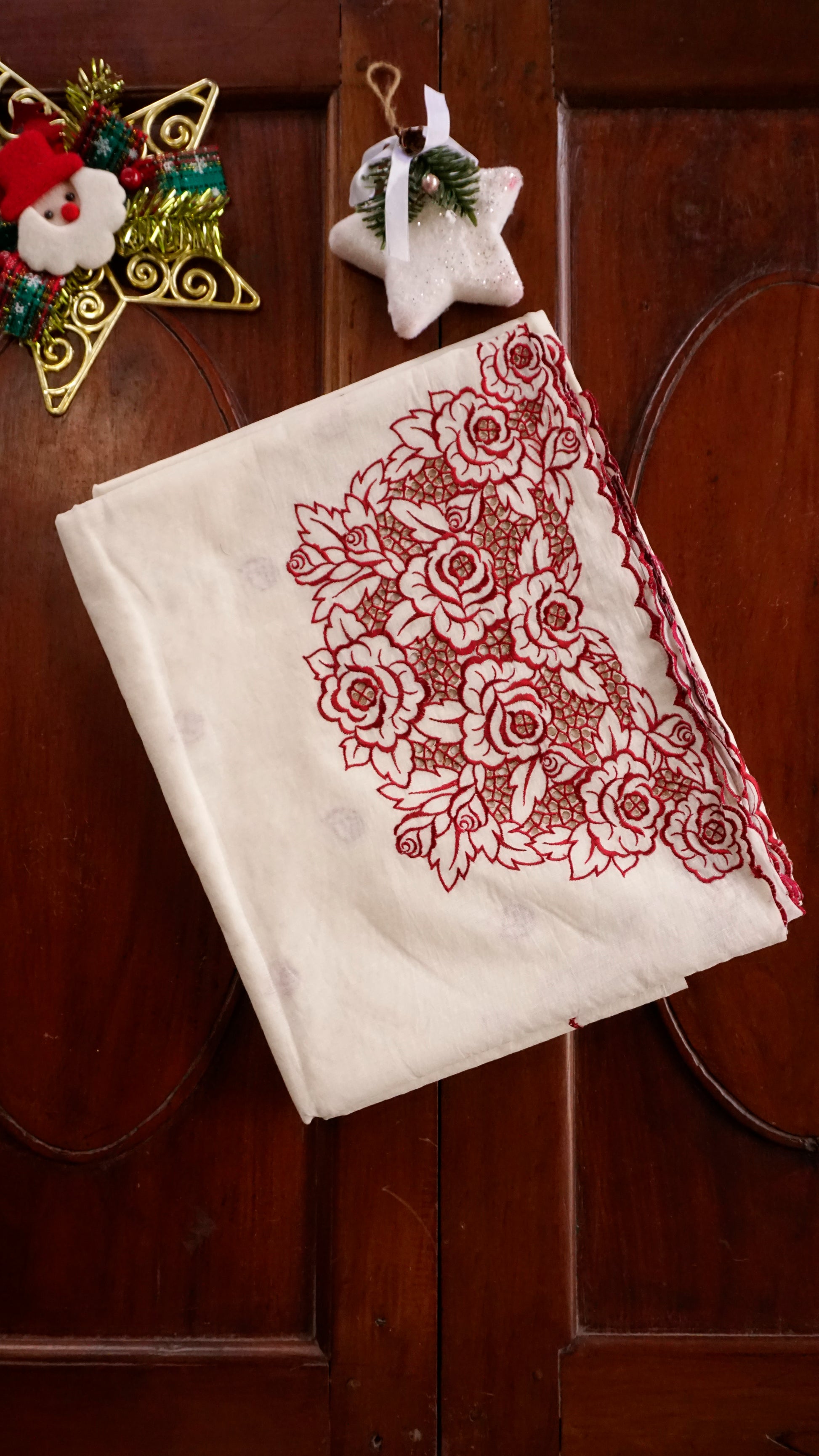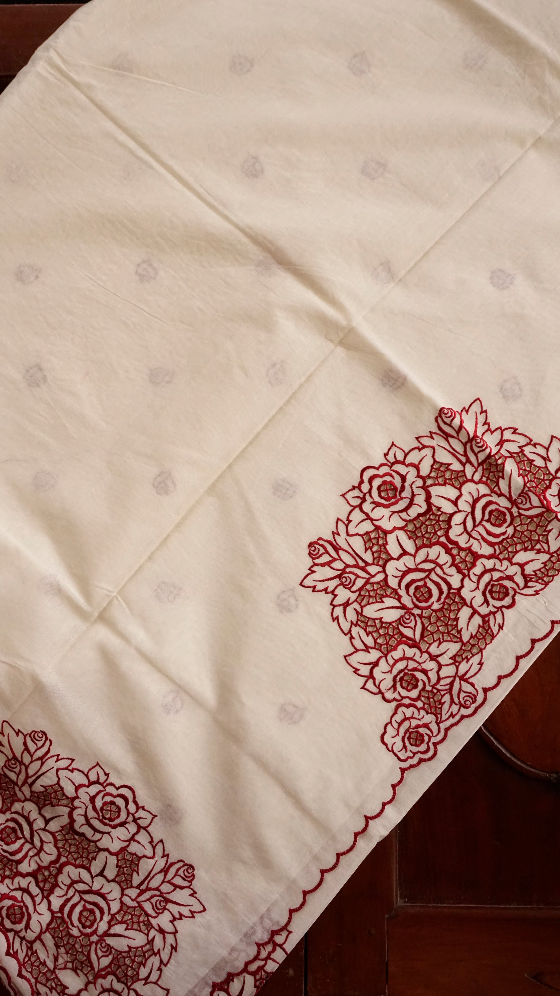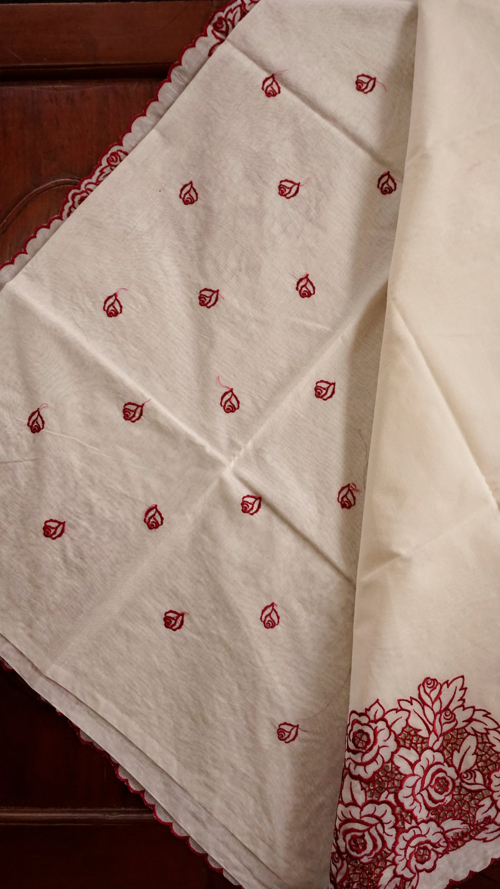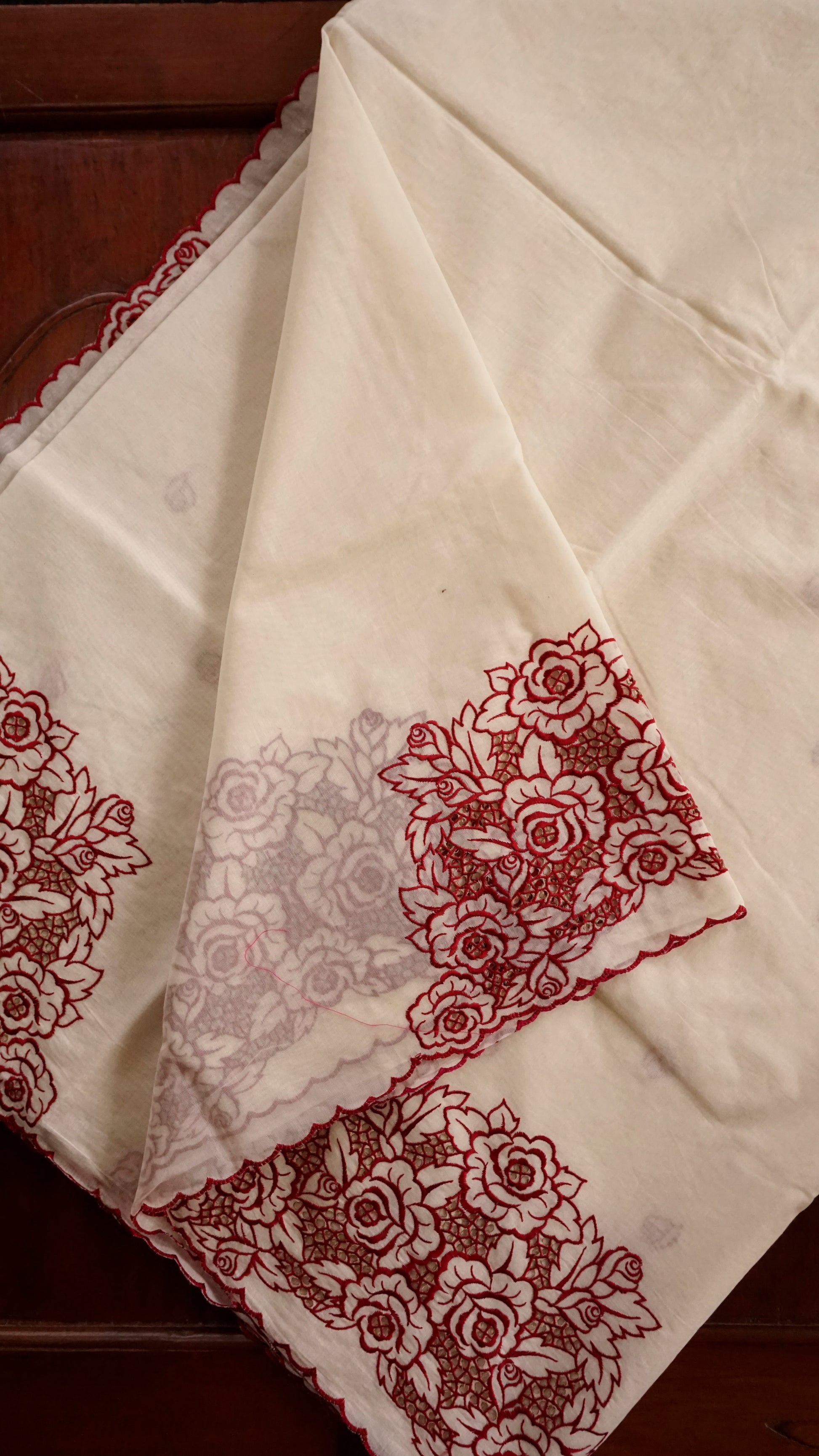 Experience timeless elegance with this premium Mal Chanderi Saree, designed in a soft cream shade and beautifully enhanced with maroon thread embroidery motifs. The scalloped border detailing adds a graceful finishing touch, making it perfect for festive wear, functions, and special occasions.
