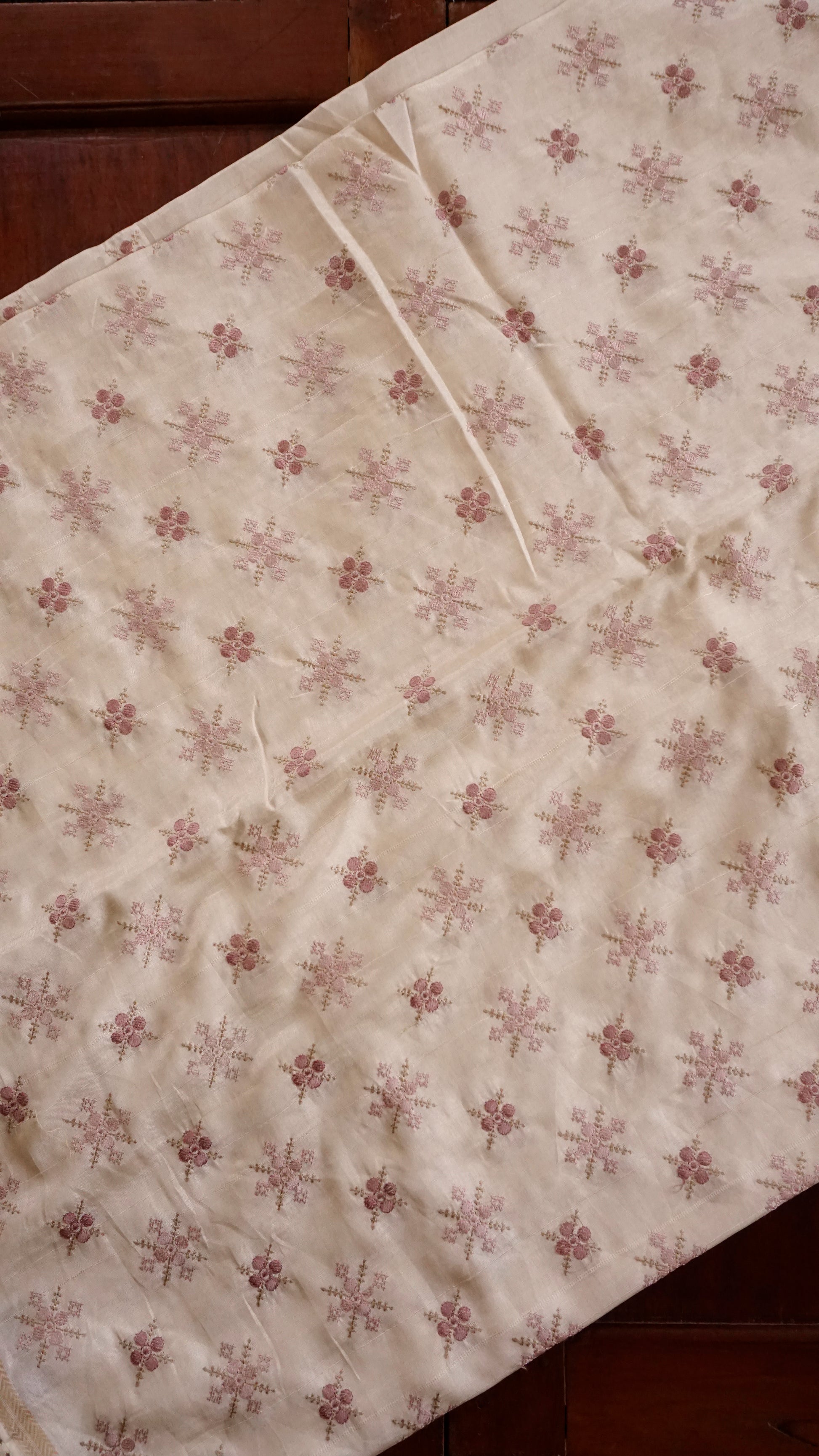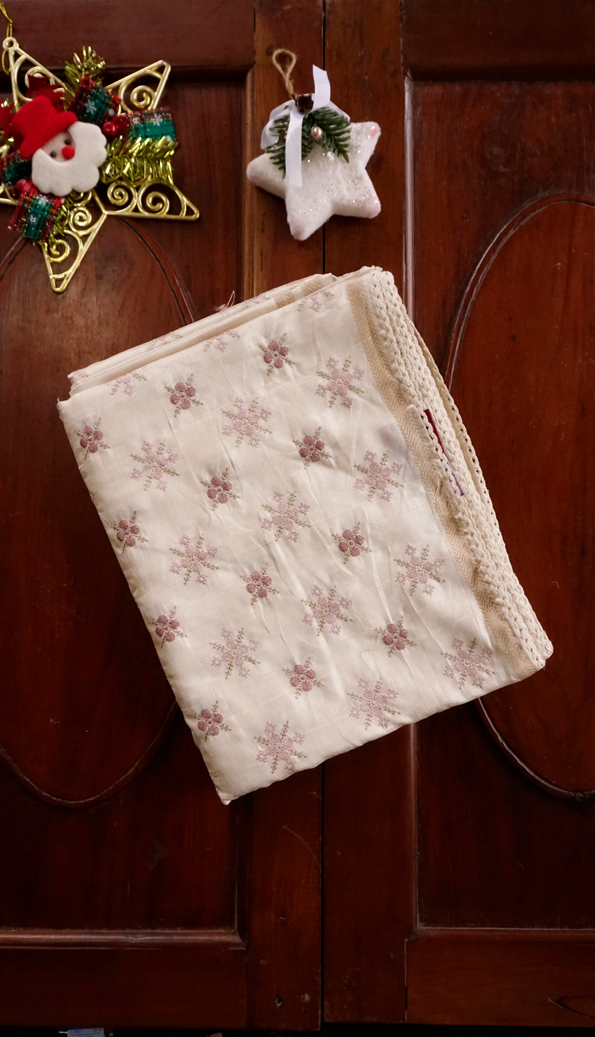 Elegant snowflake-inspired Christmas designs in delicate red embroidery-style prints adorn this cream soft silk saree, making it fashionable, lightweight, and appropriate for the holiday season.