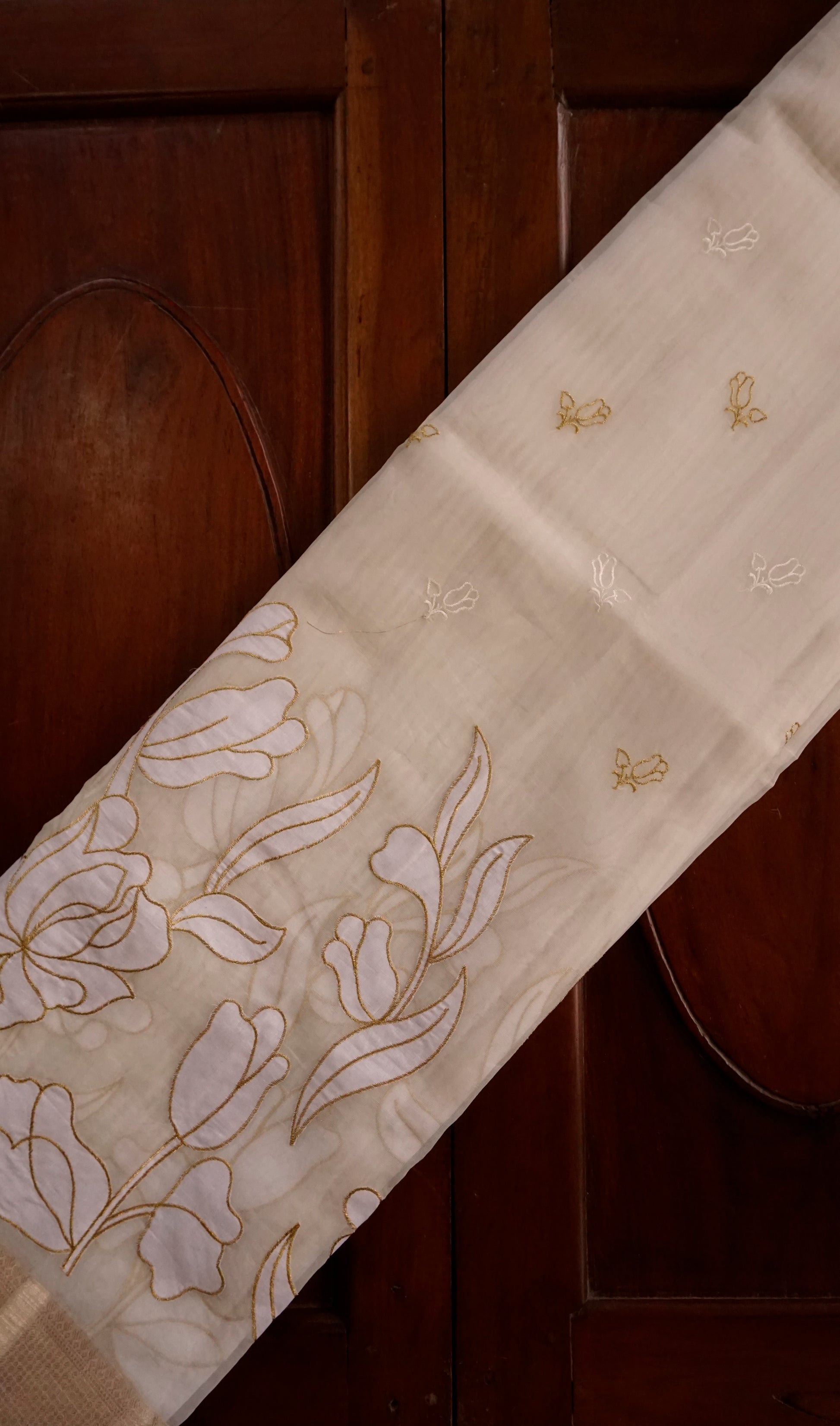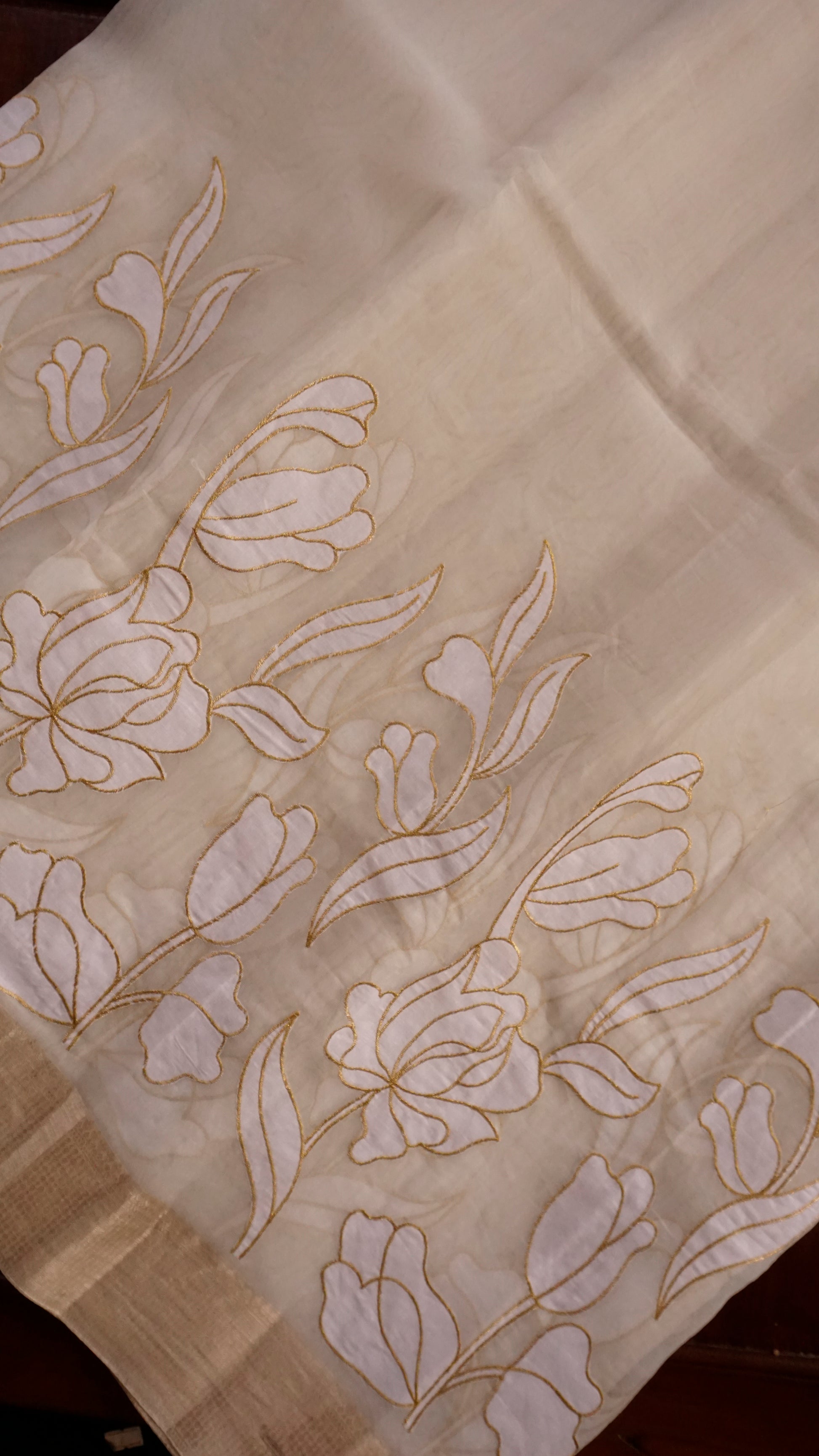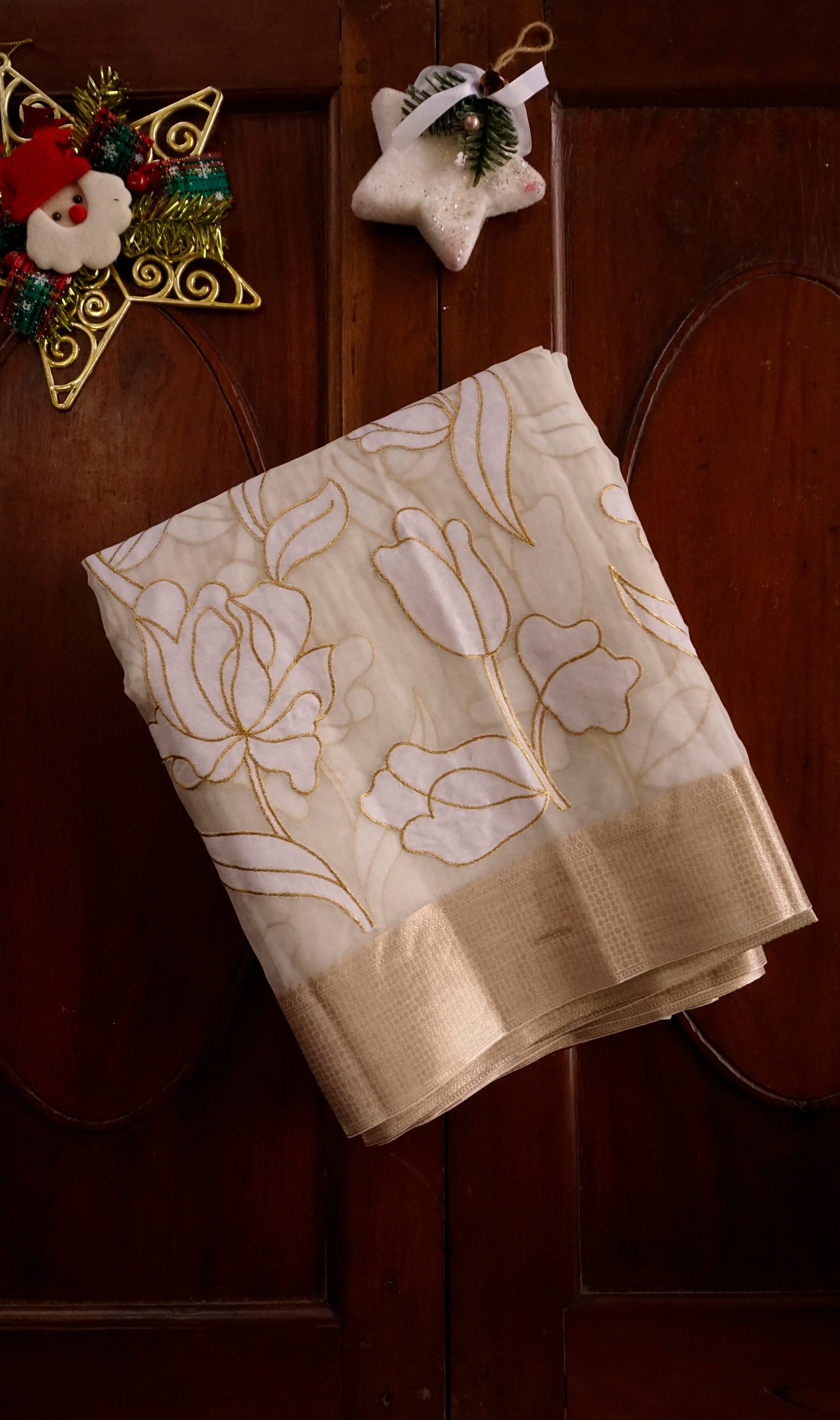 A modest yet elegant festive feeling is created by the exquisitely crafted golden flower design on this soft cream cotton saree. It is perfect for Christmas mass, workplace attire, family events, or evening get-togethers since the lightweight fabric guarantees all-day comfort.