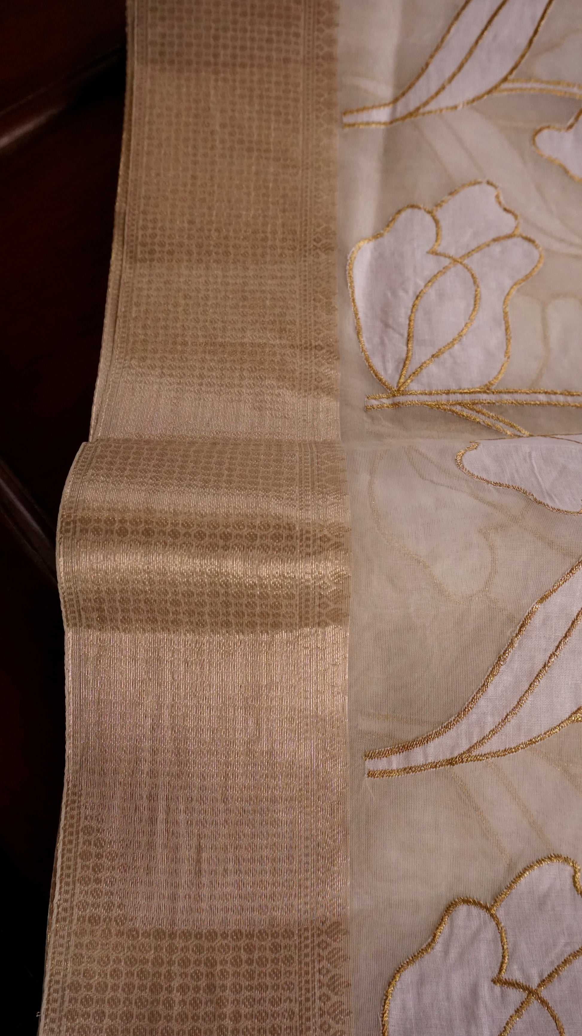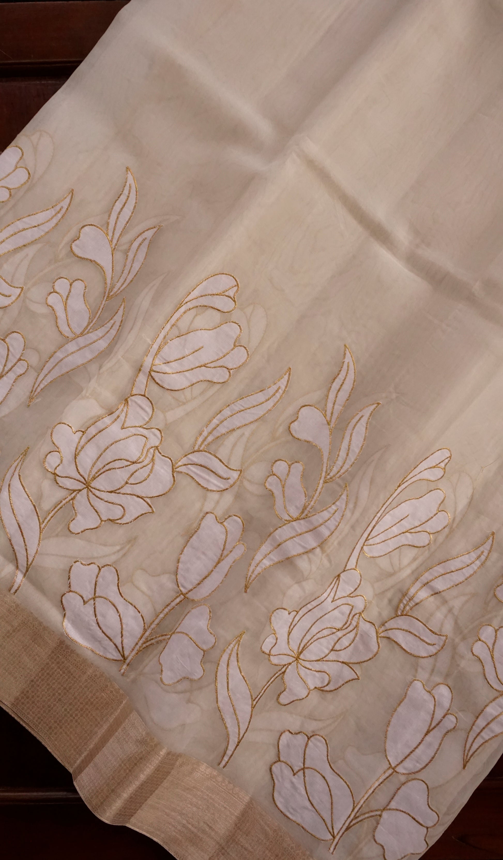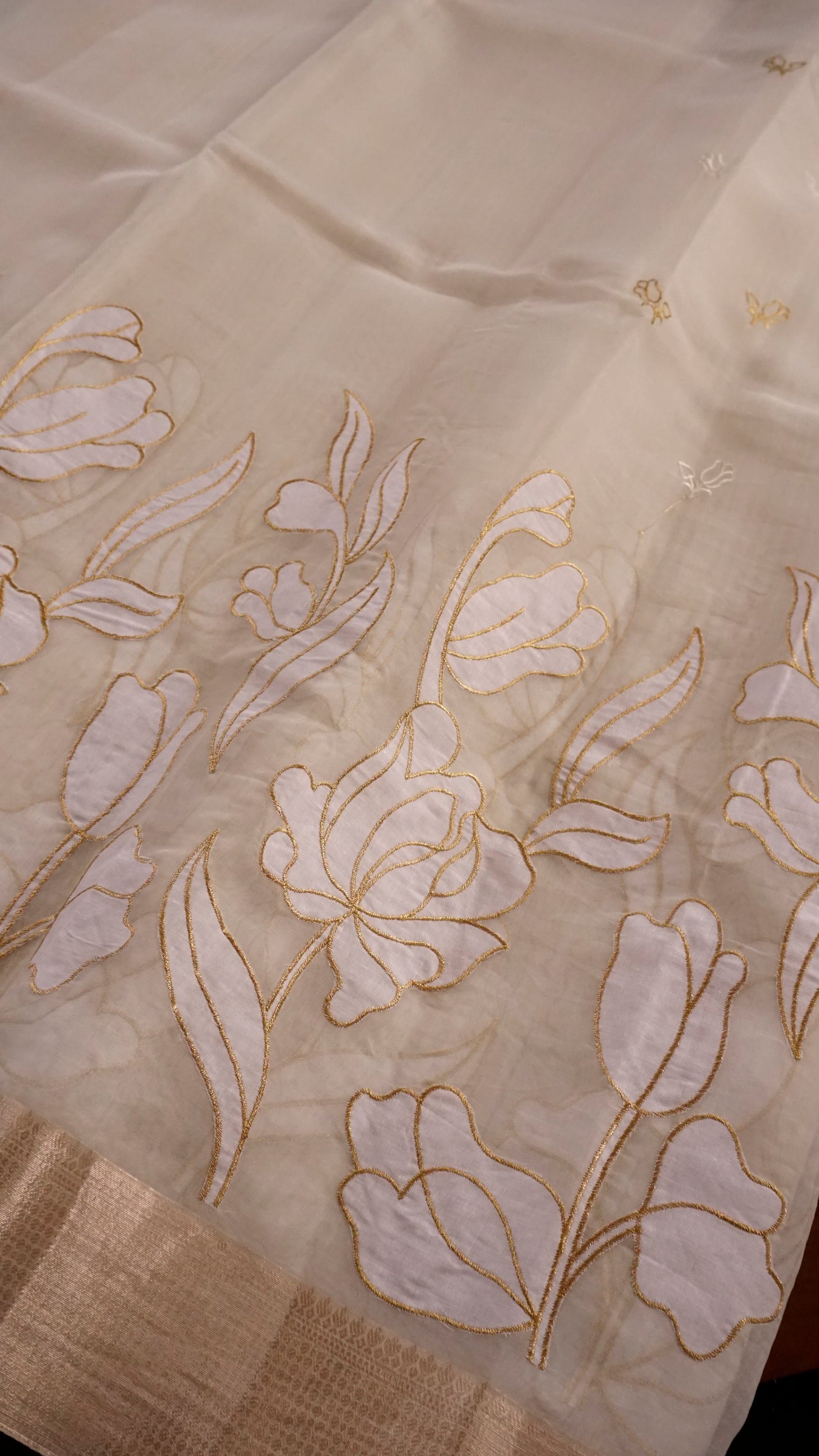 A modest yet elegant festive feeling is created by the exquisitely crafted golden flower design on this soft cream cotton saree. It is perfect for Christmas mass, workplace attire, family events, or evening get-togethers since the lightweight fabric guarantees all-day comfort.