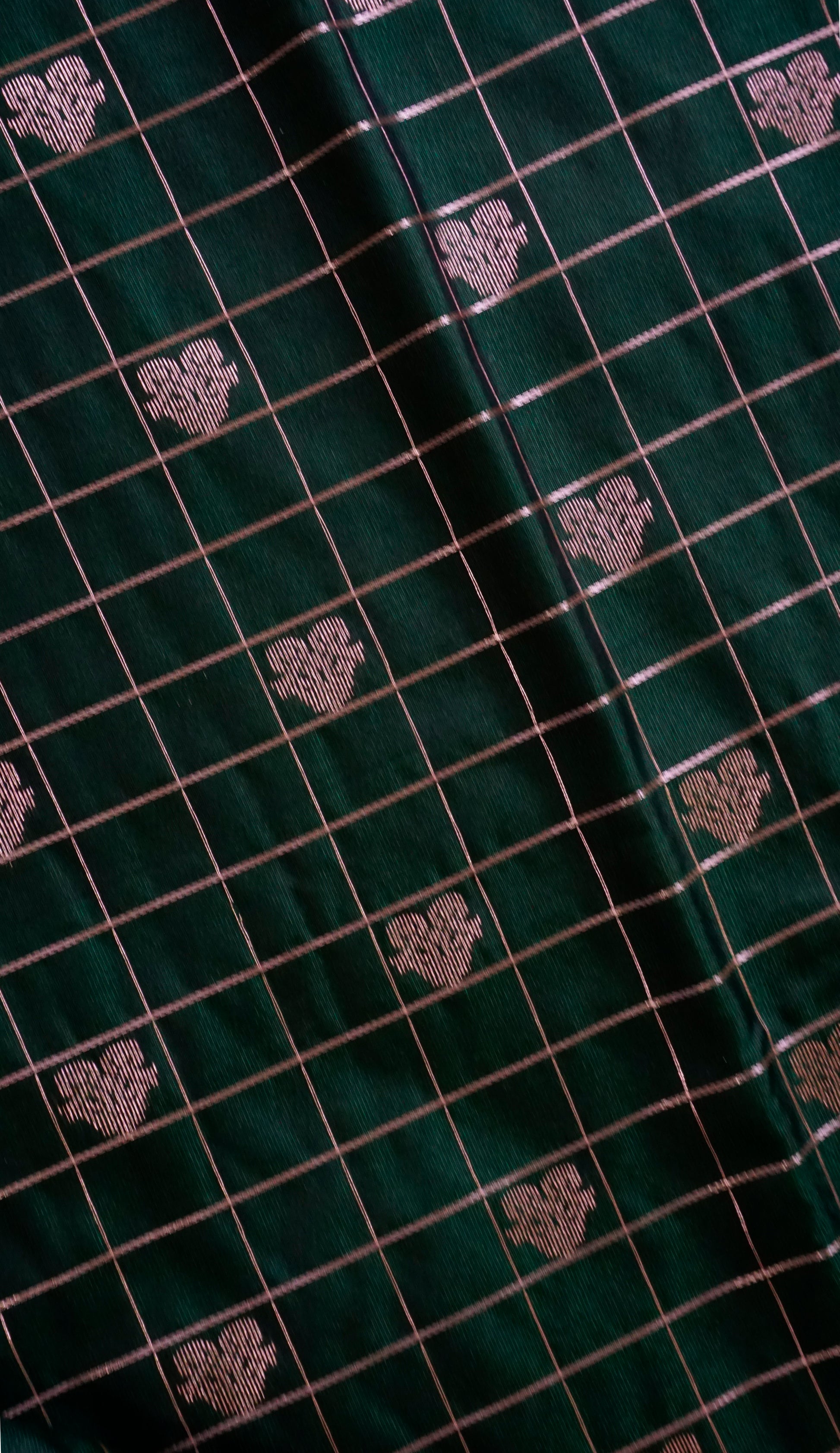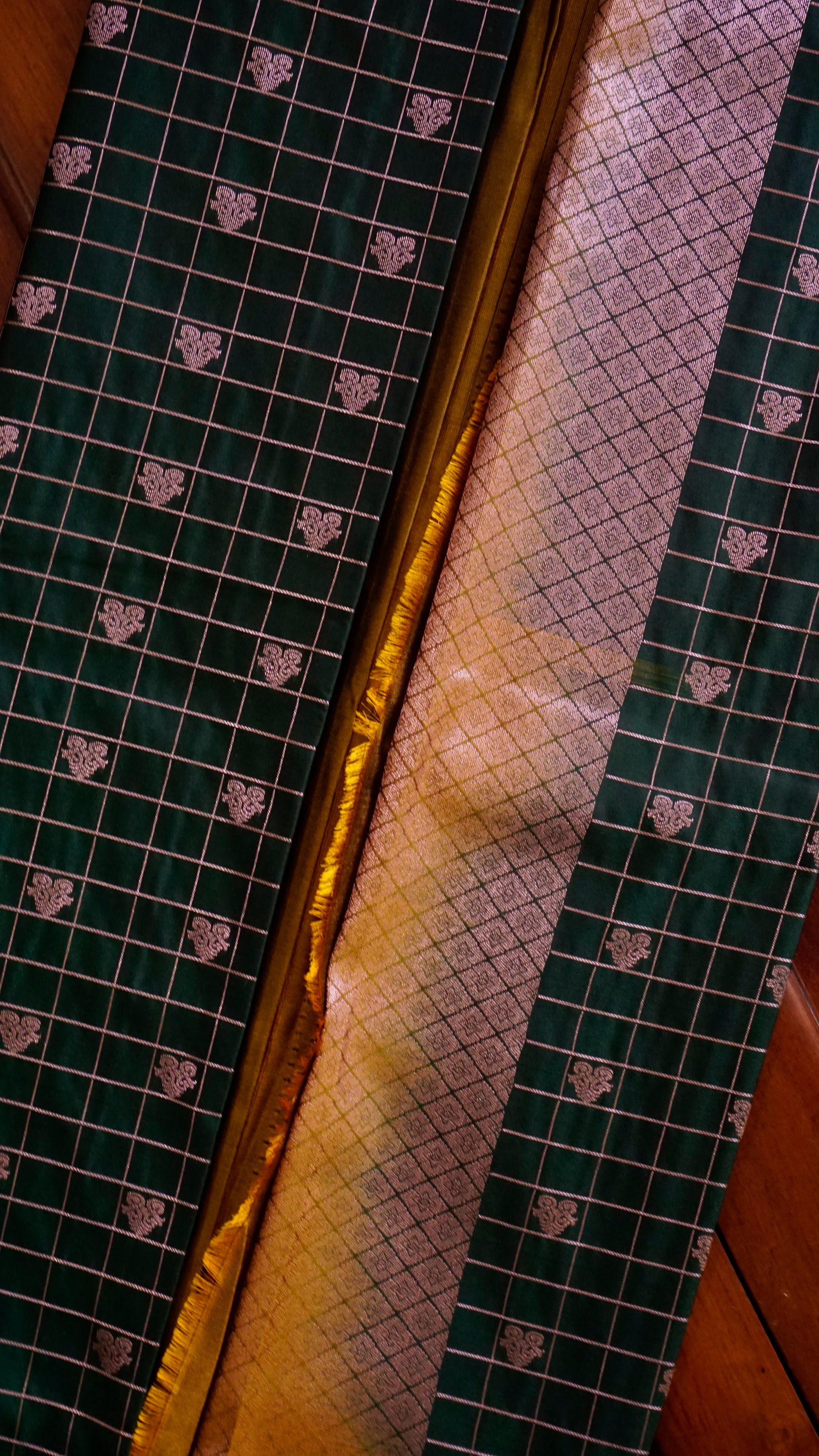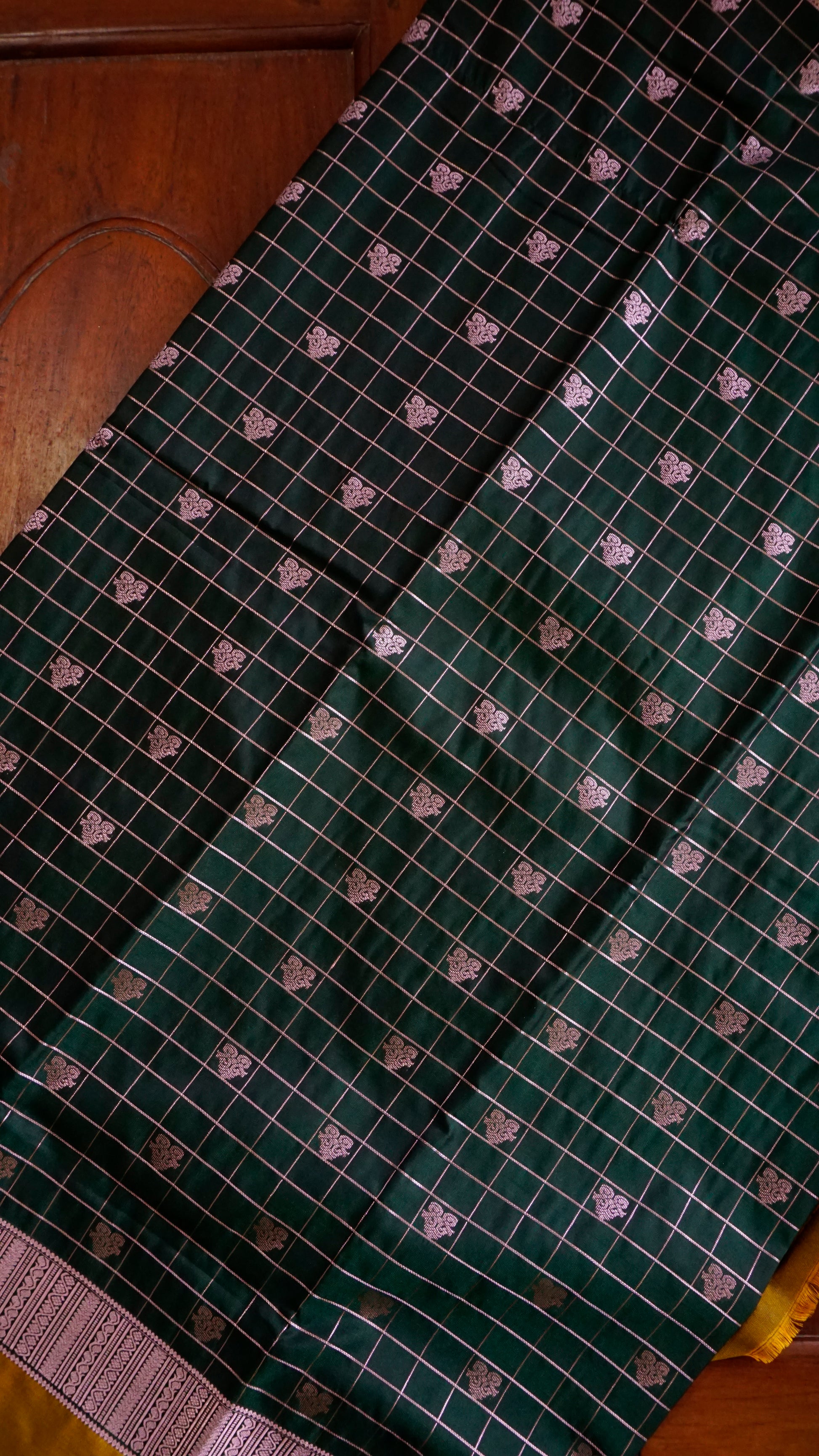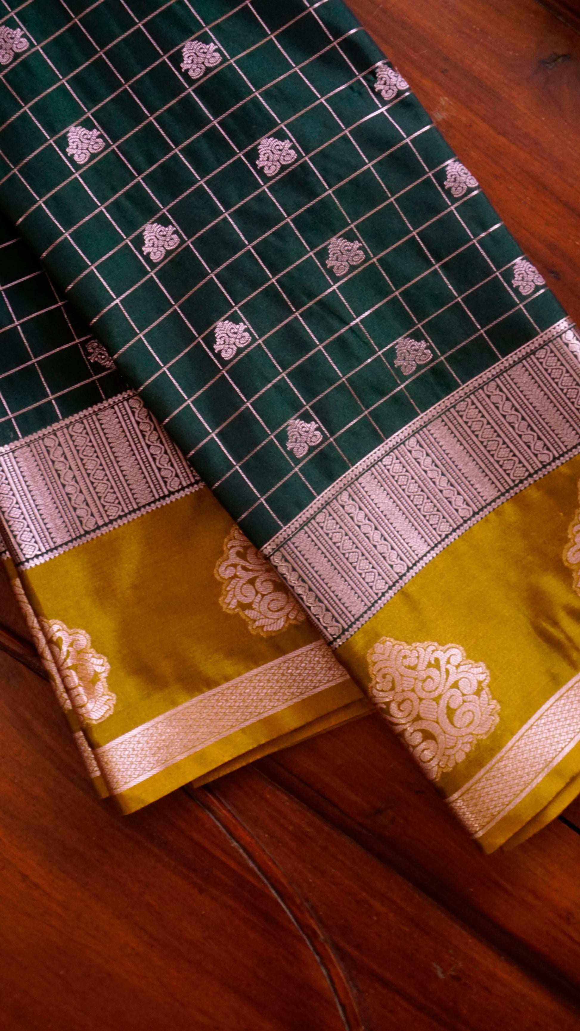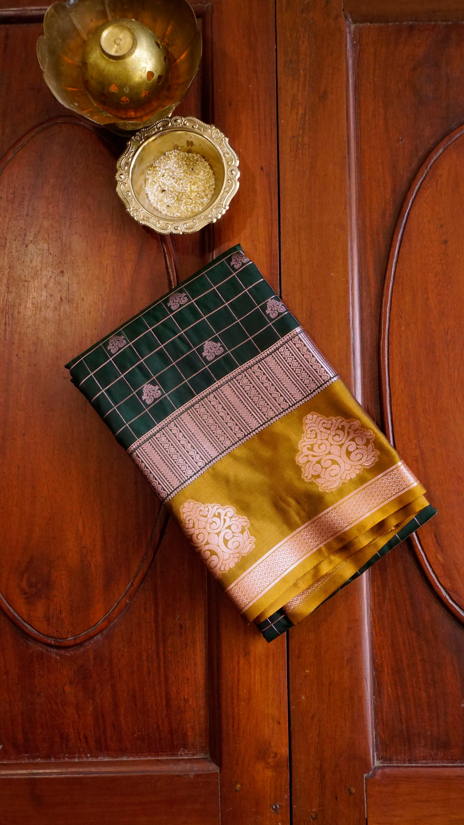 This saree is bright, bold, and celebratory. Its dazzling mustard yellow body is embroidered with big pink zari motifs that add a touch of royalty. Delicate flower buttas in pink zari accentuate the exquisite check patterns that contrast with the deep green pallu and border.
