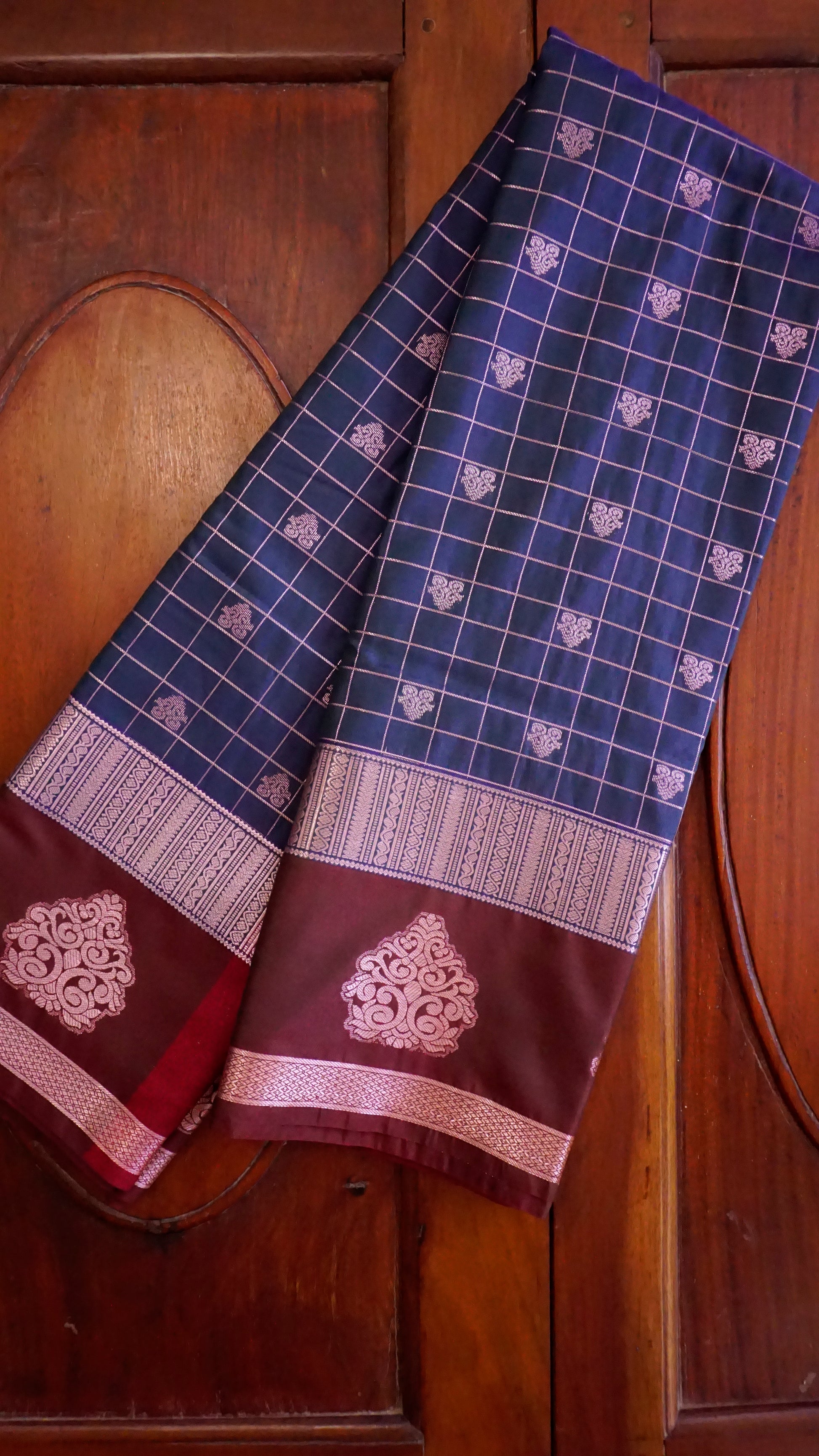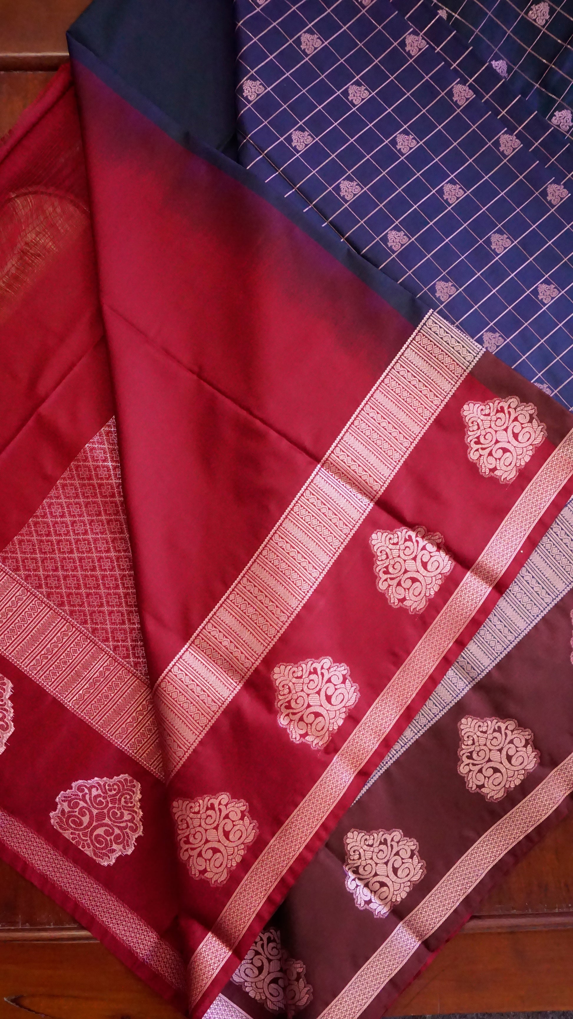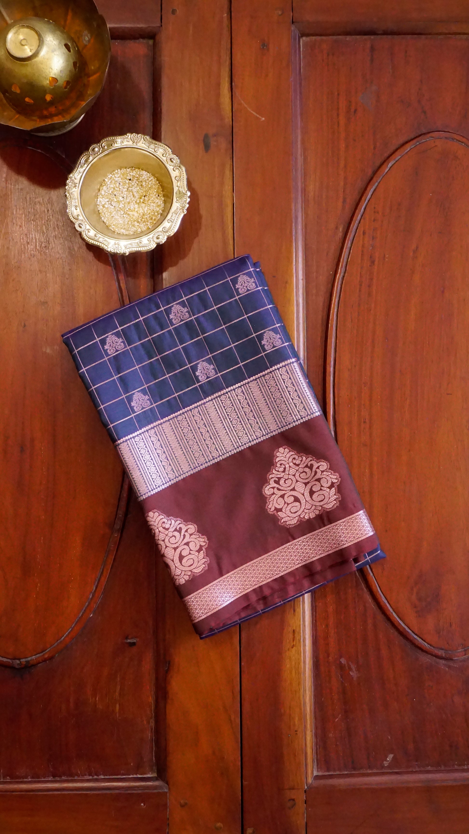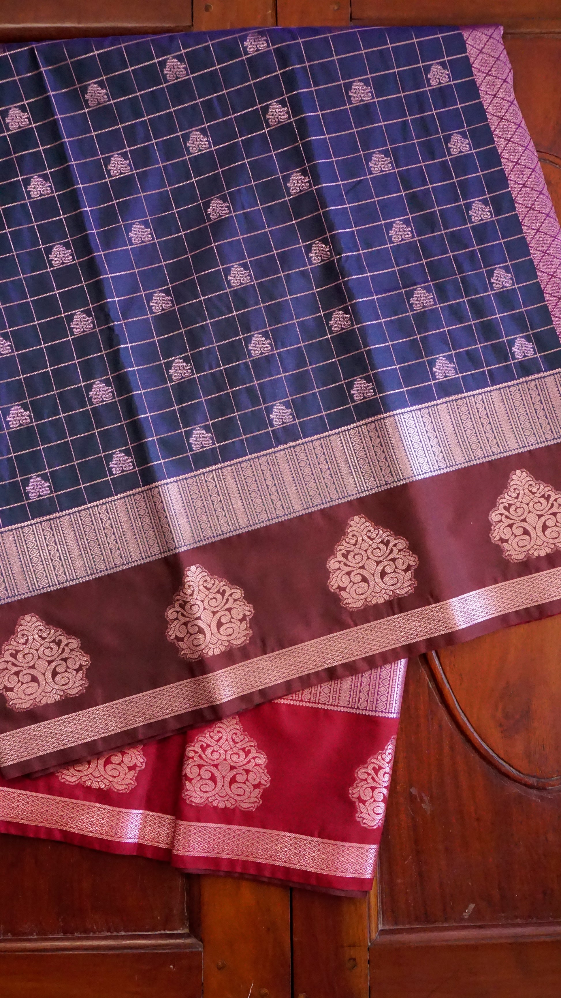 A beautiful semi-silk saree with lovely zari artwork and a deep maroon foundation, matched with a pallu that is checkered in navy blue. Ideal for ethnic gatherings, weddings, and celebratory events. Gentle, light, and elegant, with an opulent drape.