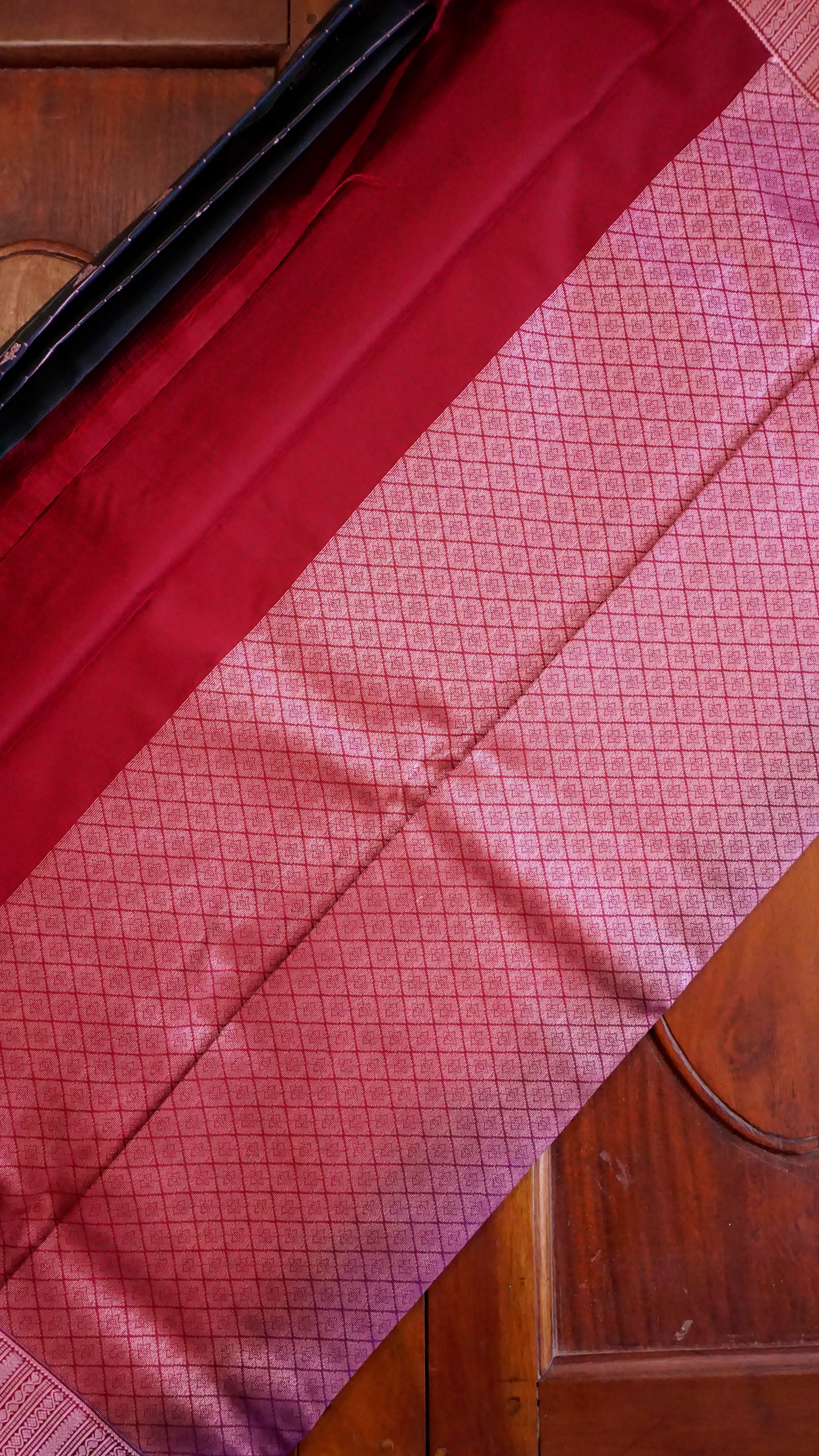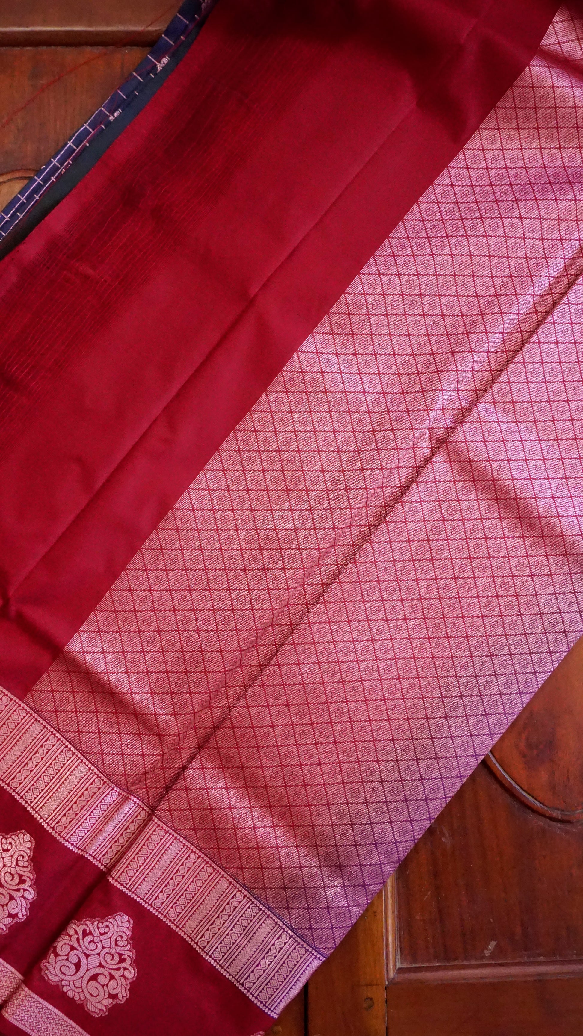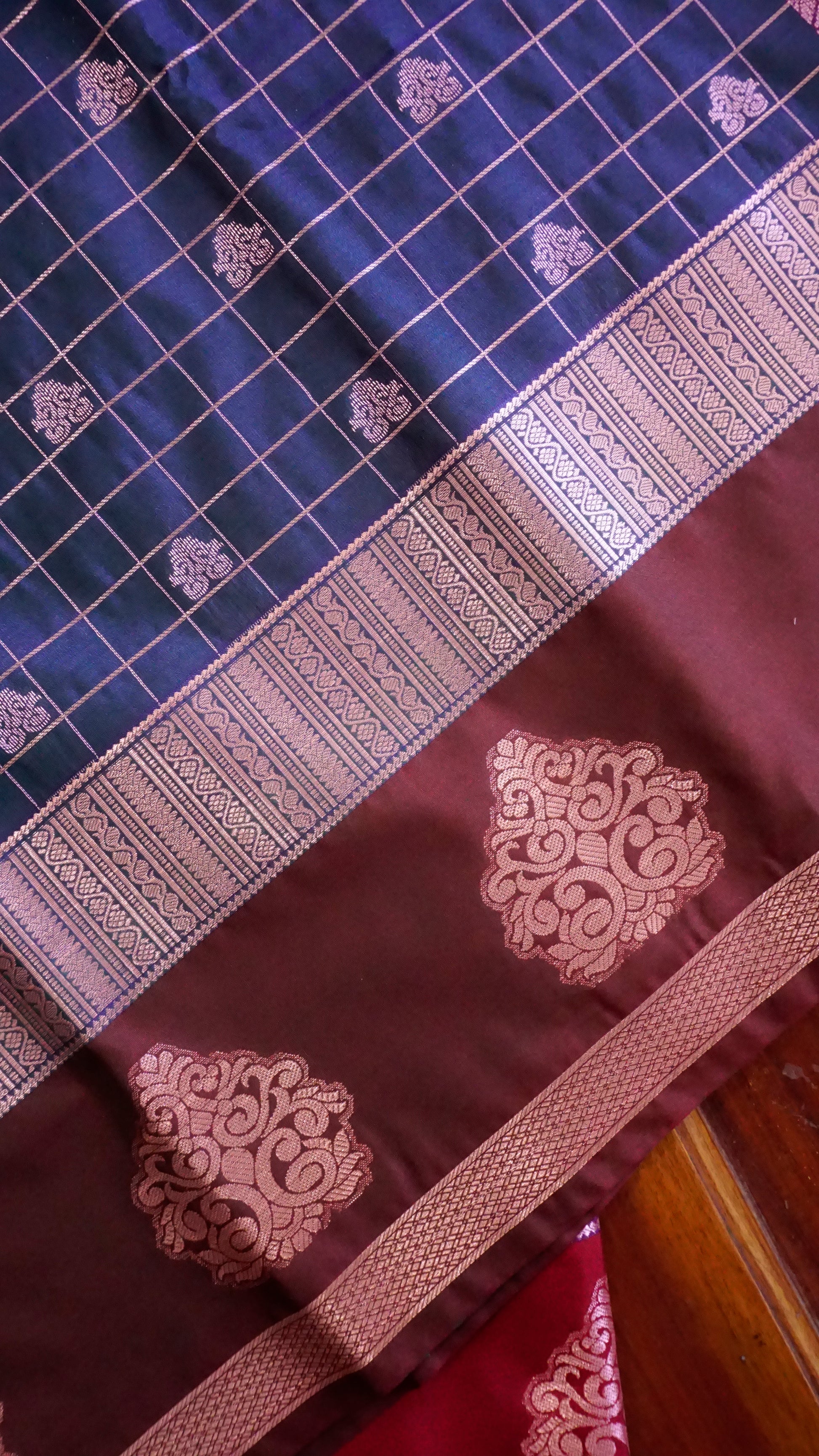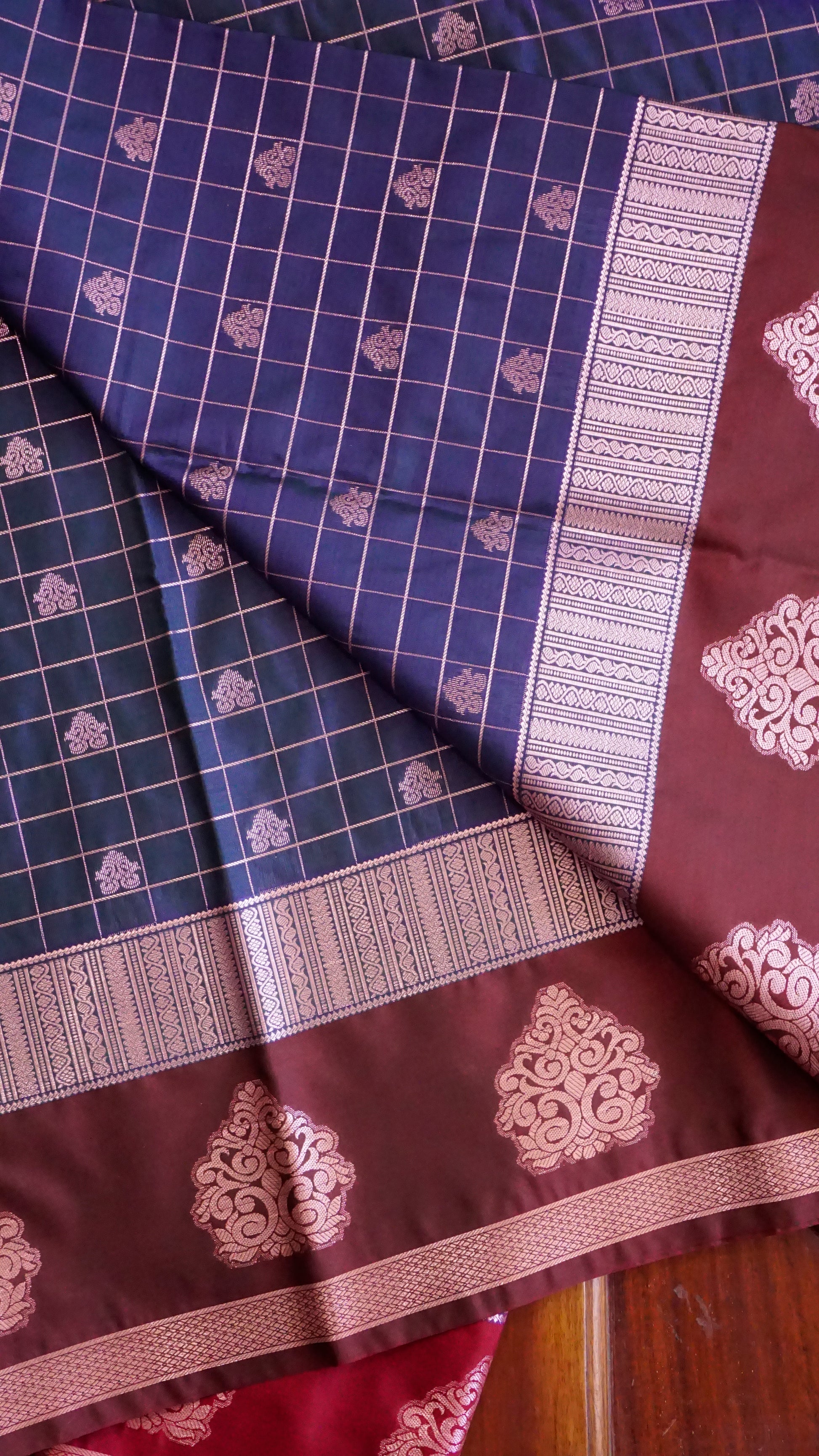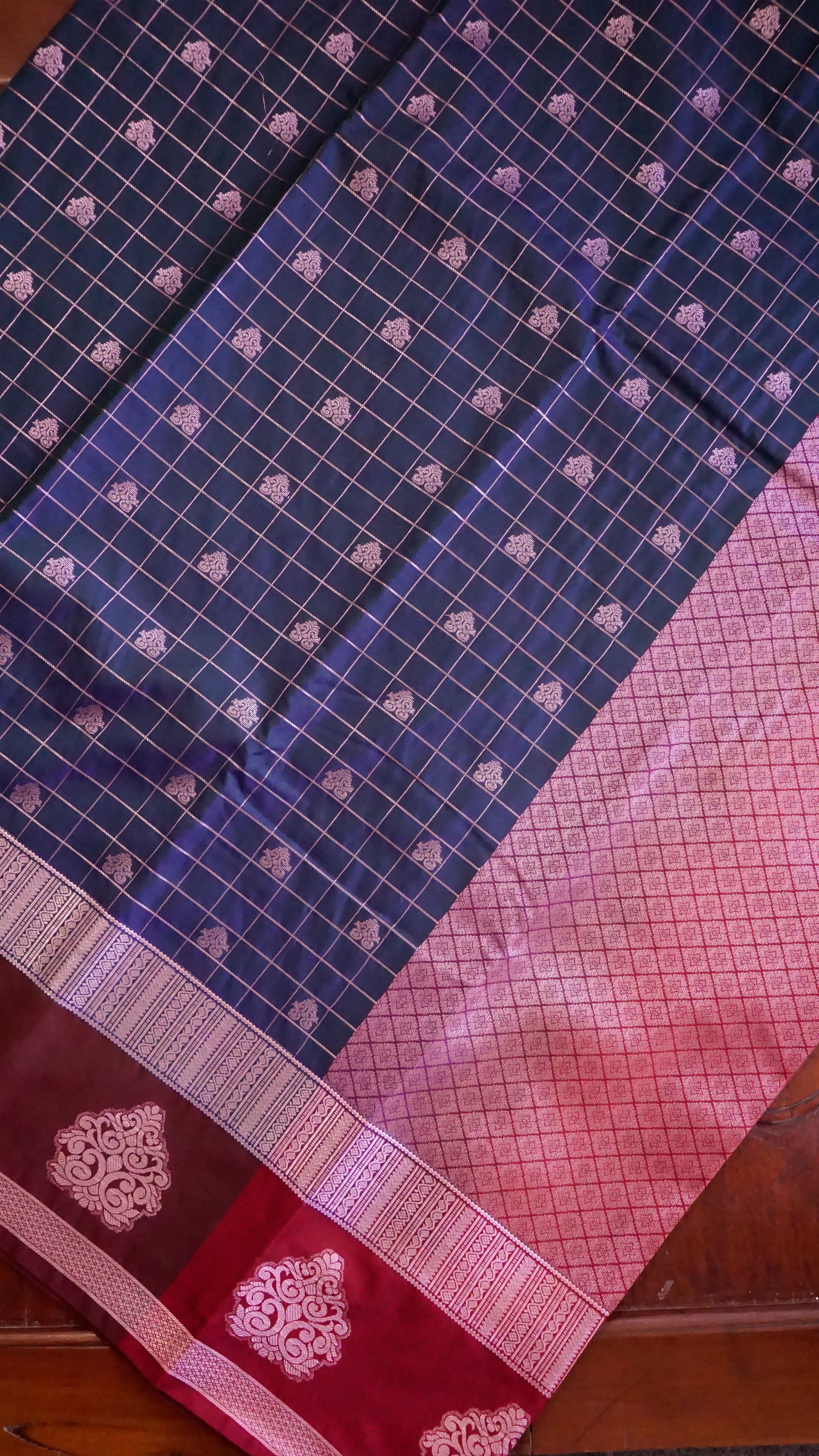 A beautiful semi-silk saree with lovely zari artwork and a deep maroon foundation, matched with a pallu that is checkered in navy blue. Ideal for ethnic gatherings, weddings, and celebratory events. Gentle, light, and elegant, with an opulent drape.