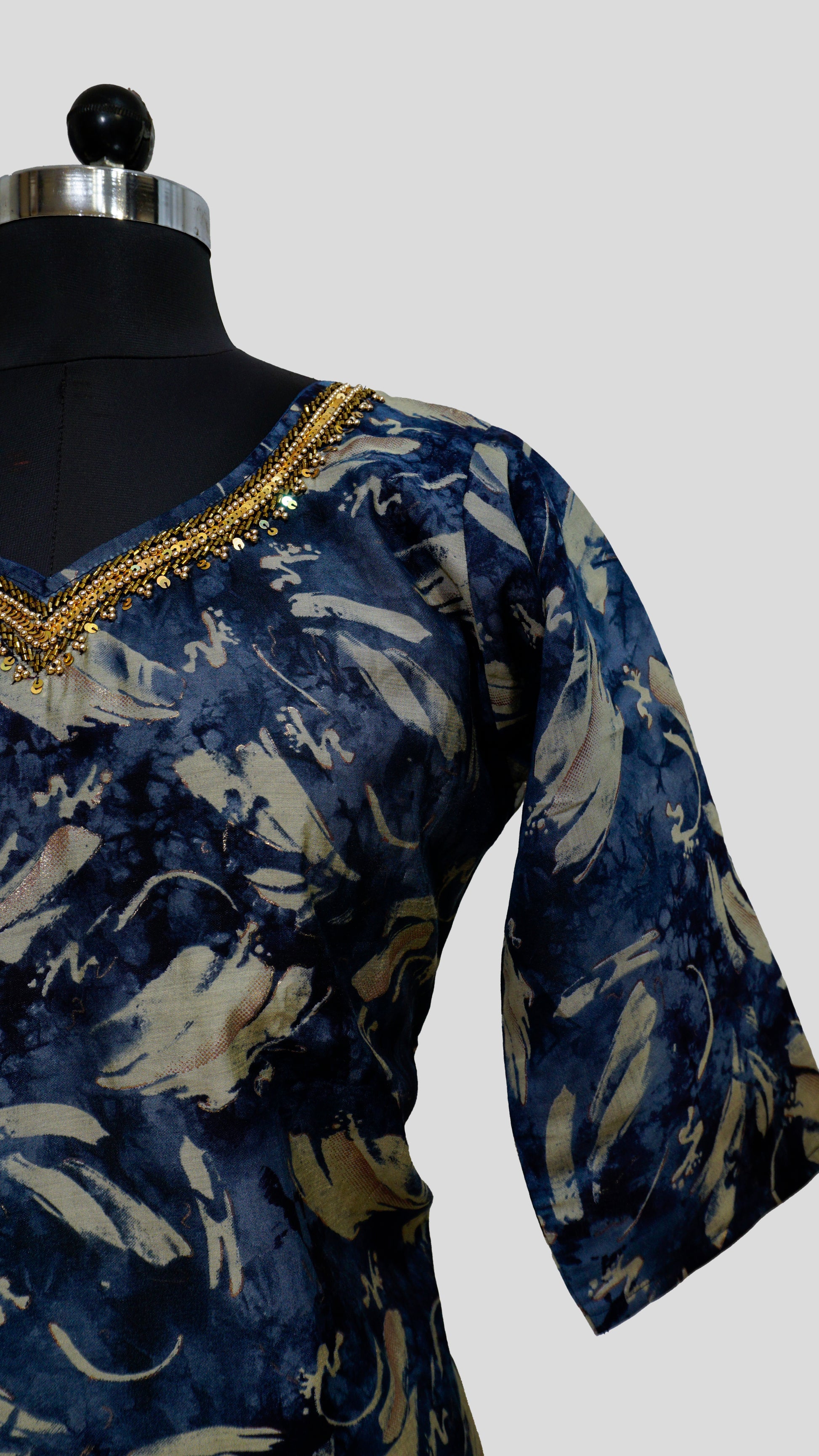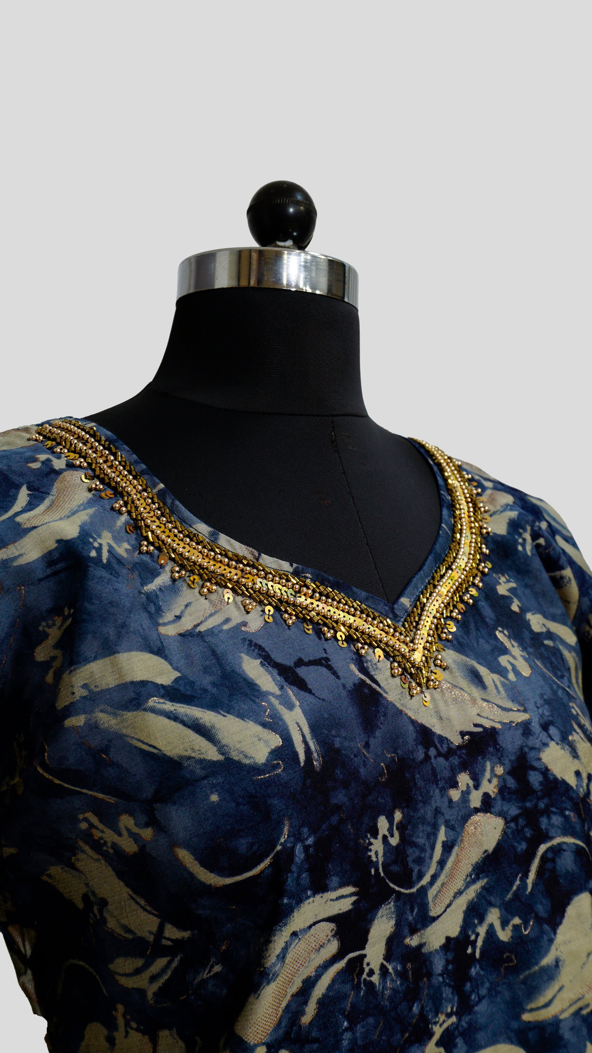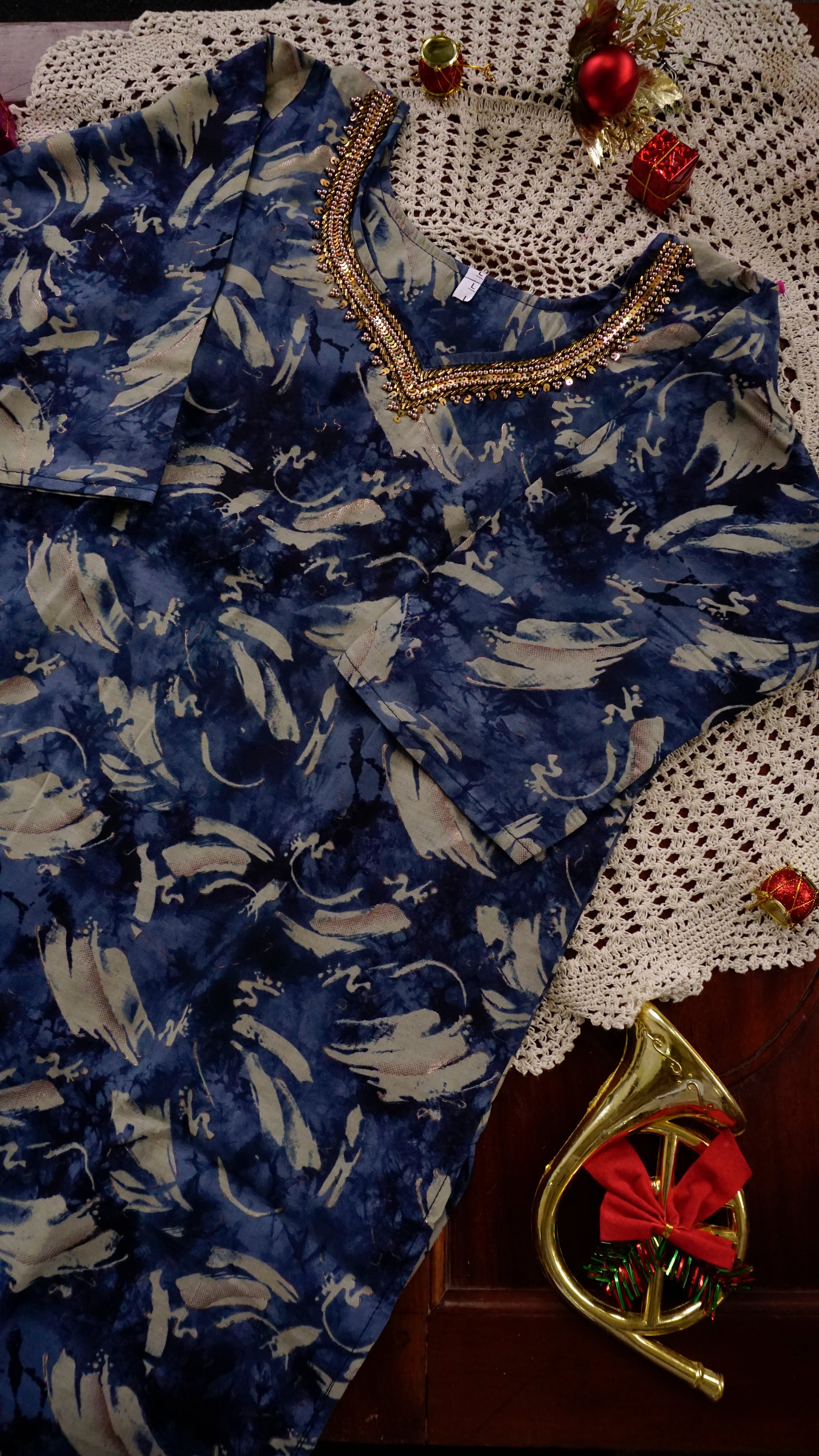Explore the indigo depths. 💙  This gorgeous dark blue kurti embodies both traditional workmanship and contemporary appeal with its dreamy, abstract wash design, which makes it a great statement piece.  Its elegant appearance and breathable comfort are expertly balanced by its exquisite gold V-neck trim and cozy three-quarter sleeve design.  This stylish, ready-to-wear item is ideal for any occasion where carefree elegance is required.