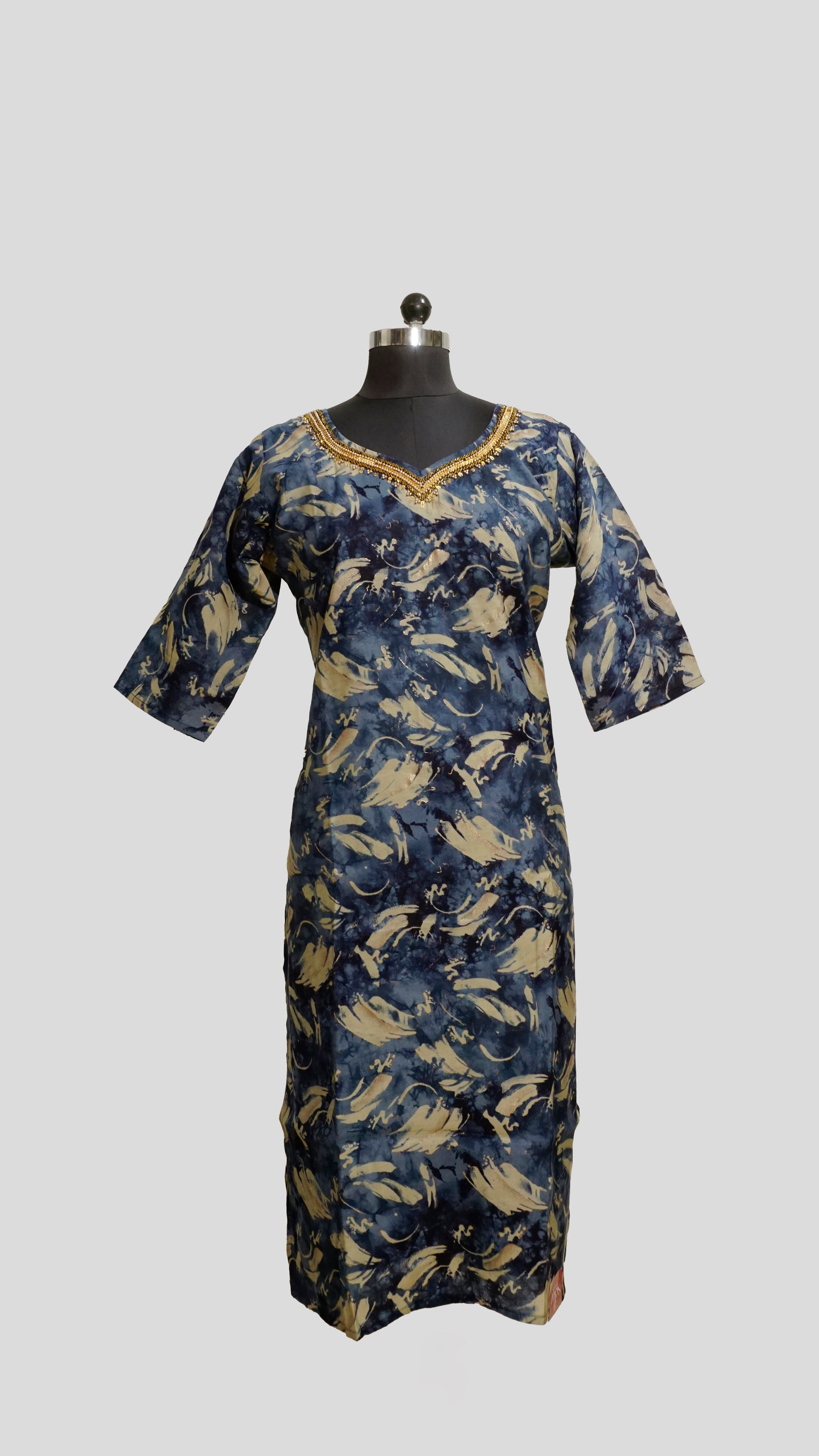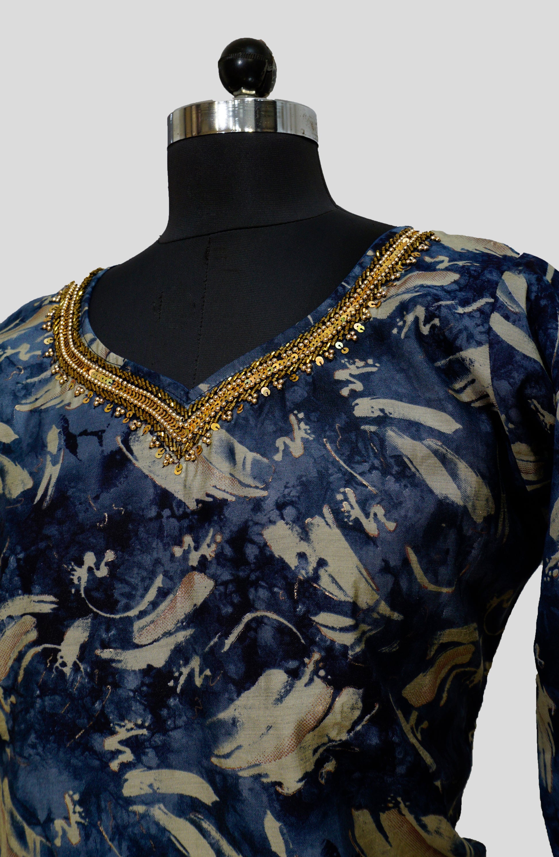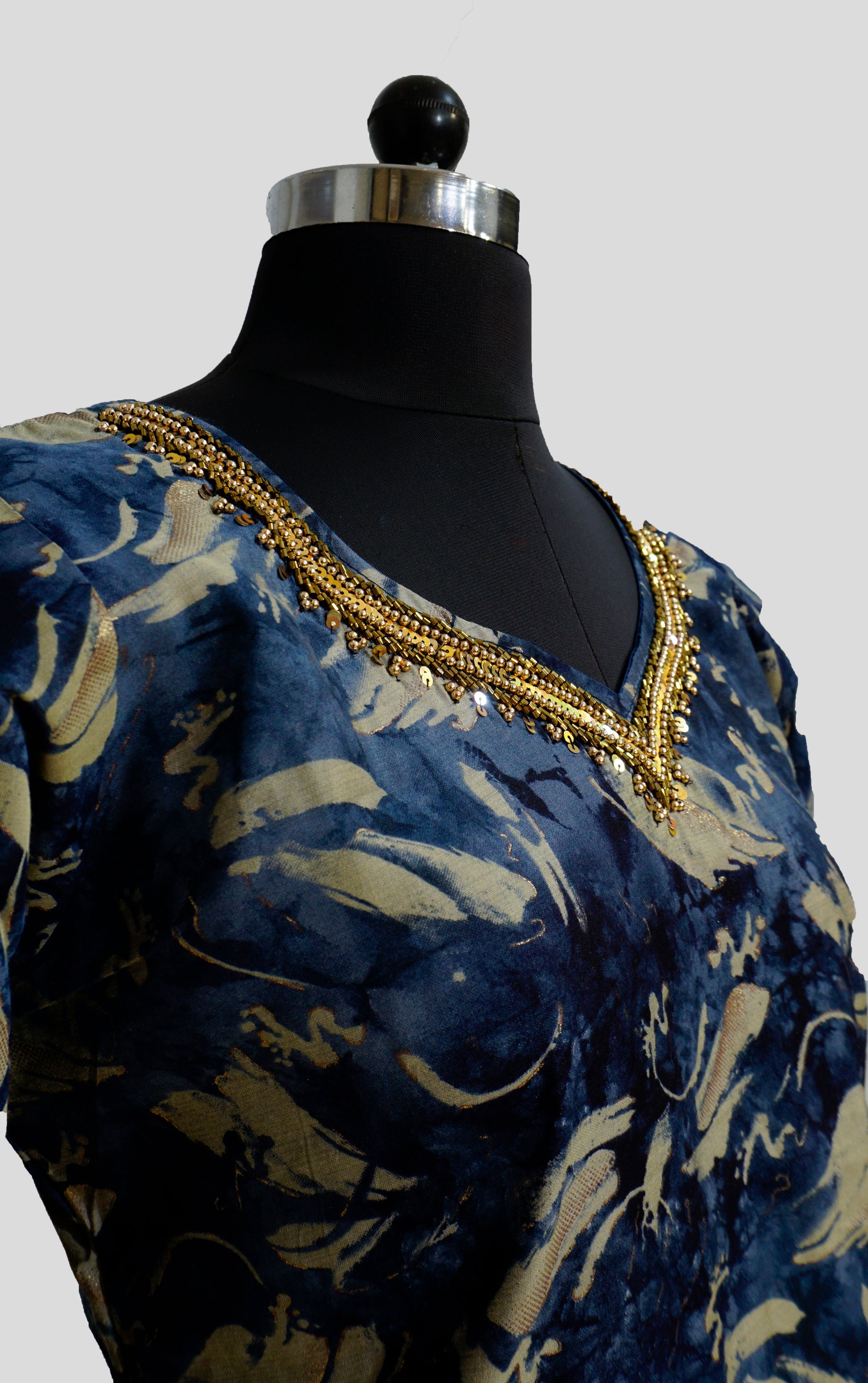 Explore the indigo depths. 💙  This gorgeous dark blue kurti embodies both traditional workmanship and contemporary appeal with its dreamy, abstract wash design, which makes it a great statement piece.  Its elegant appearance and breathable comfort are expertly balanced by its exquisite gold V-neck trim and cozy three-quarter sleeve design.  This stylish, ready-to-wear item is ideal for any occasion where carefree elegance is required.