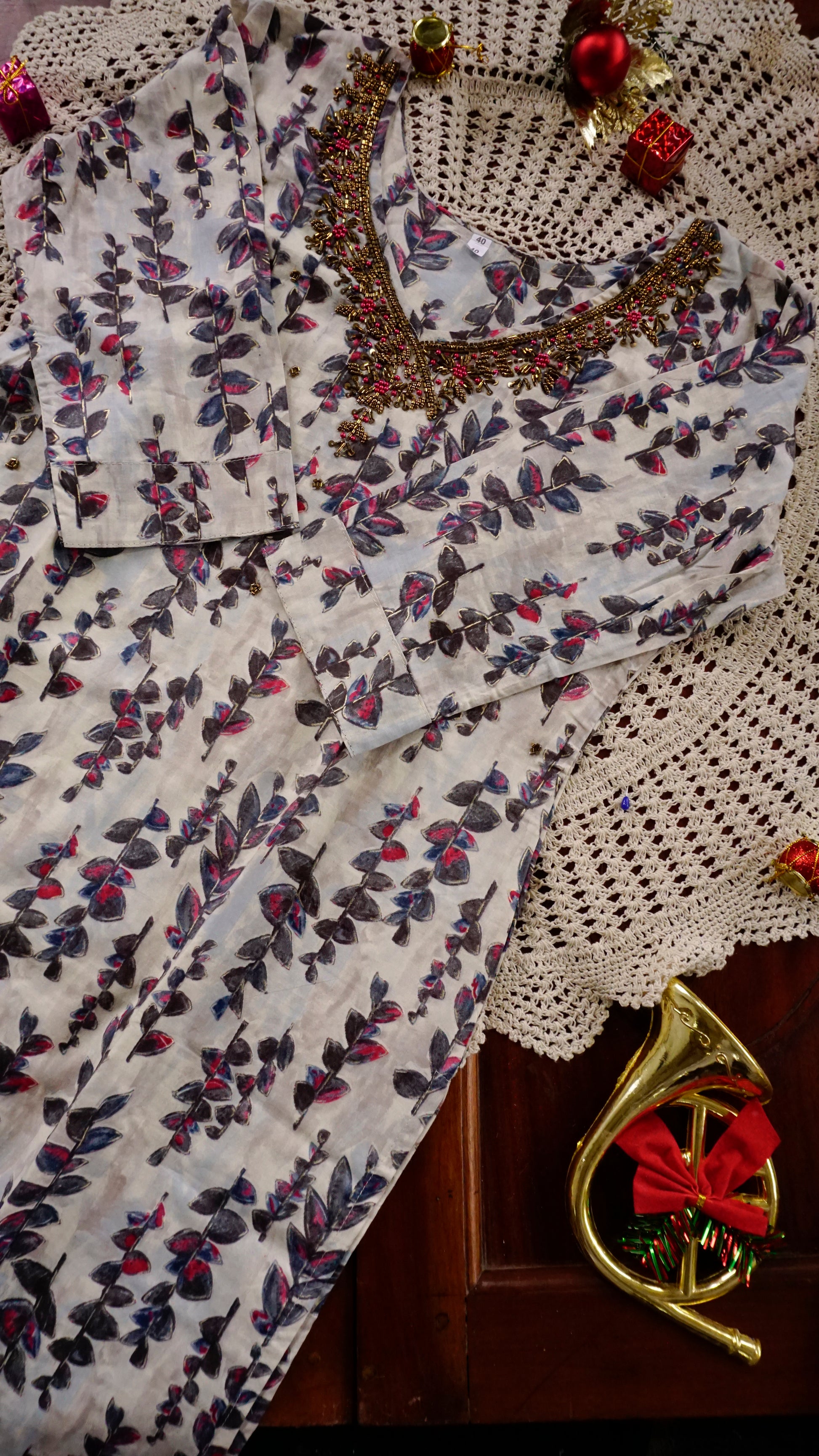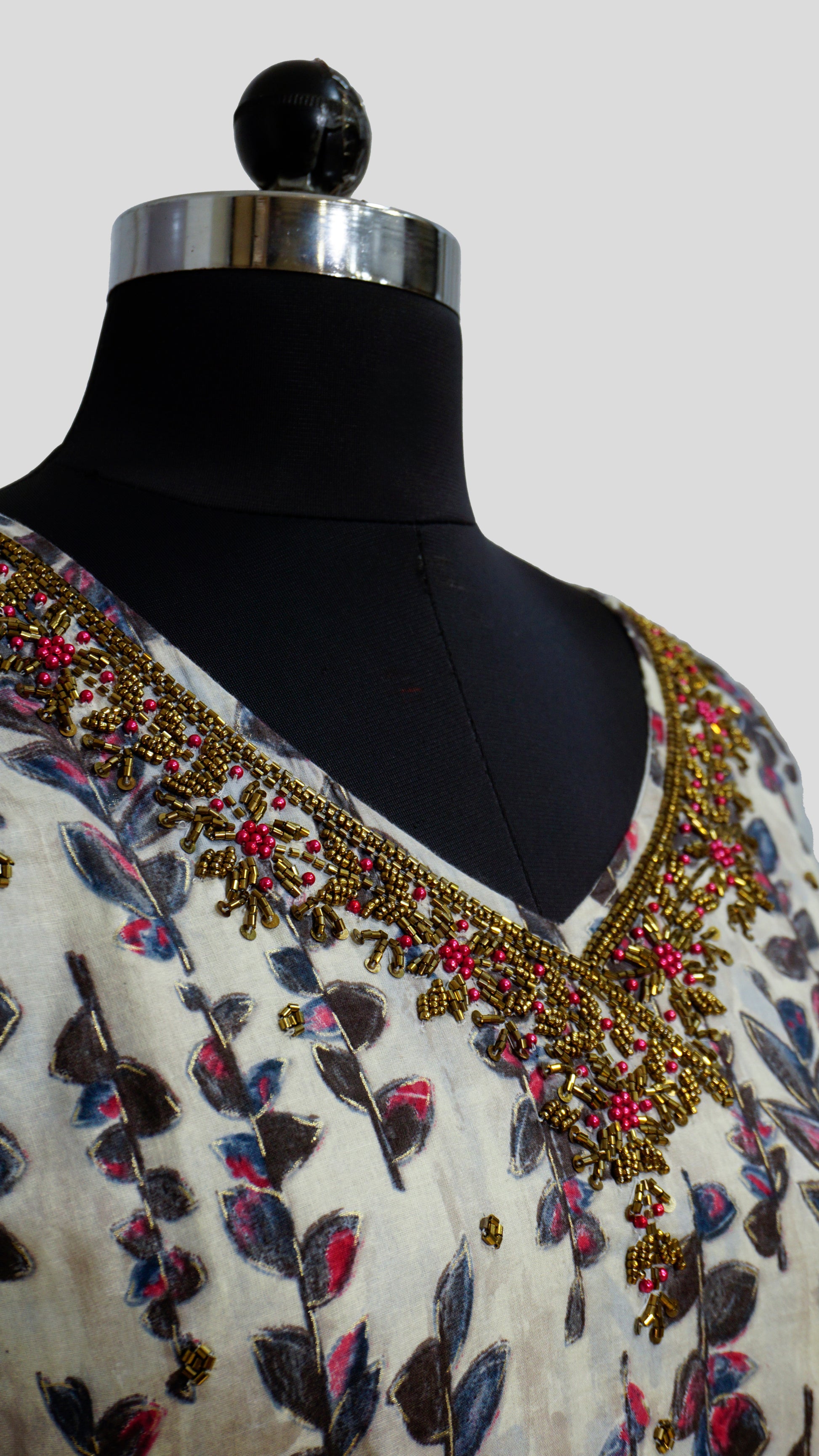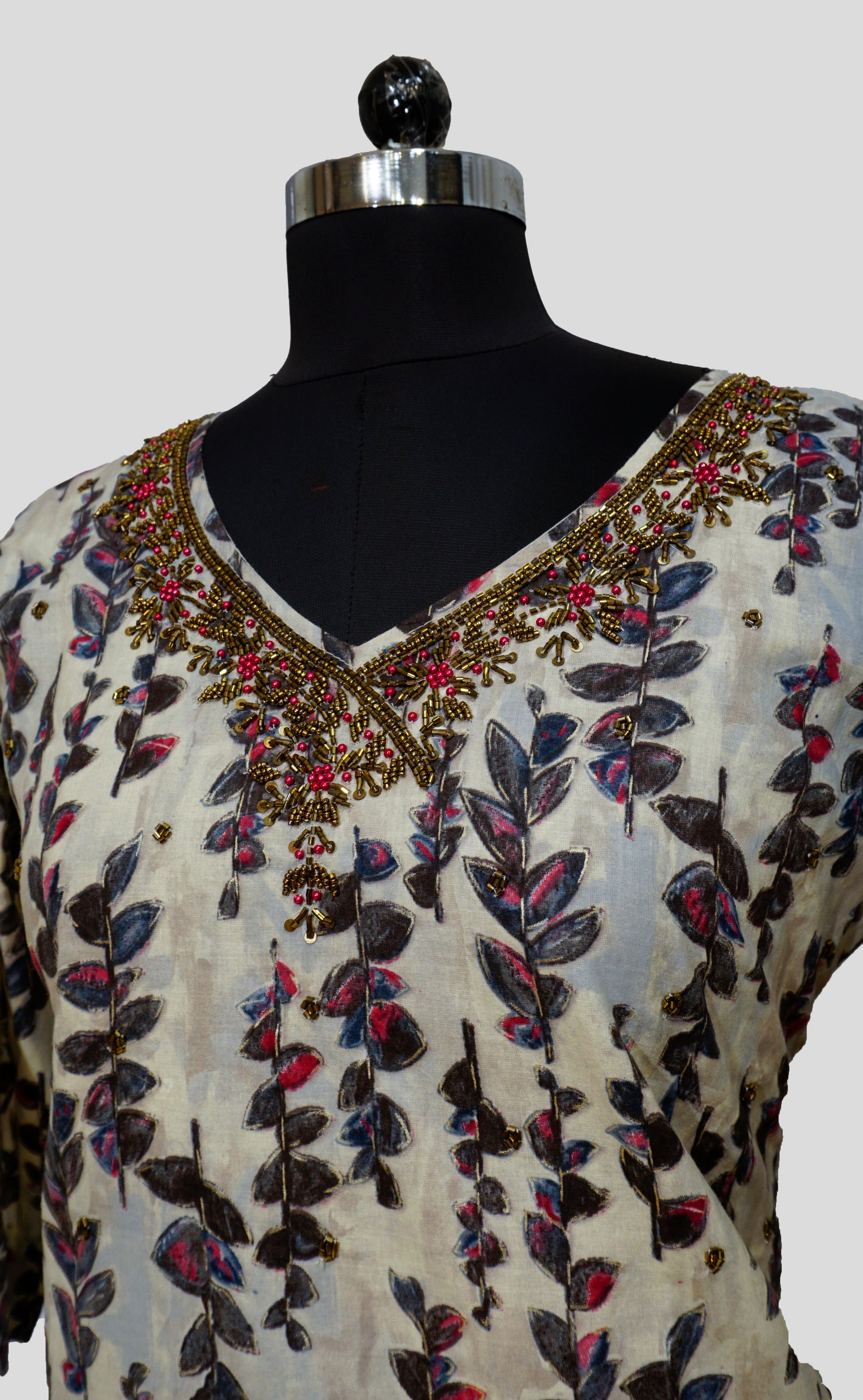Explore the indigo depths. 💙  This gorgeous dark blue kurti embodies both traditional workmanship and contemporary appeal with its dreamy, abstract wash design, which makes it a great statement piece.  Its elegant appearance and breathable comfort are expertly balanced by its exquisite gold V-neck trim and cozy three-quarter sleeve design.  This stylish, ready-to-wear item is ideal for any occasion where carefree elegance is required.