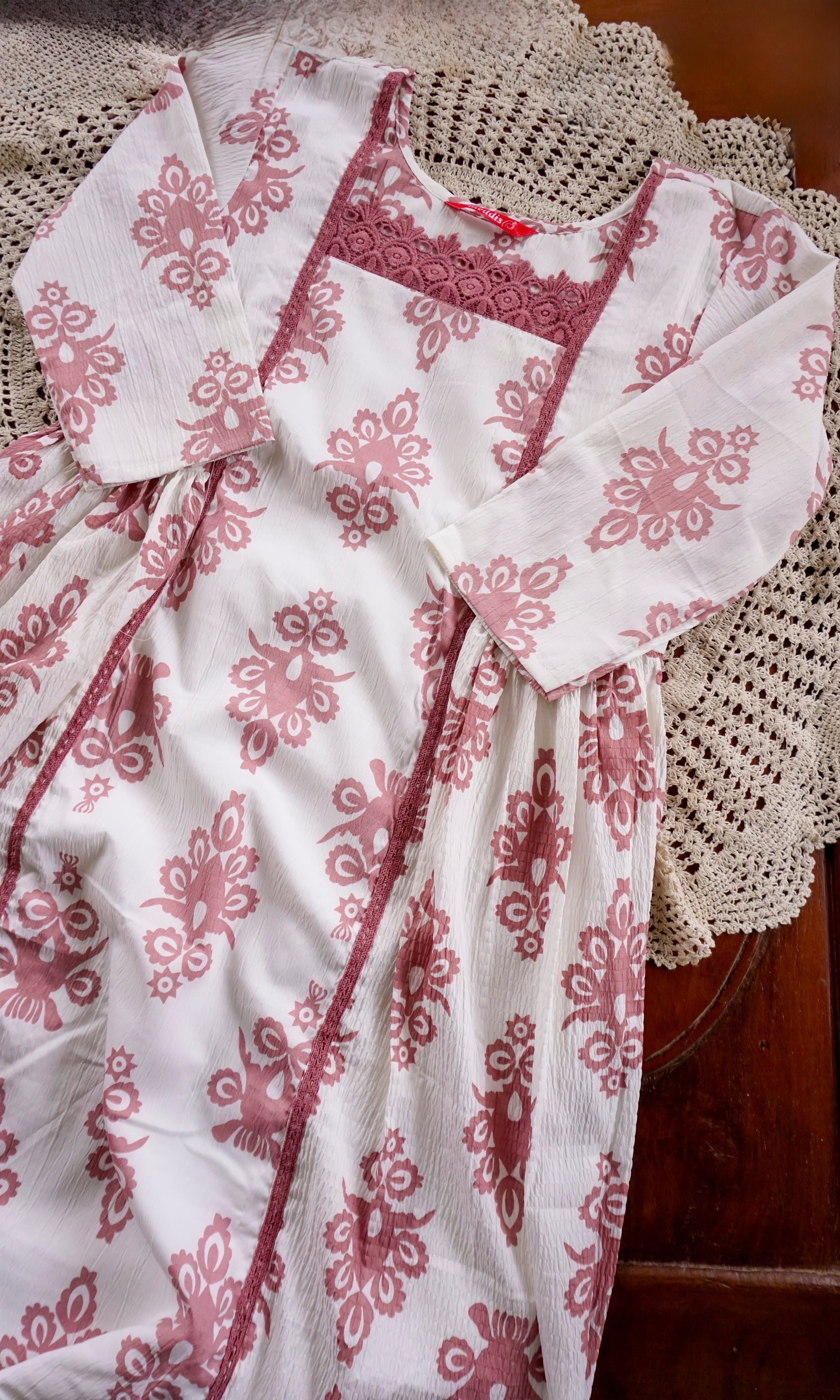 Crafted from lightweight, breathable cotton, it features a delicate floral pattern in soothing peach tones. The straight-fit silhouette, short sleeves, and detailed neckline create a graceful and comfortable look suitable for daily wear, casual outings, and office use. The soft pastel color adds charm and makes it perfect for all-season comfort.