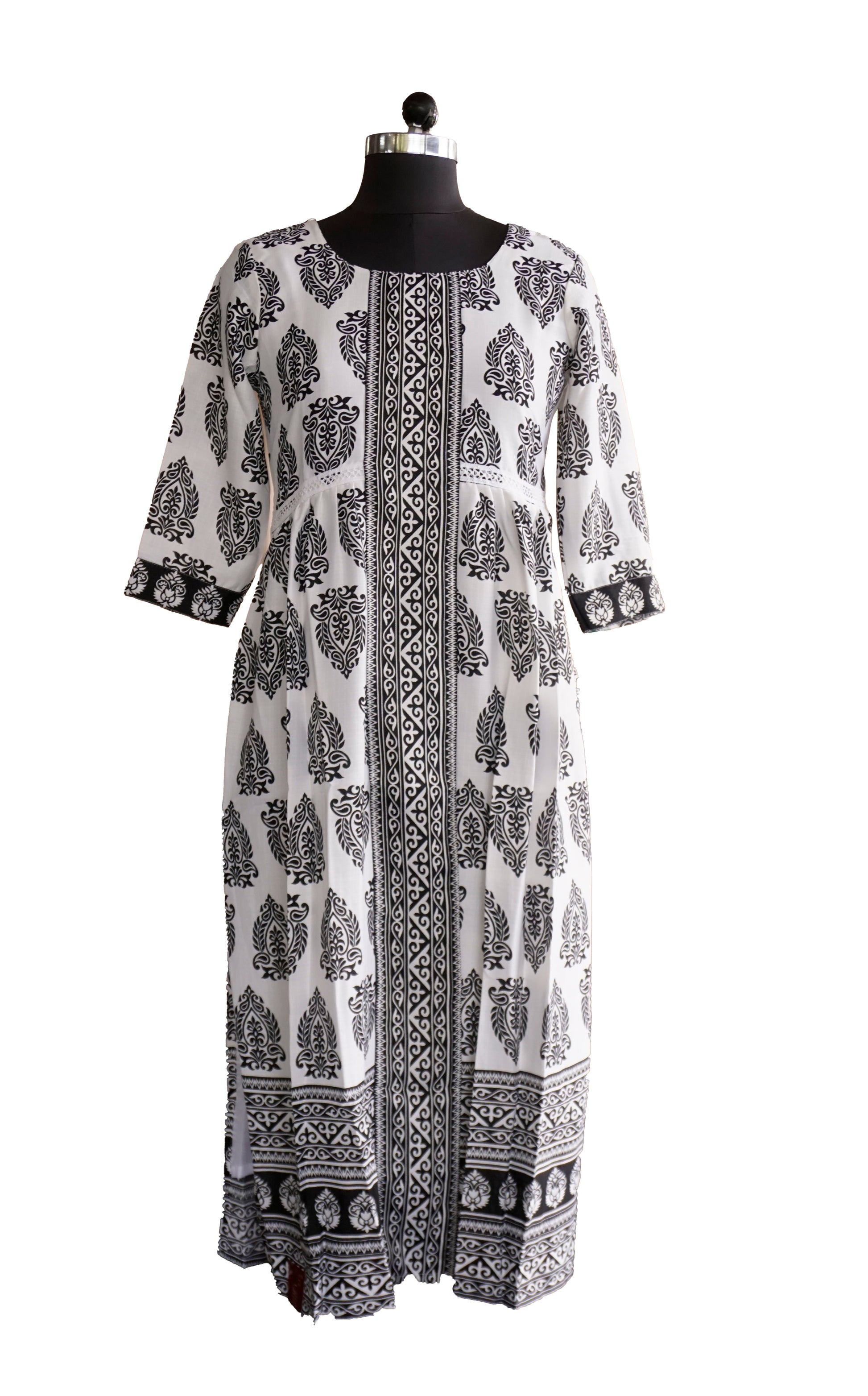 Crafted from soft, breathable cotton, it features a beautiful monochrome block-print pattern that adds a classic ethnic charm. The straight fit and 3/4th sleeves ensure all-day comfort, making it ideal for daily wear, office, or casual outings. A detailed printed front panel enhances the overall look, giving it a refined and graceful finish.