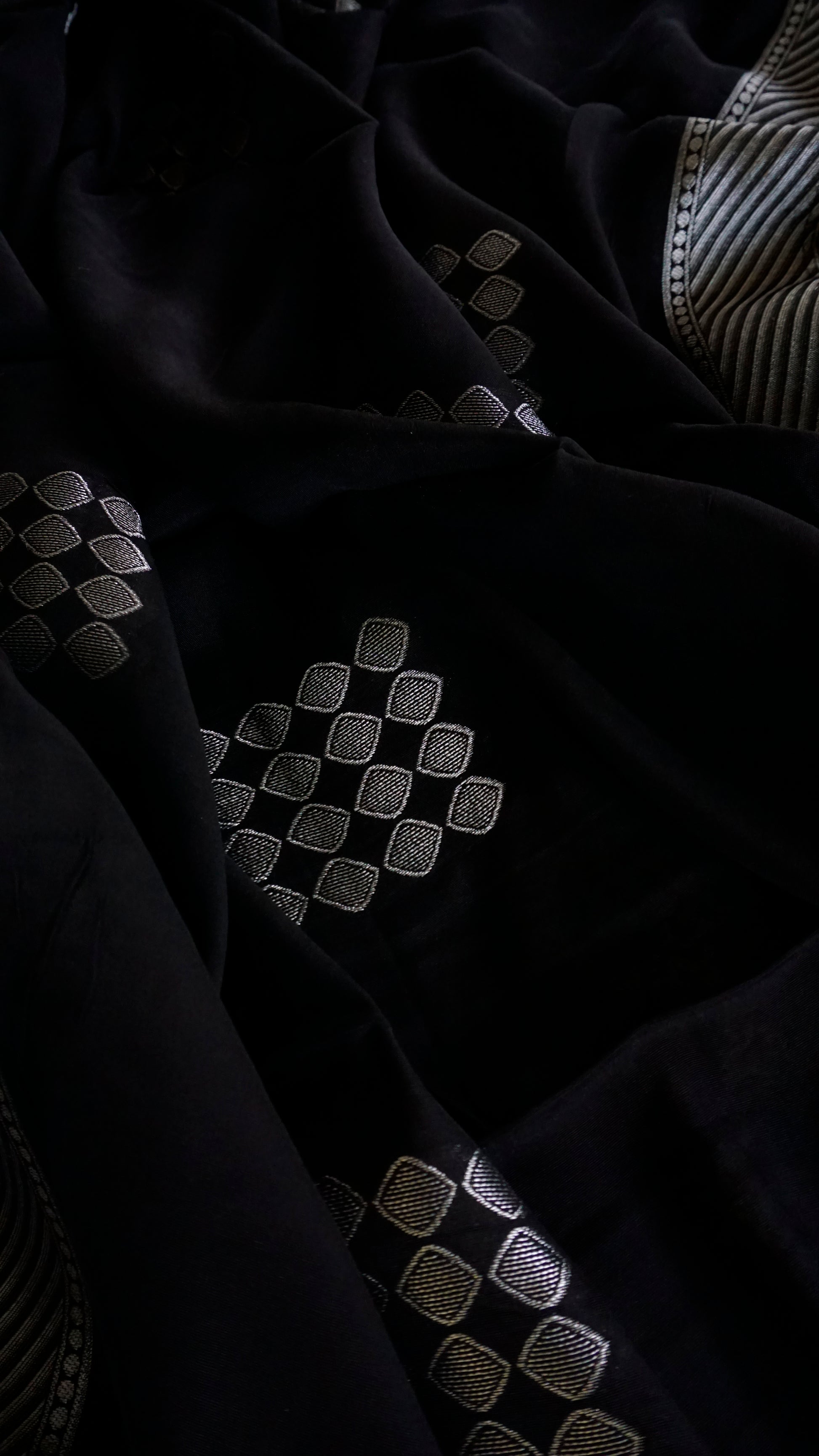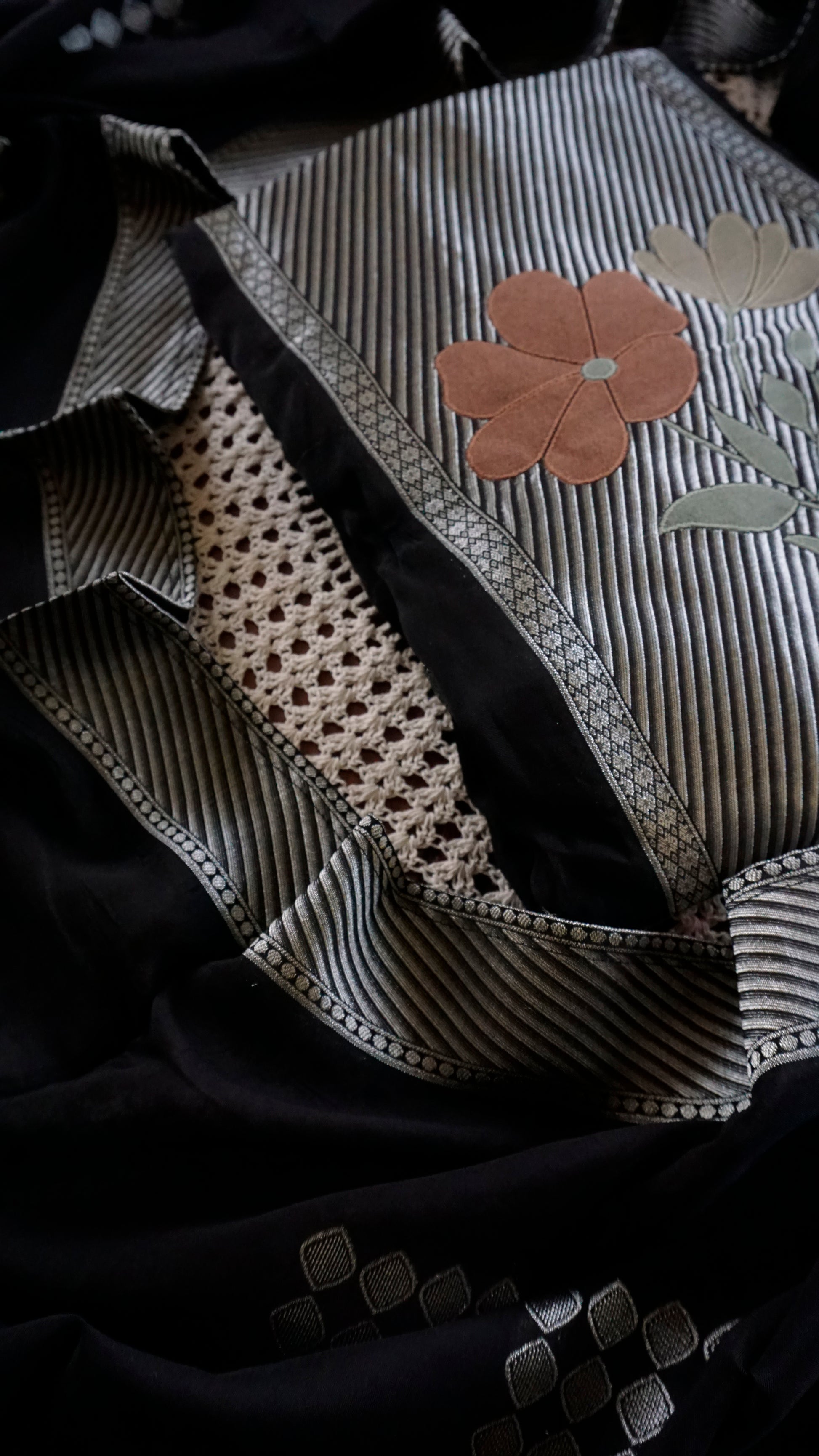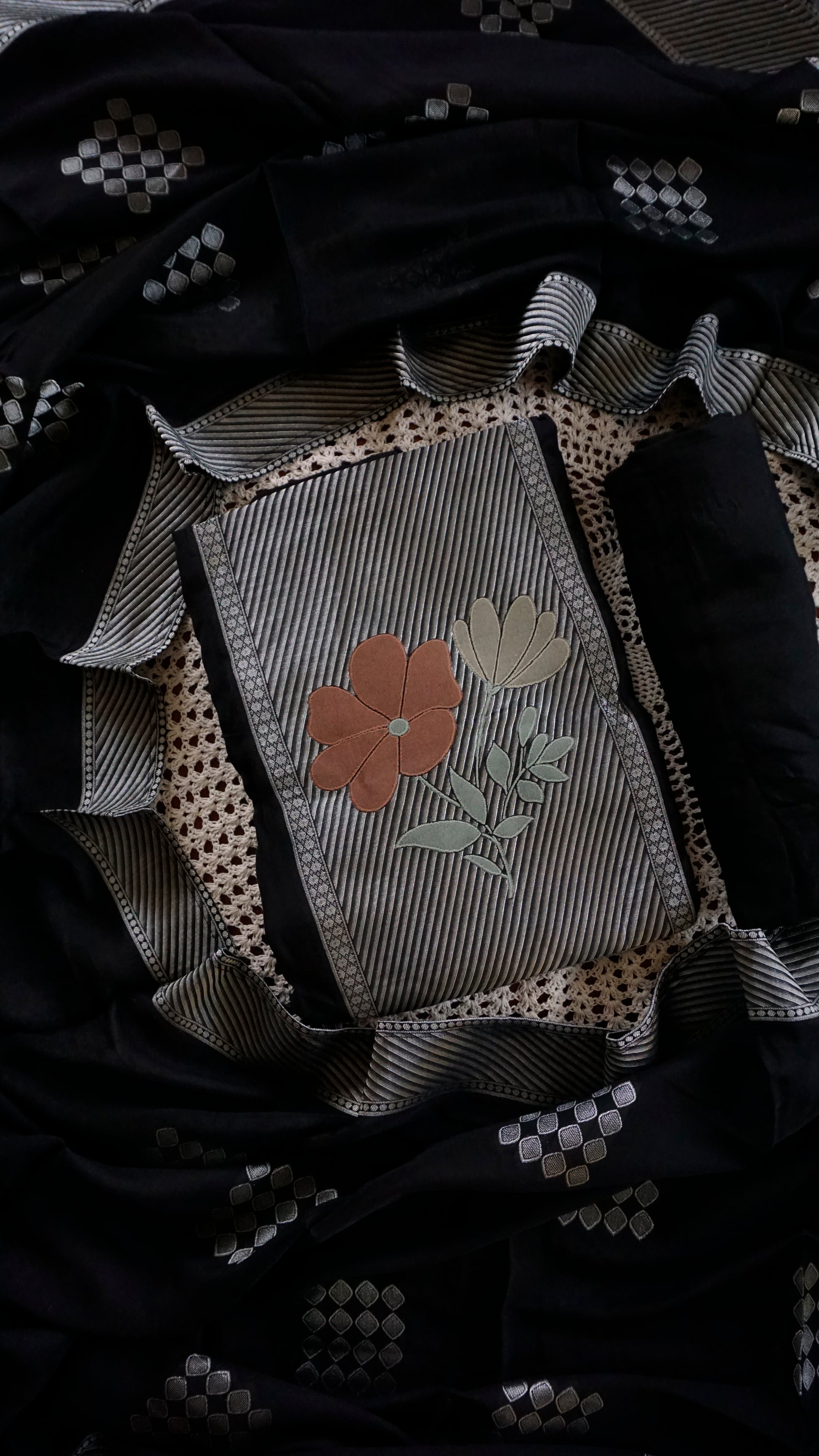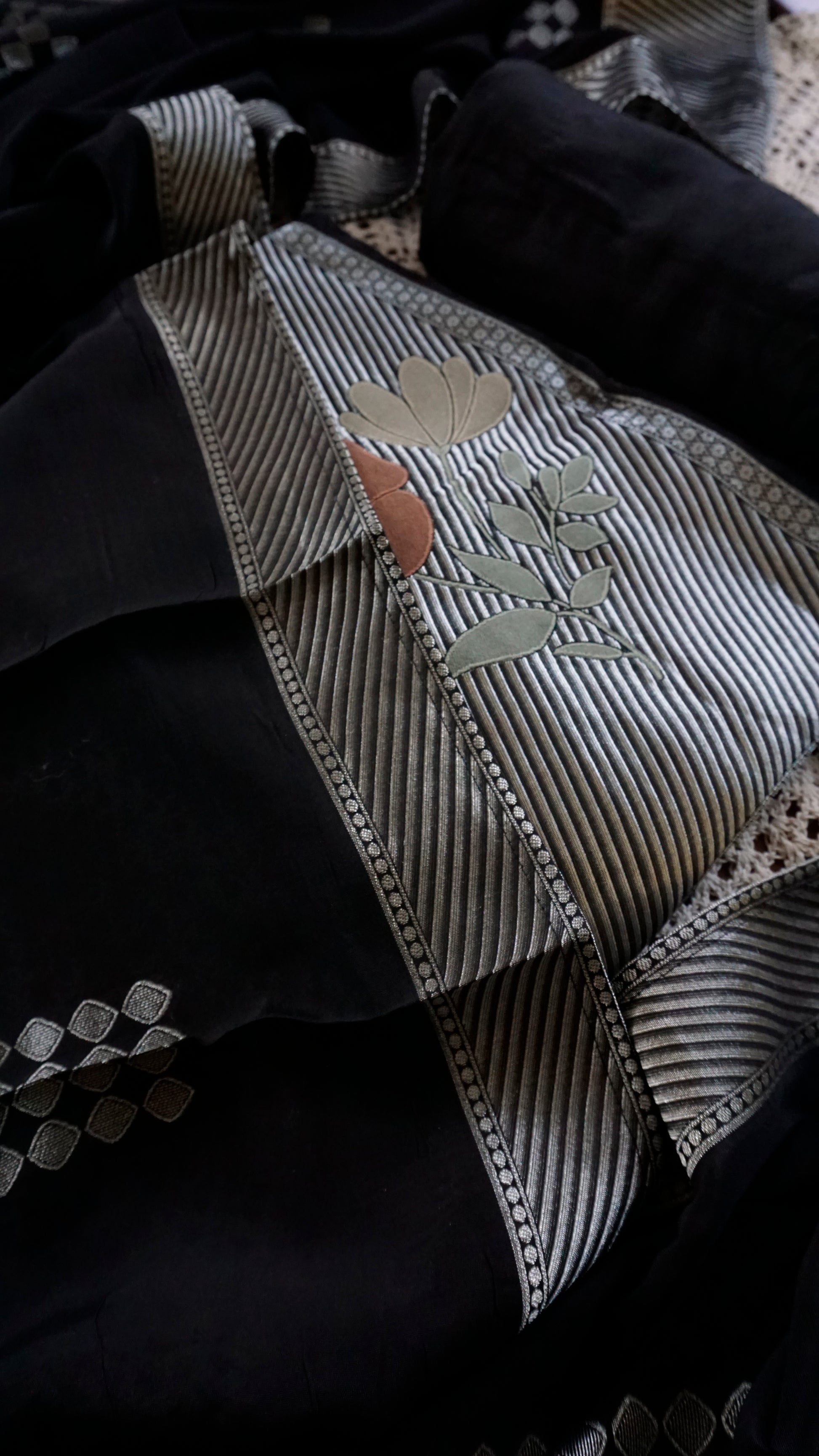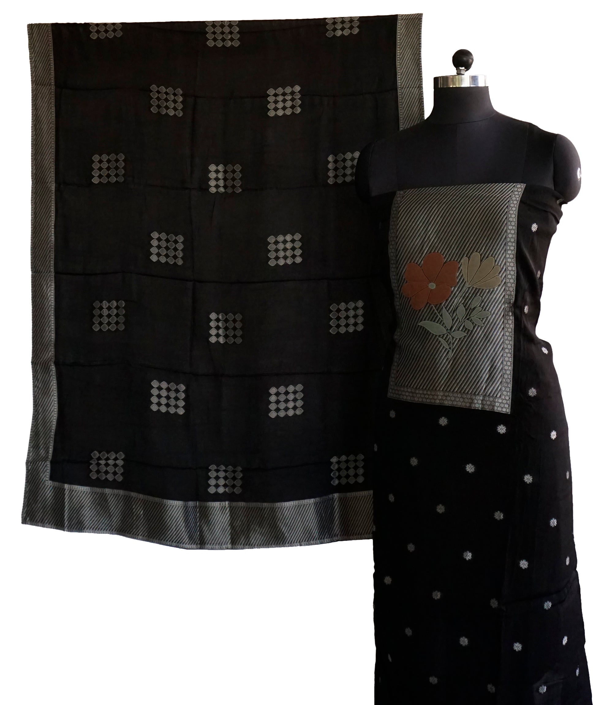 The top features beautiful Banarasi work with floral buttas, paired with a matching bottom and a stunning dupatta enhanced with traditional Banarasi patterns.
