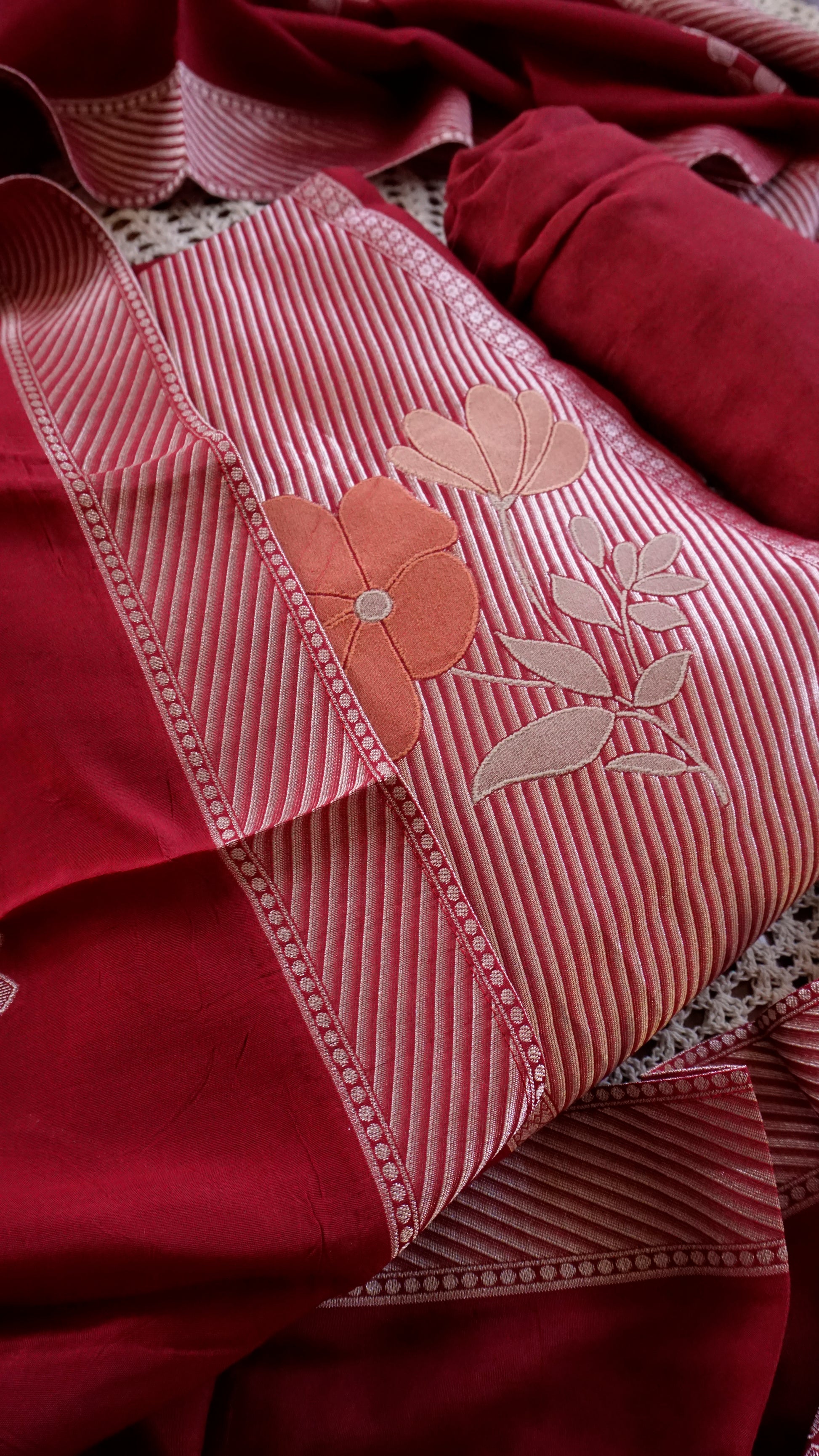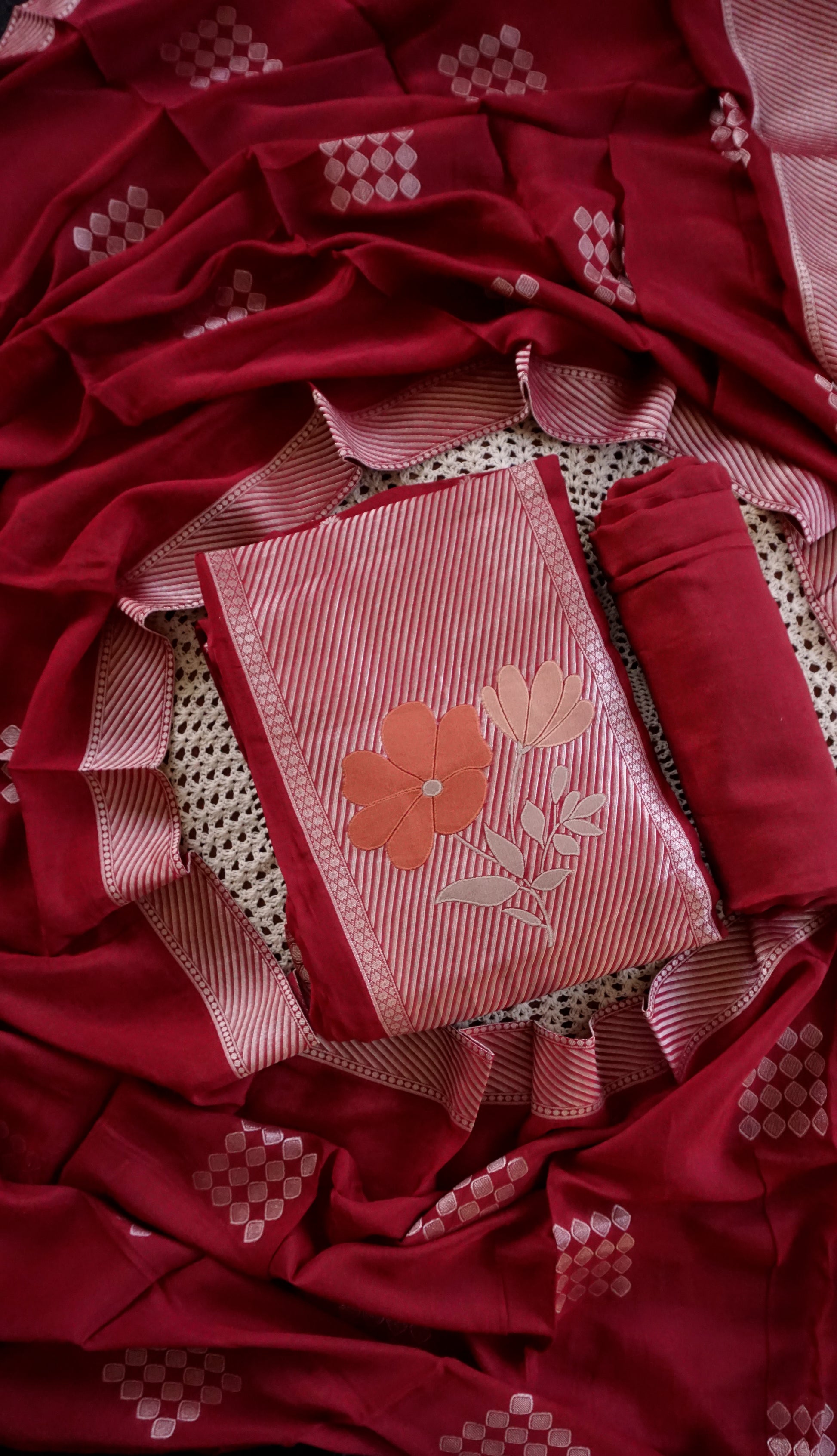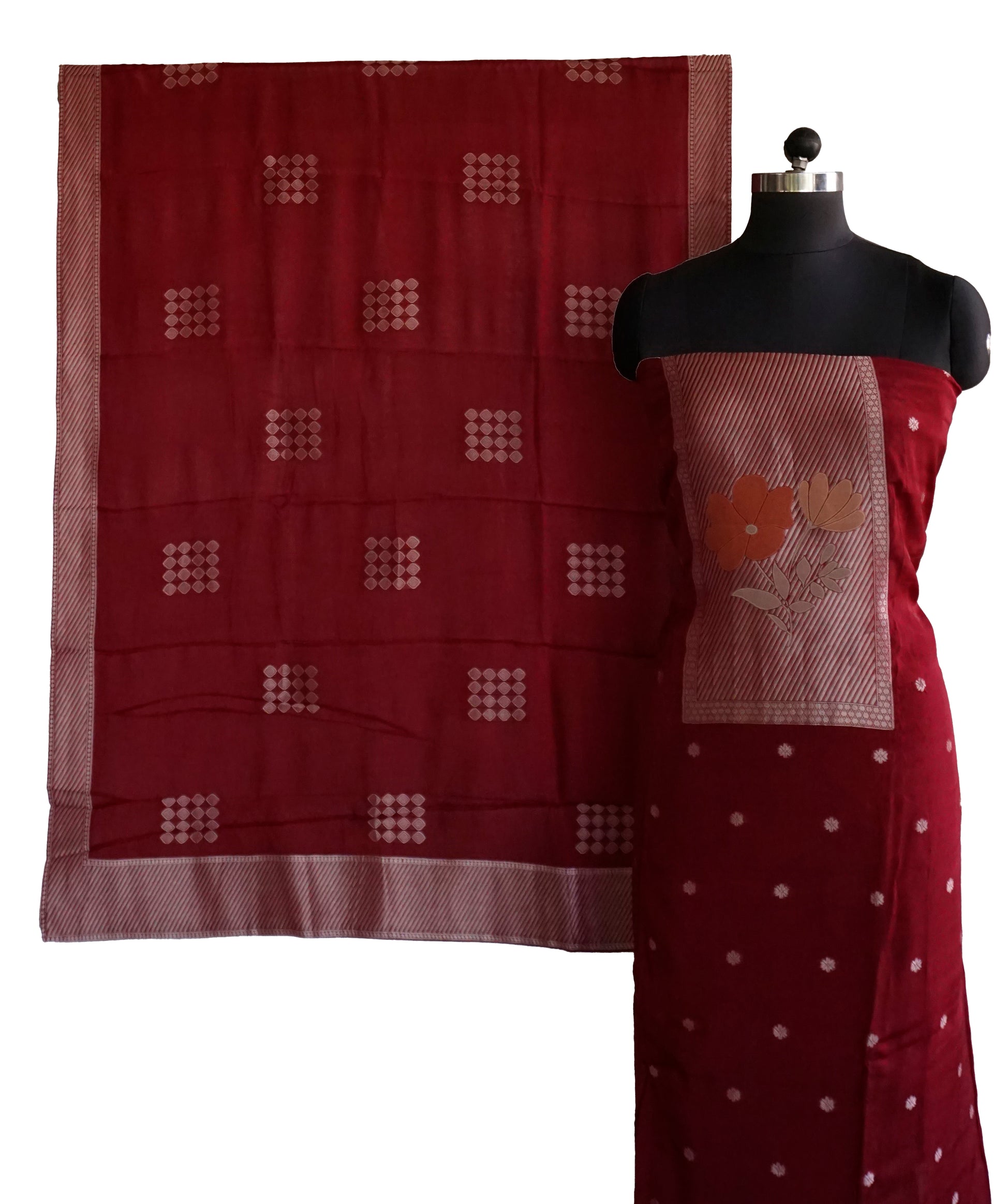 The top features beautiful Banarasi work with floral buttas, paired with a matching bottom and a stunning dupatta enhanced with traditional Banarasi patterns.