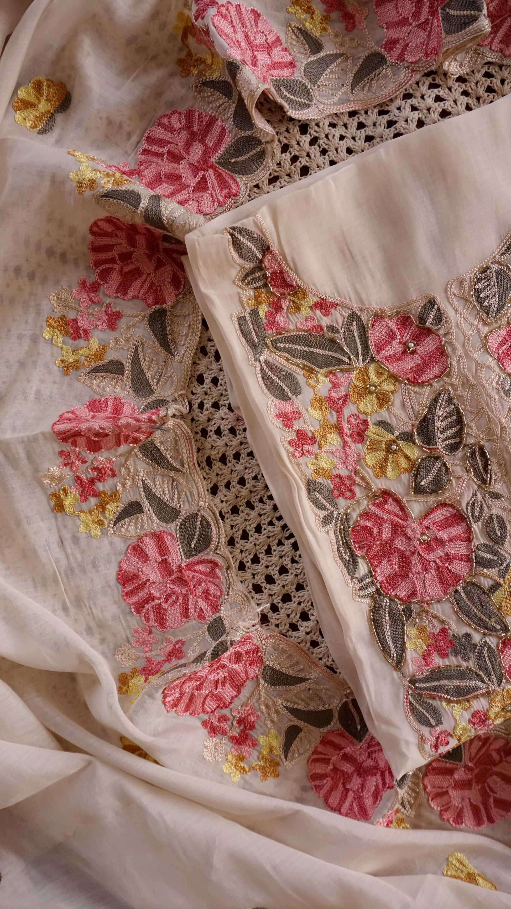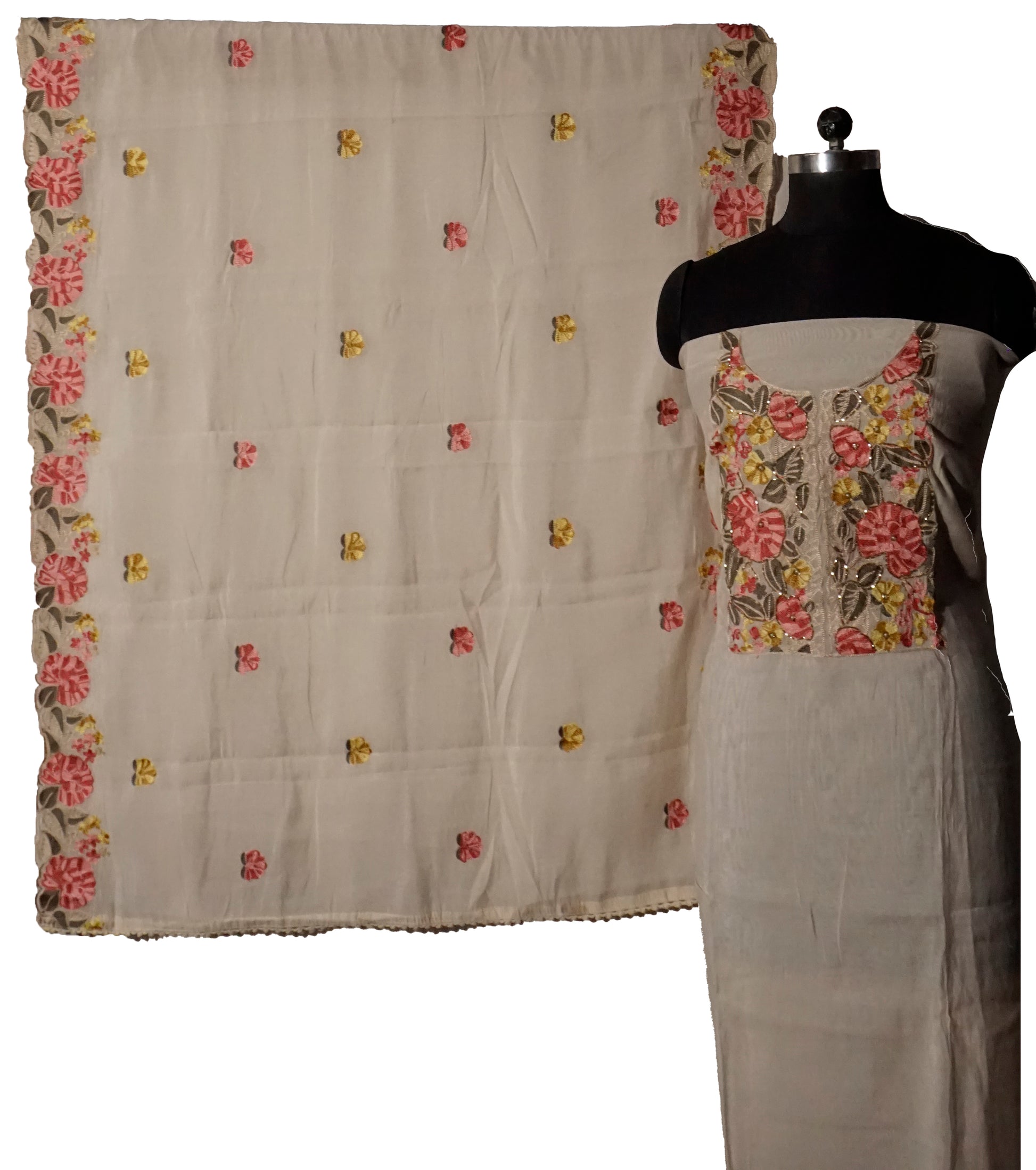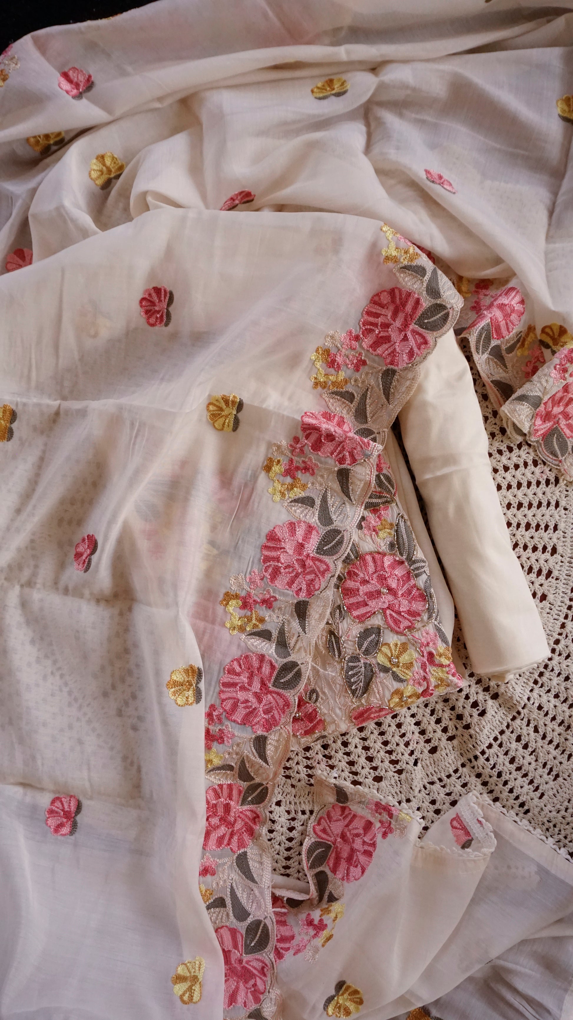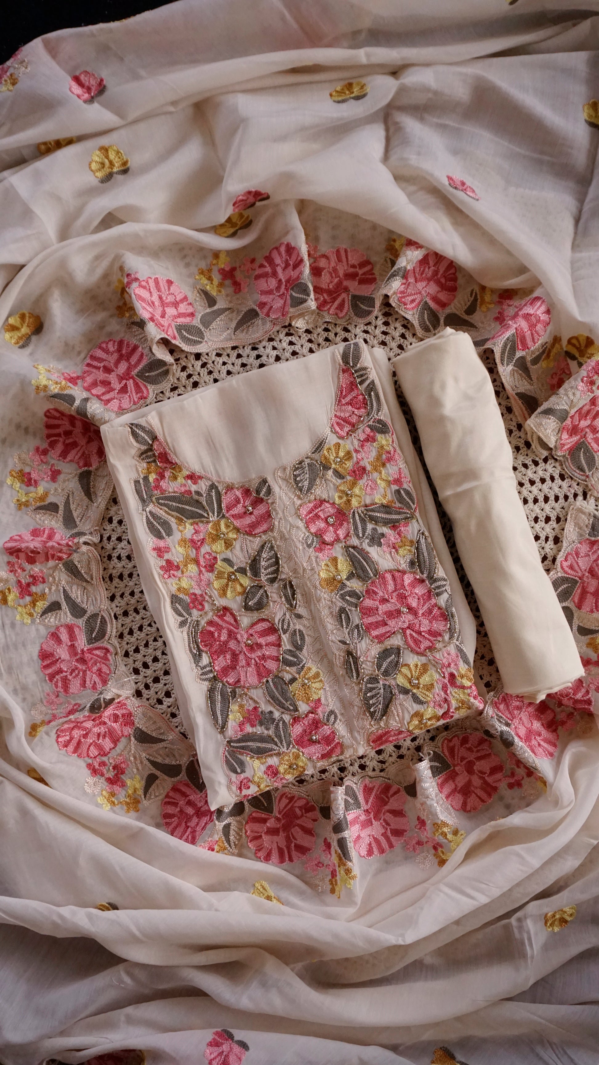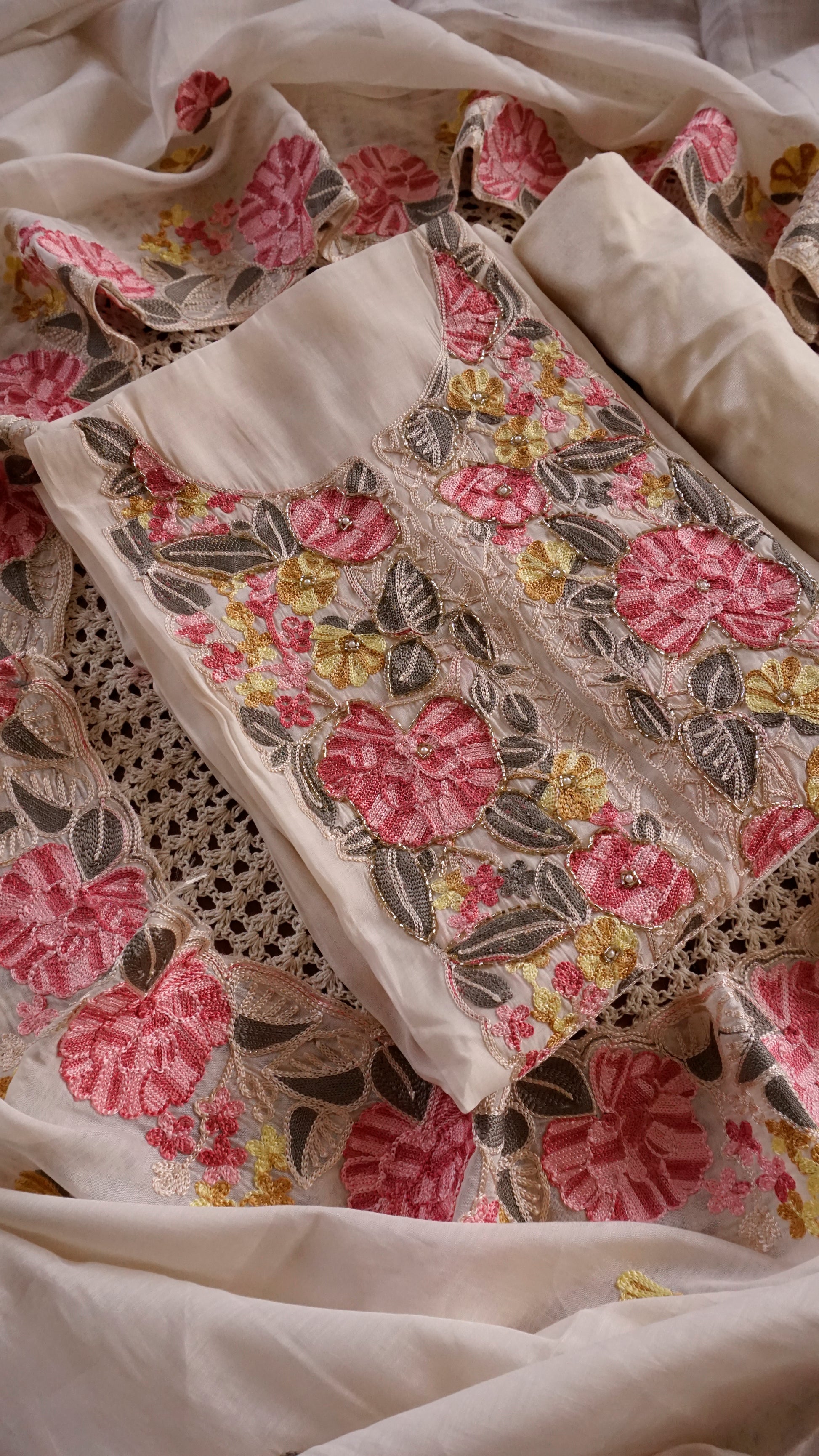 Elevate your ethnic wardrobe with this premium unstitched salwar set, crafted for effortless elegance. The set features a beautifully floral embroidered kurta panel highlighted with intricate threadwork and delicate detailing. Paired with a soft, flowy matching dupatta adorned with subtle motifs, this ensemble offers a graceful festive appeal.