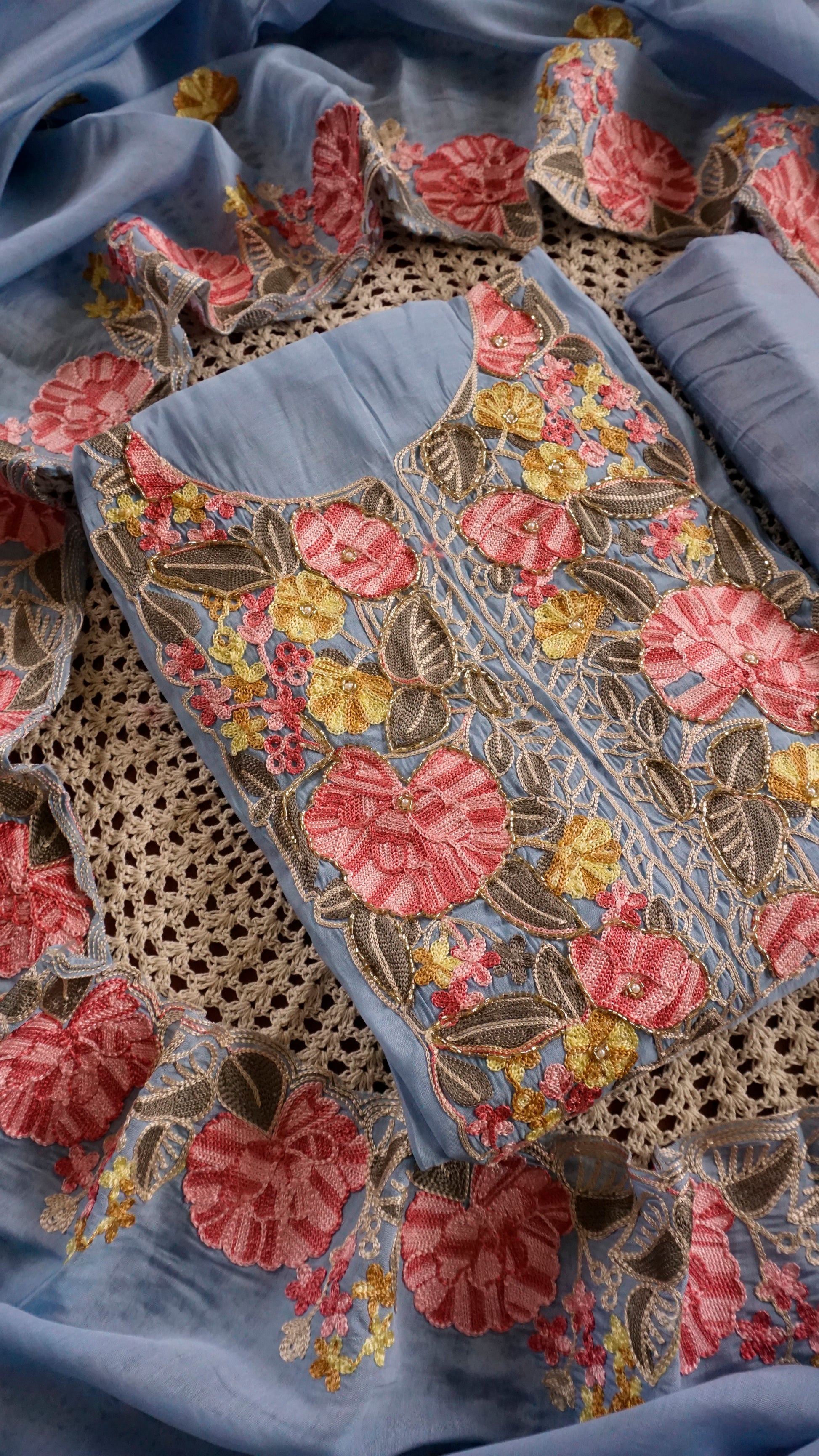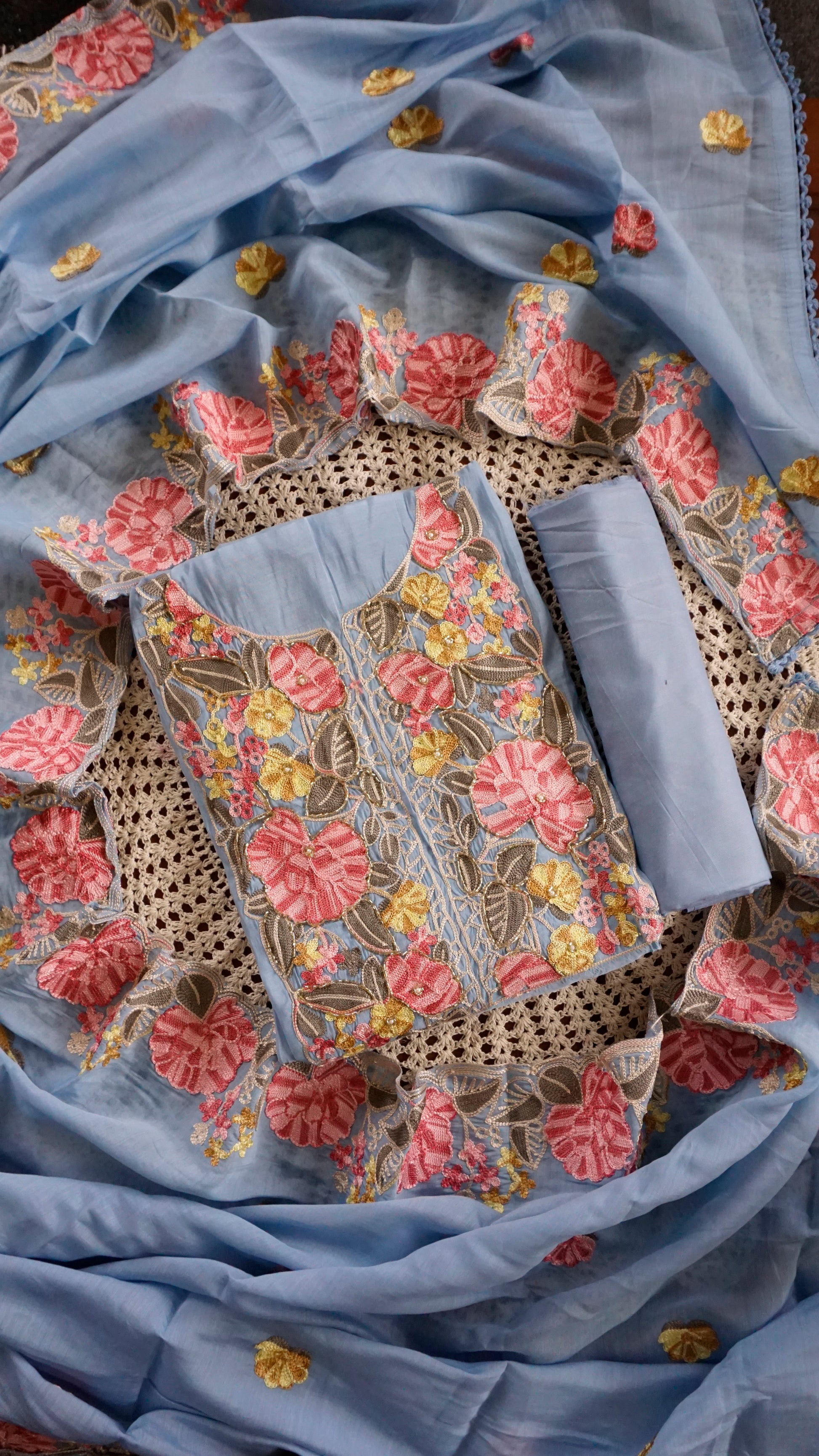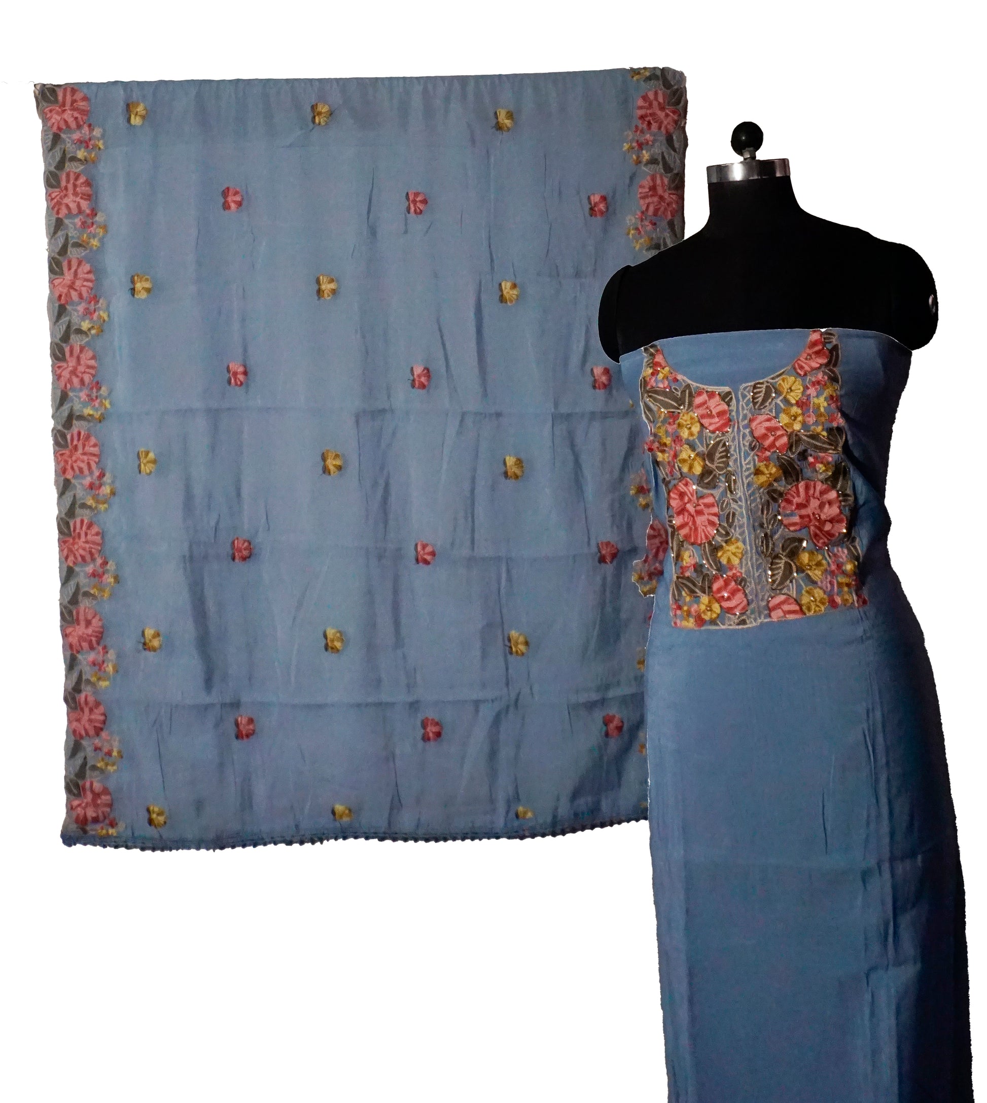 Elevate your ethnic wardrobe with this premium unstitched salwar set, crafted for effortless elegance. The set features a beautifully floral embroidered kurta panel highlighted with intricate threadwork and delicate detailing. Paired with a soft, flowy matching dupatta adorned with subtle motifs, this ensemble offers a graceful festive appeal.