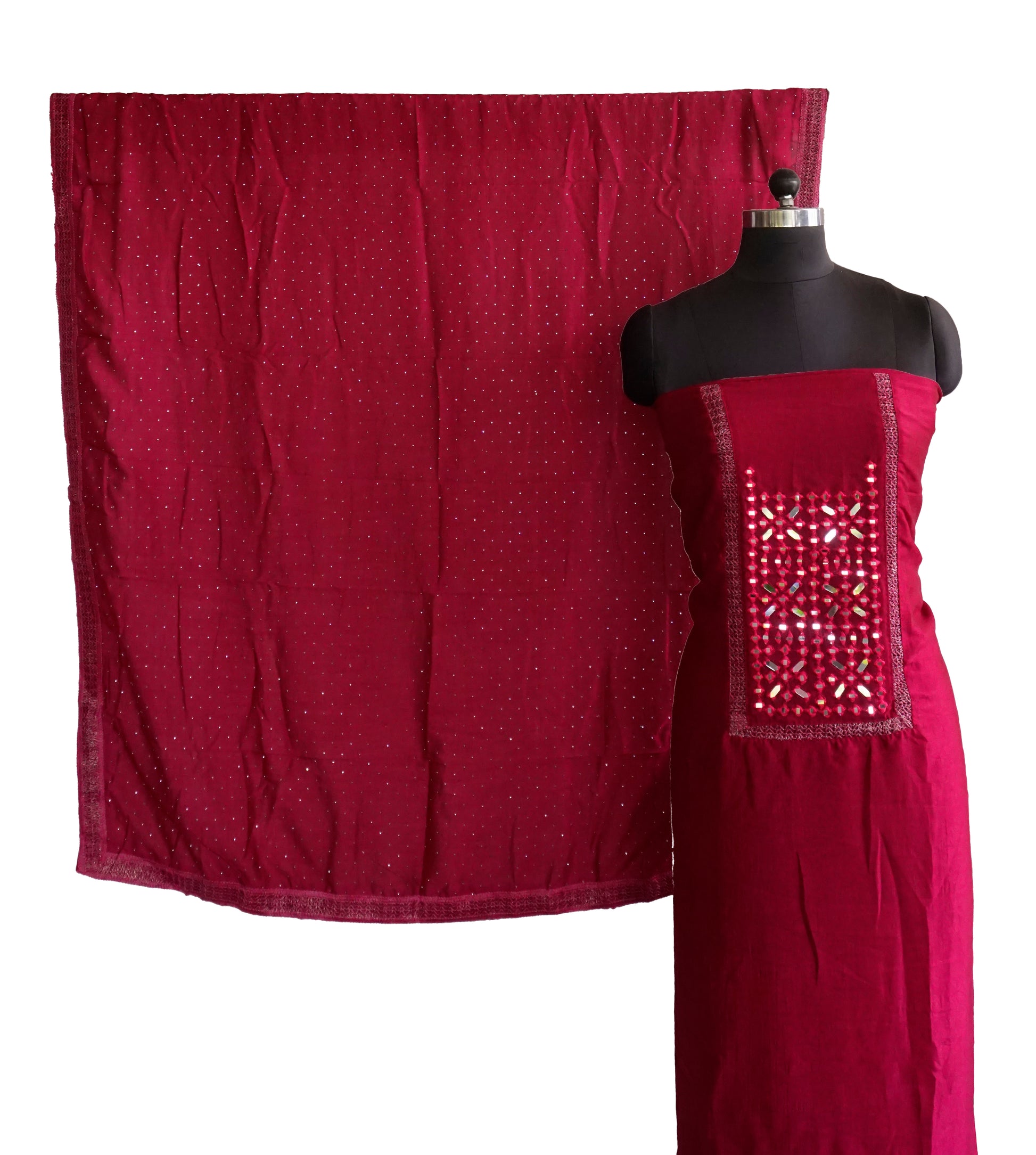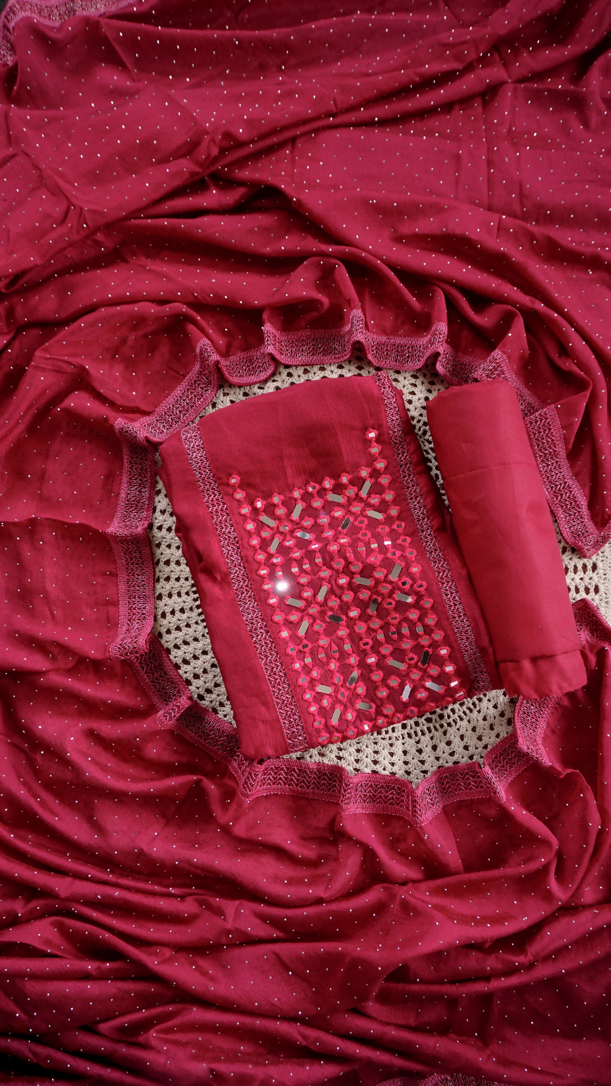 Add a touch of sparkle to your festive wardrobe with this premium mirror work unstitched salwar set. The kurta features intricate hand-style mirror work detailing, beautifully arranged with fine thread embroidery and framed by a contrast border that enhances its rich ethnic appeal.