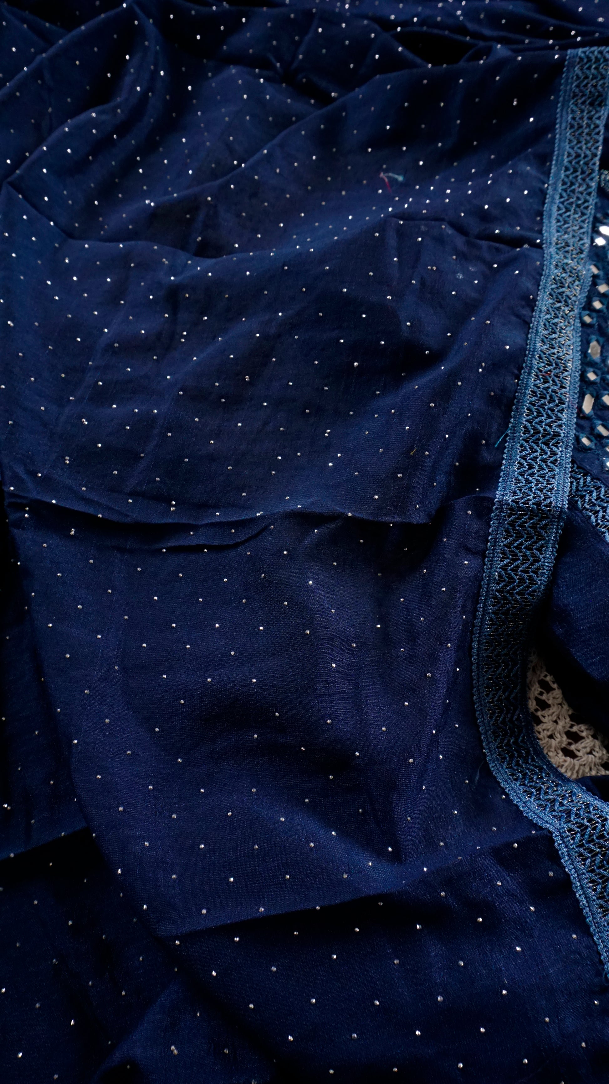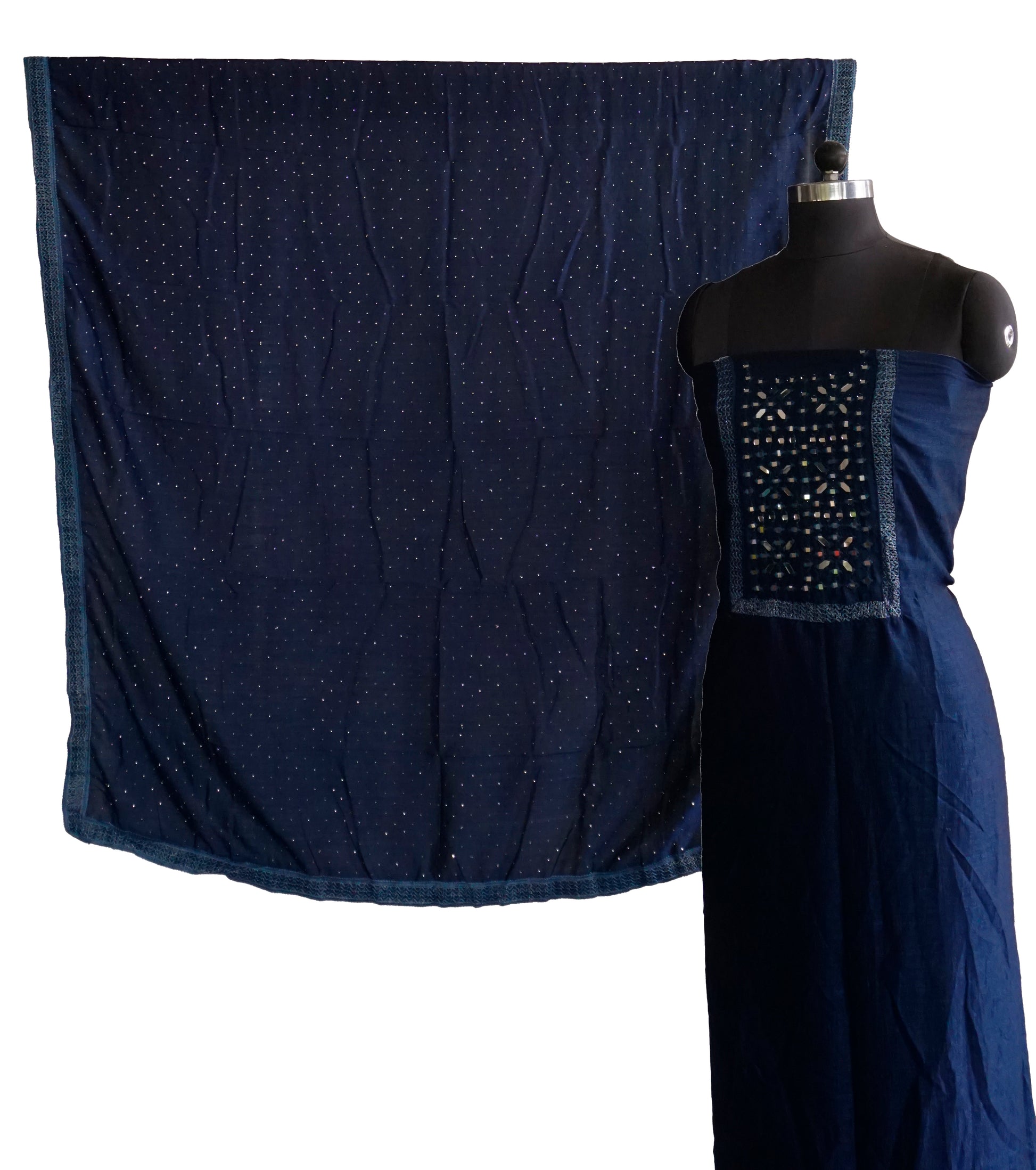 Add a touch of sparkle to your festive wardrobe with this premium mirror work unstitched salwar set. The kurta features intricate hand-style mirror work detailing, beautifully arranged with fine thread embroidery and framed by a contrast border that enhances its rich ethnic appeal.