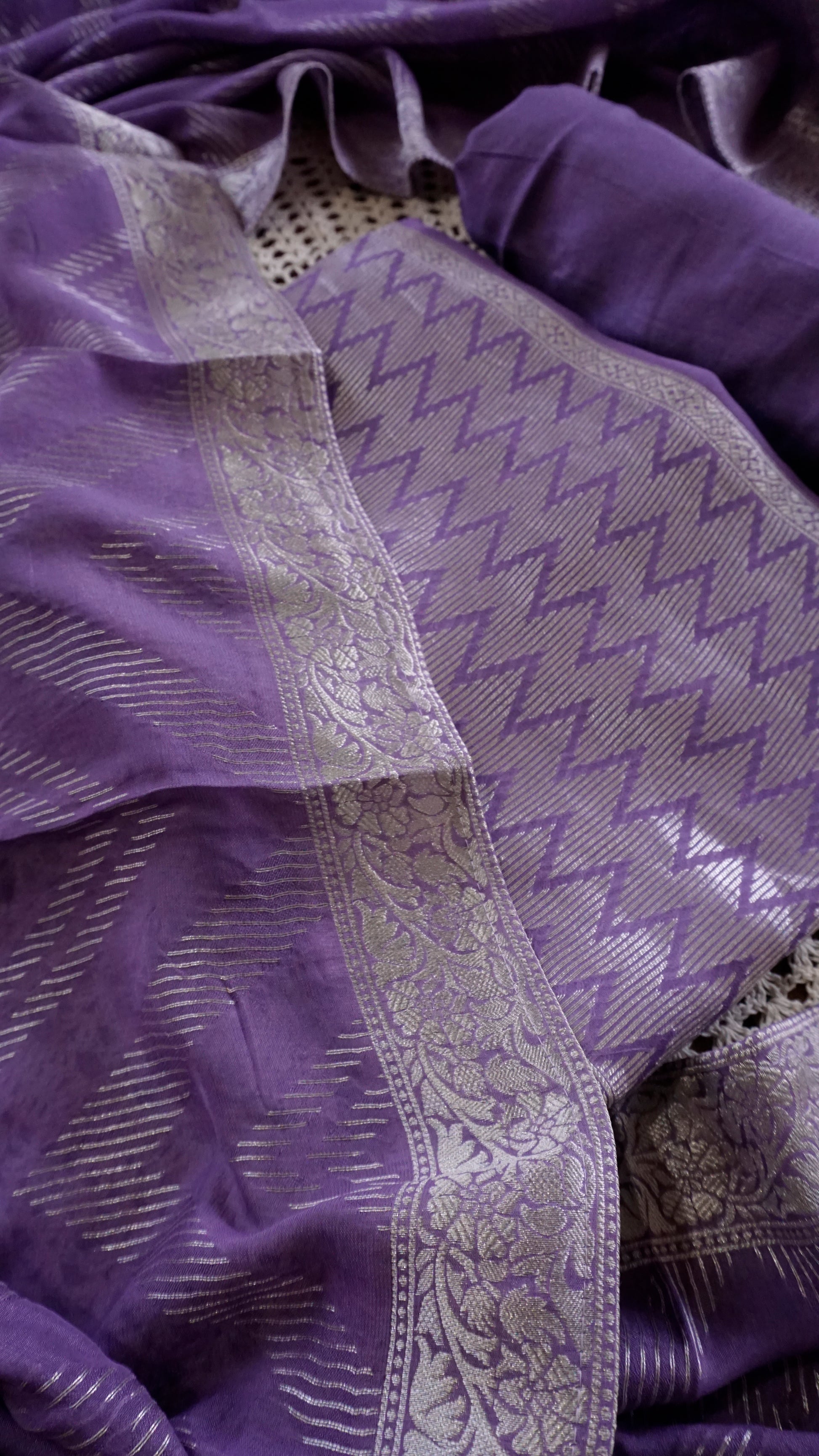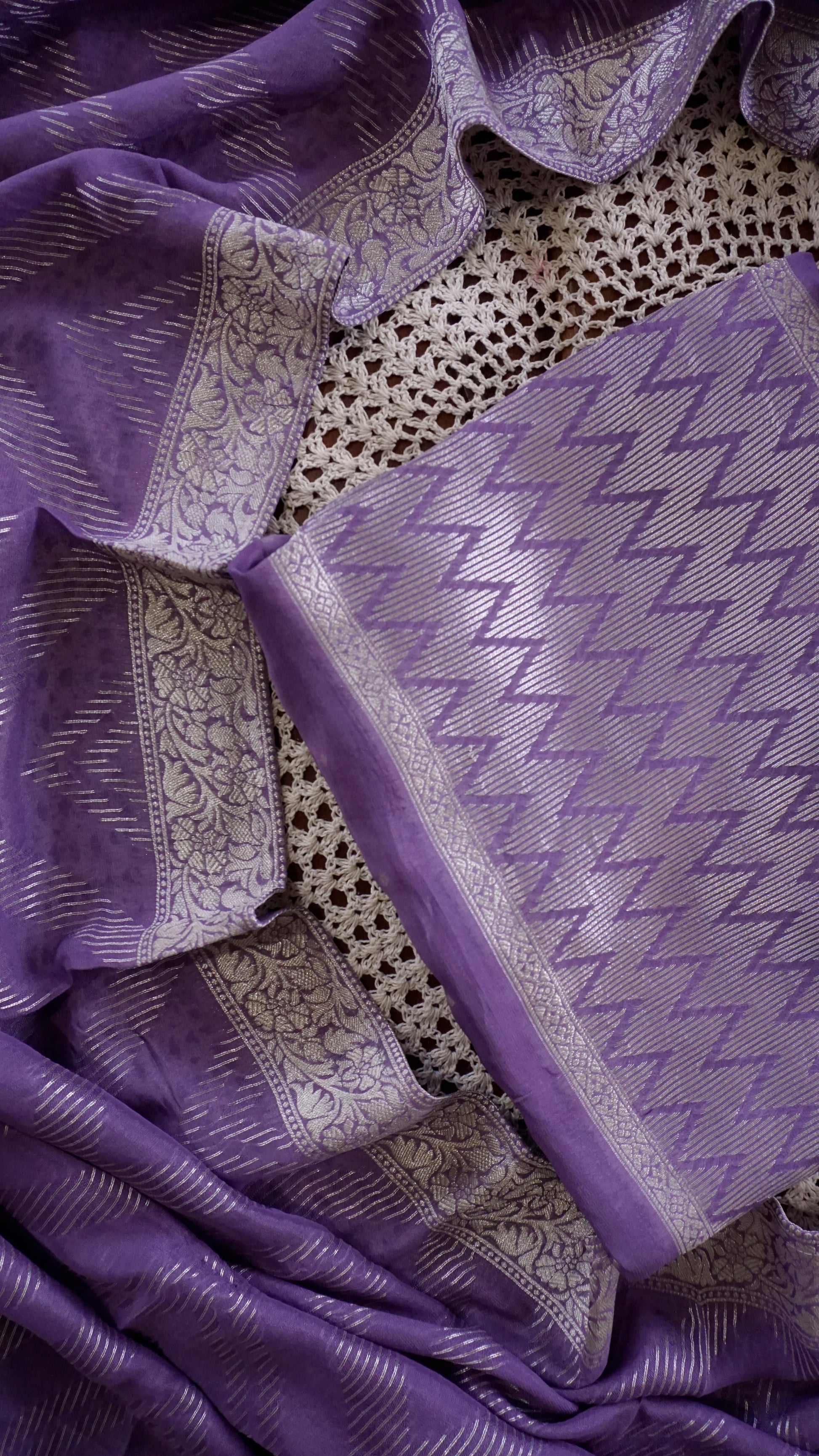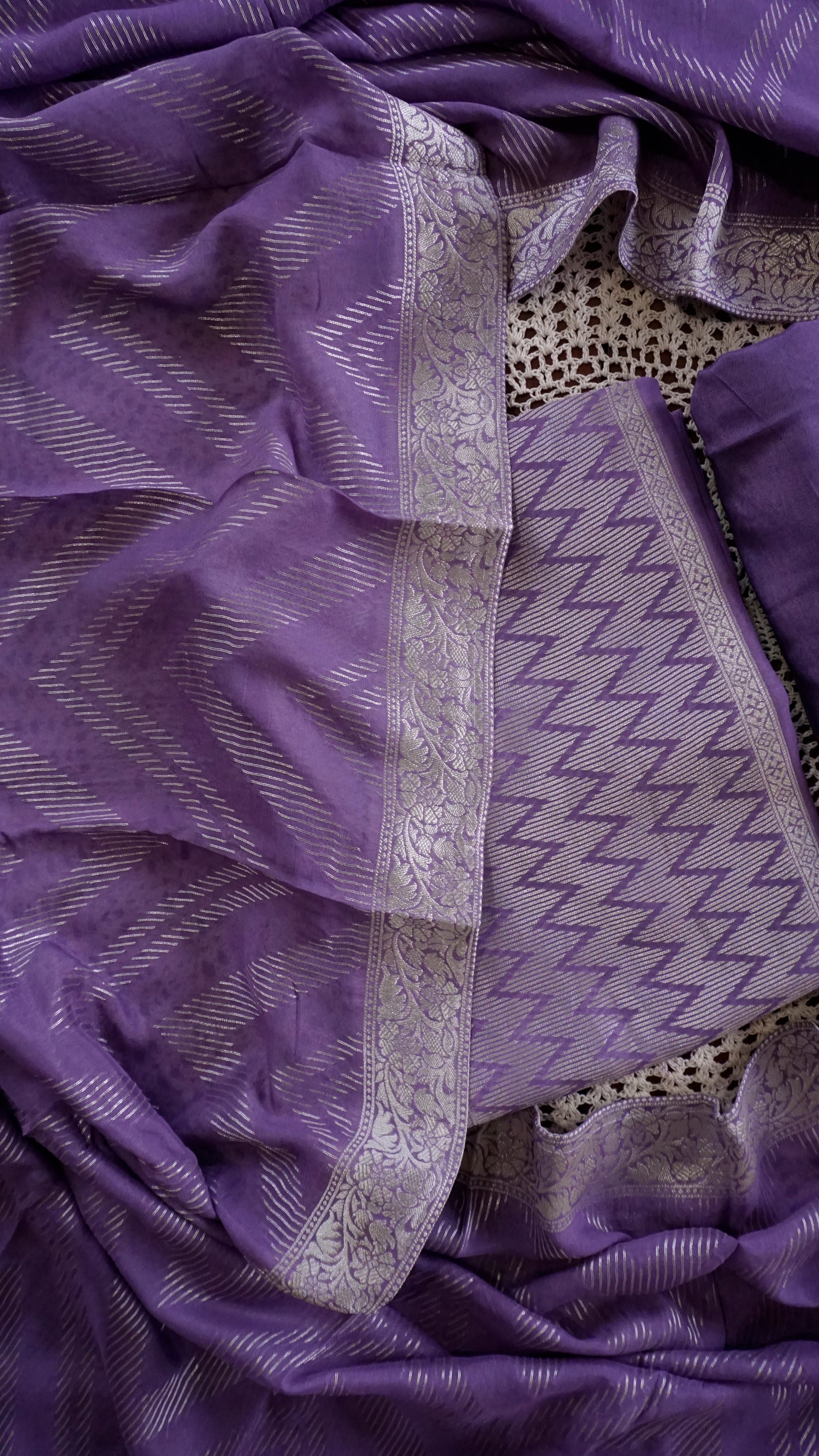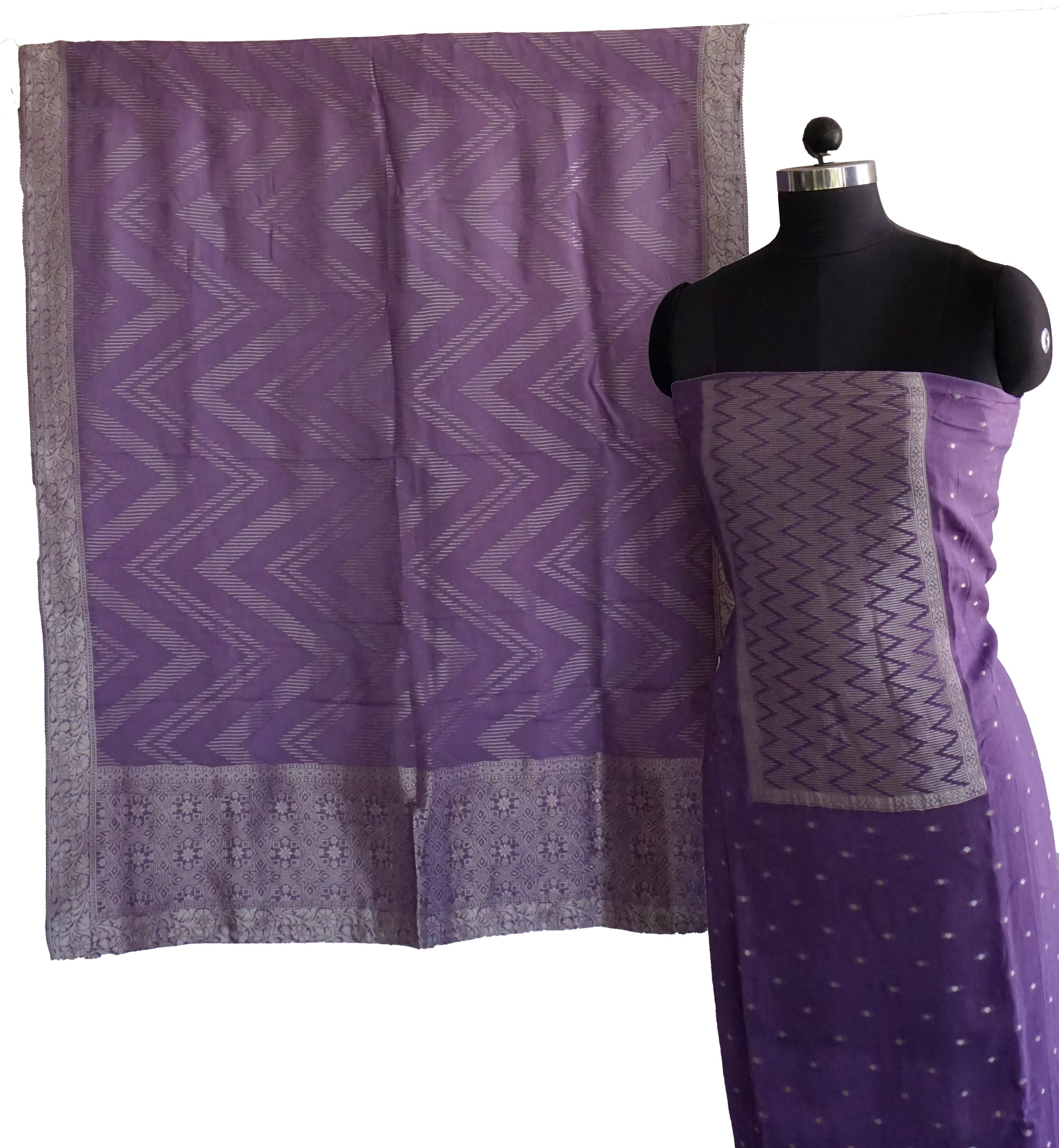 The top fabric features intricate zari detailing, paired with a soft plain matching bottom and a beautiful woven Banarasi dupatta that elevates the entire outfit.