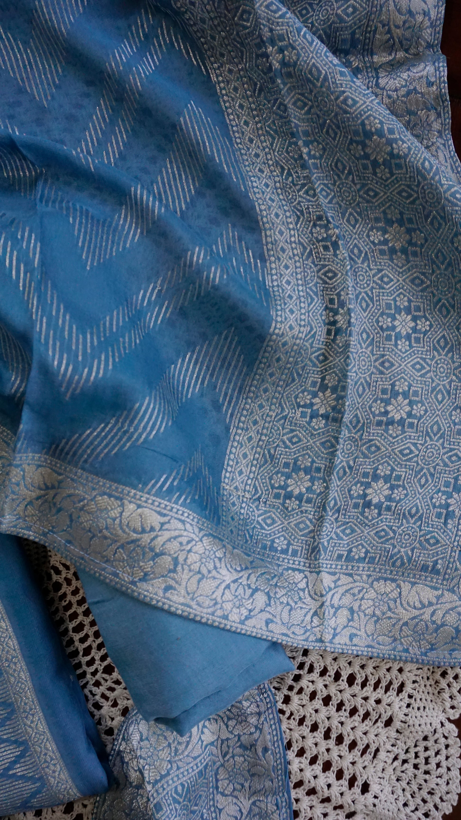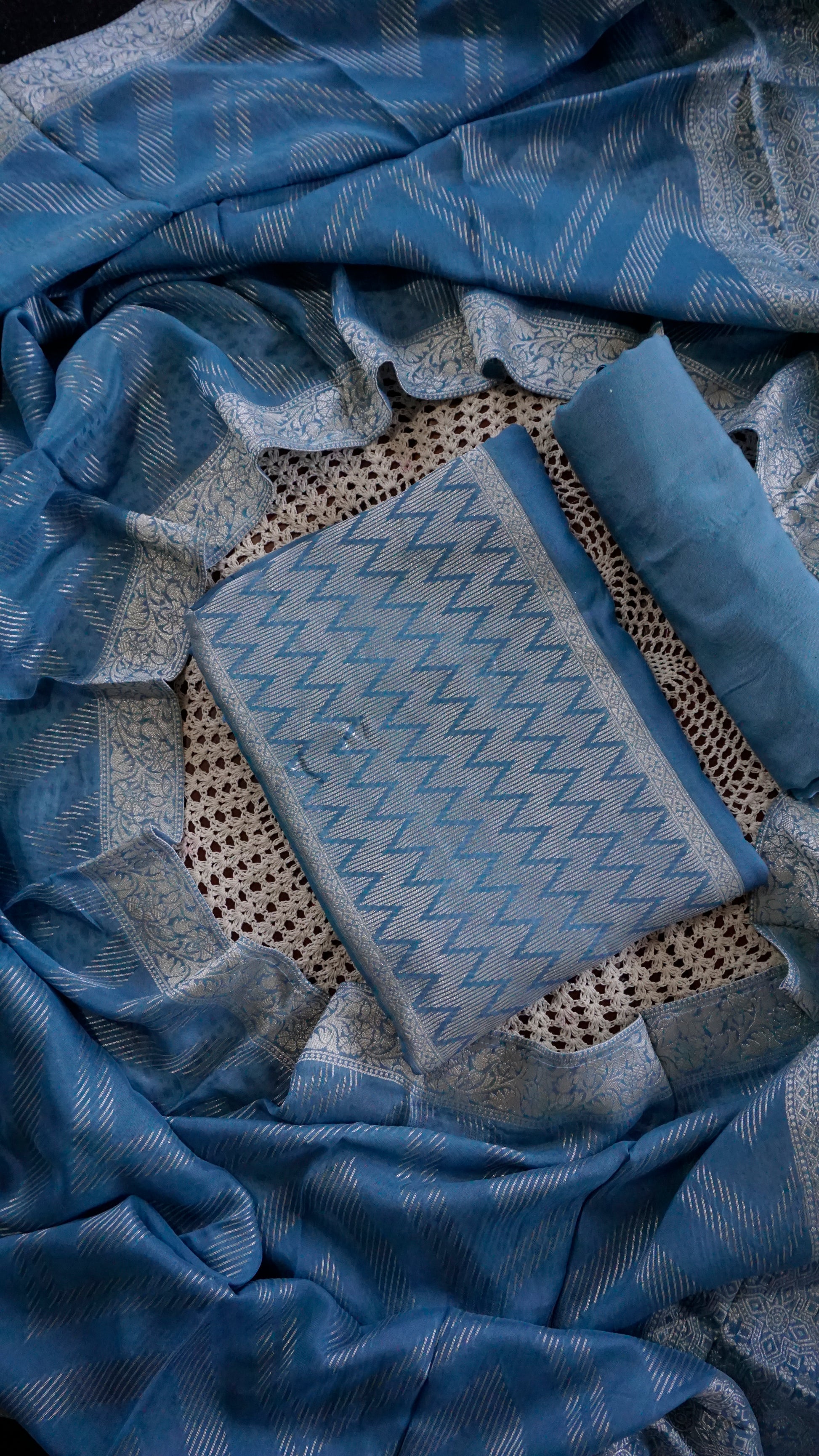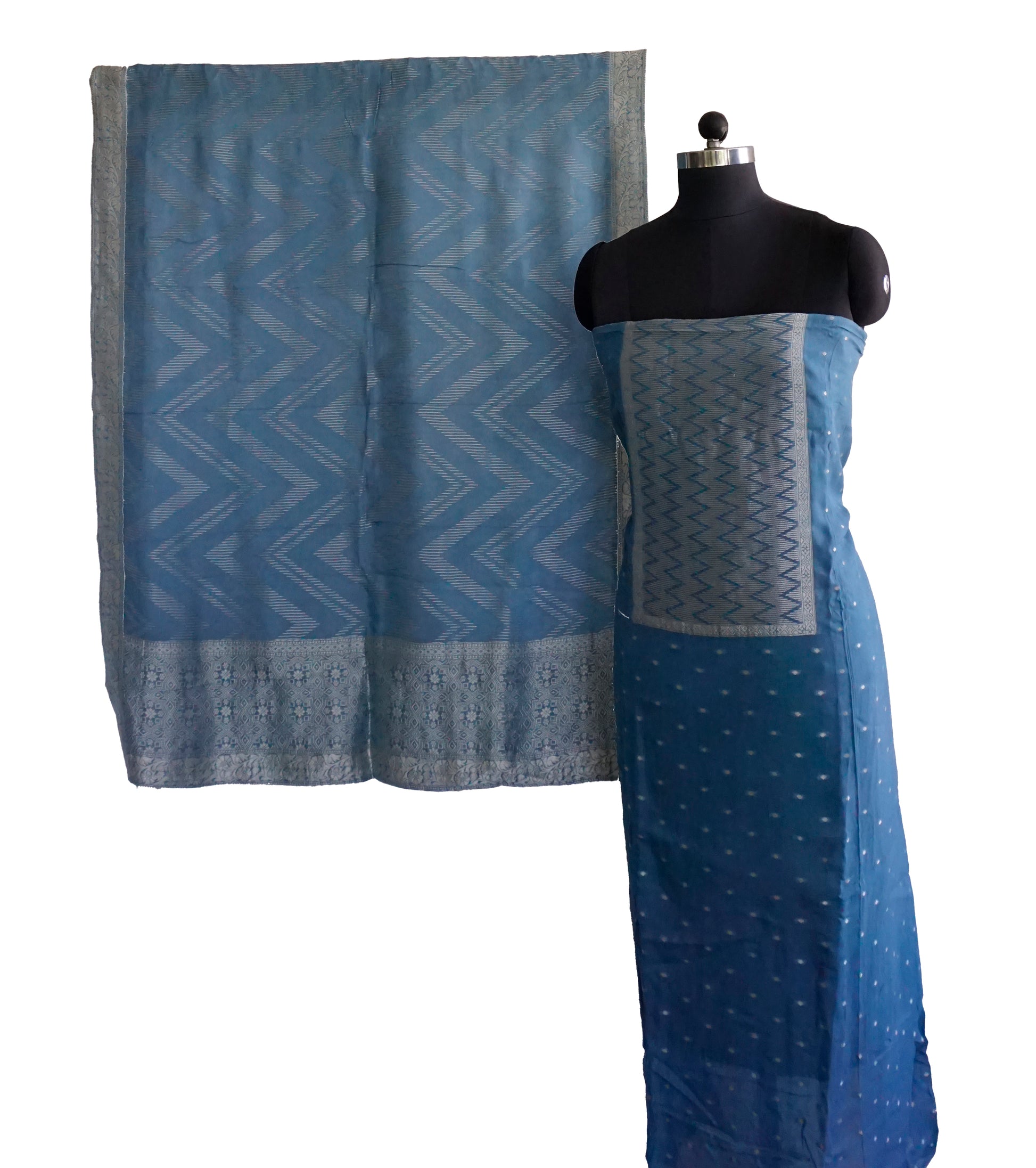 The top fabric features intricate zari detailing, paired with a soft plain matching bottom and a beautiful woven Banarasi dupatta that elevates the entire outfit.