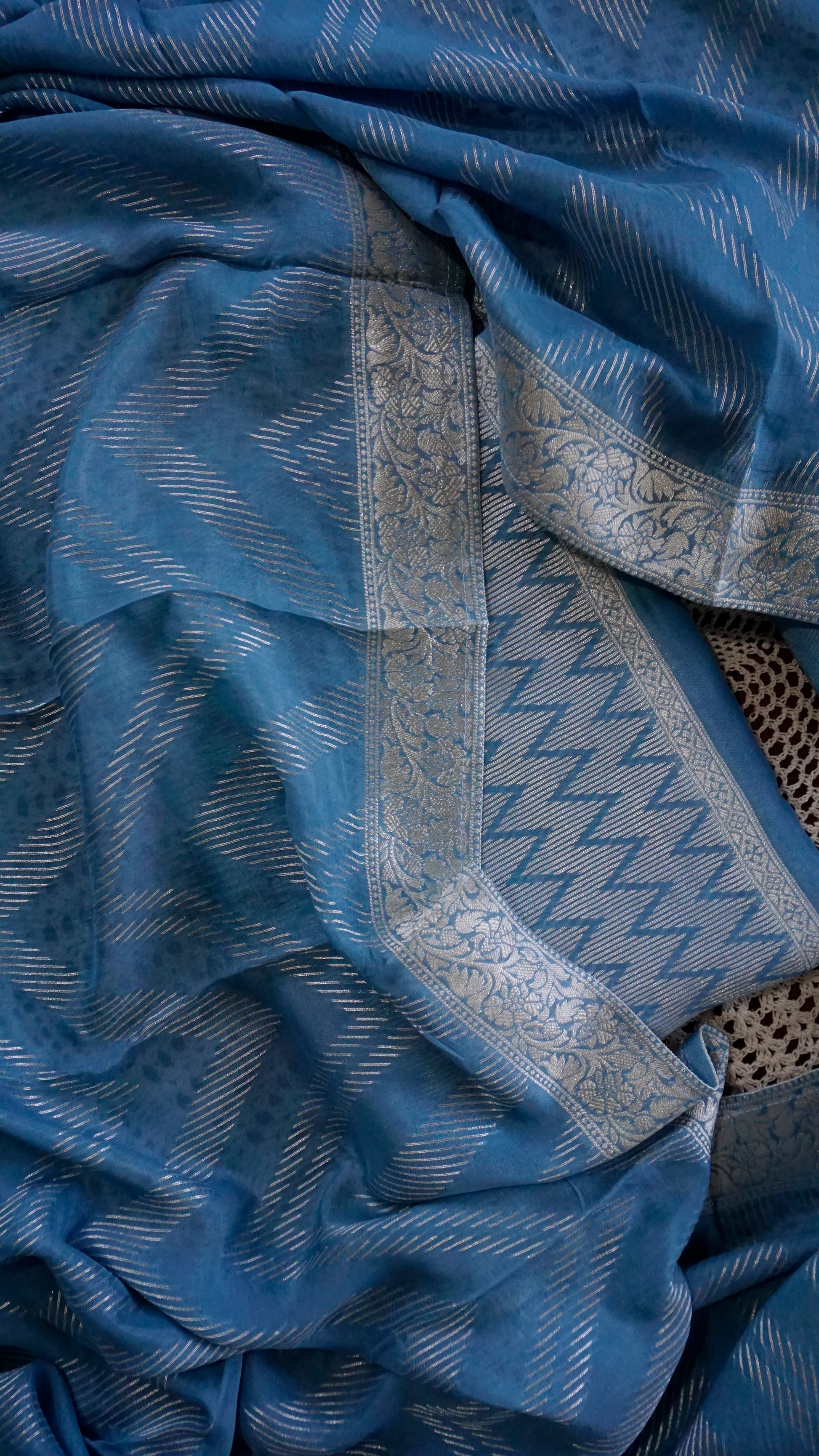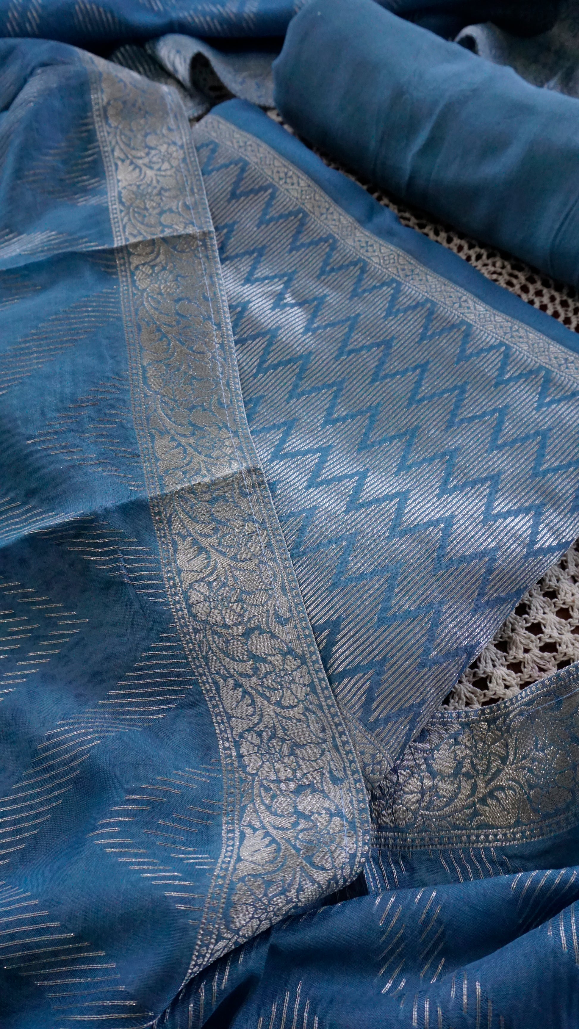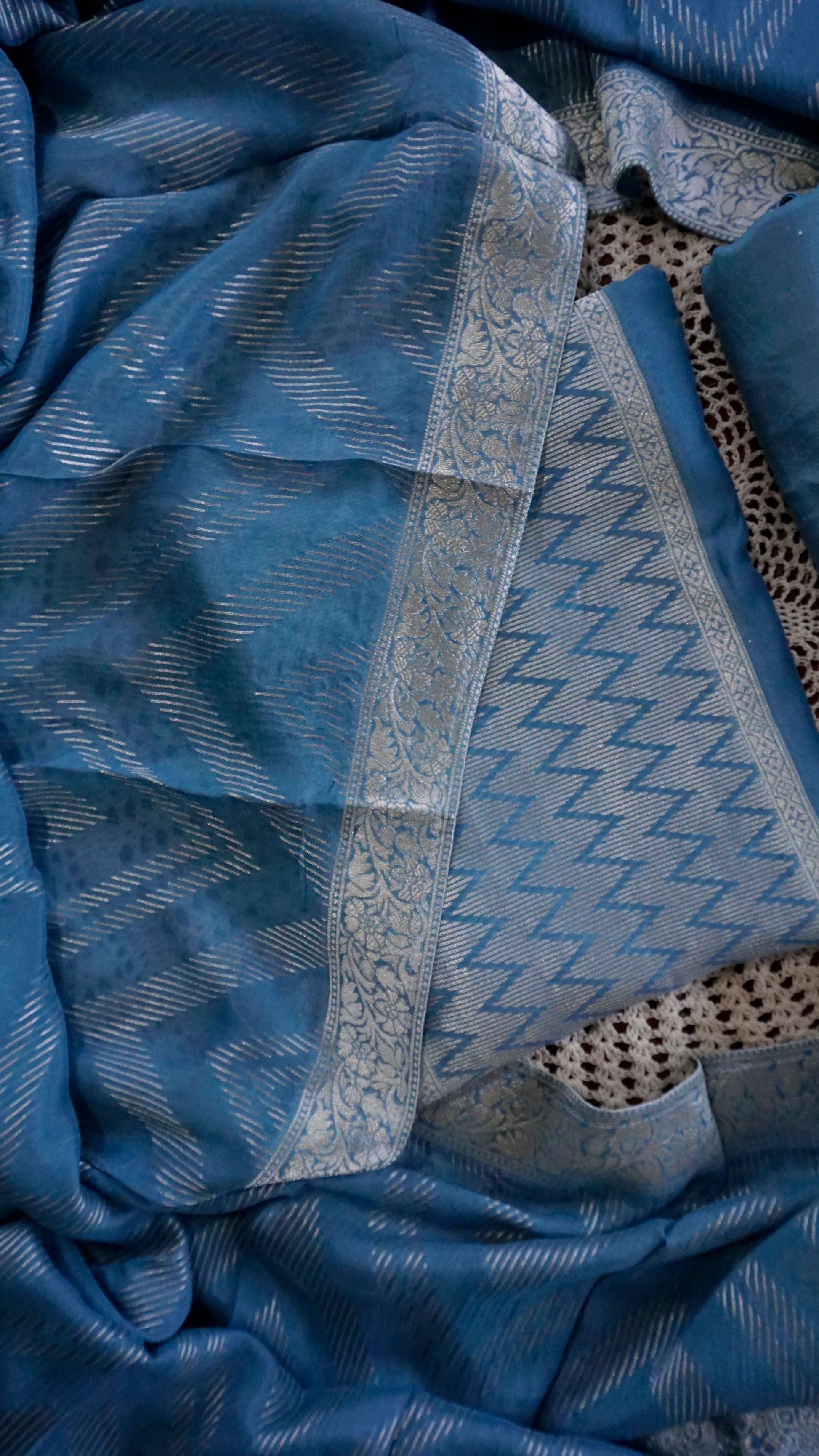 The top fabric features intricate zari detailing, paired with a soft plain matching bottom and a beautiful woven Banarasi dupatta that elevates the entire outfit.