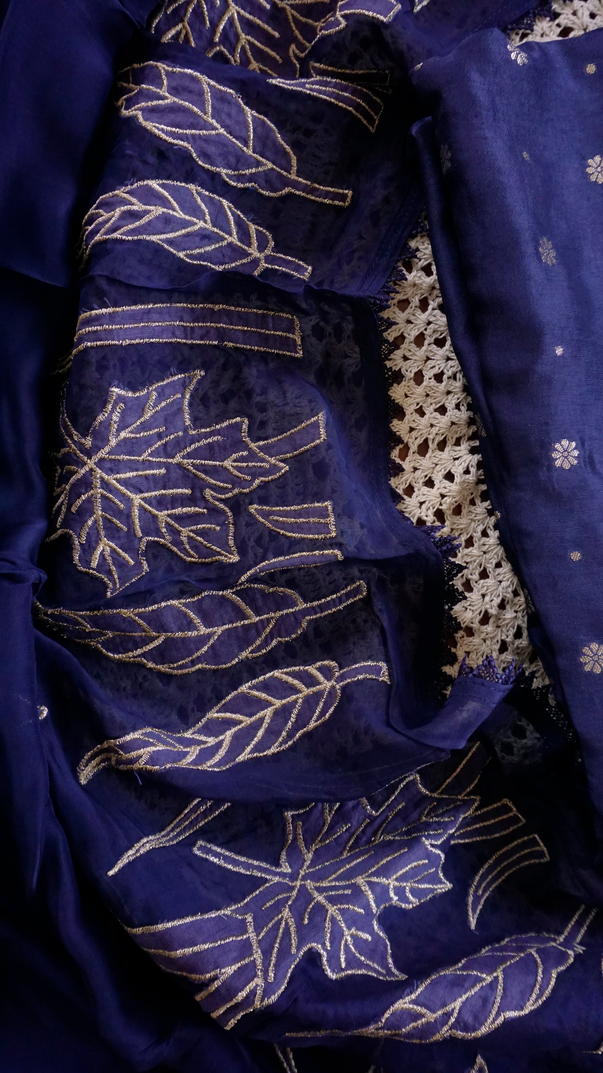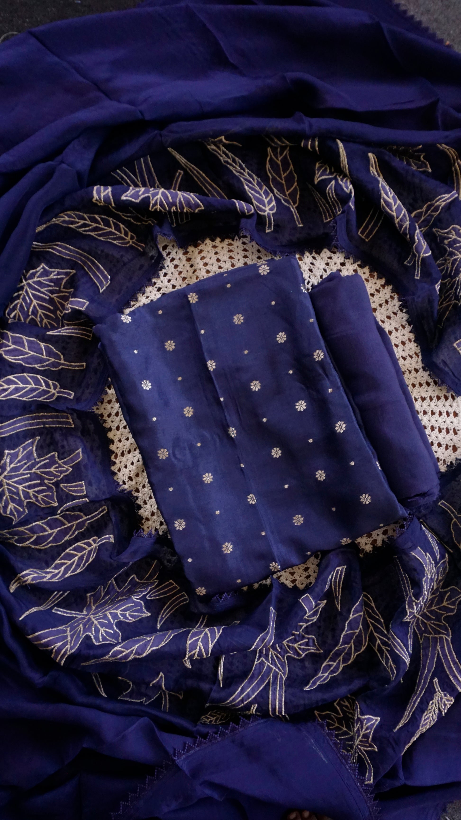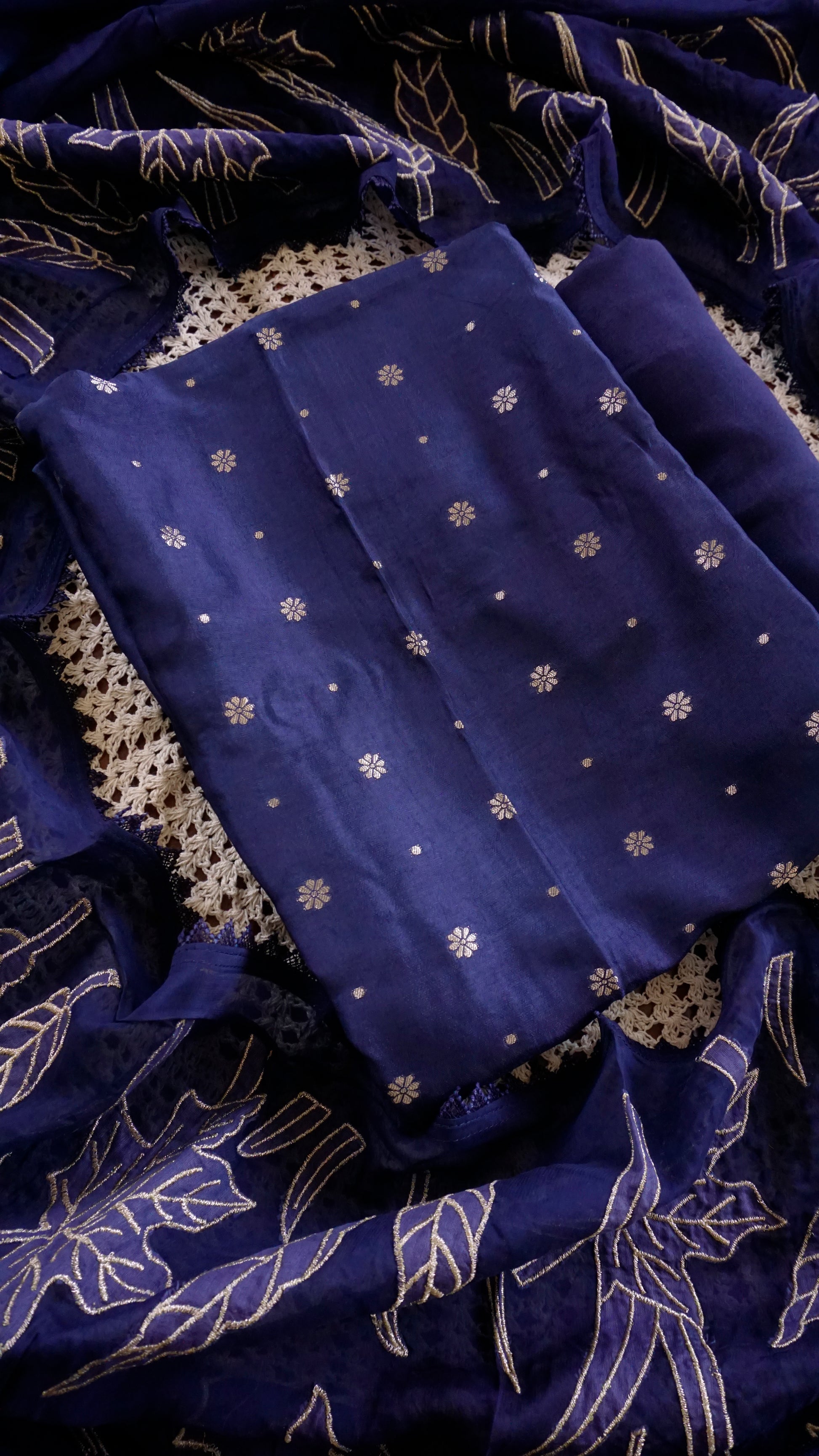 A majestic royal blue Banarasi unstitched salwar set crafted with intricate golden detailing on the top and a grand Banarasi-patterned dupatta. Rich, classy, and perfect for festive seasons, weddings, and celebrations.