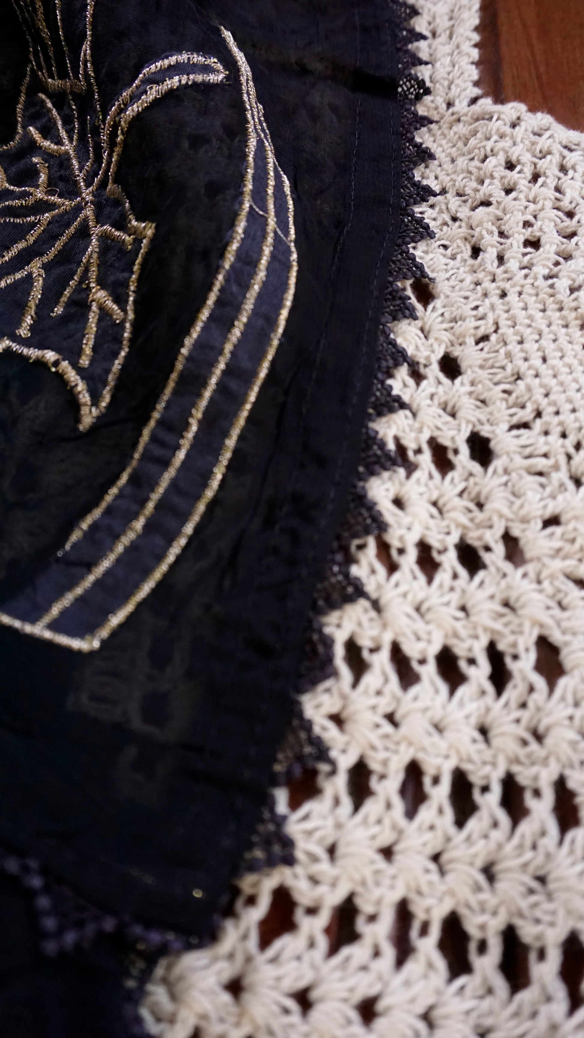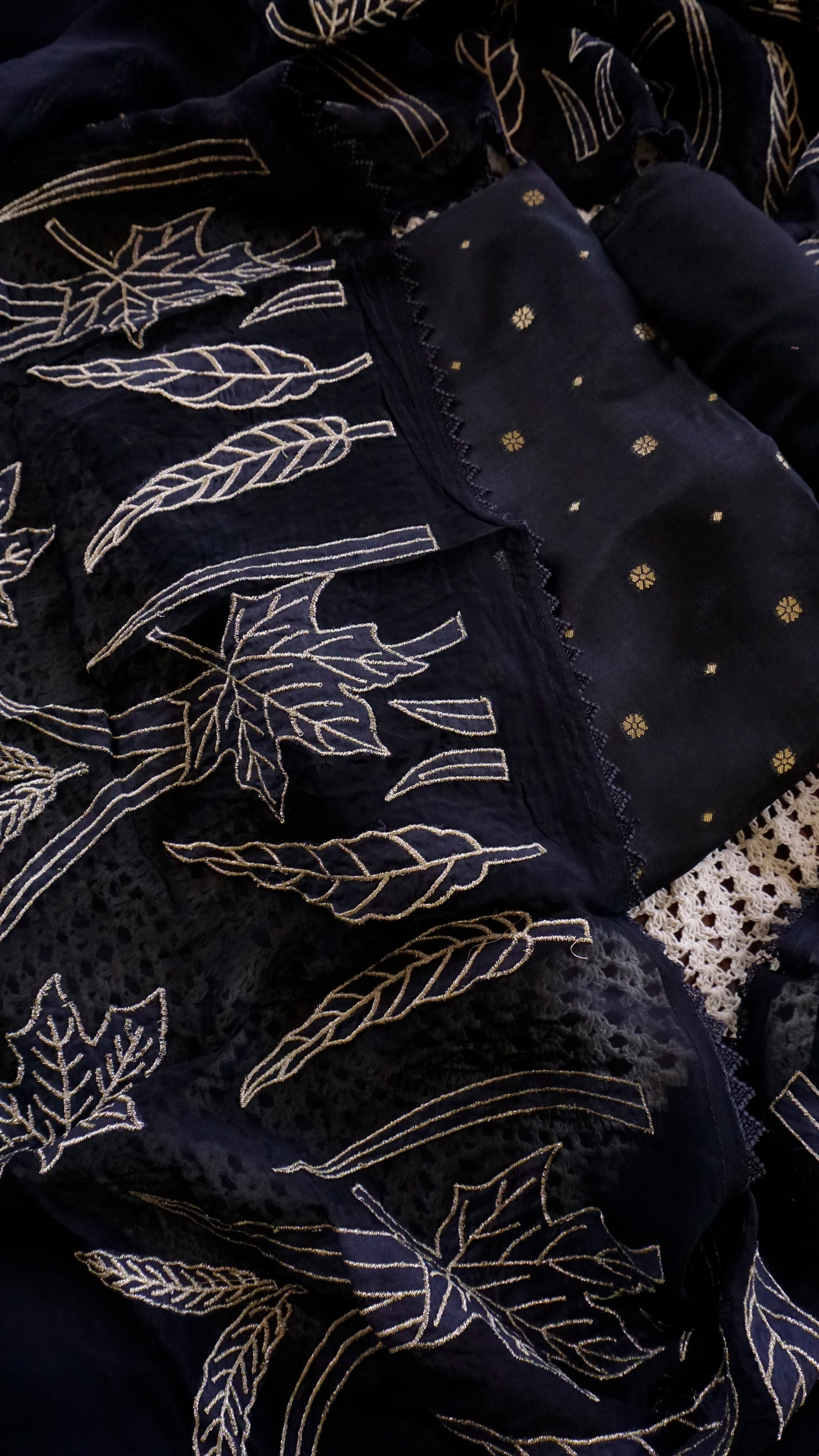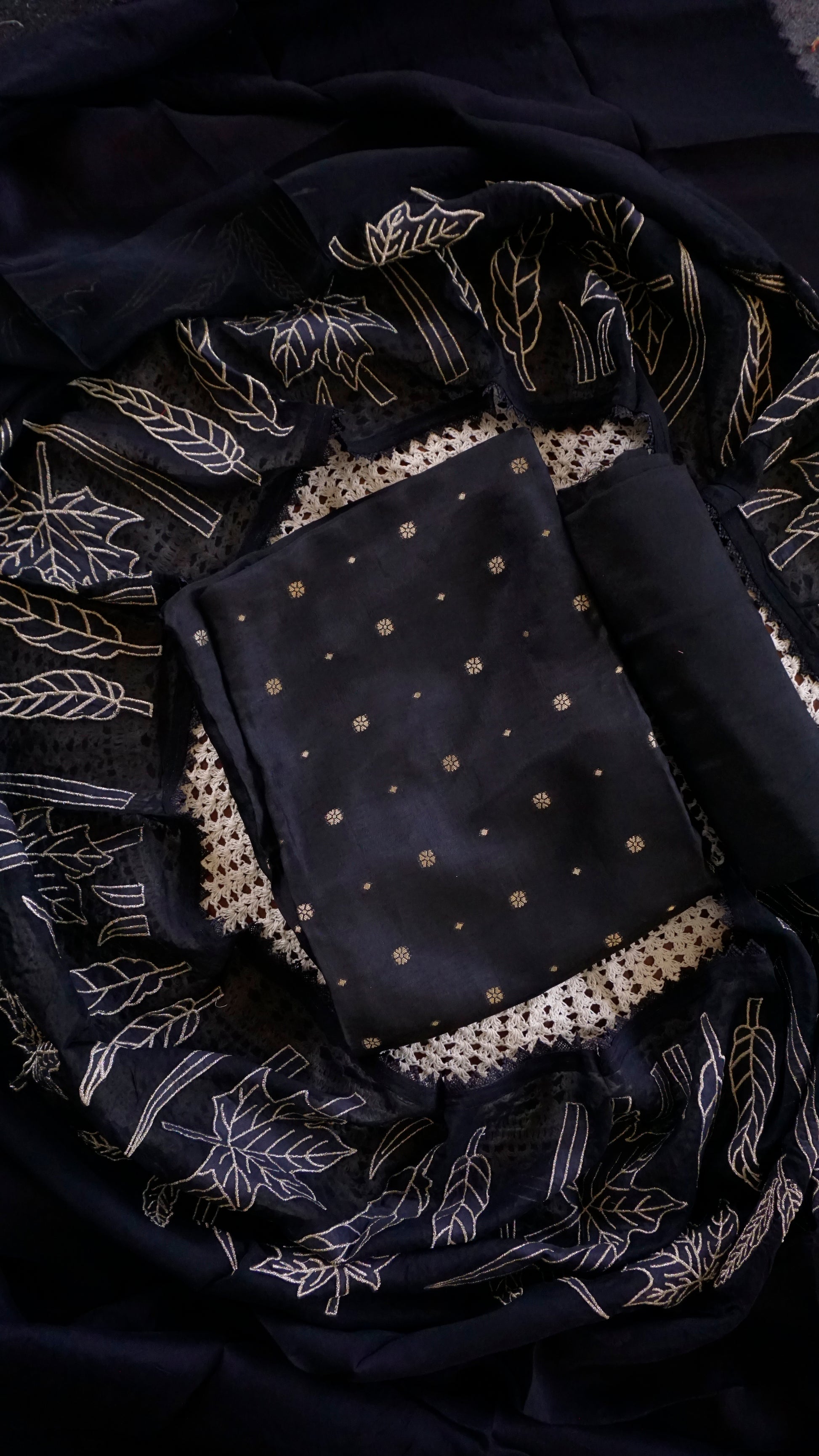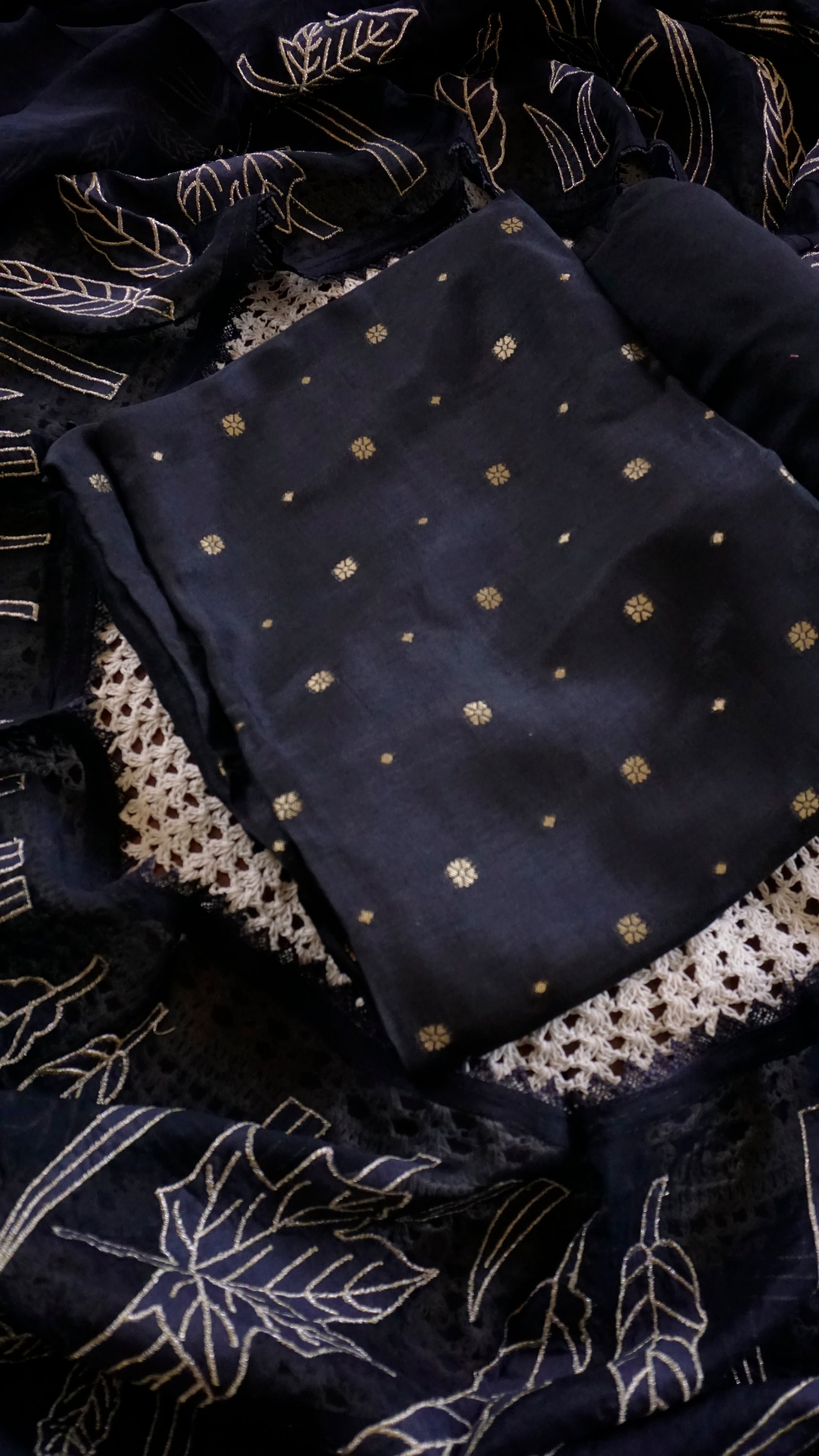 This stunning black Banarasi unstitched salwar set is all about luxury and grace. The top is dotted with golden buttas, paired with a richly woven Banarasi dupatta featuring beautiful leaf patterns. A perfect pick for evening functions, parties, and festive nights.
