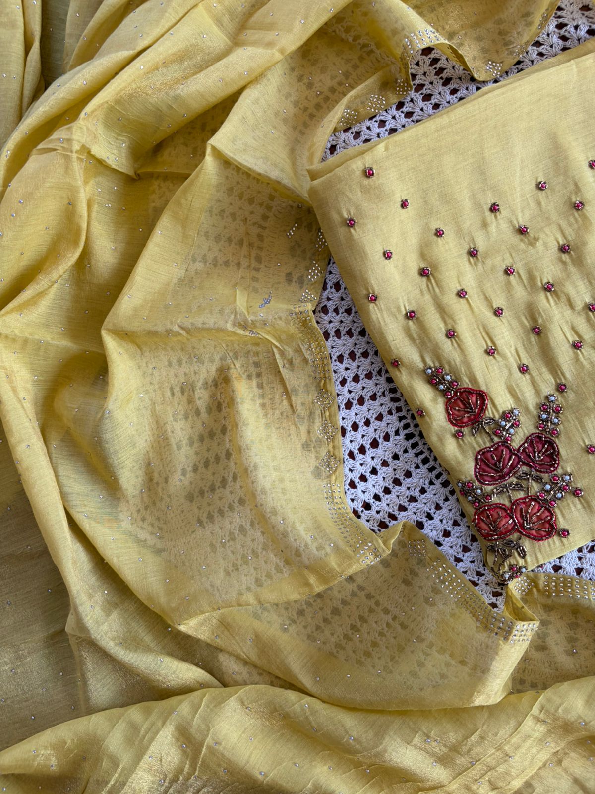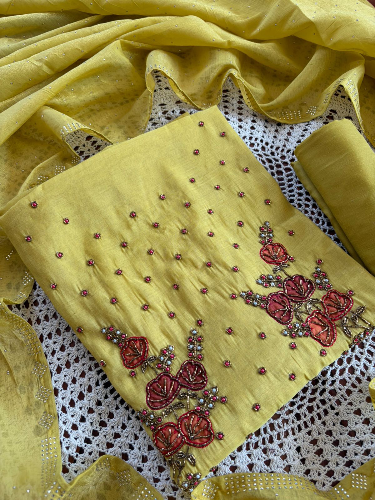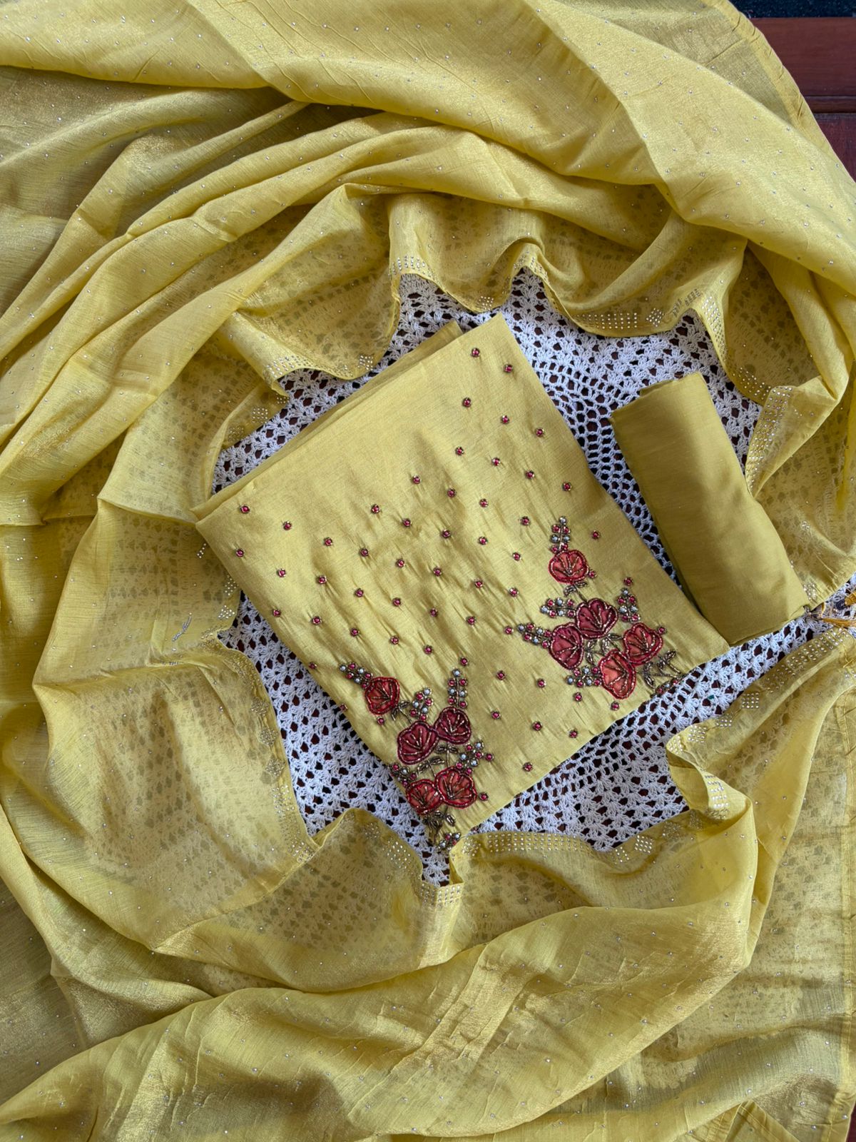 Featuring delicate floral embroidery with subtle embellishments on the top and a soft, graceful dupatta – this set is perfect for festive gatherings, small functions, and special occasions.