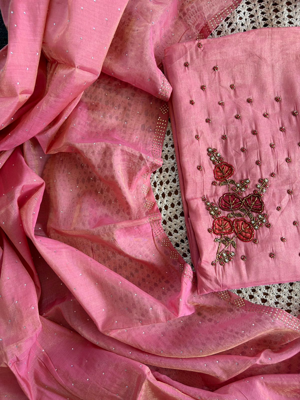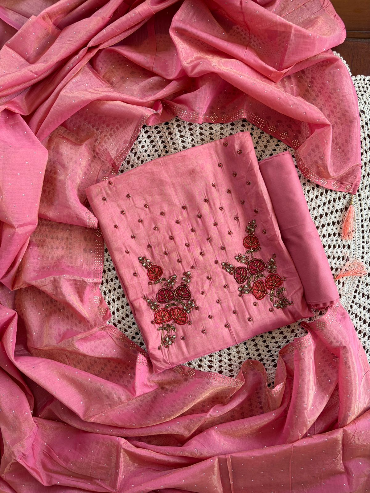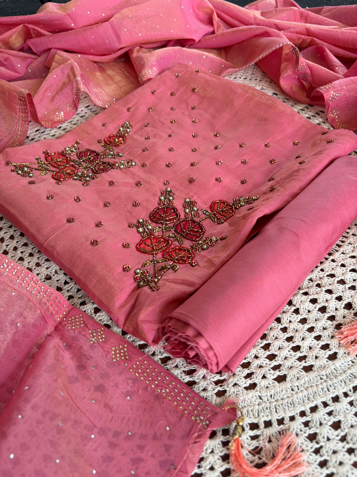 Featuring delicate floral embroidery with subtle embellishments on the top and a soft, graceful dupatta – this set is perfect for festive gatherings, small functions, and special occasions.