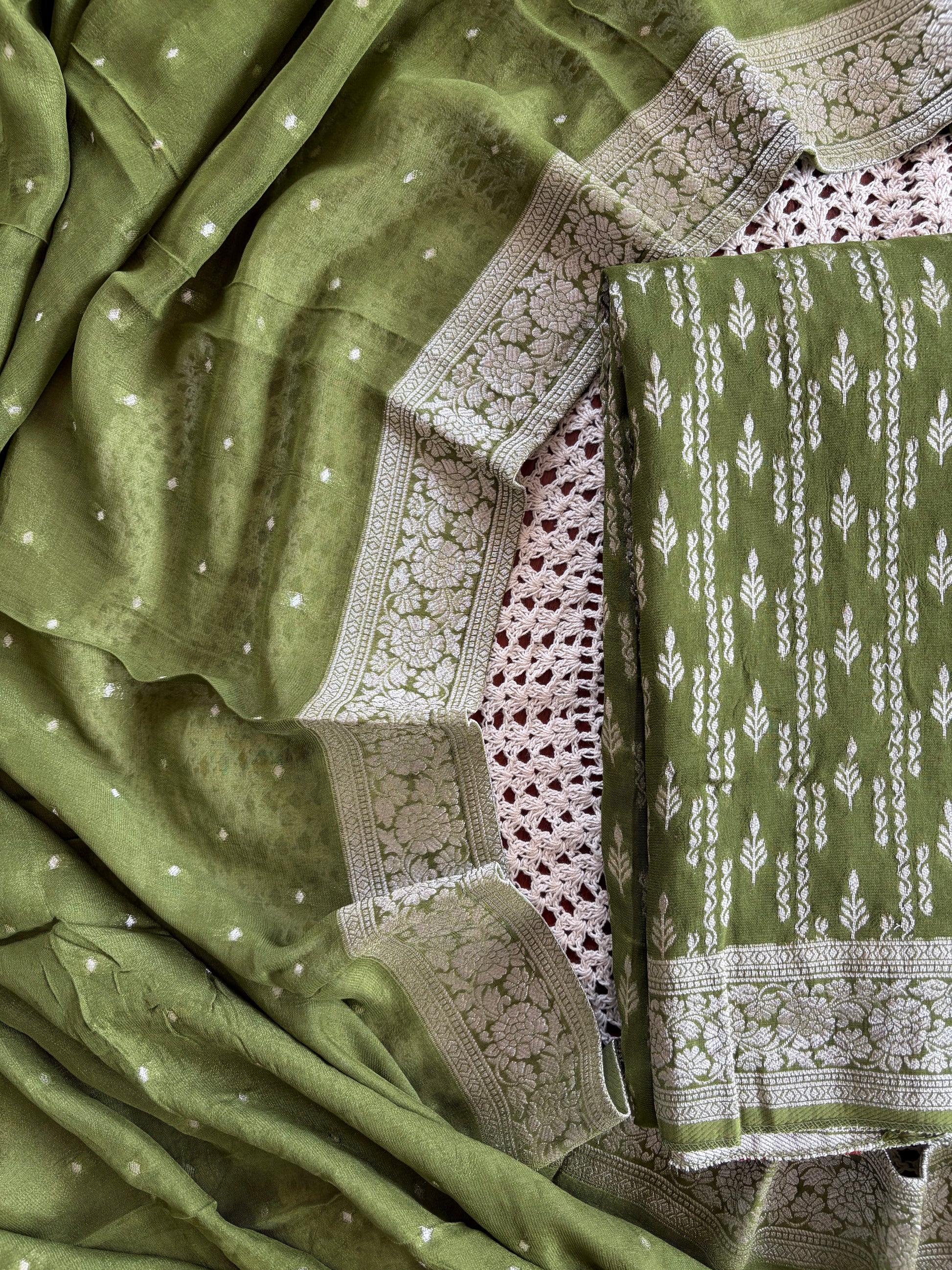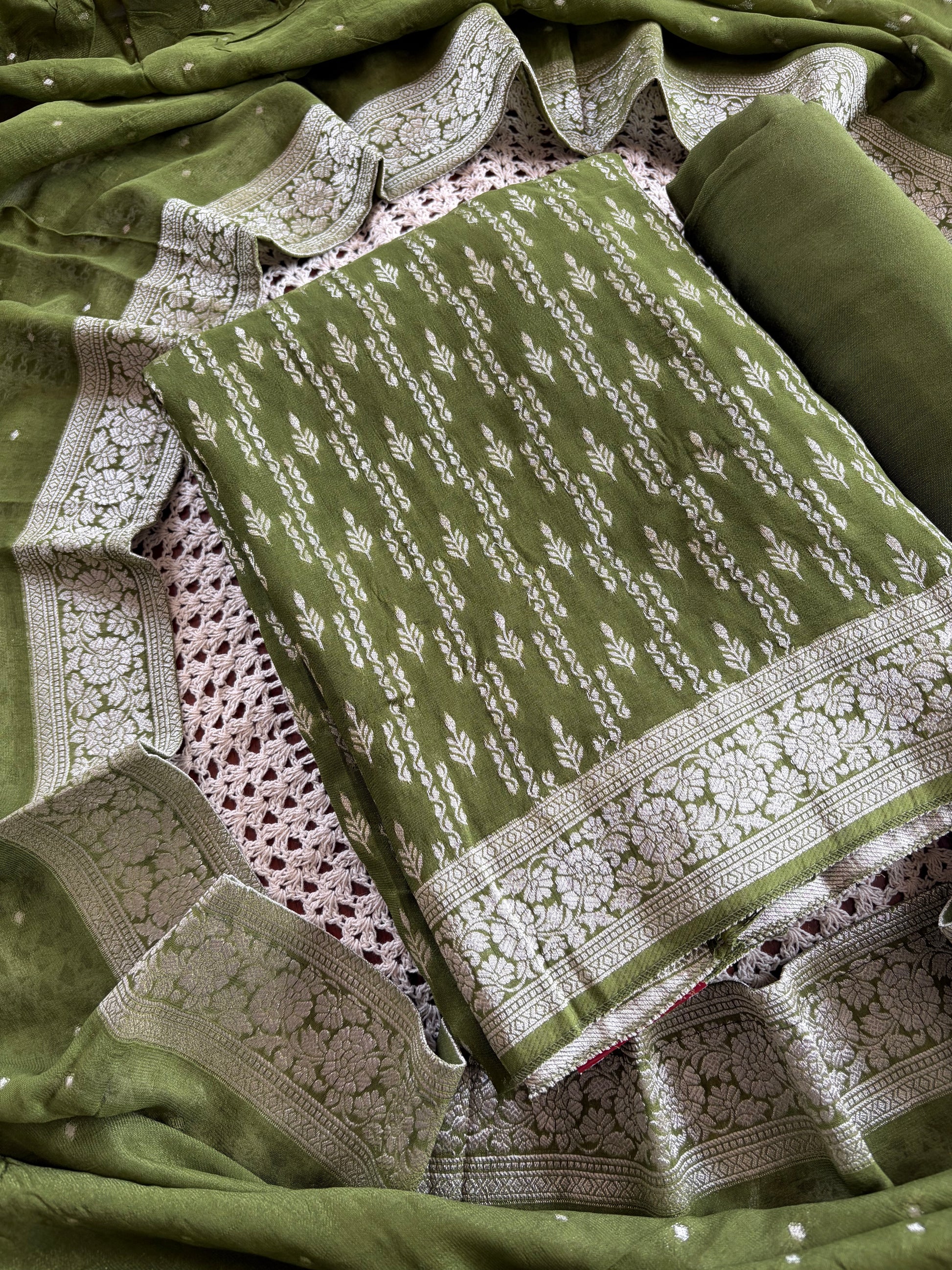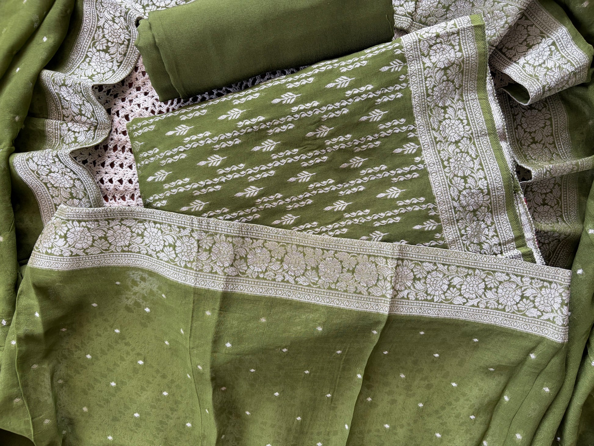 This exquisite Banarasi dress material in a lovely olive green tone will add flair to your ethnic outfit. This set exhibits classic craftsmanship and sophisticated beauty thanks to its delicate designs and traditional Banarasi-inspired weaving. It is ideal for special festivities, family get-togethers, and festive occasions because of its rich texture and matched dupatta. A timeless option for people who value traditional weaving with a contemporary twist.