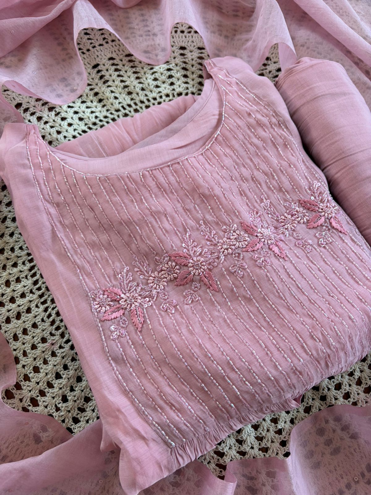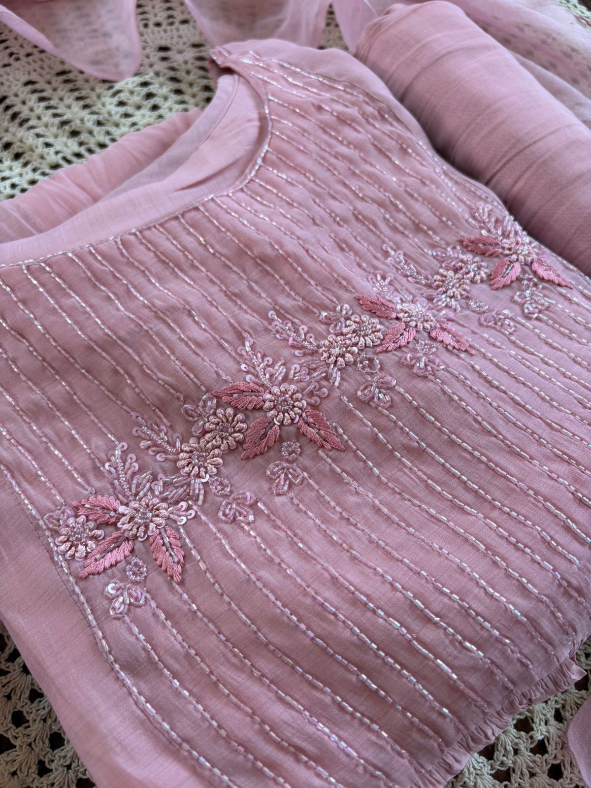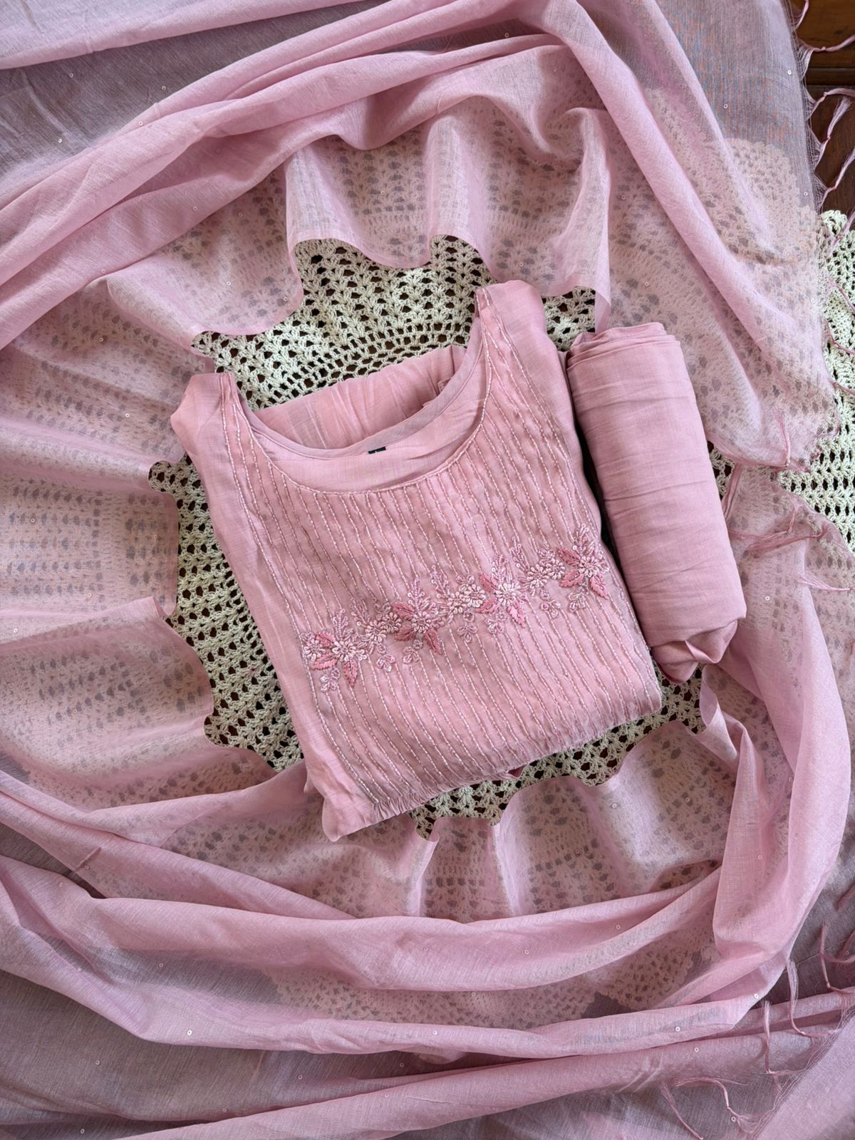 Subtle, classy and effortlessly chic. The pastel pink tone gives a calm, elegant vibe — ideal for day events, casual celebrations, and festive wear.