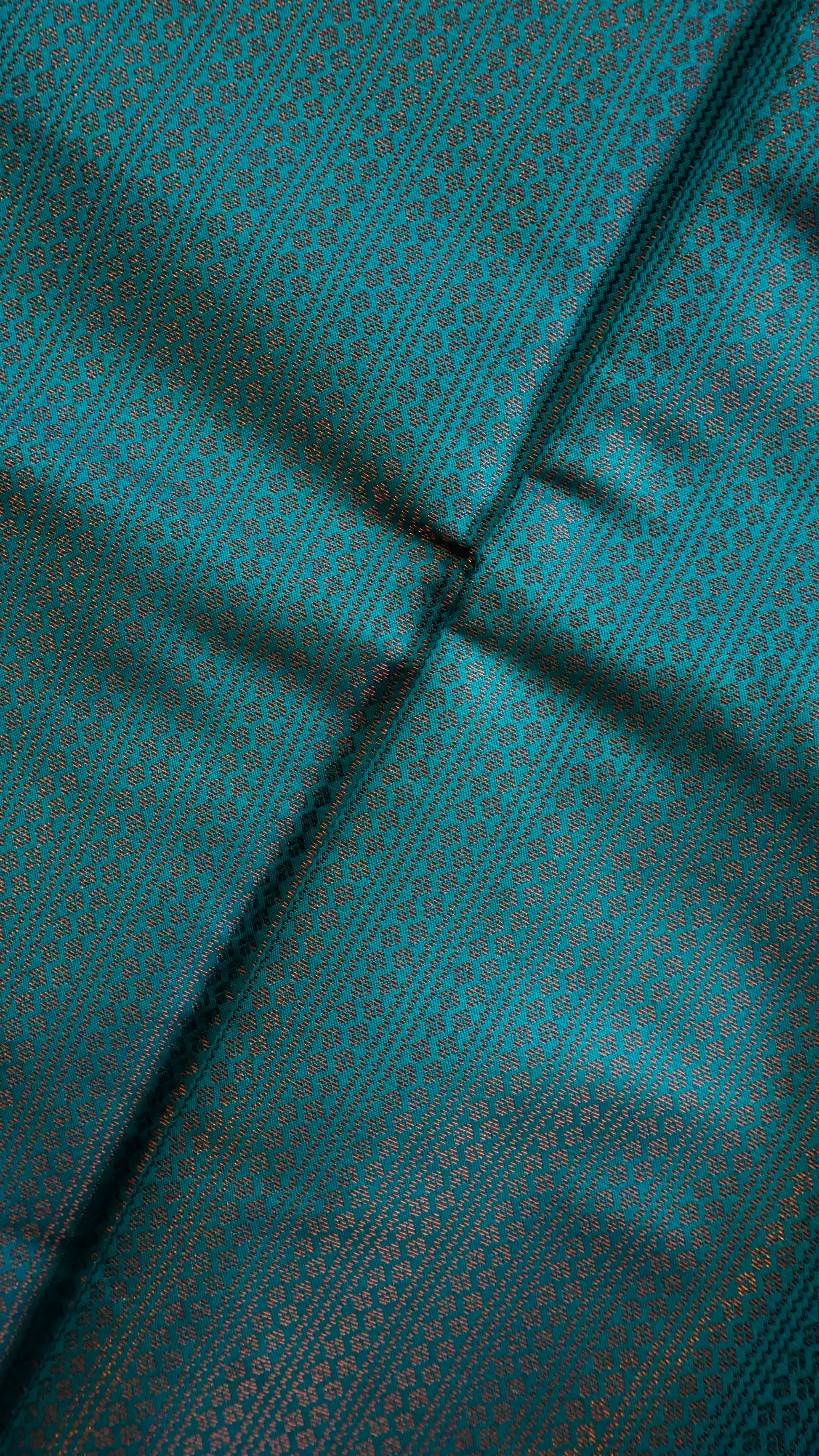 The product is a beautiful teal-green semi-silk saree with elaborate borders and body weaving in golden thread. Its understated yet sophisticated style makes it appropriate for weddings, cultural events, and festive attire. This saree provides an airy touch of sophistication and drapes beautifully. It is lightweight and has a silky texture.