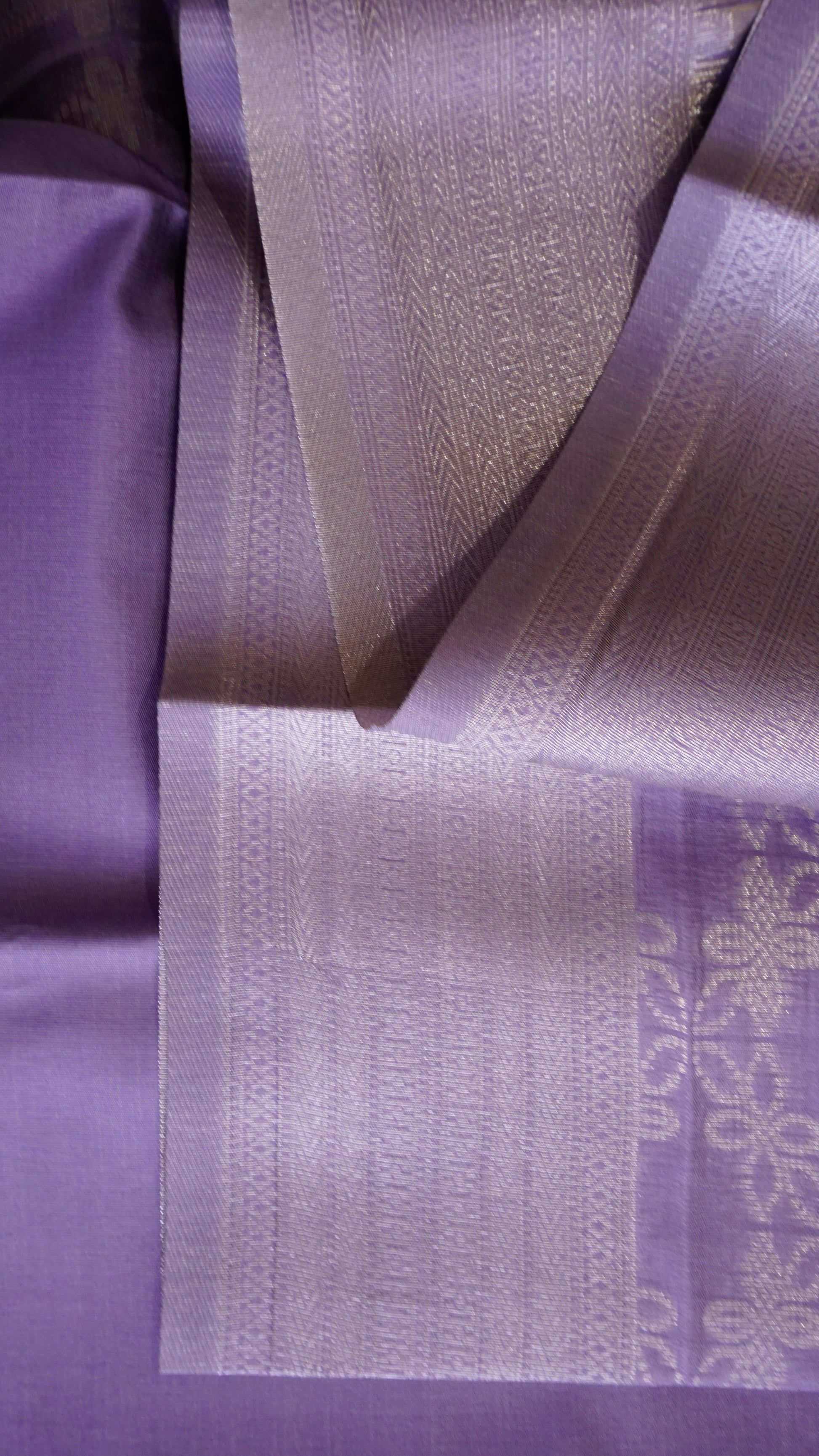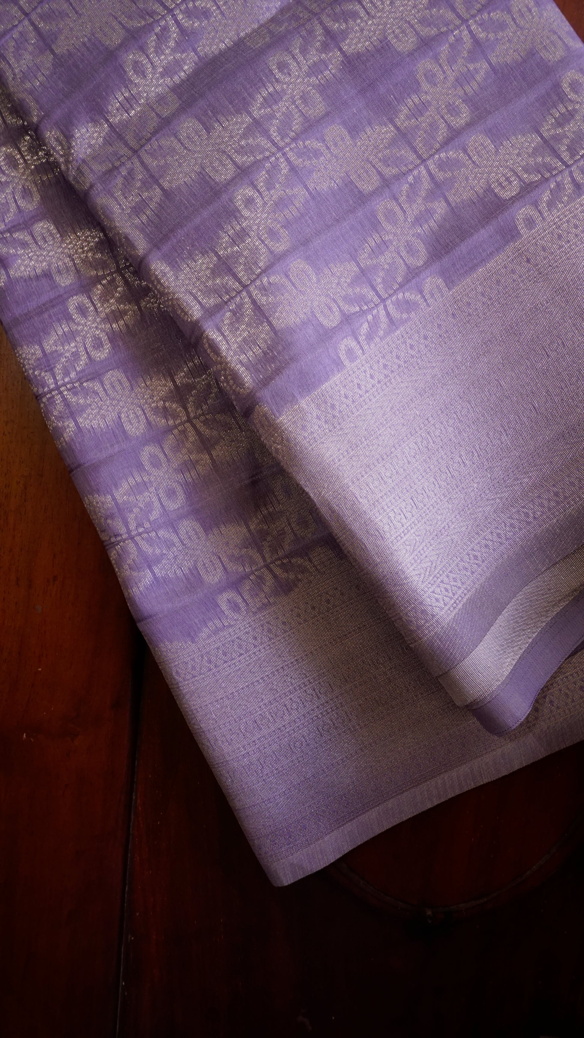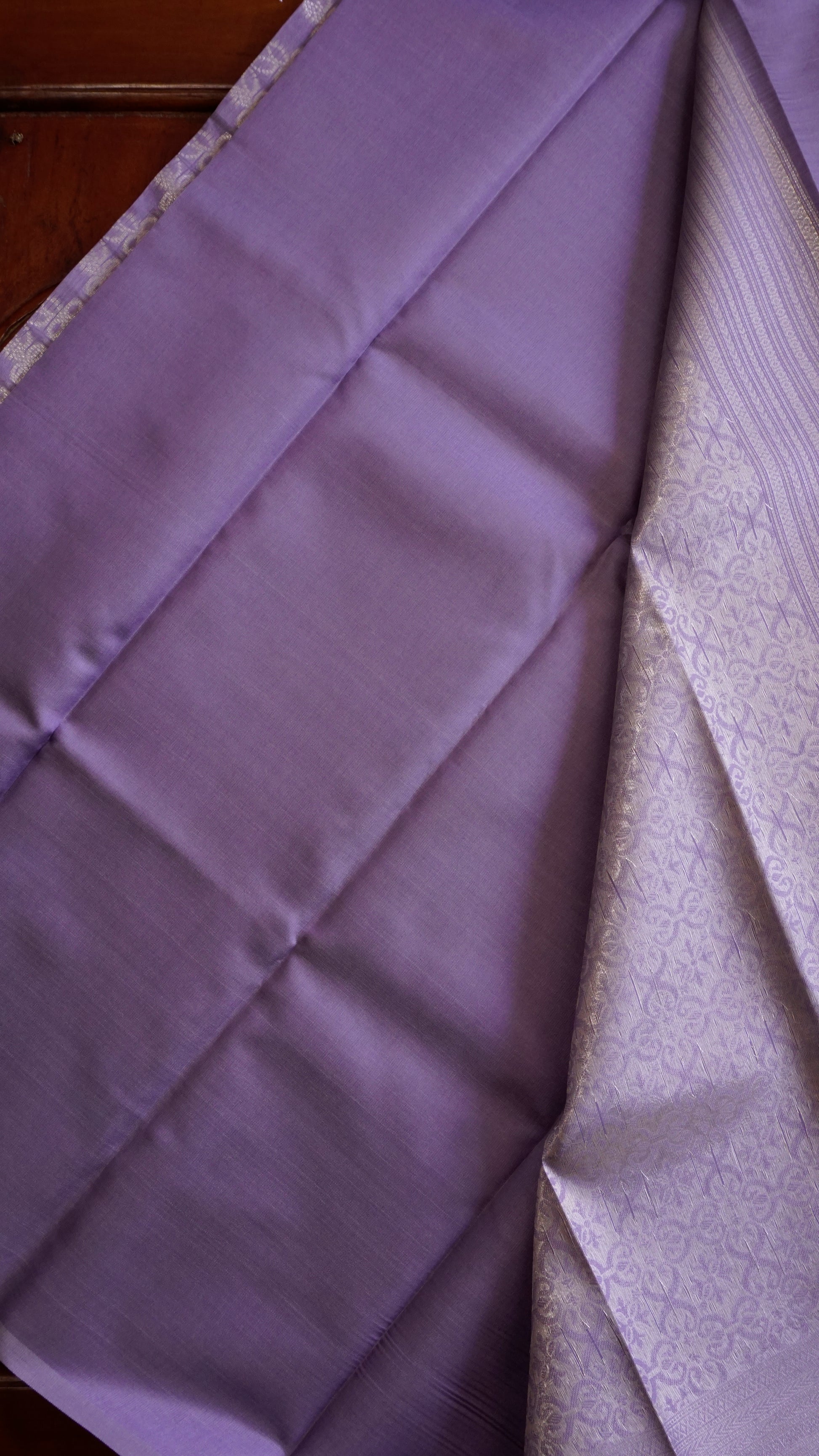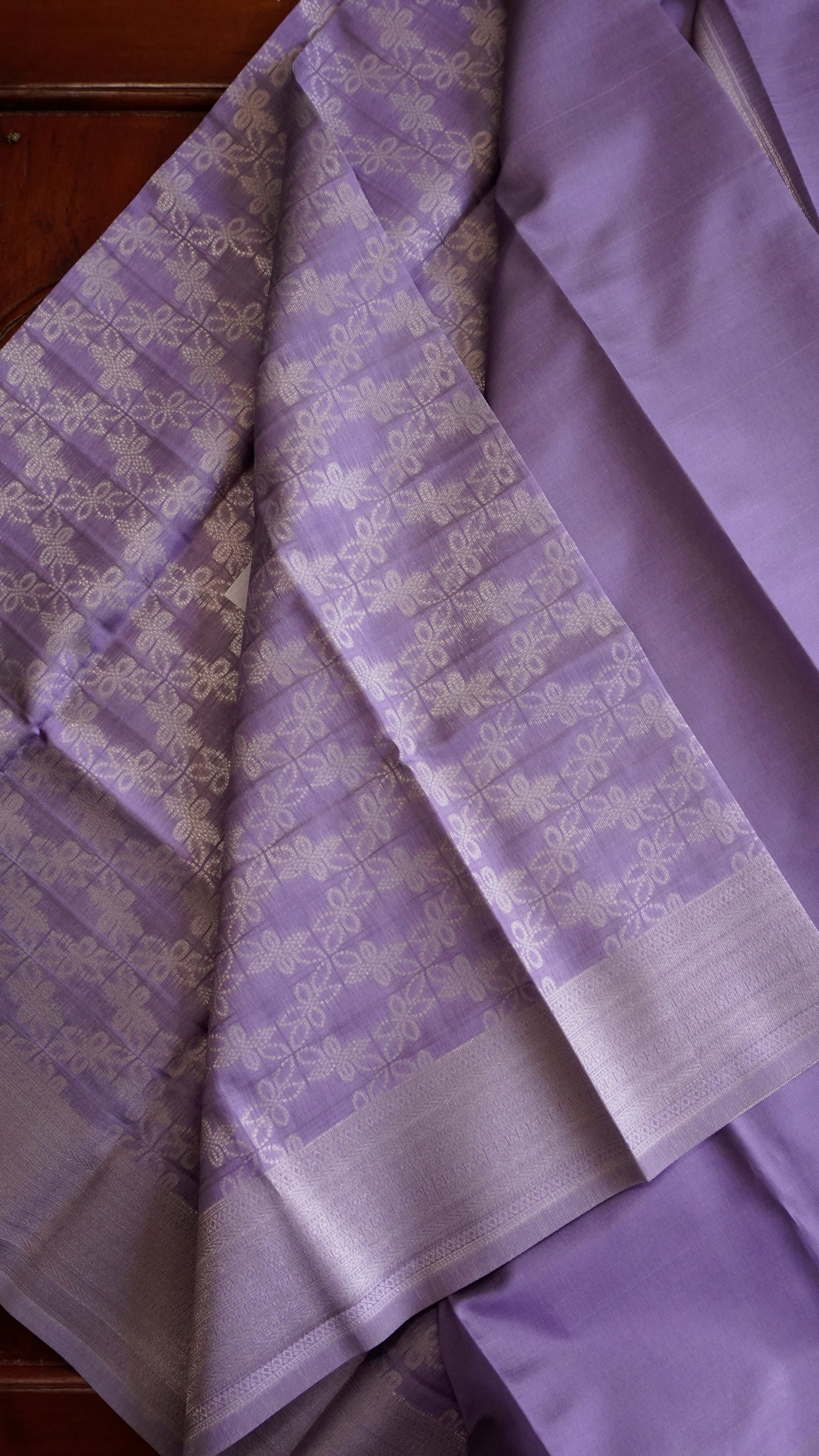Step into timeless grace with this lavender semi-silk saree, a perfect blend of subtle charm and festive elegance. The body is adorned with delicate floral-inspired motifs woven in silver zari, creating a soft shimmer that enhances its royal appeal.