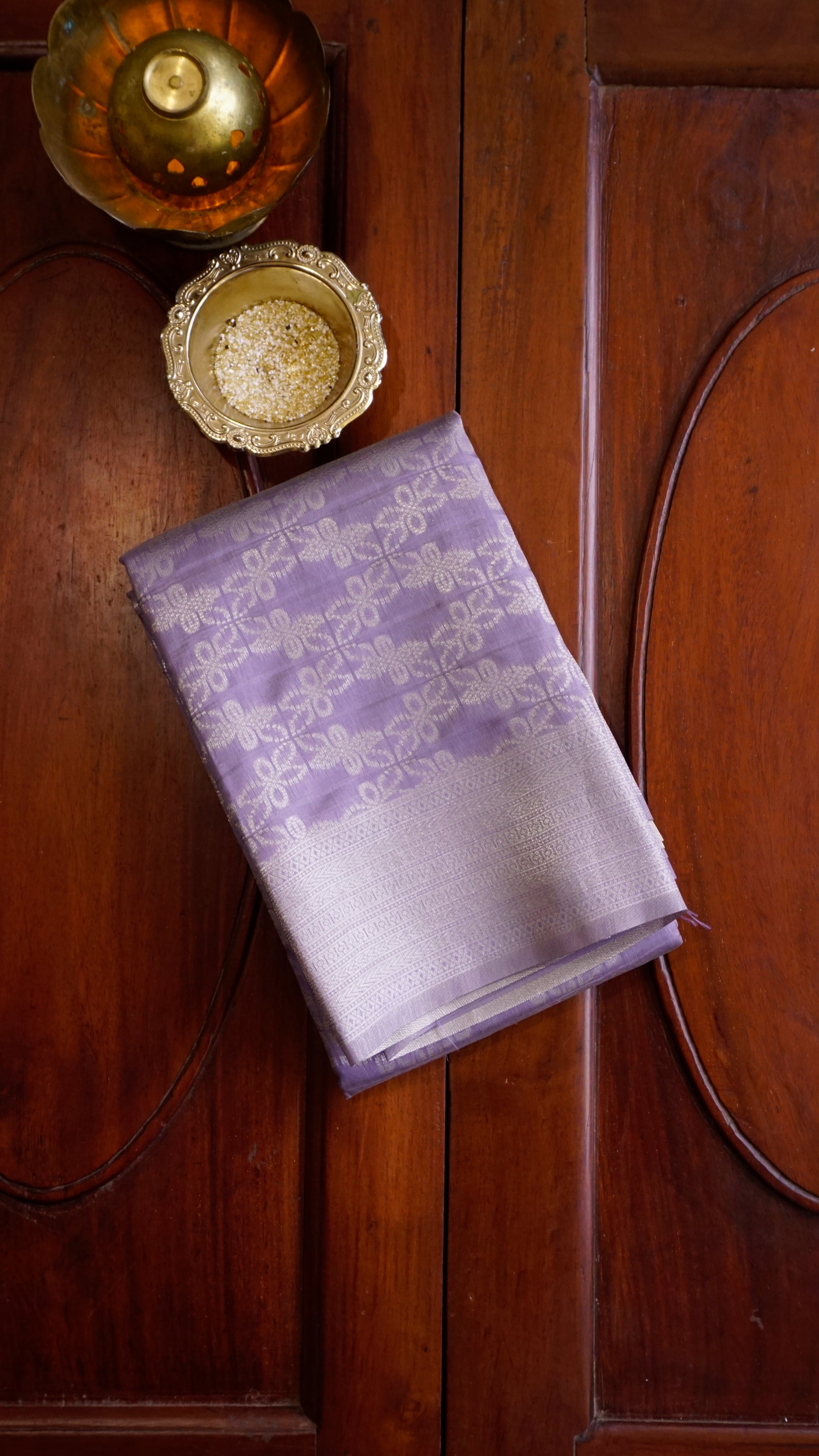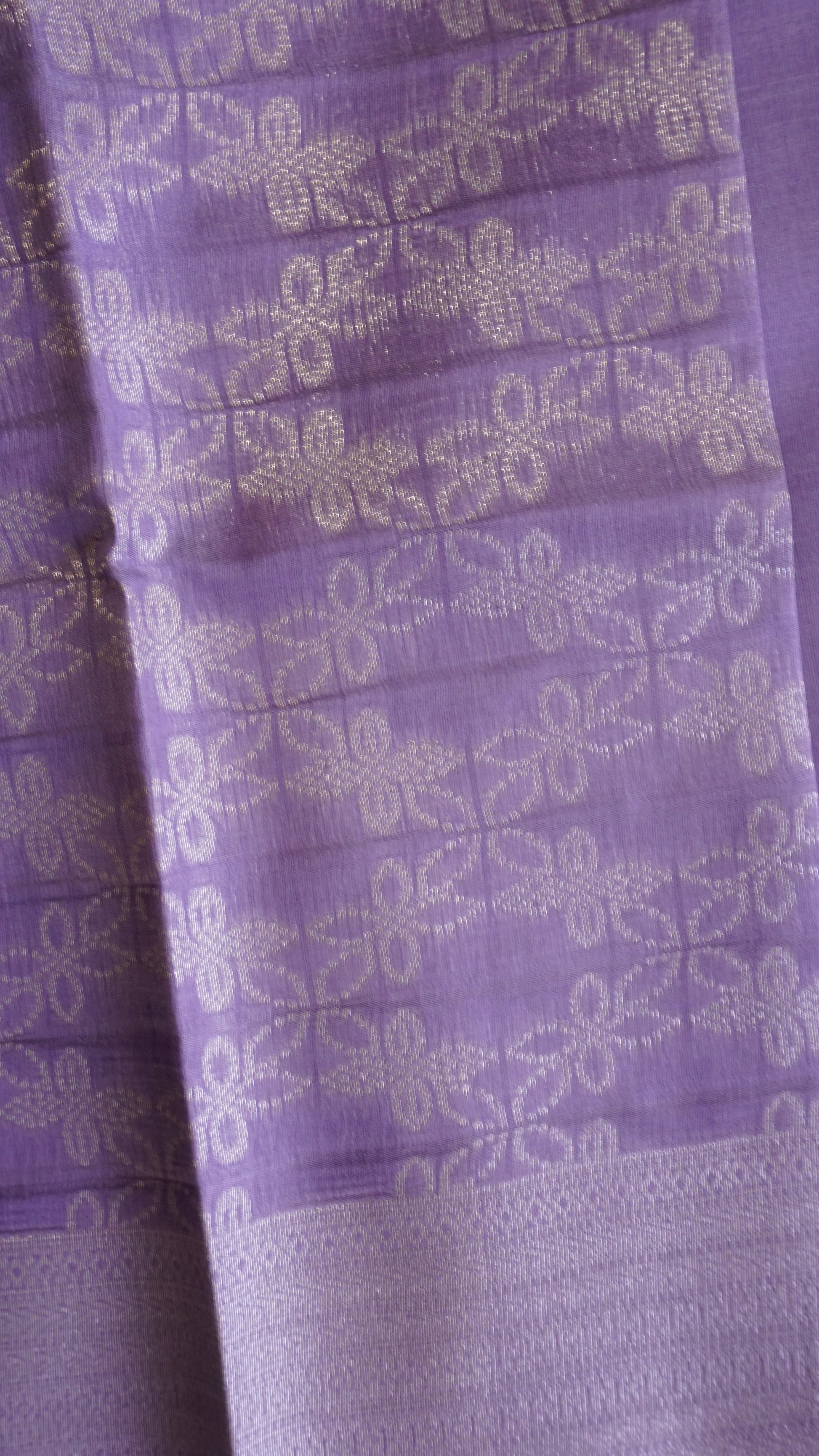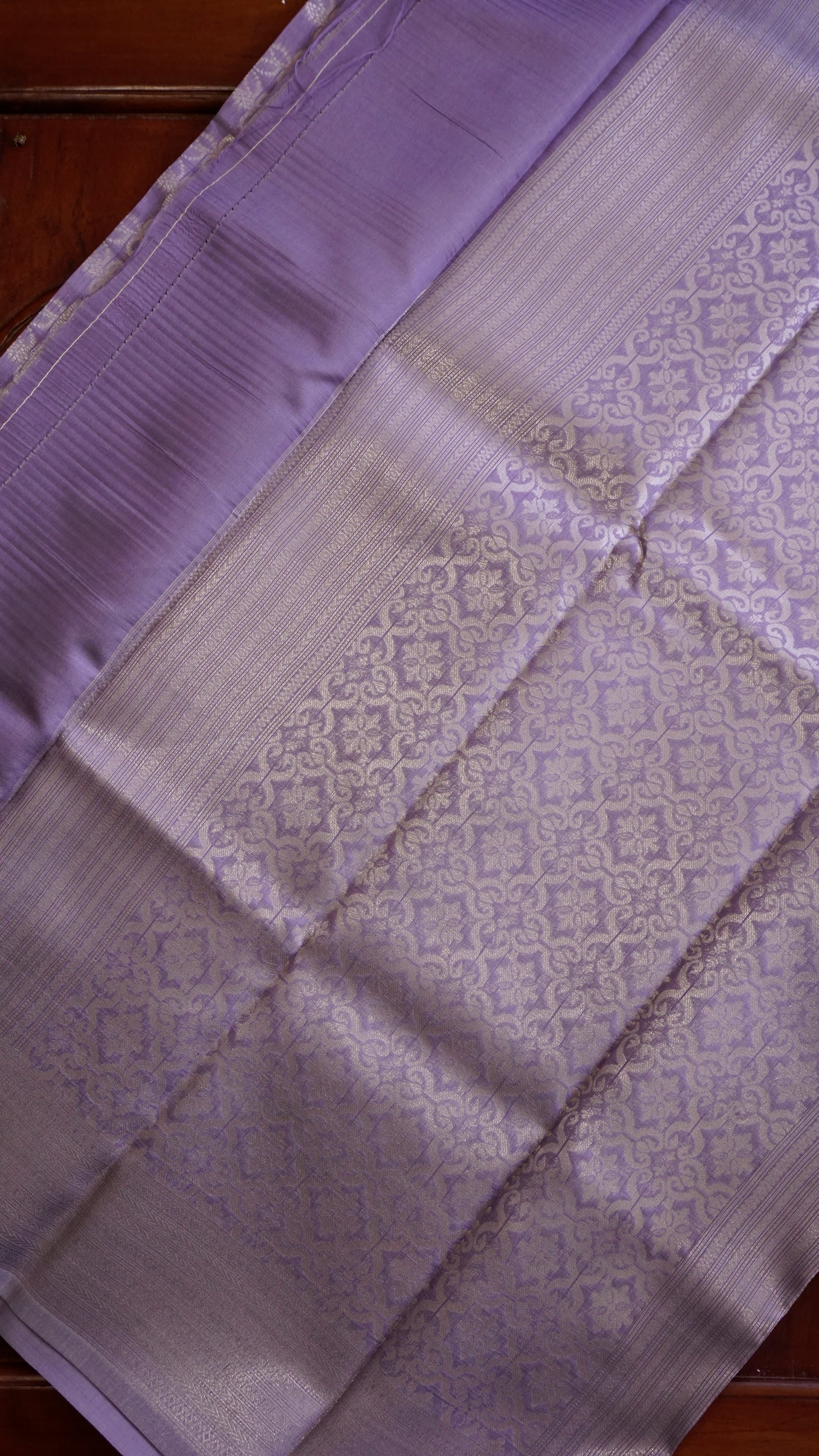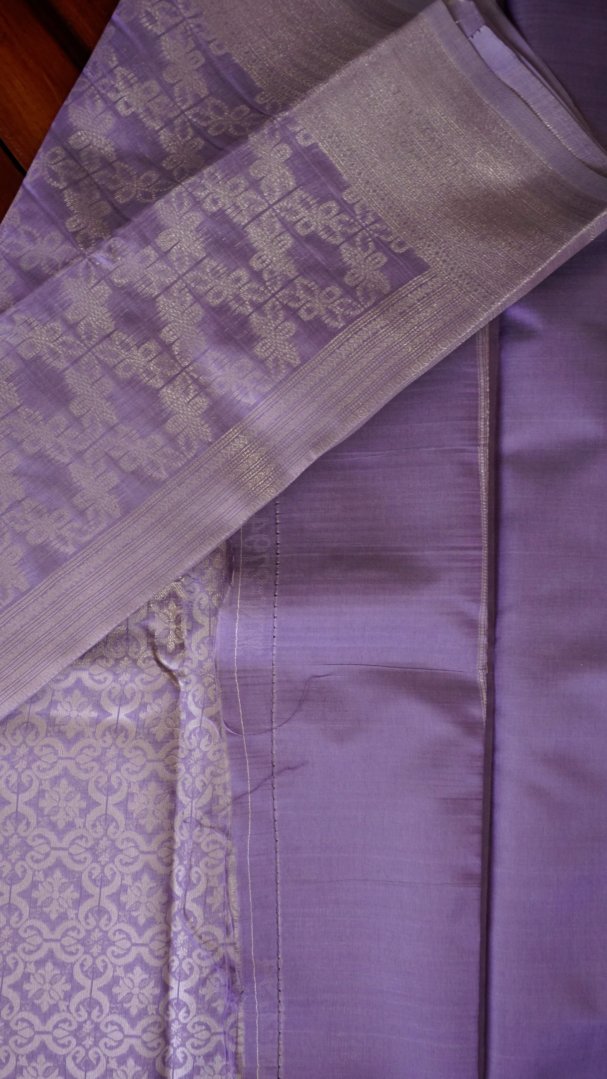 Step into timeless grace with this lavender semi-silk saree, a perfect blend of subtle charm and festive elegance. The body is adorned with delicate floral-inspired motifs woven in silver zari, creating a soft shimmer that enhances its royal appeal.