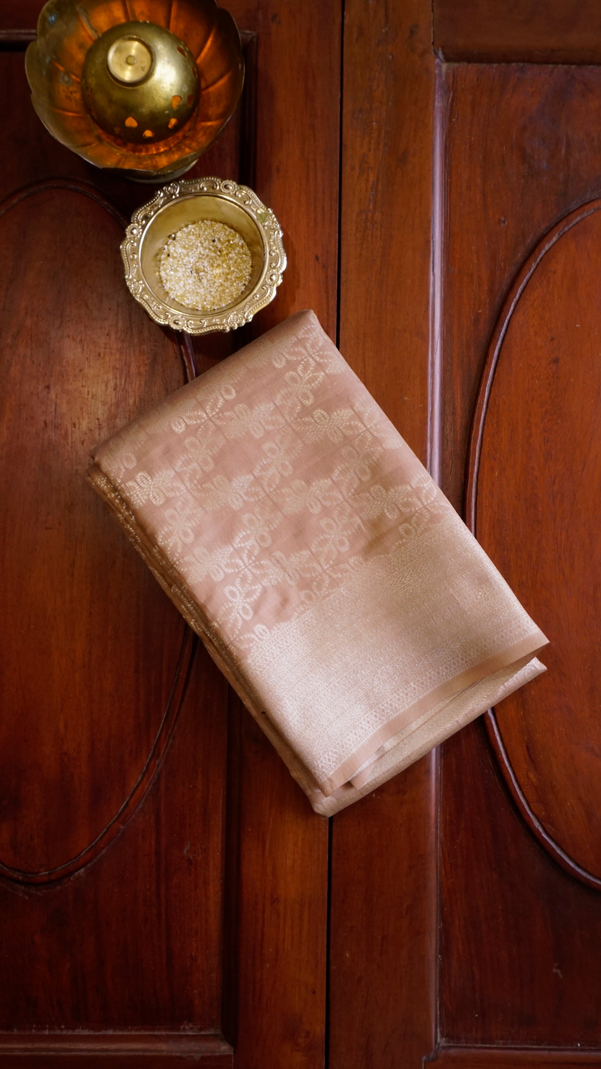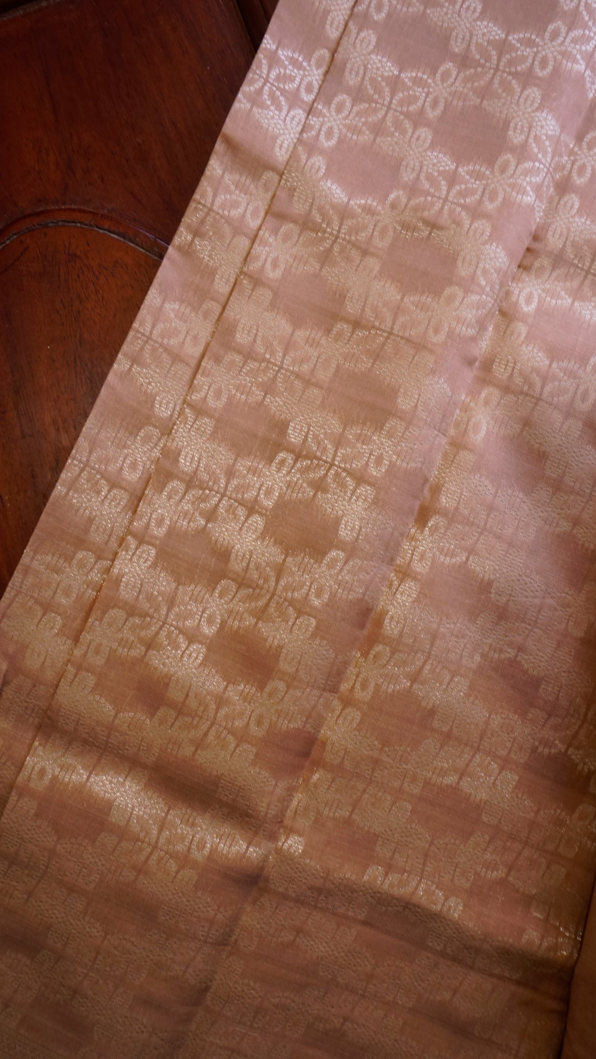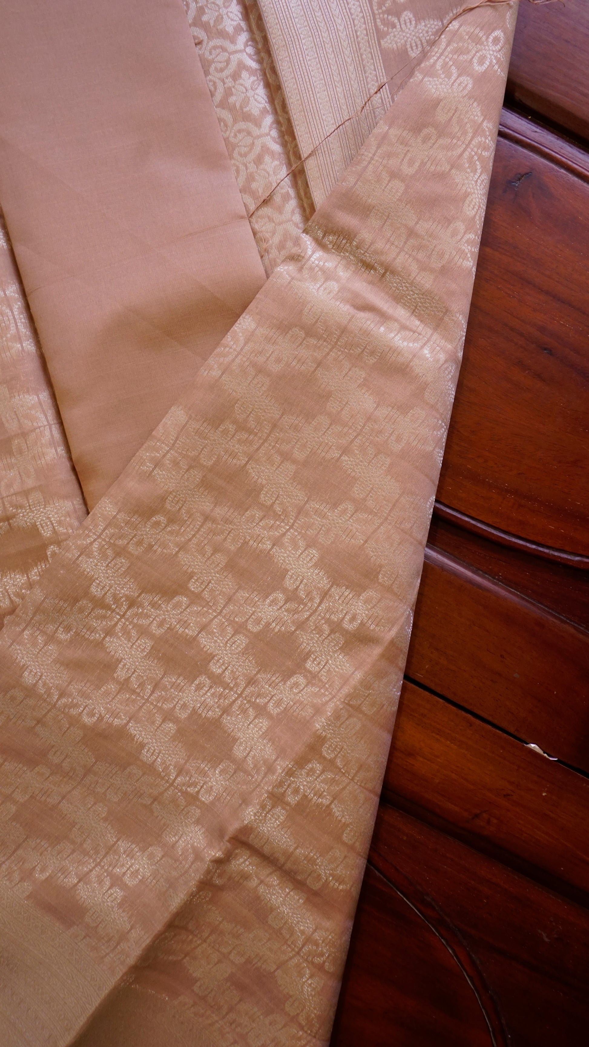 Grace meets subtle luxury in this beautifully woven beige semi-silk saree. The saree features delicate floral-inspired woven motifs across the body, lending it a timeless charm. The golden zari border and pallu add a soft sheen, perfectly balancing simplicity with sophistication.