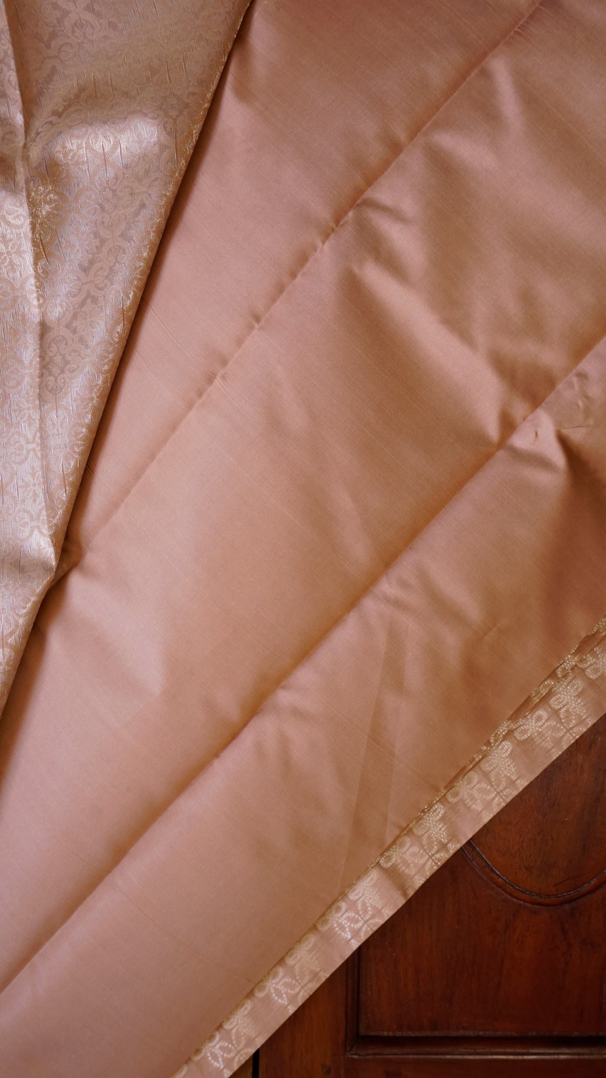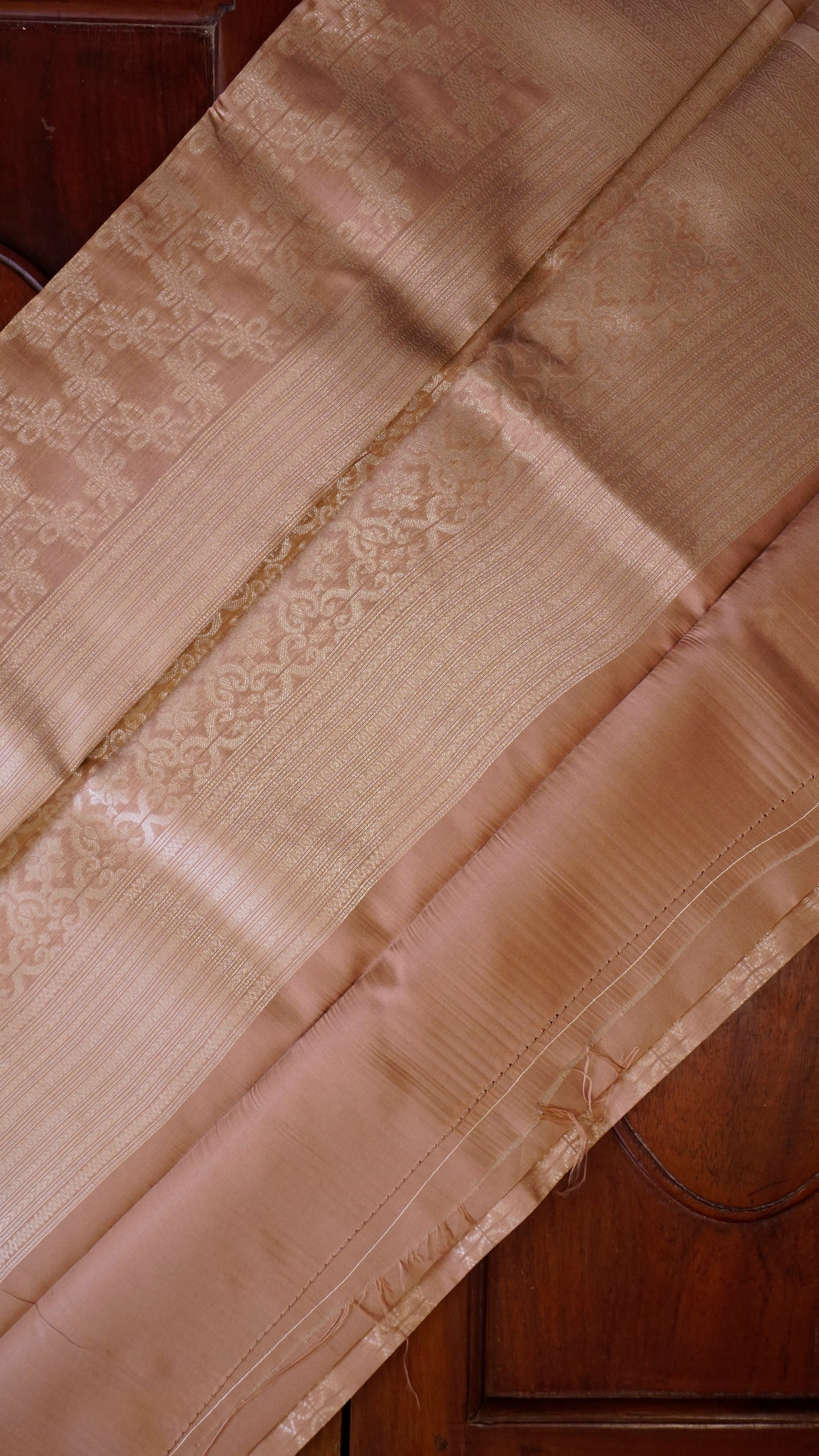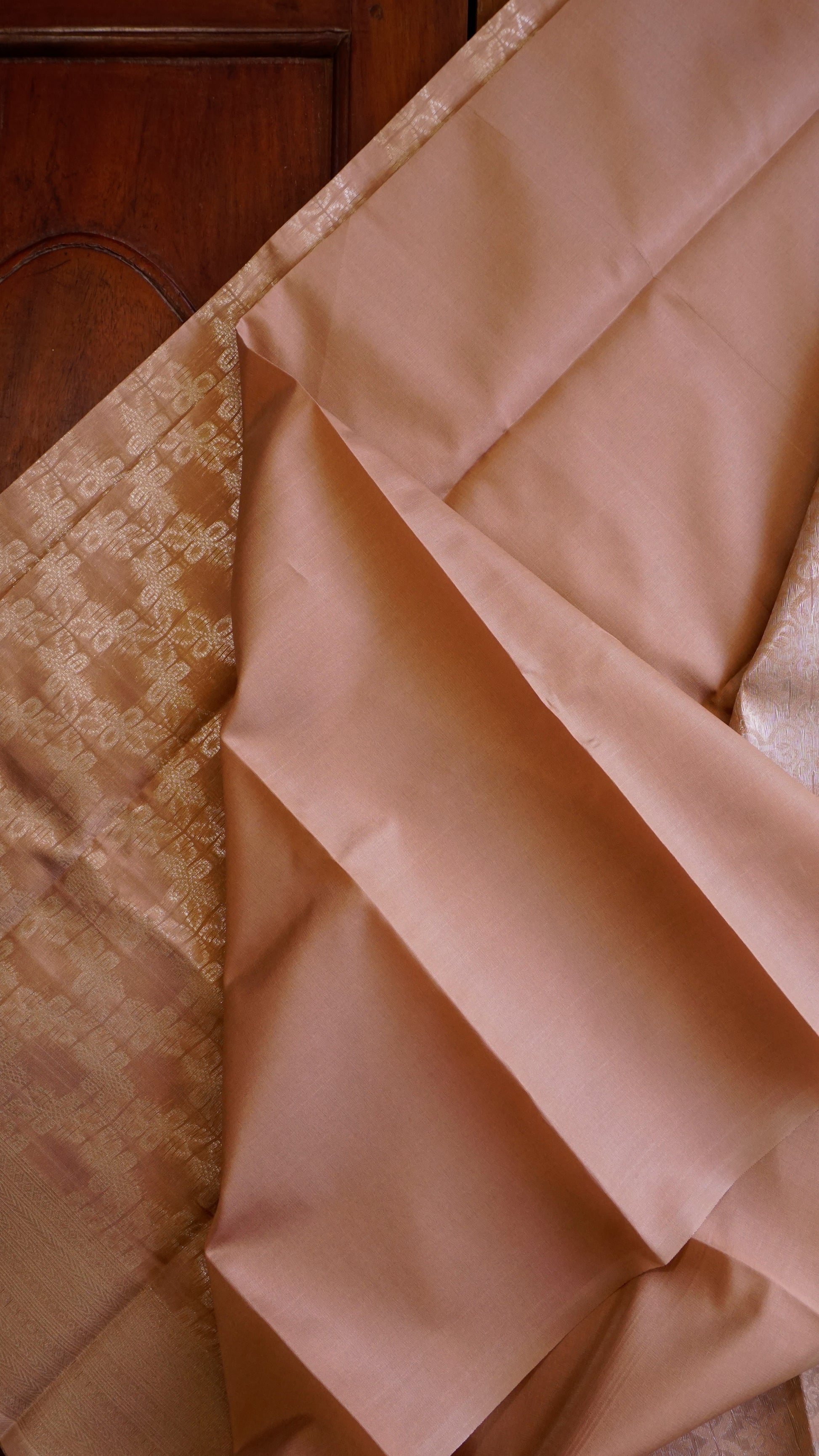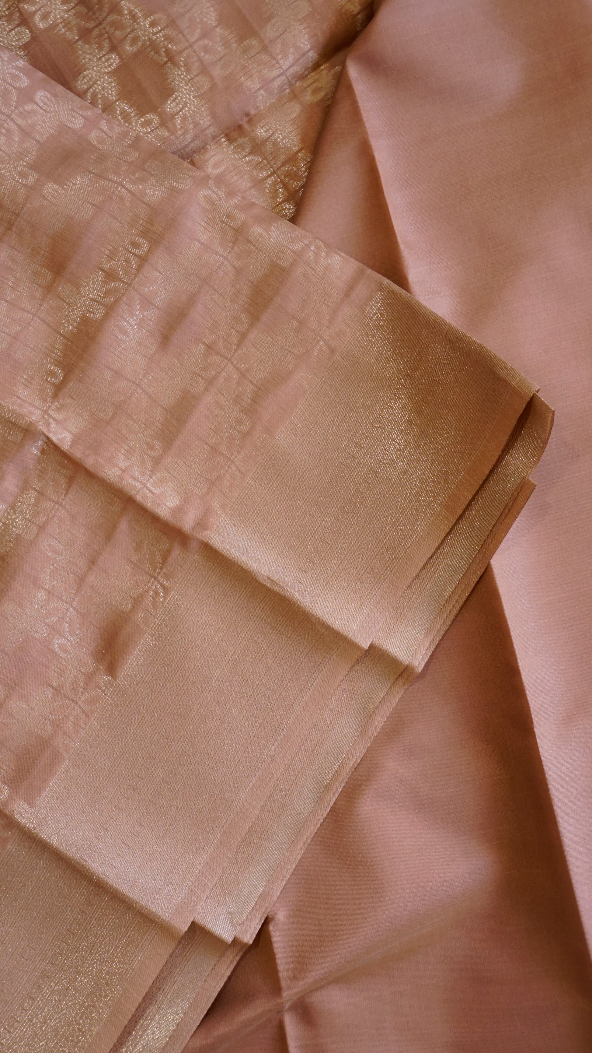 Grace meets subtle luxury in this beautifully woven beige semi-silk saree. The saree features delicate floral-inspired woven motifs across the body, lending it a timeless charm. The golden zari border and pallu add a soft sheen, perfectly balancing simplicity with sophistication.