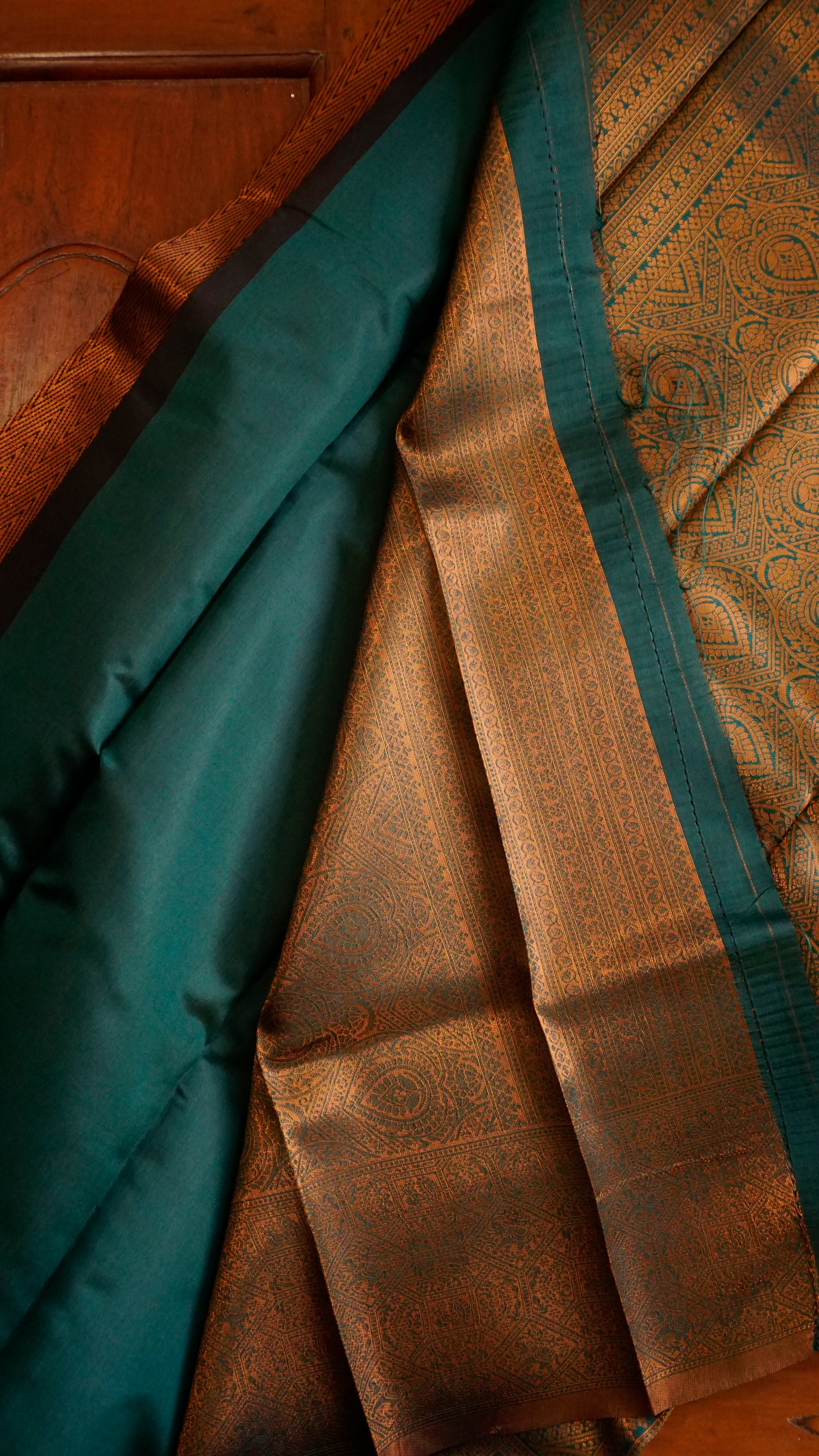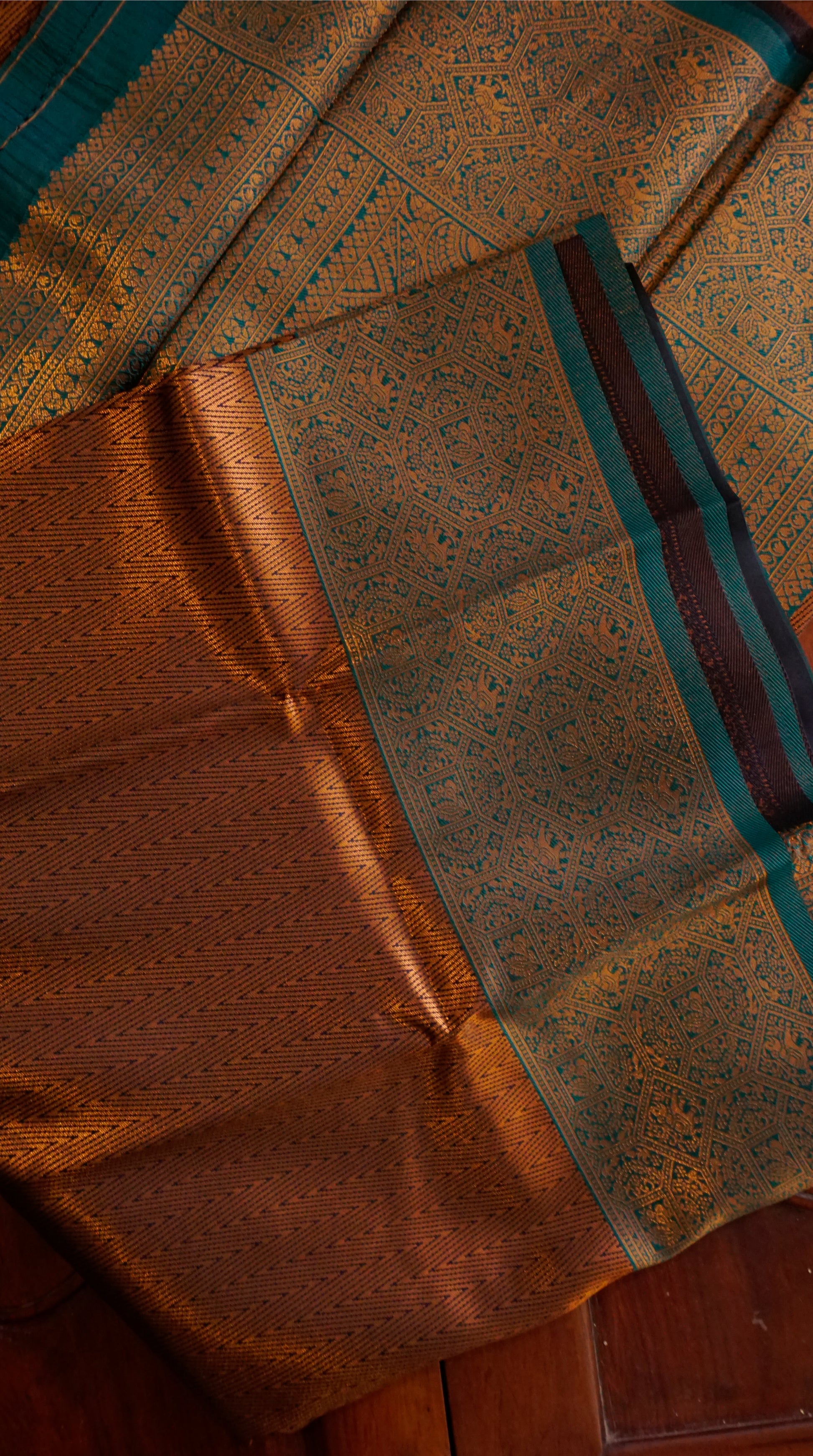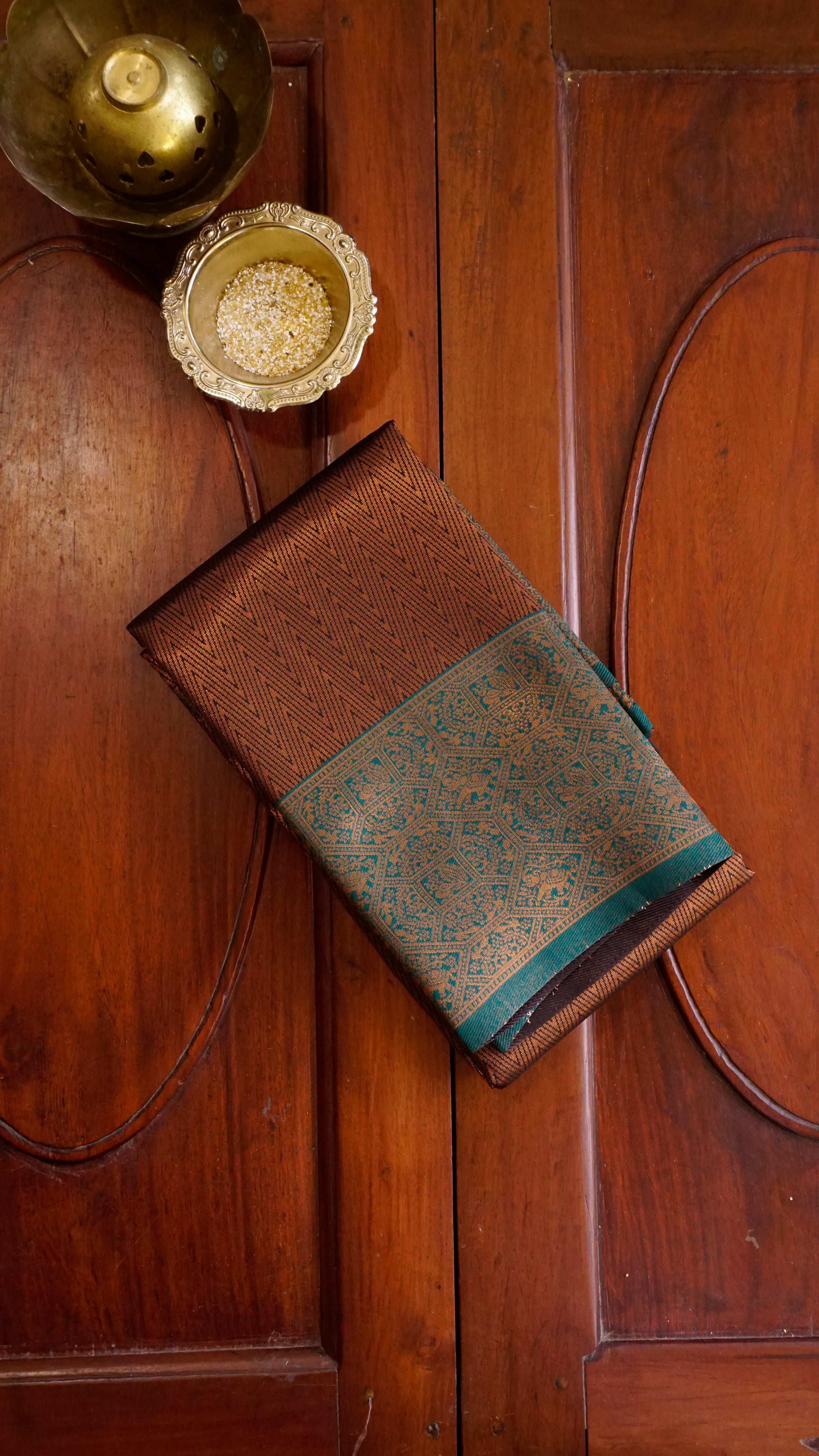 With its elaborate copper zari weaving and rich coffee-brown foundation, this saree exudes grandeur.  The pallu and contrast green border provide a striking pop of beauty, while the intricate patterns on the body showcase traditional craftsmanship.