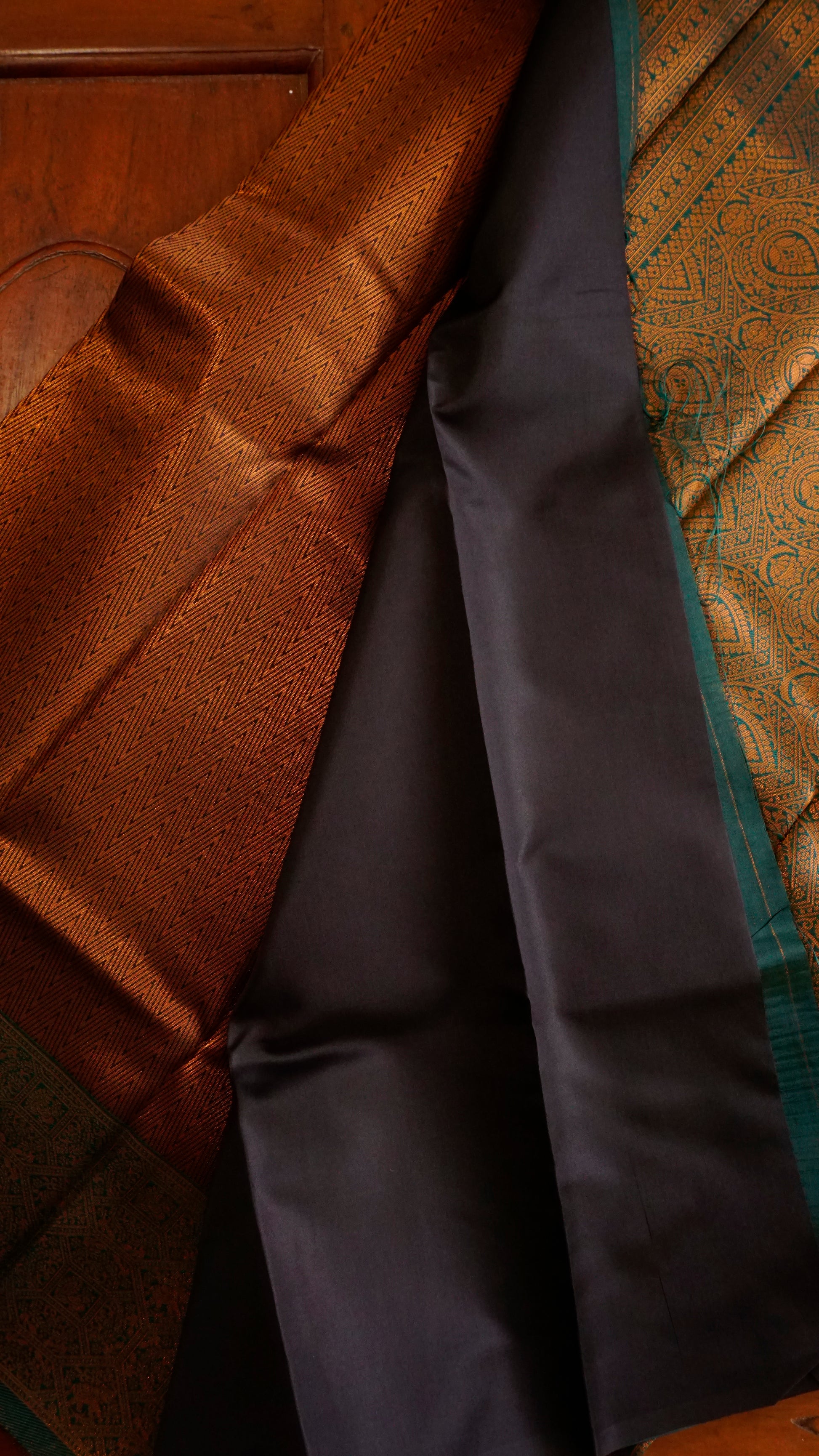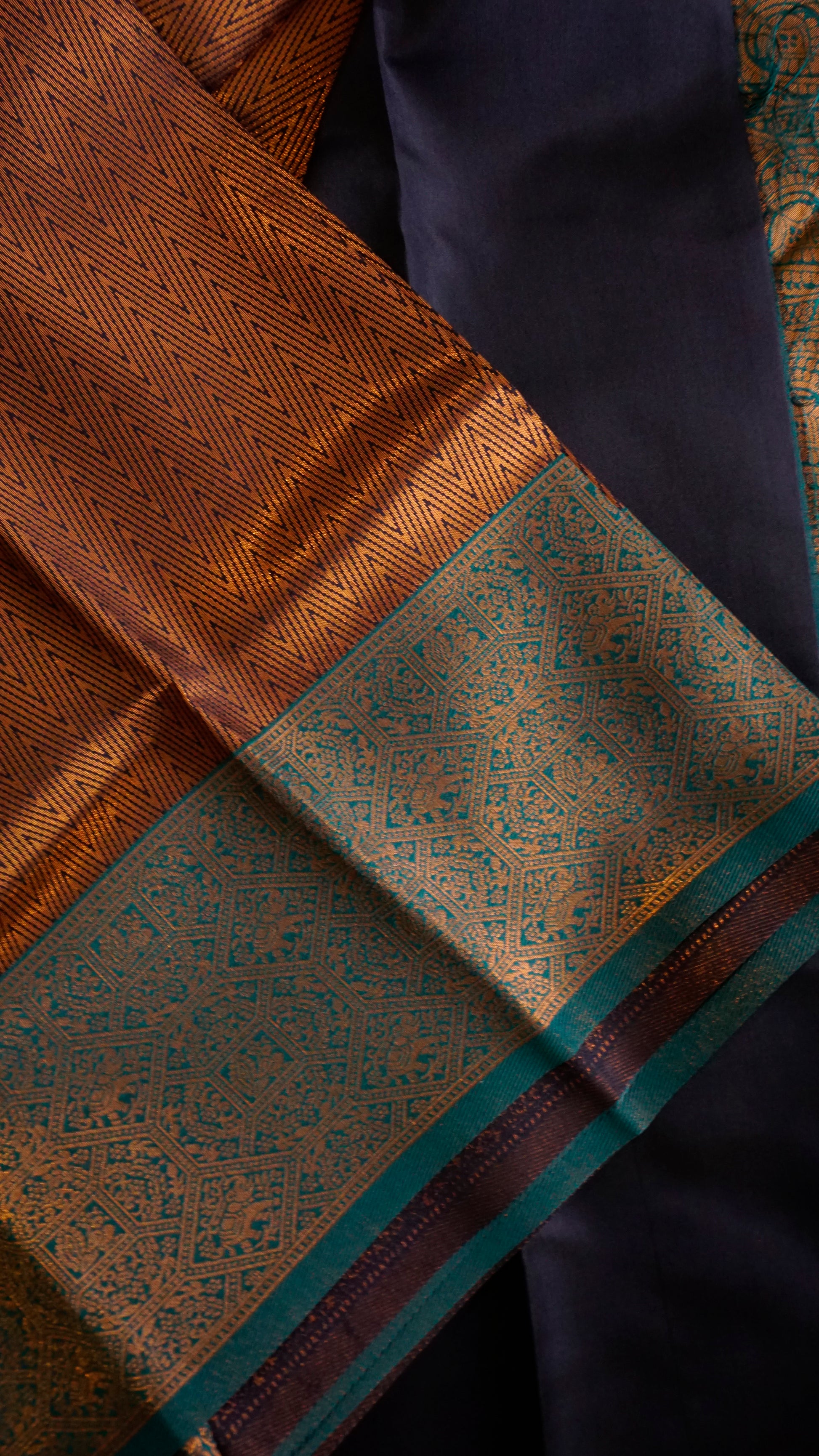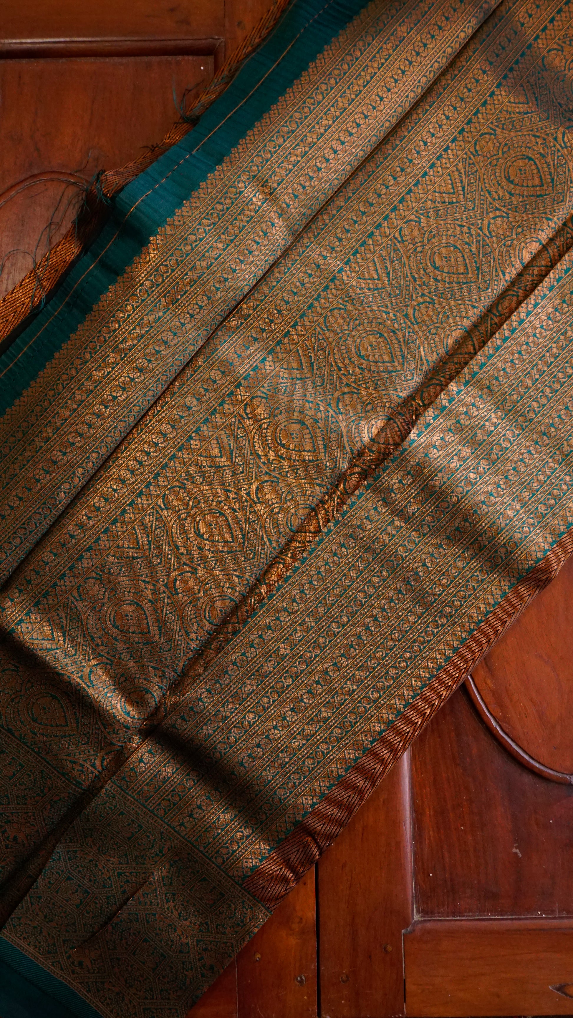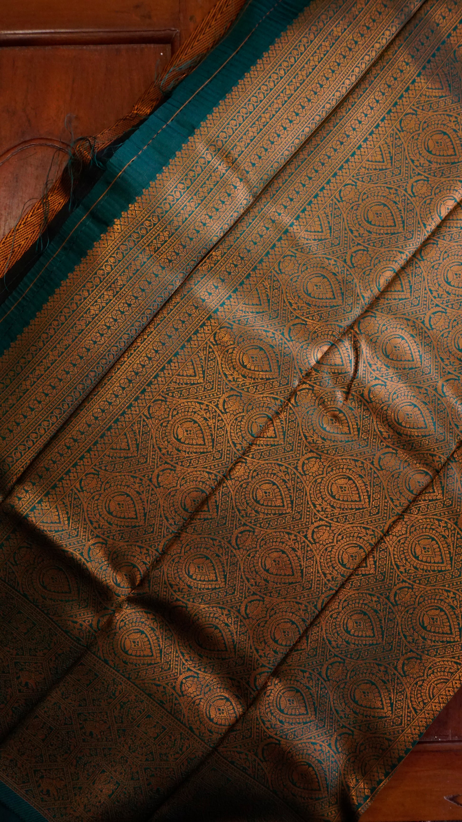 With its elaborate copper zari weaving and rich coffee-brown foundation, this saree exudes grandeur.  The pallu and contrast green border provide a striking pop of beauty, while the intricate patterns on the body showcase traditional craftsmanship.