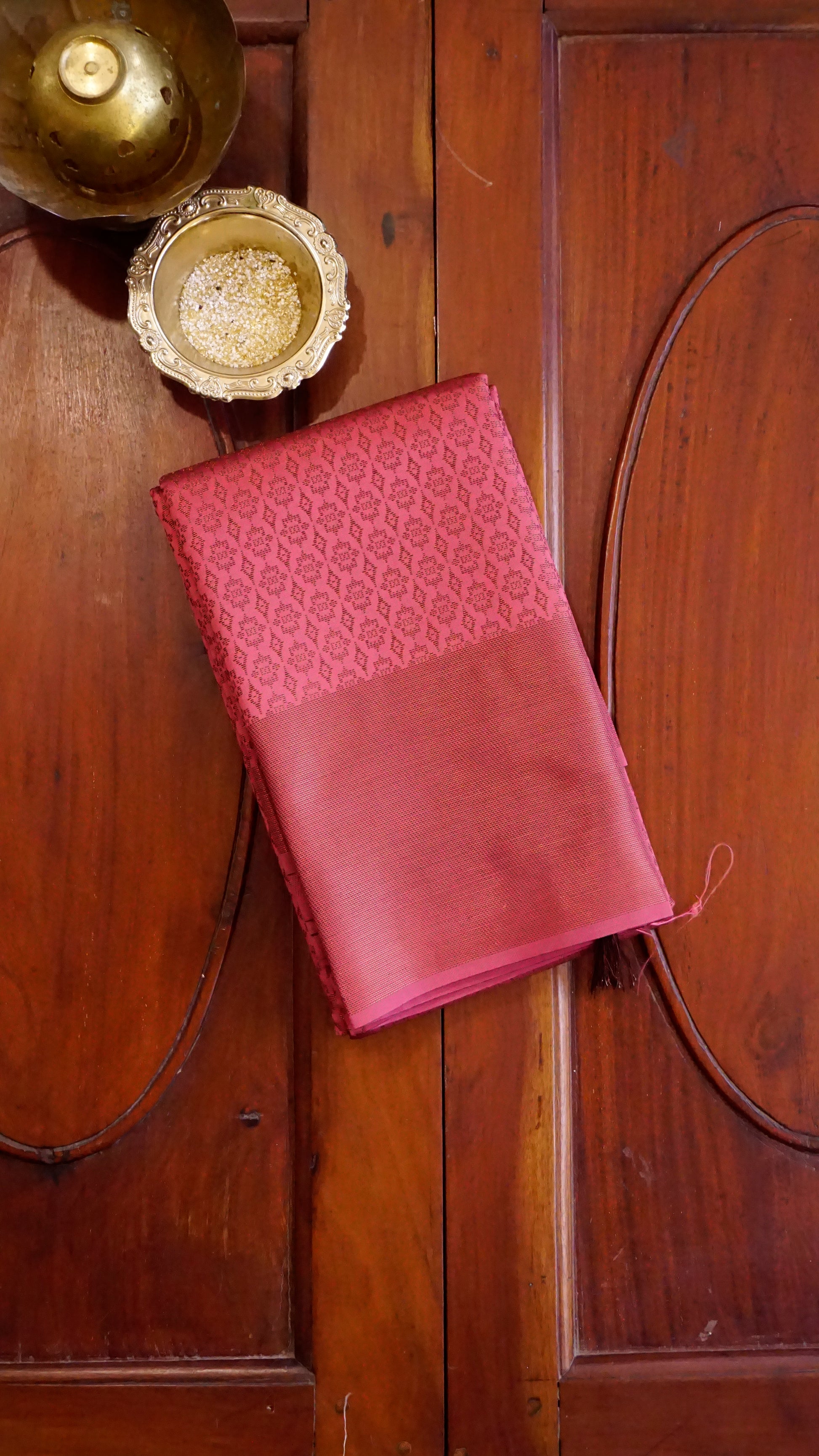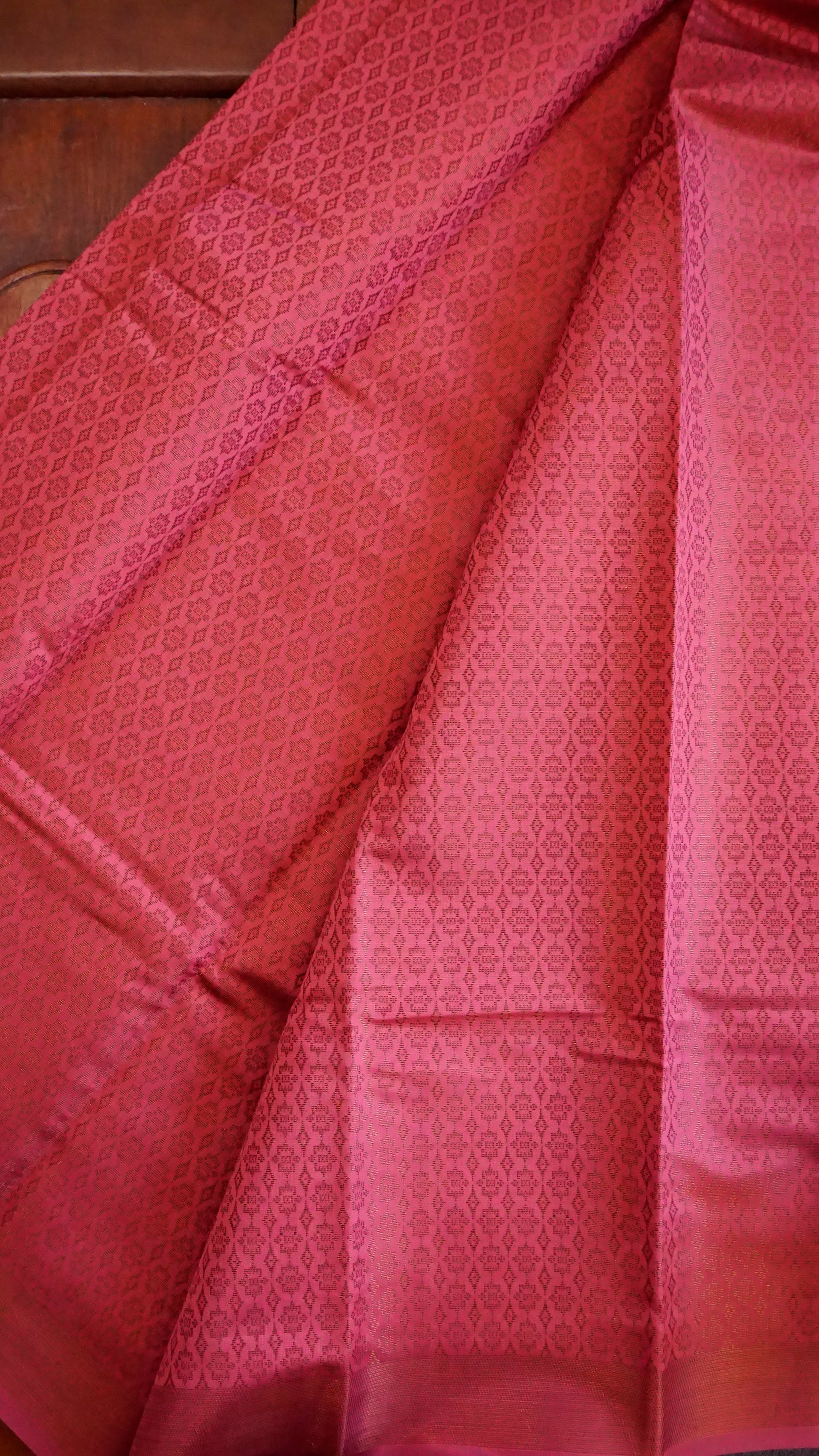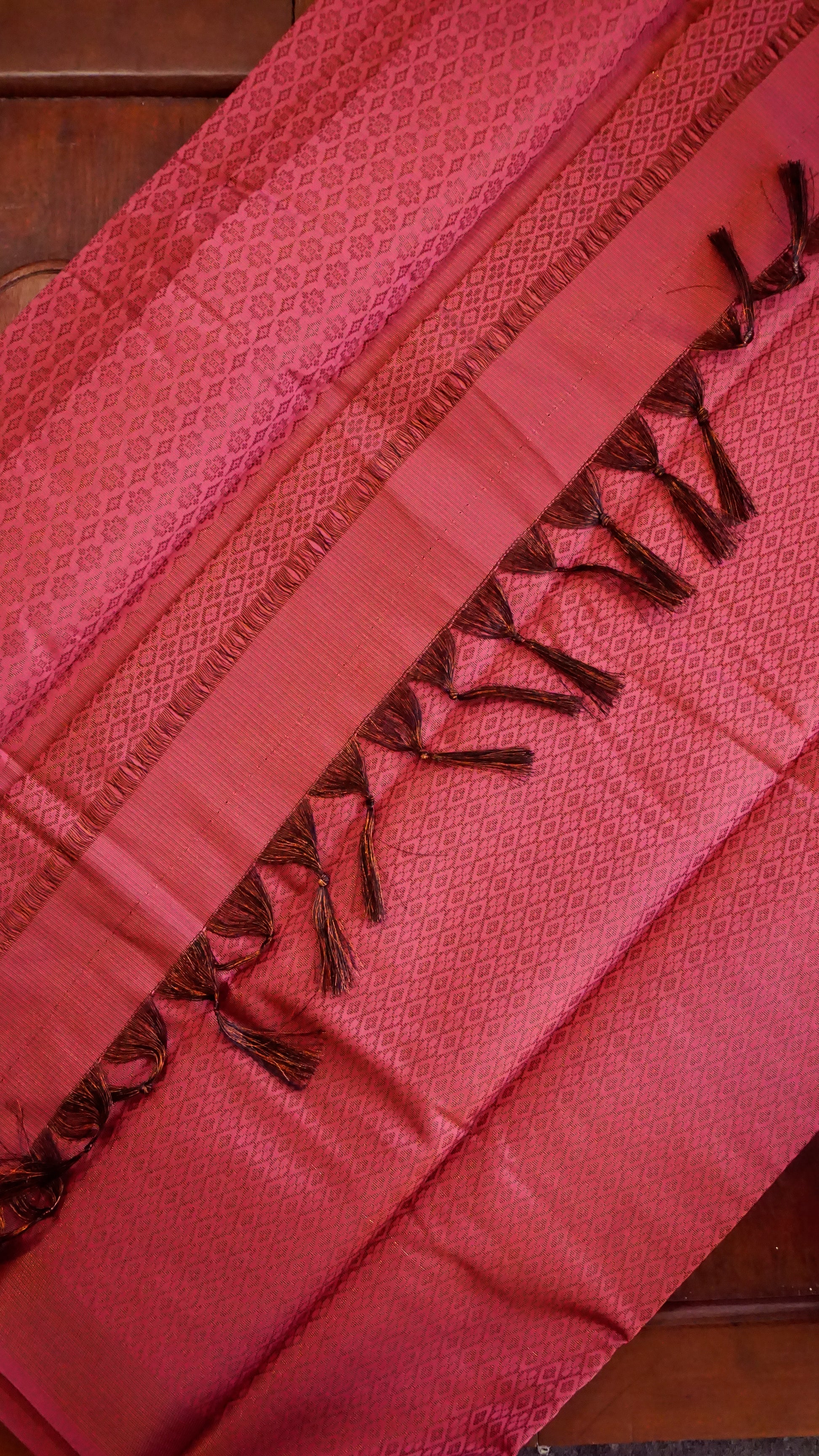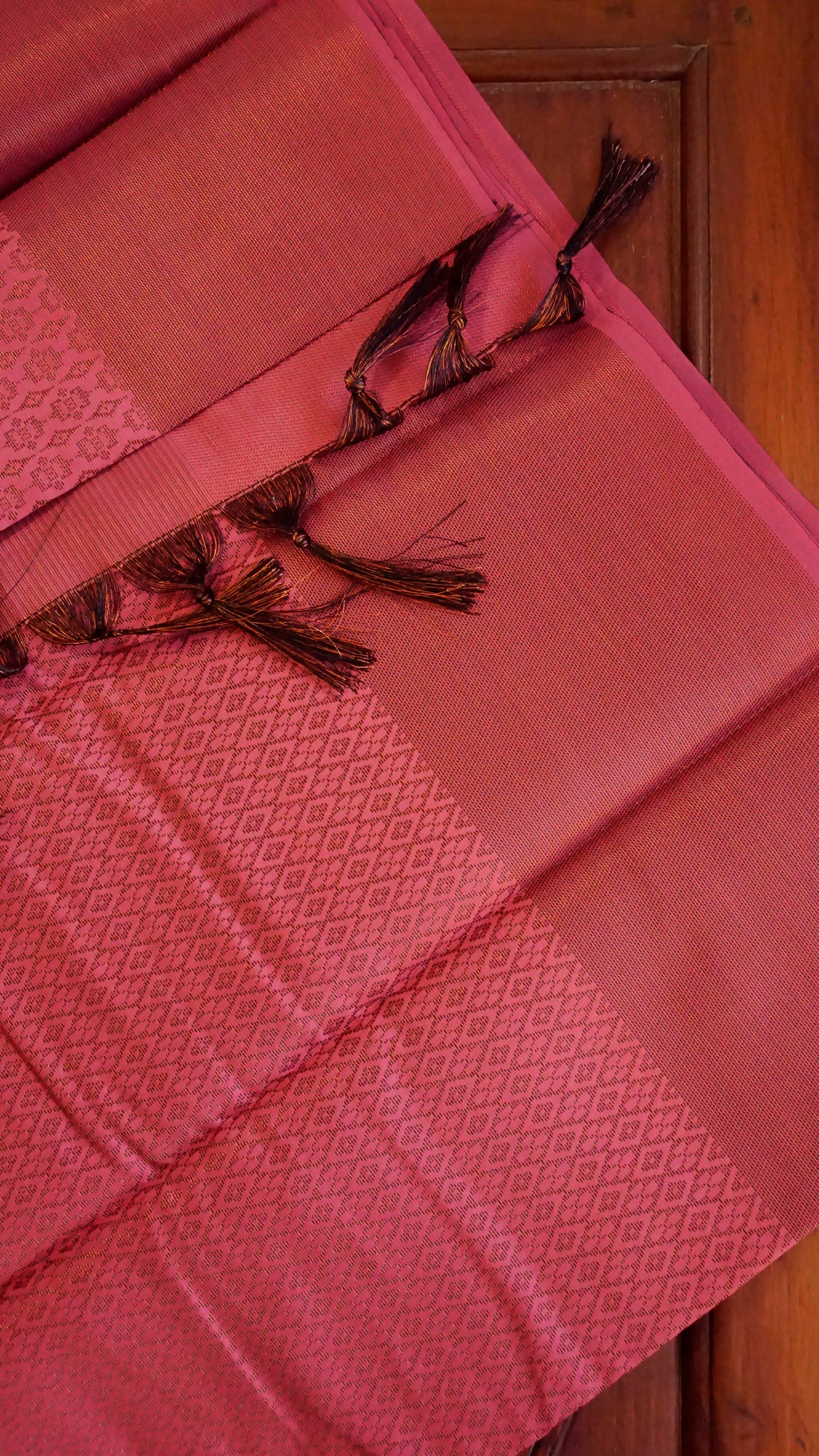 A pretty rose pink semi-silk saree with a gentle golden shimmer and elaborately woven patterns. Its traditional charm is preserved while its modern appeal is enhanced by the exquisite tassel-detailed pallu. Lightweight, sophisticated, and effortlessly fashionable, this saree is ideal for weddings, festival festivities, and formal events.