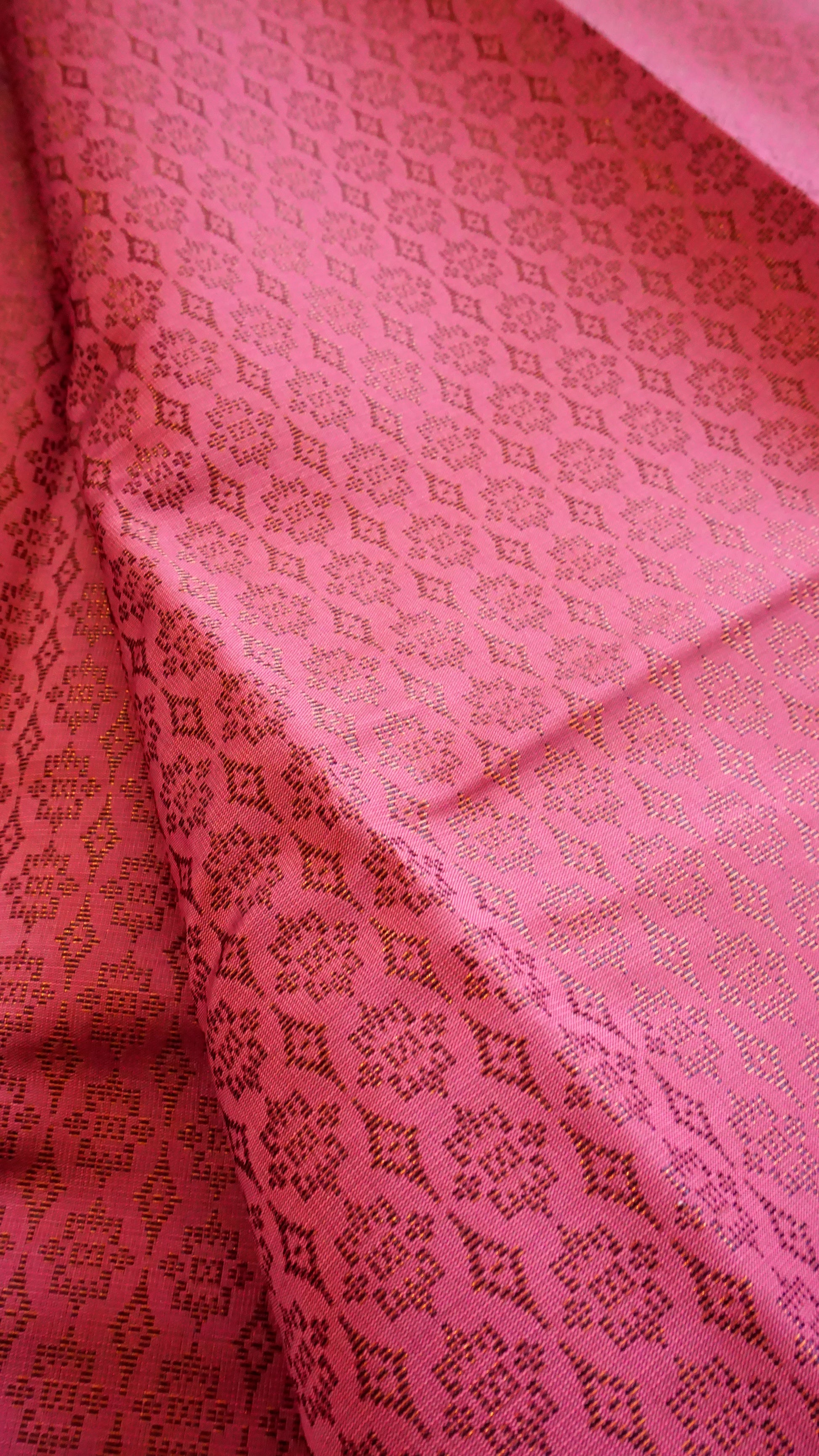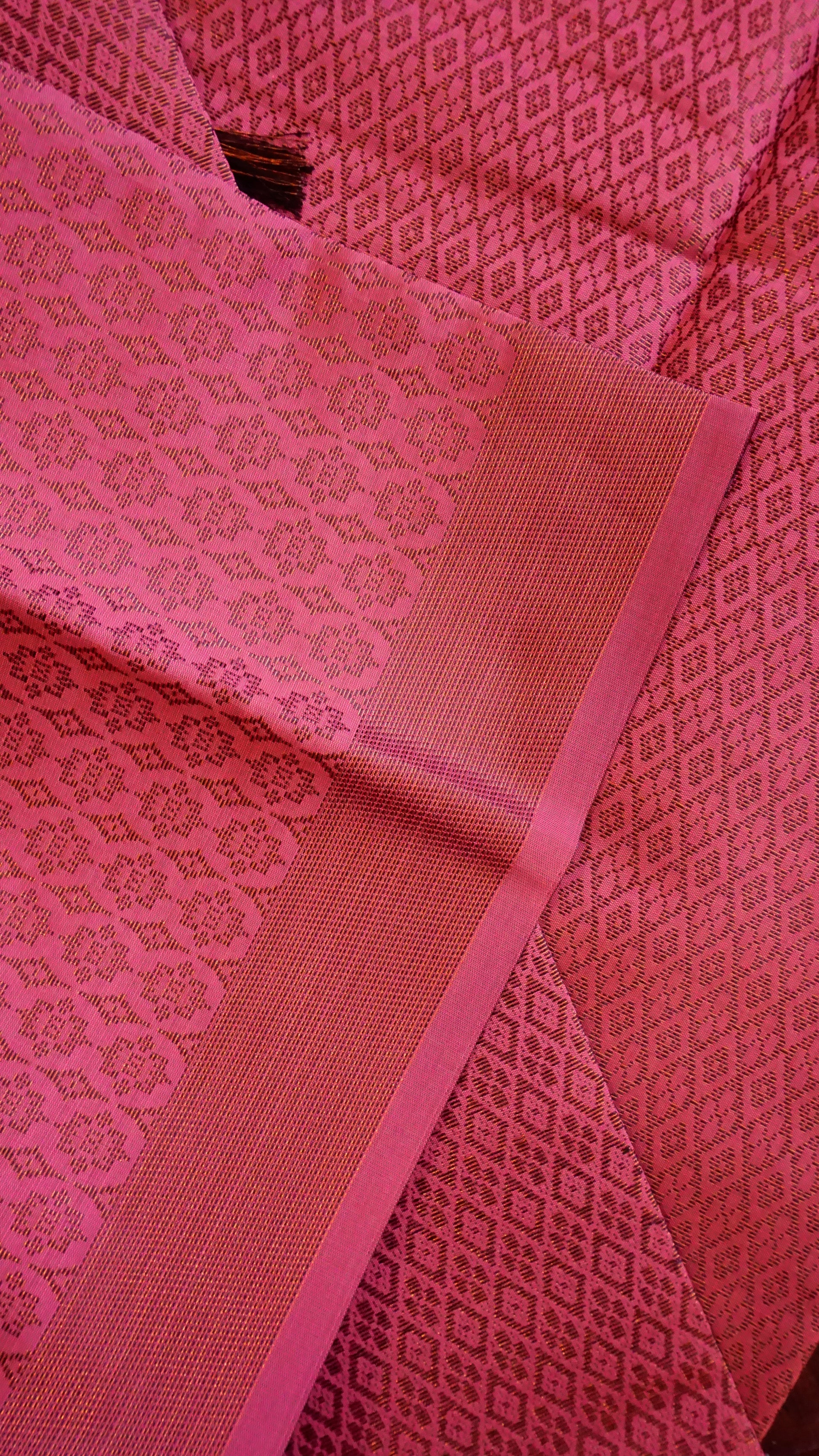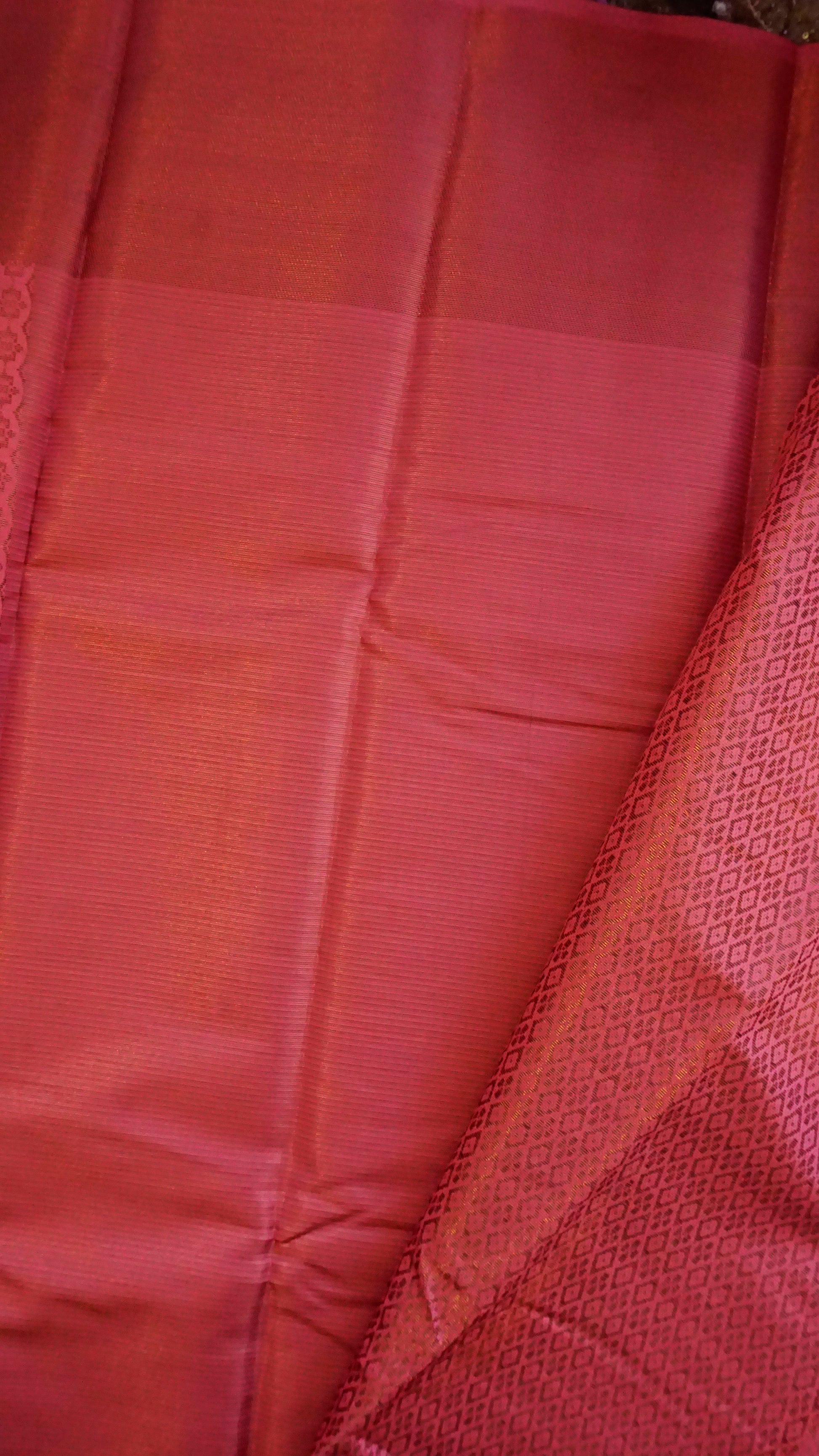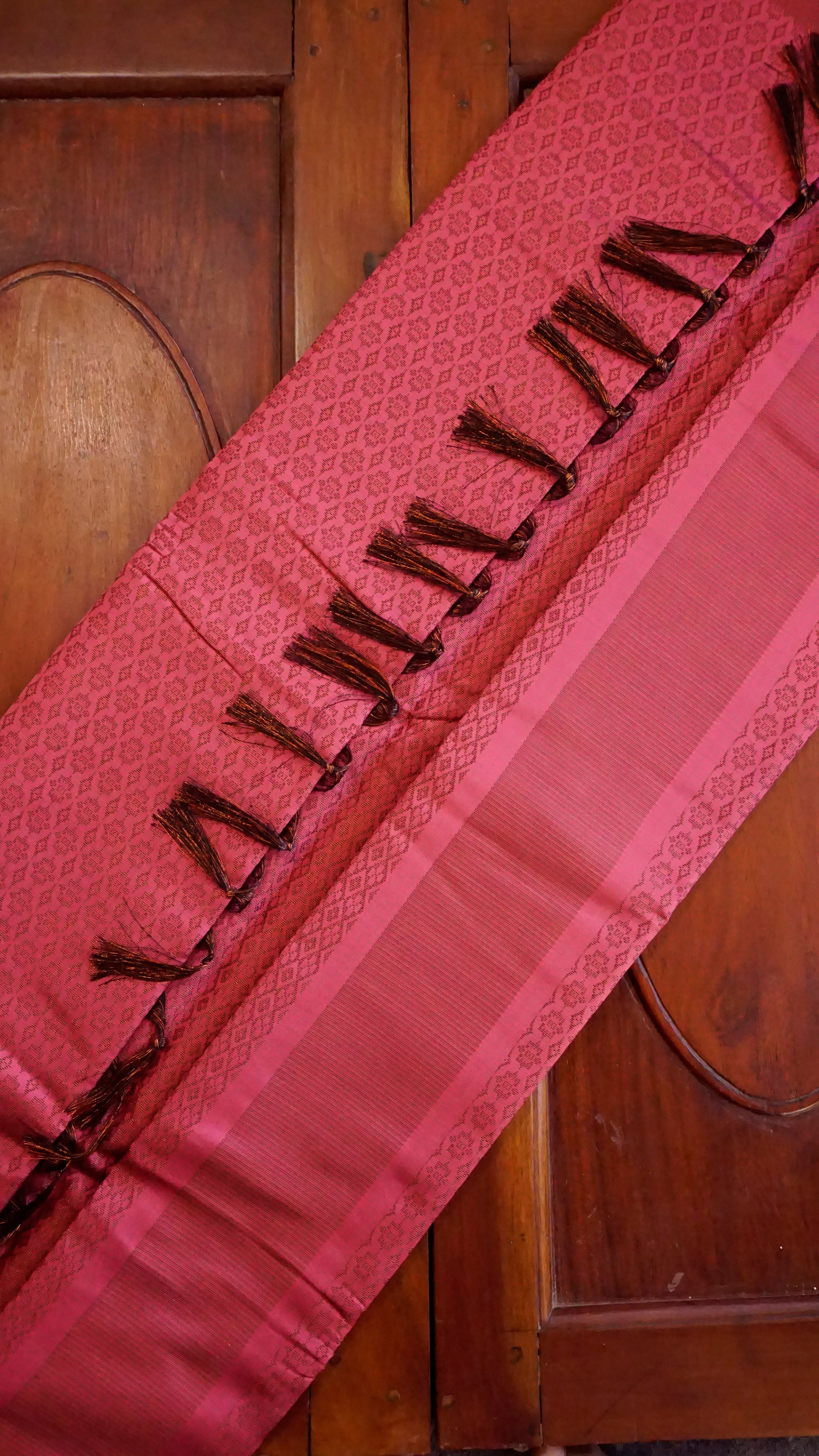 A pretty rose pink semi-silk saree with a gentle golden shimmer and elaborately woven patterns. Its traditional charm is preserved while its modern appeal is enhanced by the exquisite tassel-detailed pallu. Lightweight, sophisticated, and effortlessly fashionable, this saree is ideal for weddings, festival festivities, and formal events.