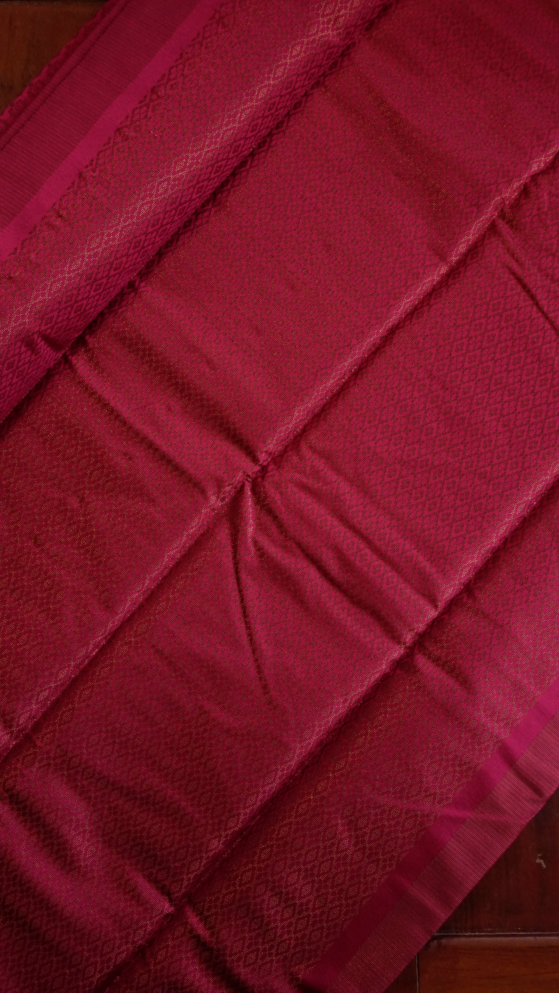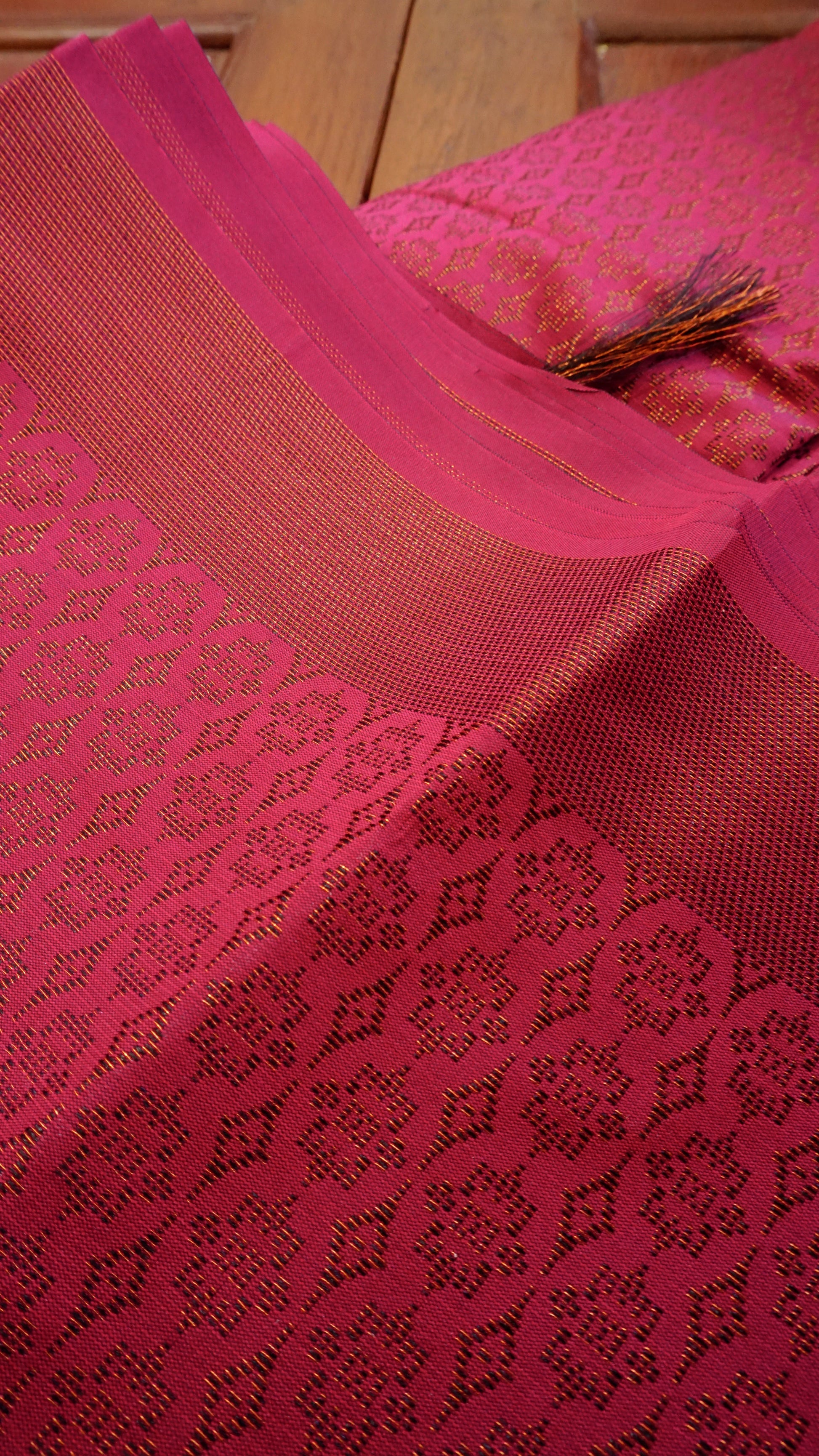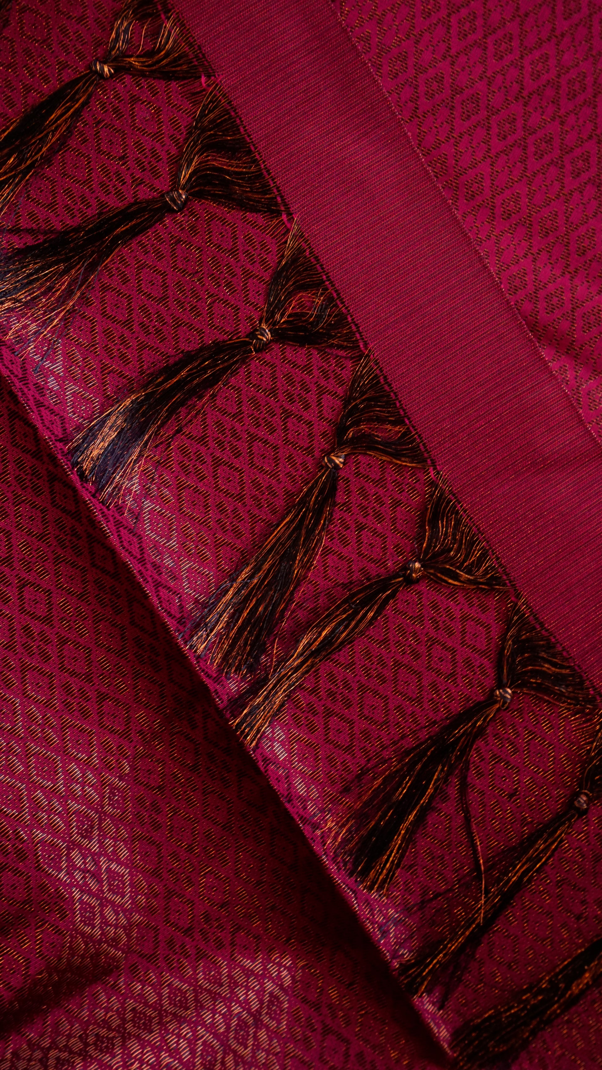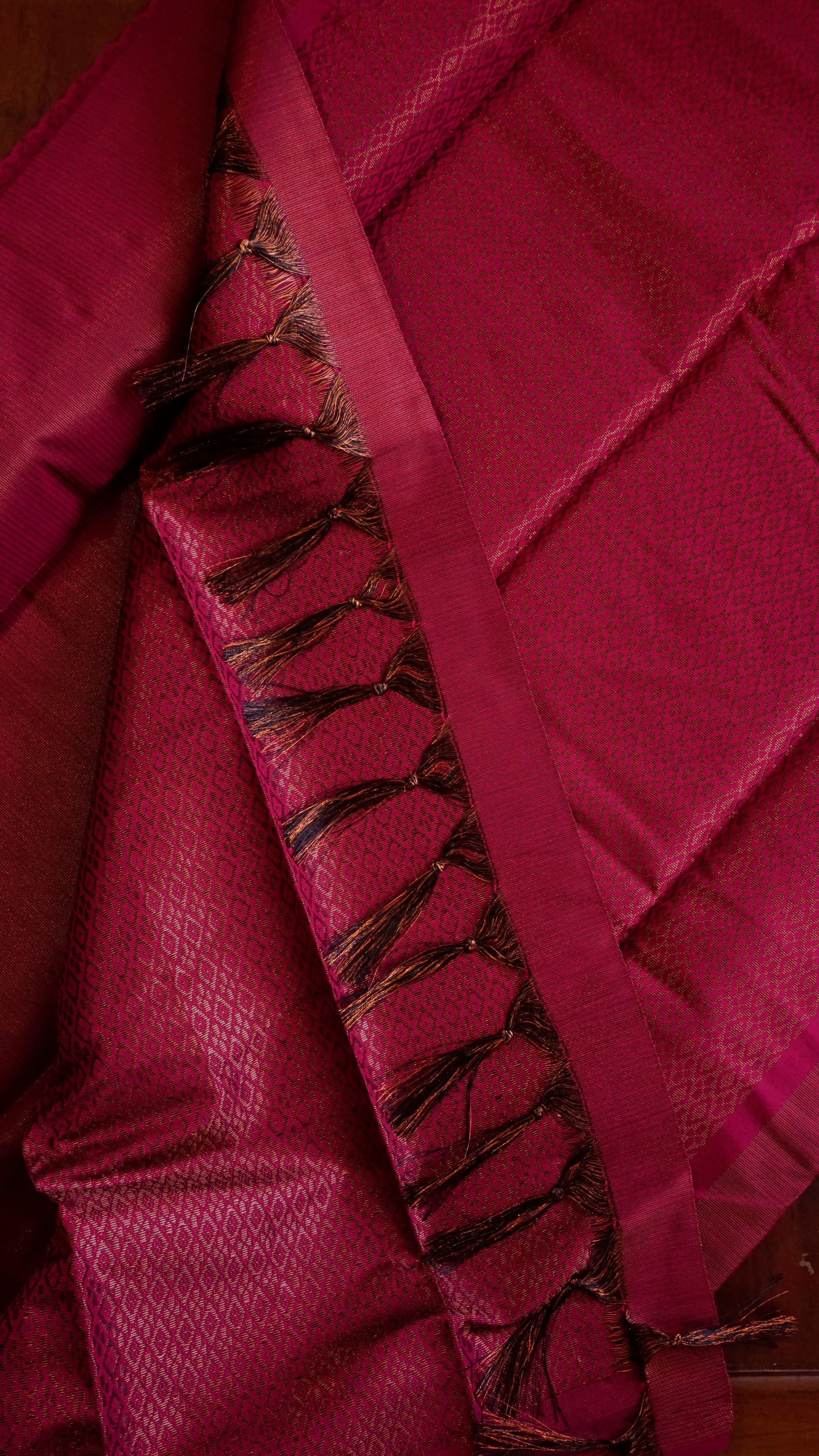 This rich and majestic saree features golden zari designs all over the body and is woven in a deep wine/magenta tint. It has a refined finish thanks to the delicate diamond-shaped woven design, and the simple zari border elegantly balances the ensemble.