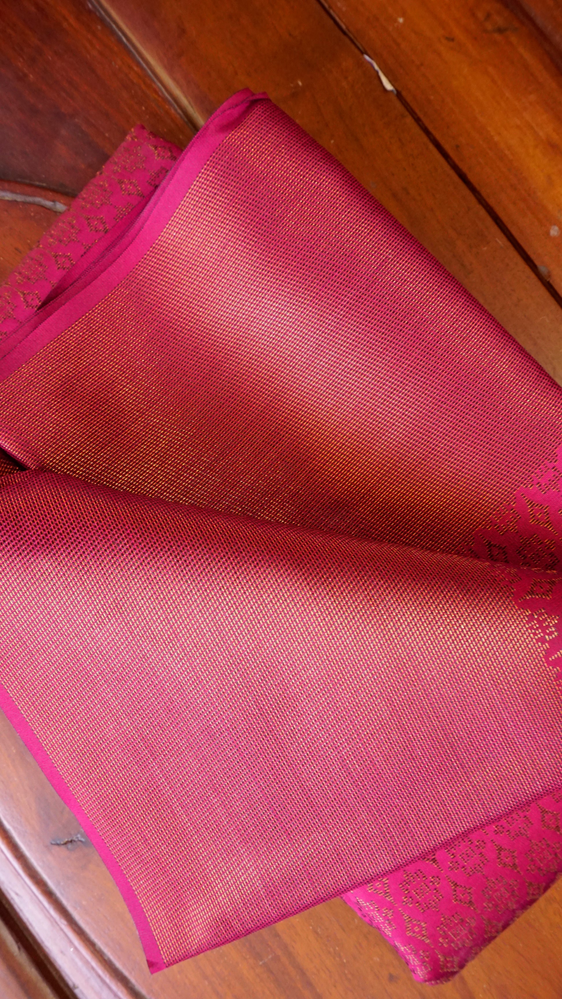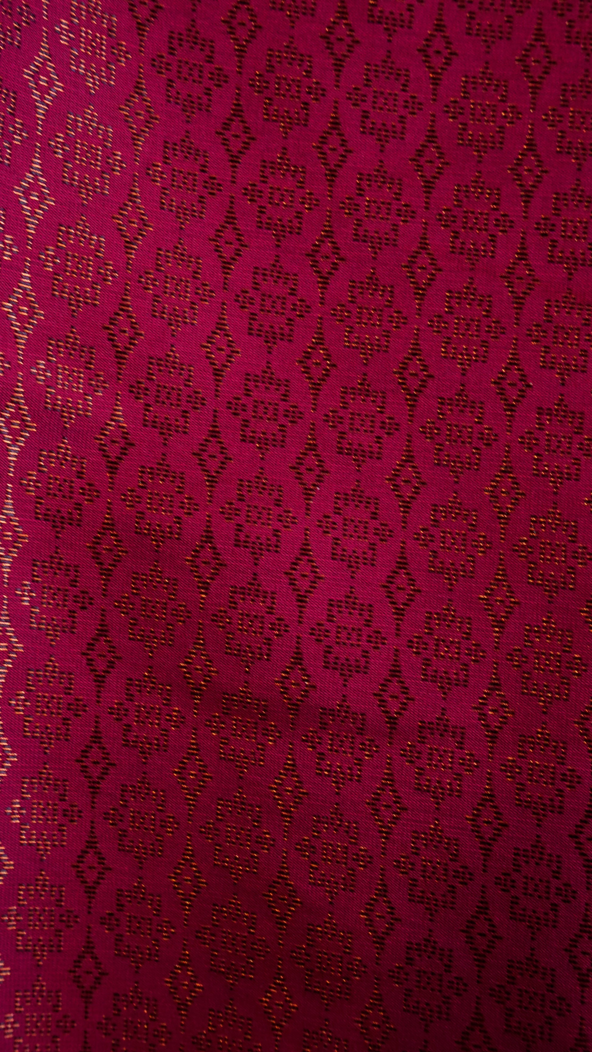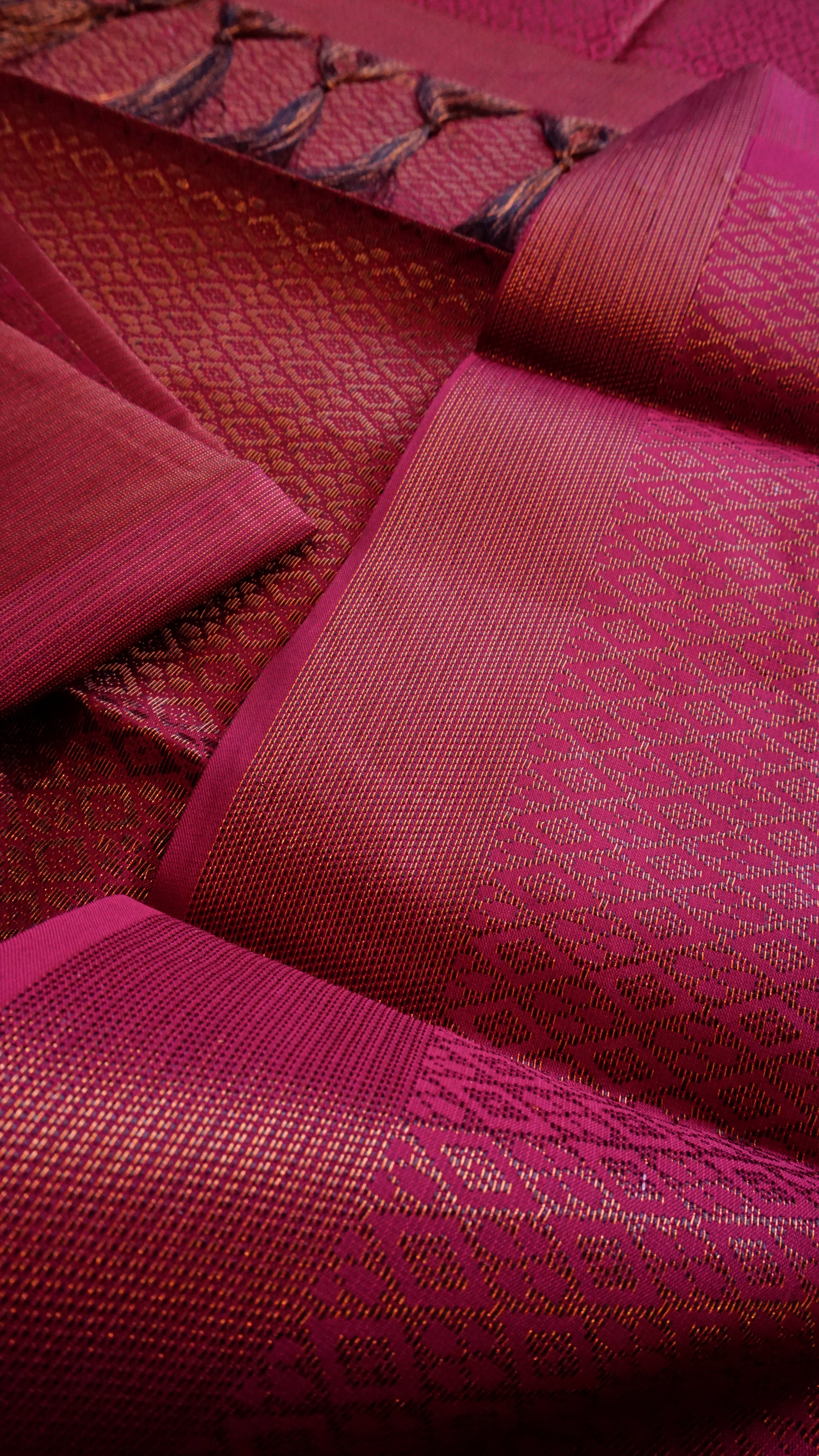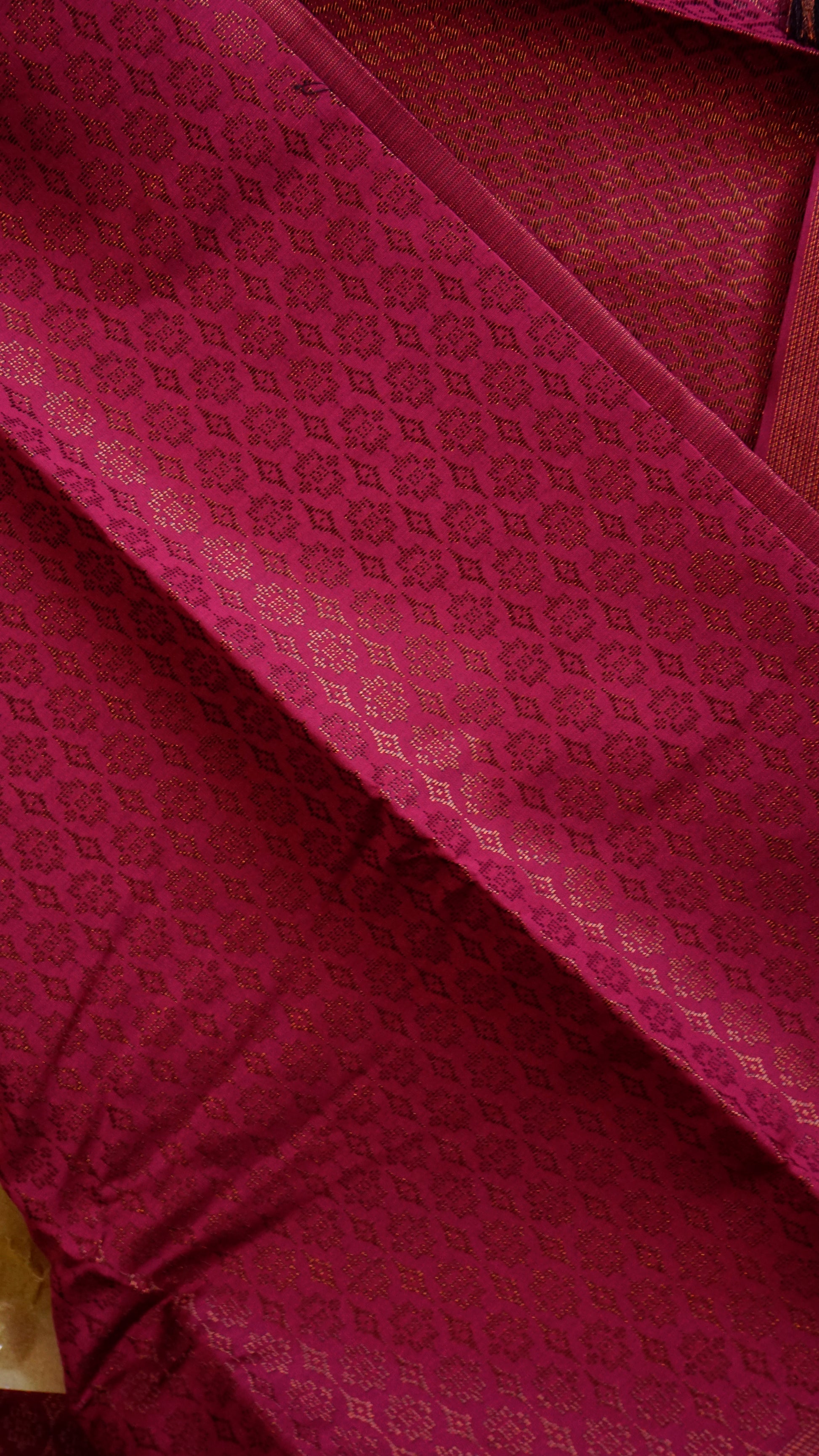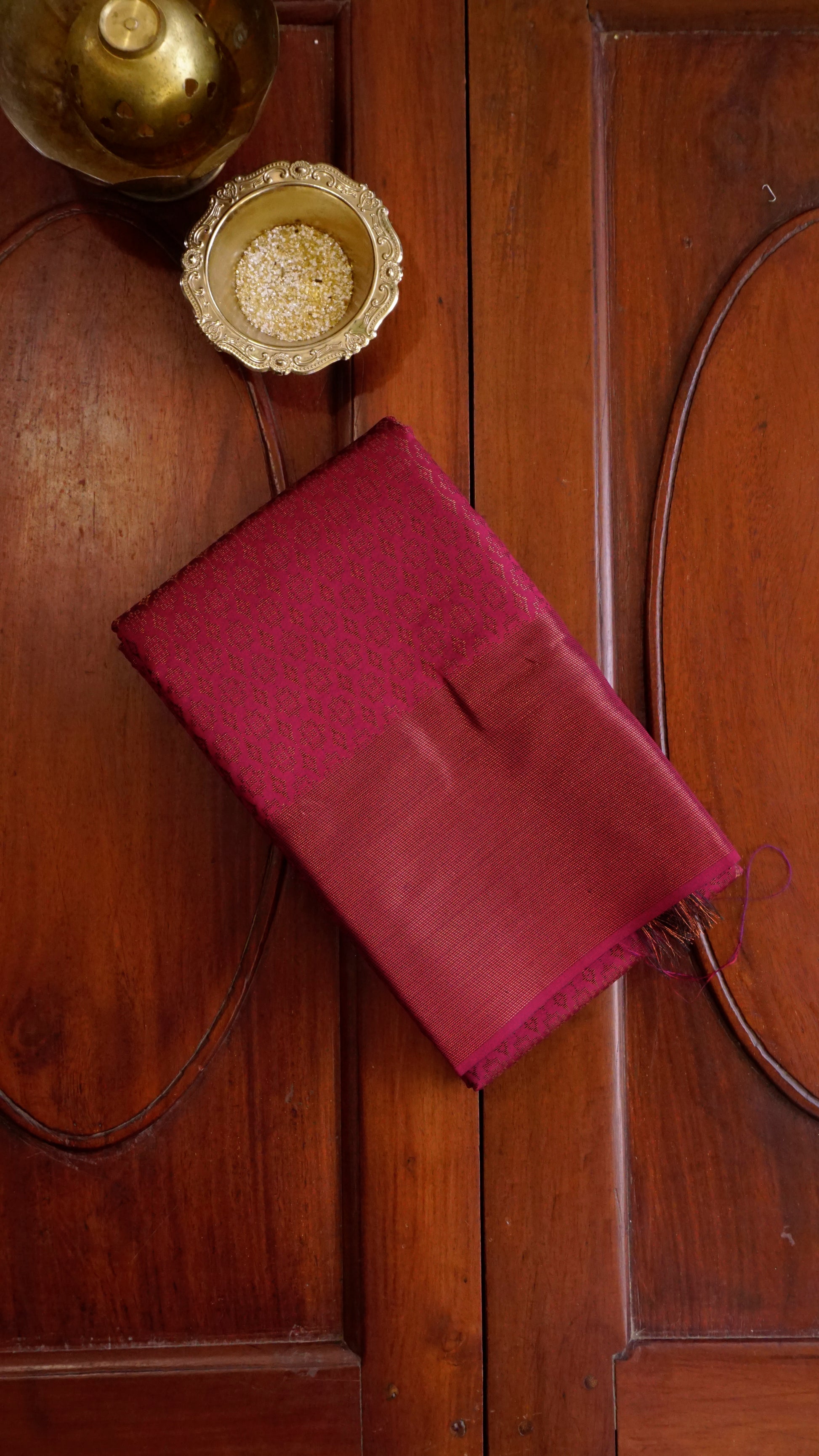 This rich and majestic saree features golden zari designs all over the body and is woven in a deep wine/magenta tint. It has a refined finish thanks to the delicate diamond-shaped woven design, and the simple zari border elegantly balances the ensemble.