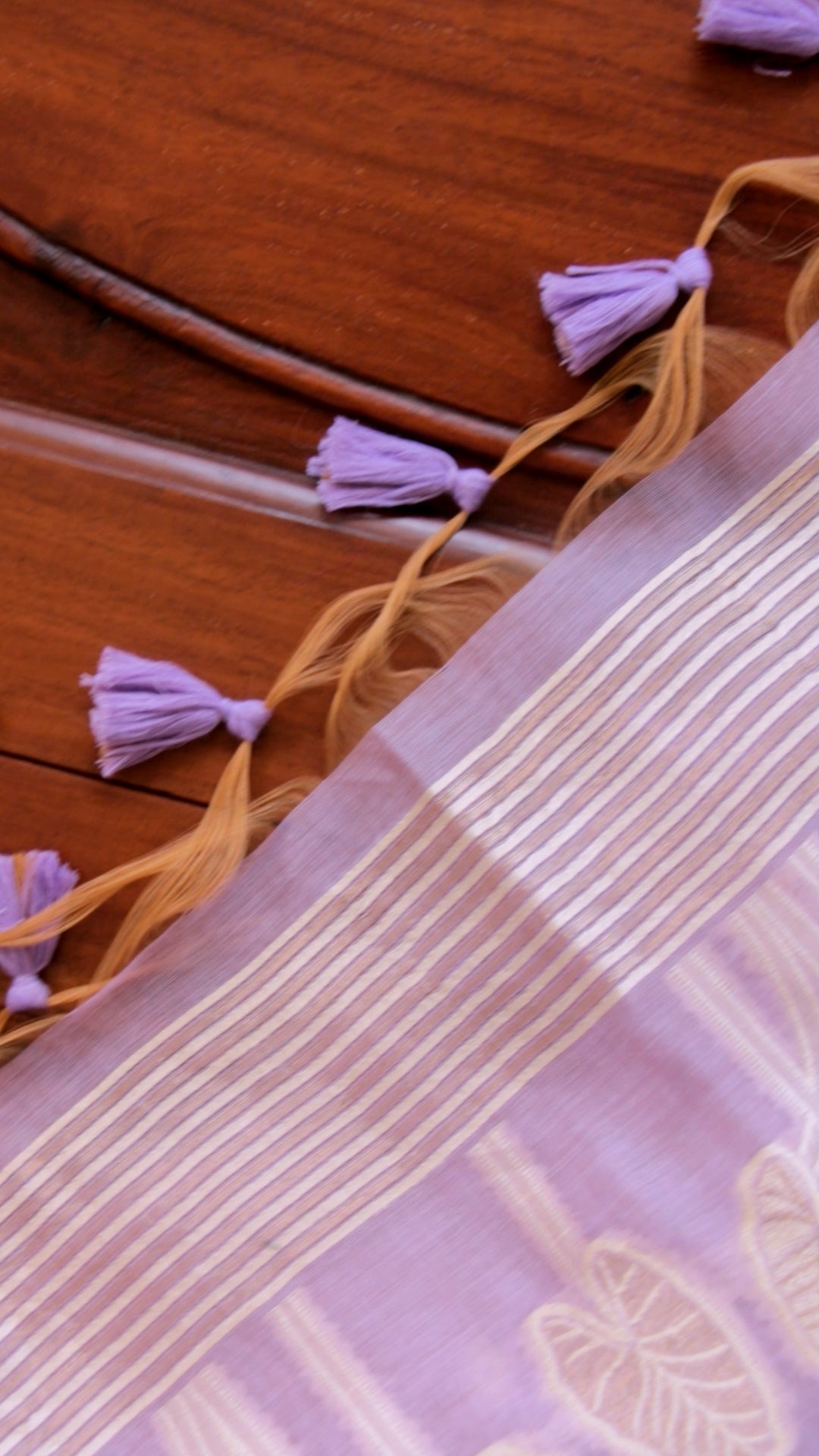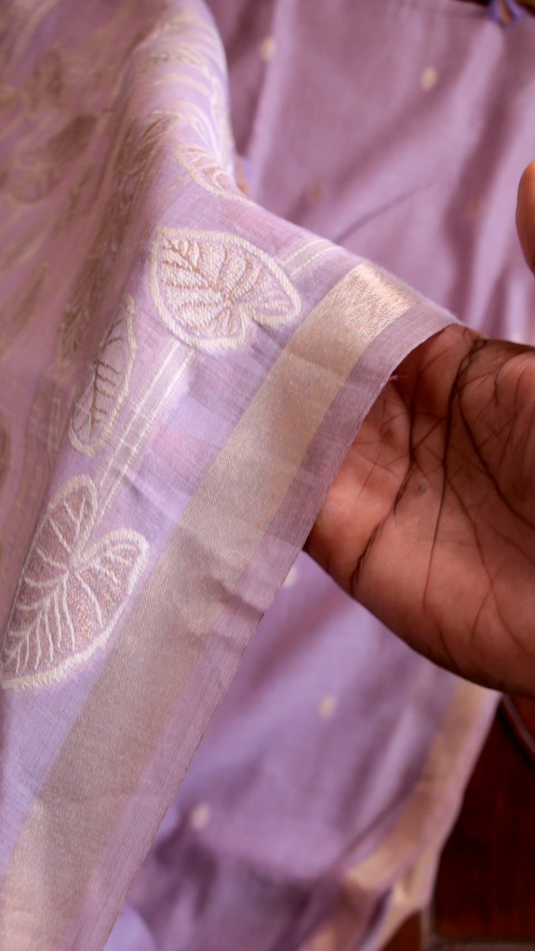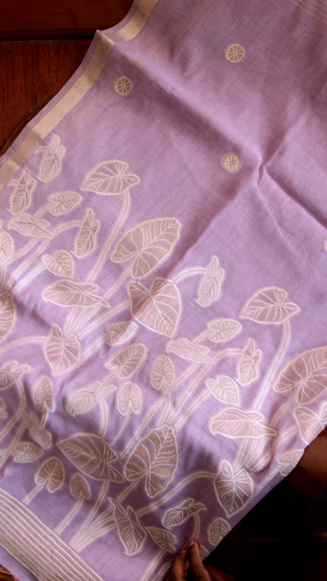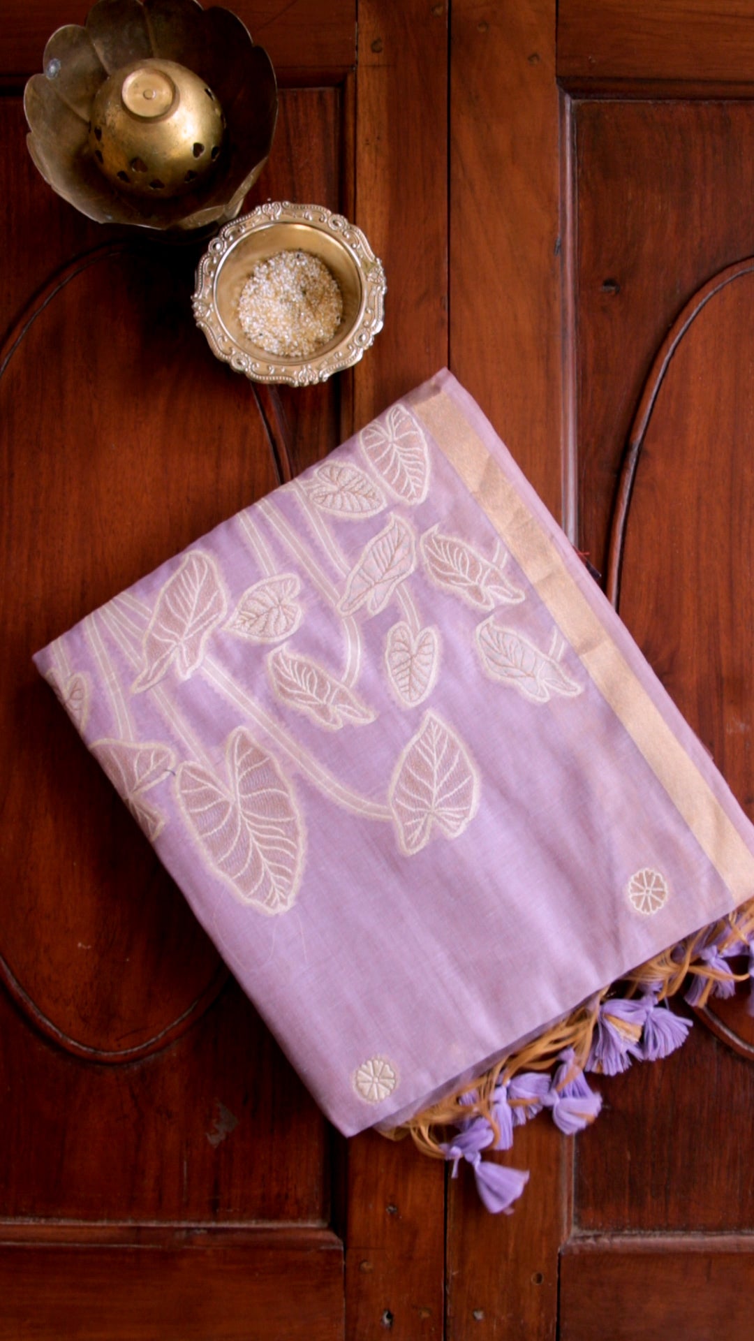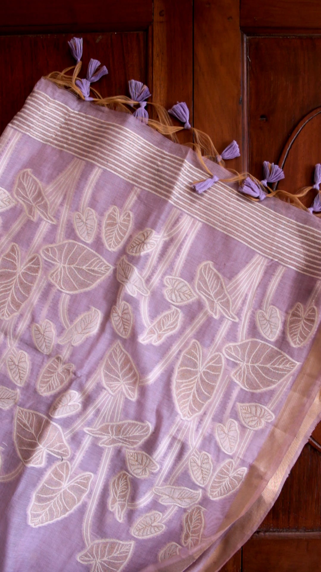 Design: Large, hand-embroidered designs that resemble leaves—possibly taro leaves—adorn the saree's body. The pattern stands out because the embroidery is done in a contrasting hue that resembles soft gold thread or bright green. The same embroidered leaf design is also present on the pallu, the ornamental finishing element.