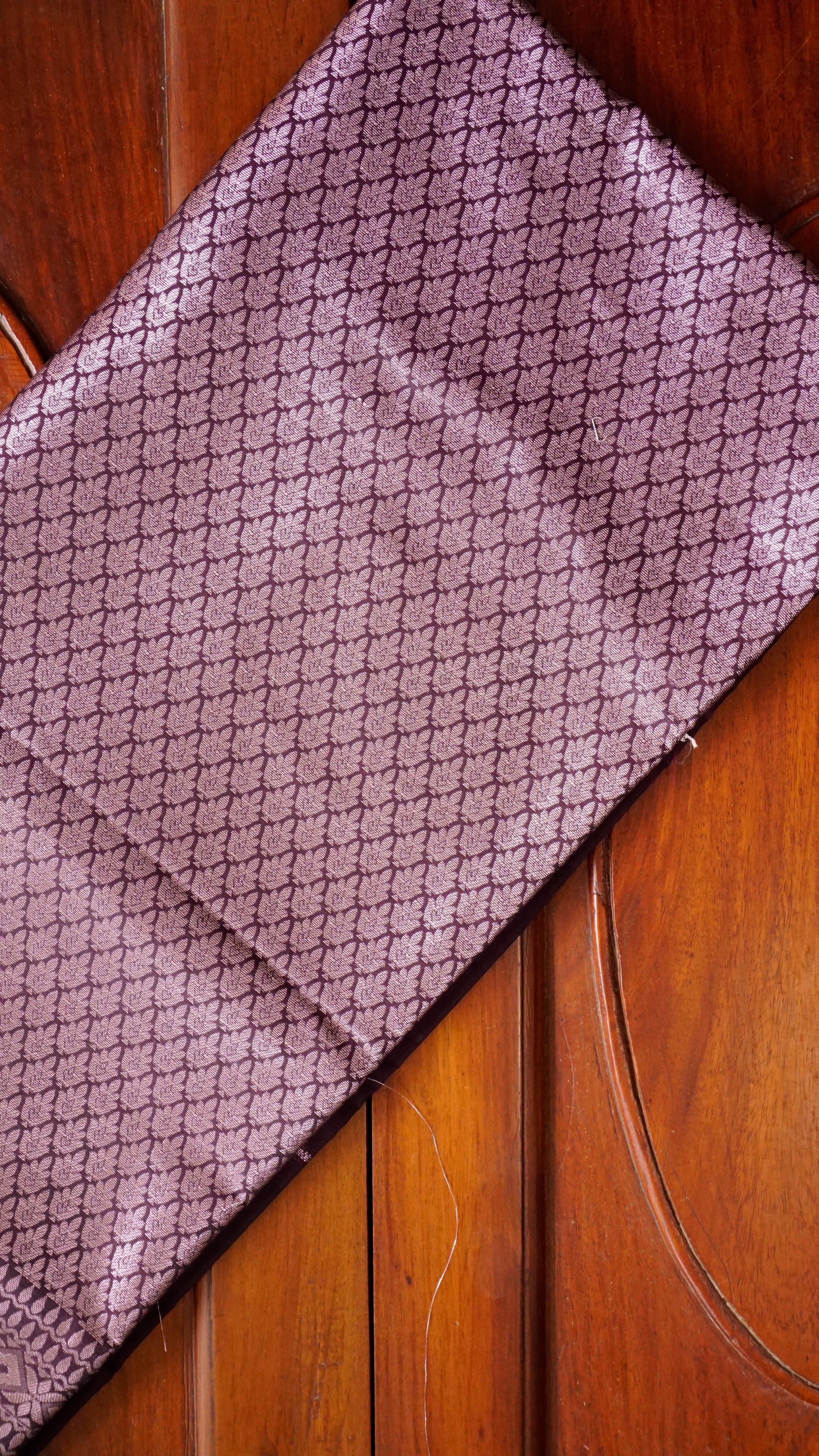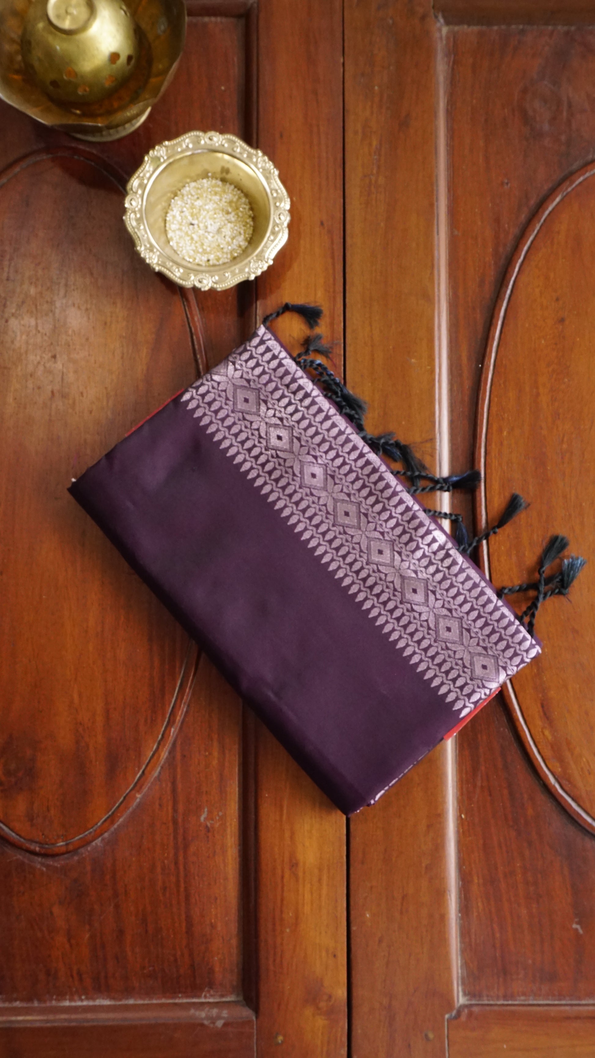 With its silver zari work and royal purple semi-silk saree, this sophisticated piece adds classic elegance to your festive attire.