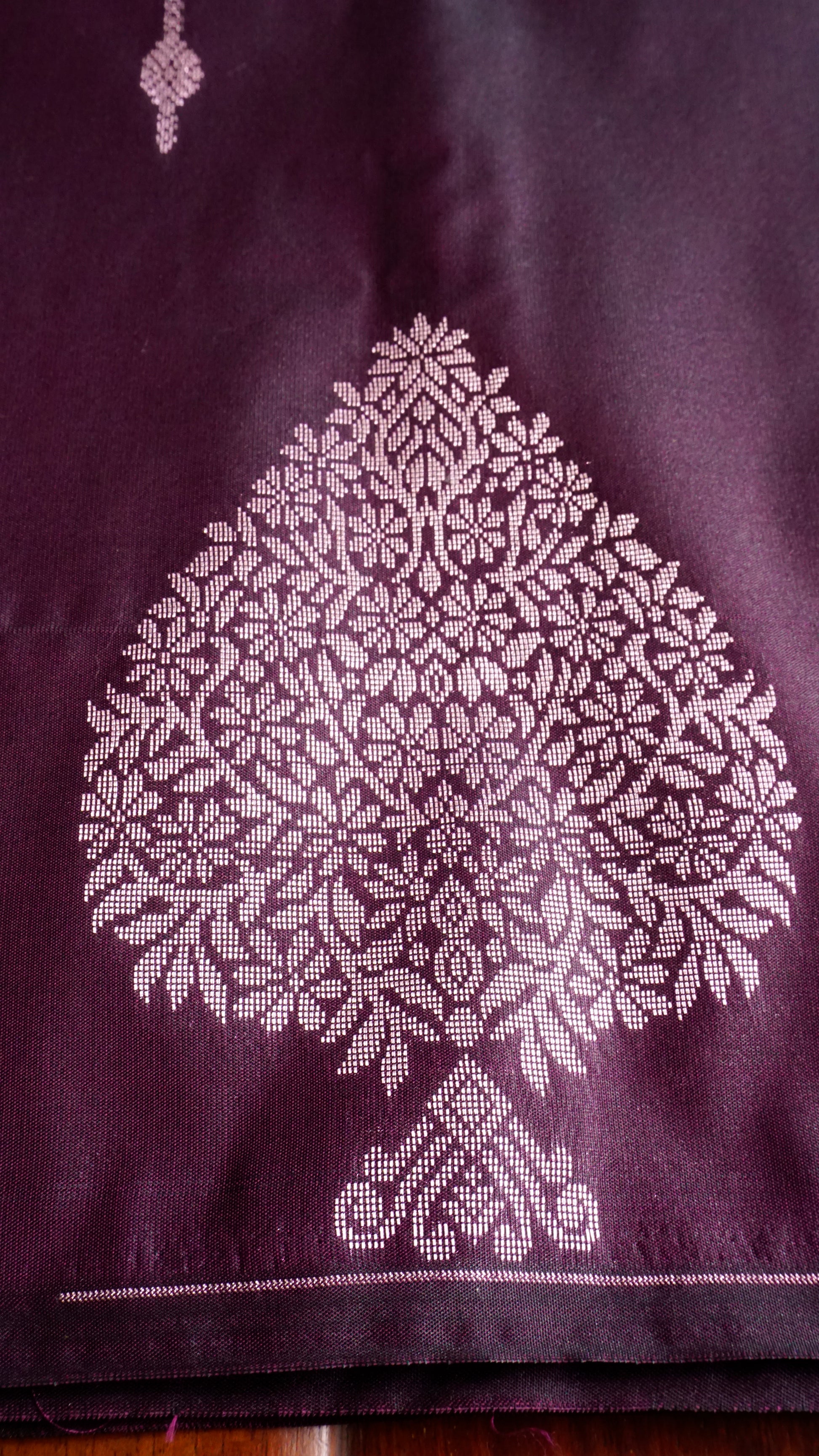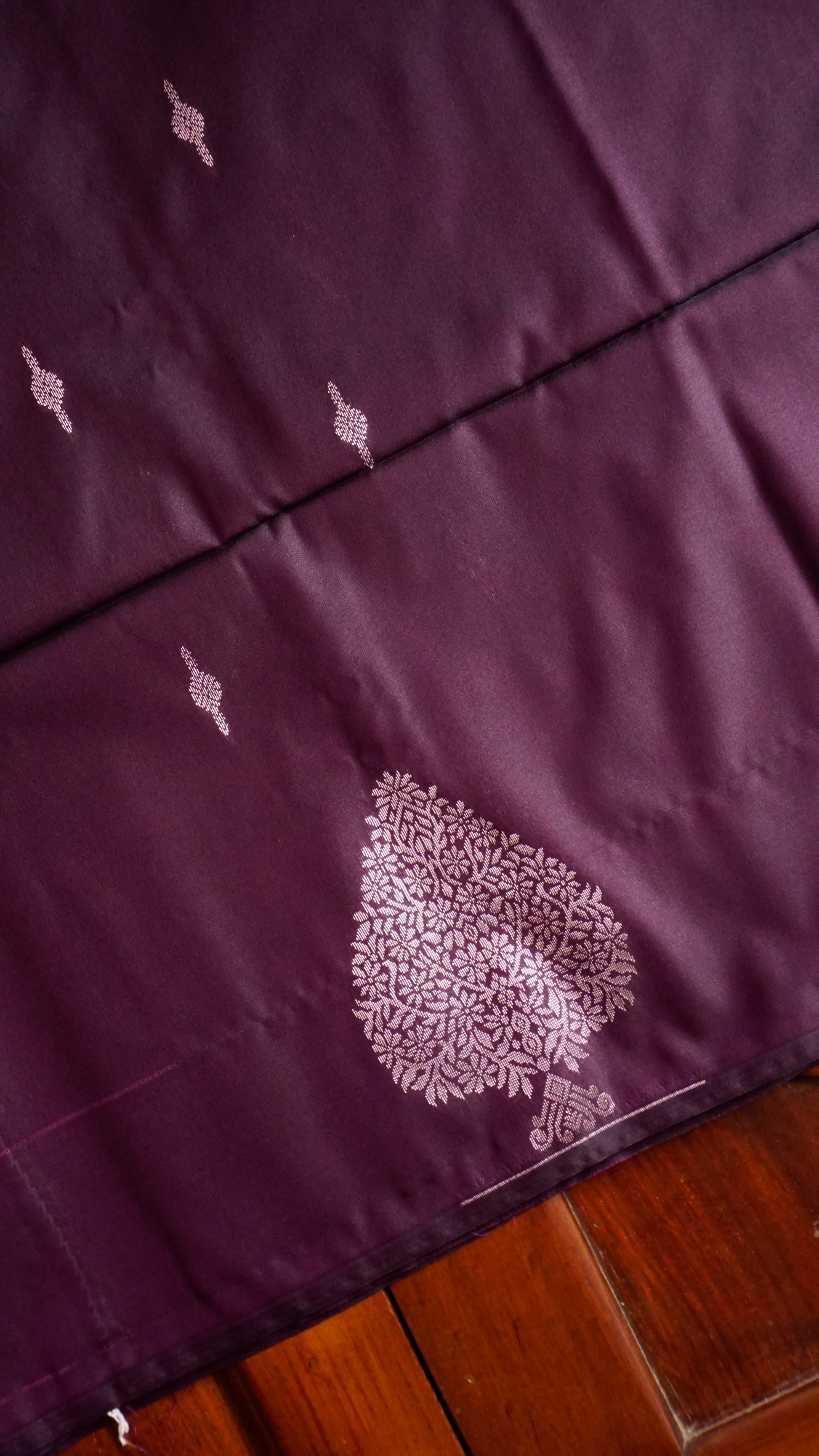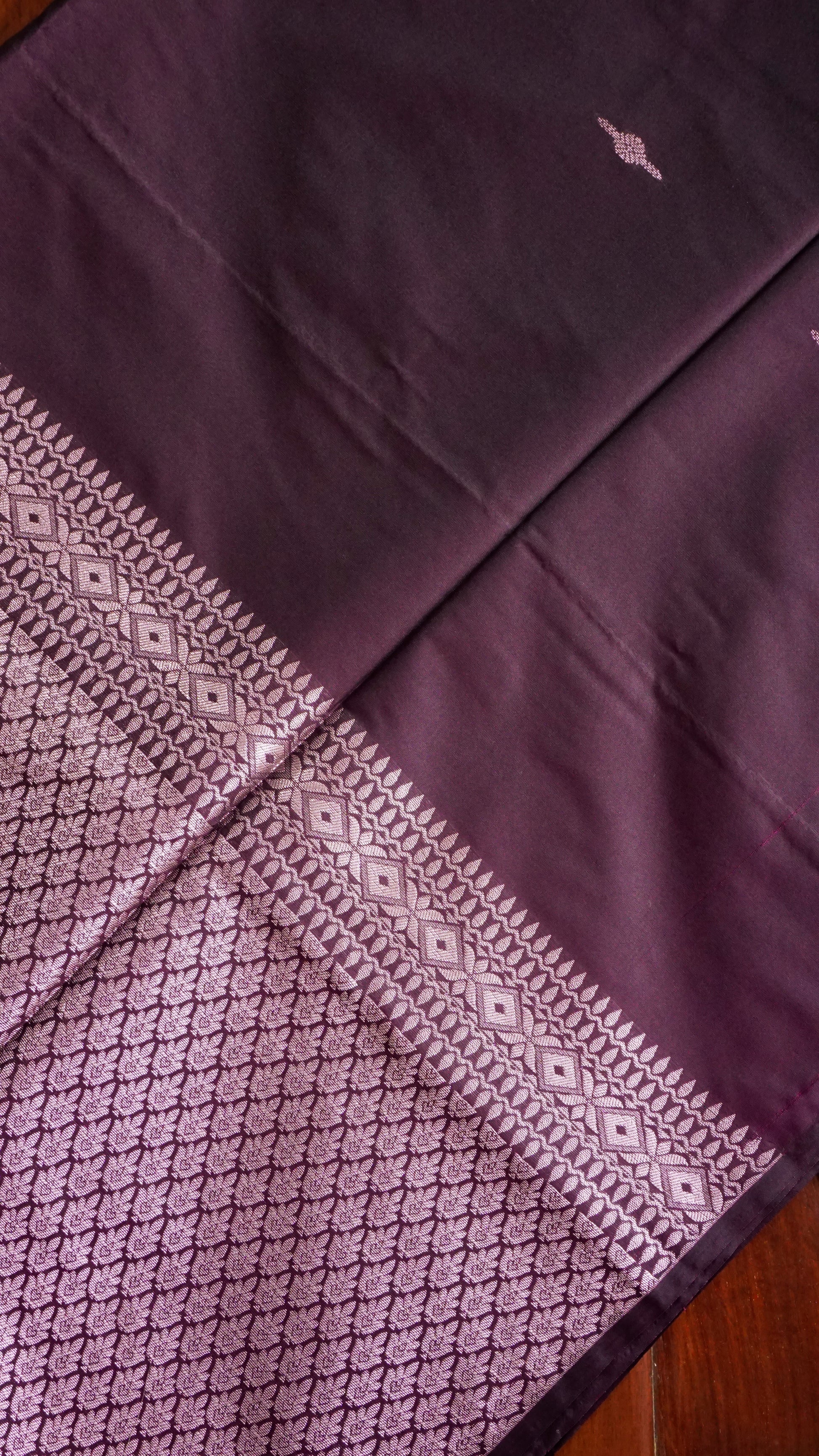 The body has a silver zari leaf motif throughout, which adds a textured yet elegant look.  The silver zari border, which contrasts with diamond and leaf patterns, adds to the saree's allure.  Pallu: Ideal for festive events, this silver zari design features a towering tree motif that symbolizes prosperity and heritage.  Delicate black tassels are used to finish the piece for a timeless drape.