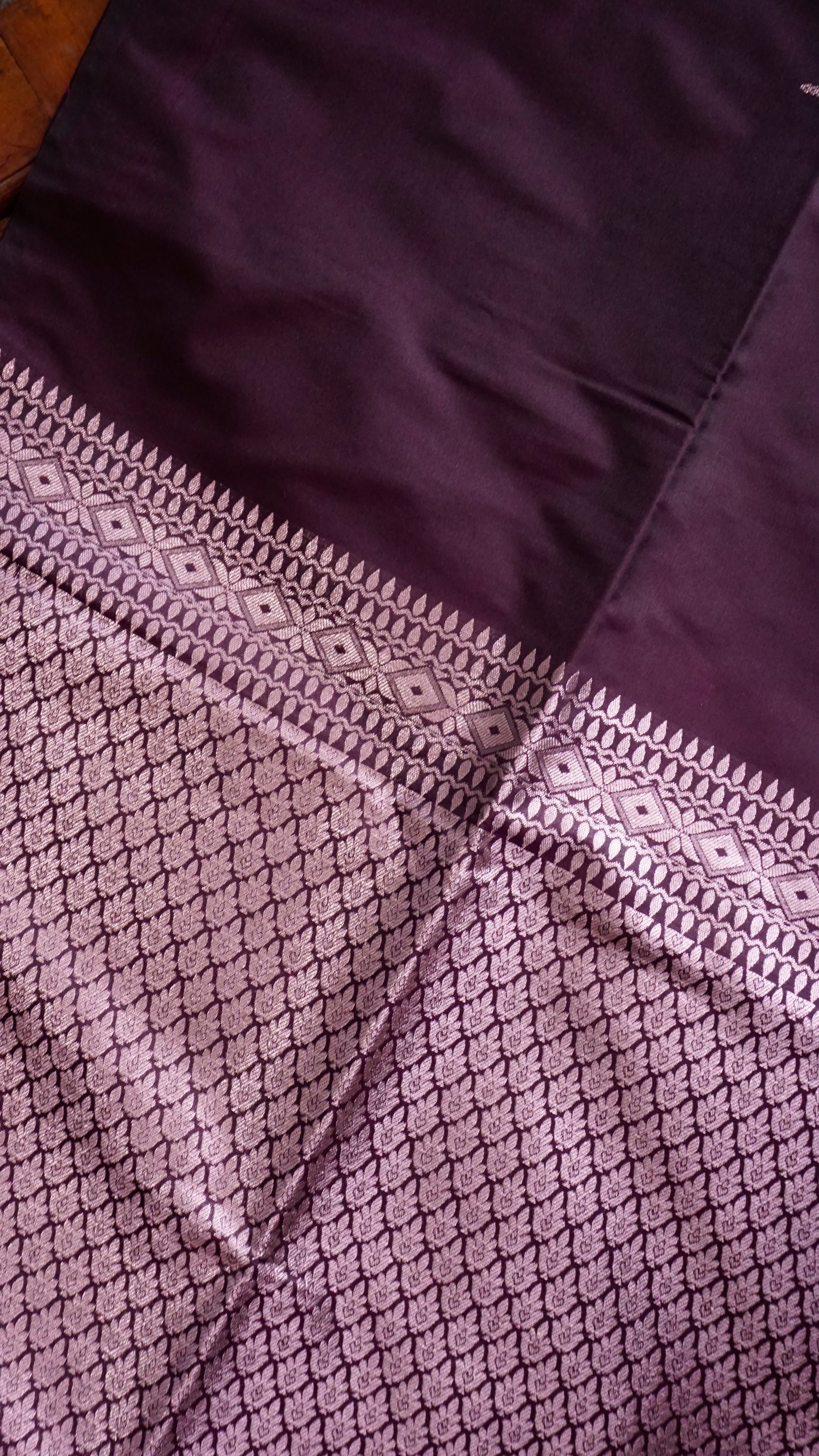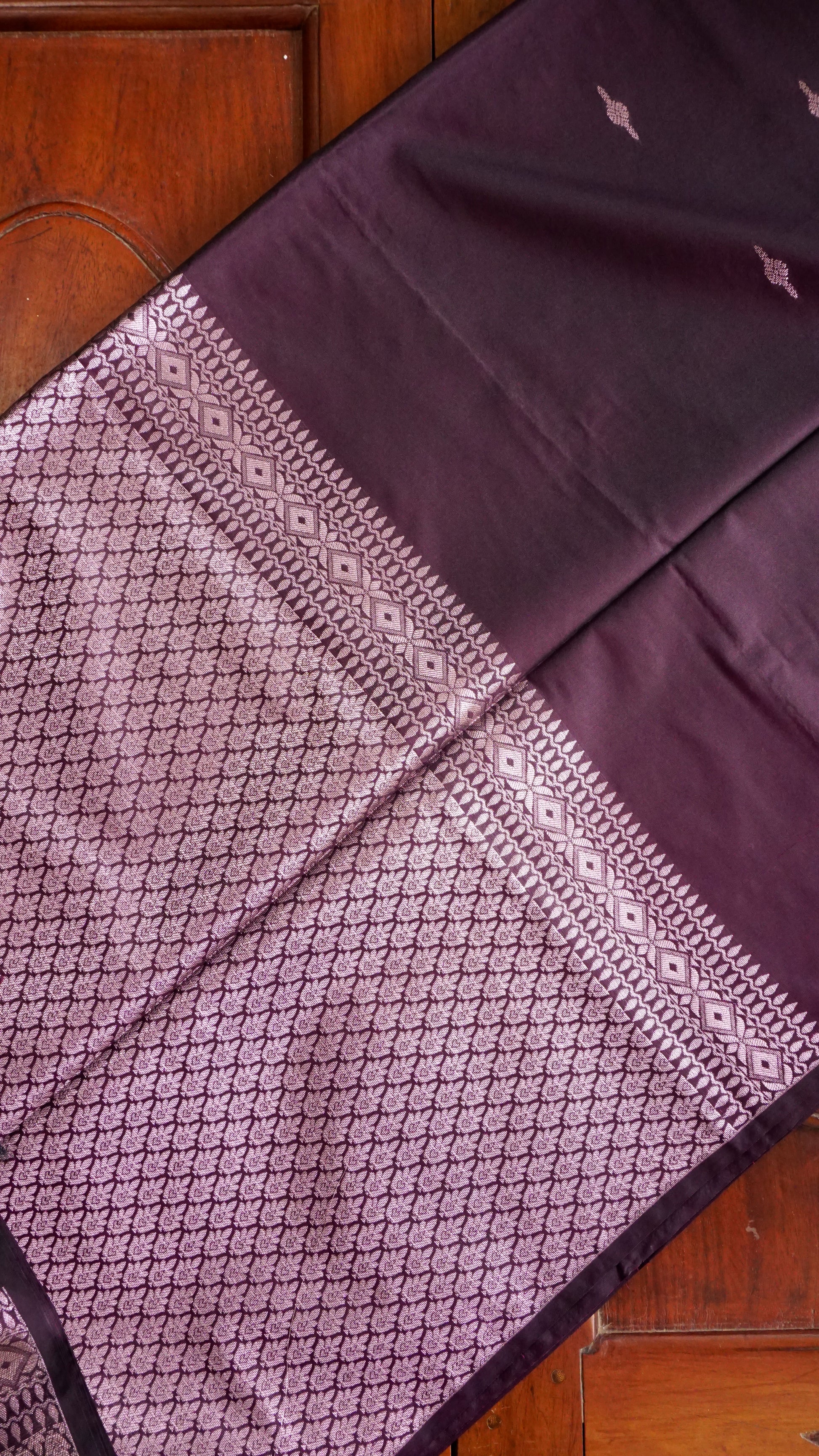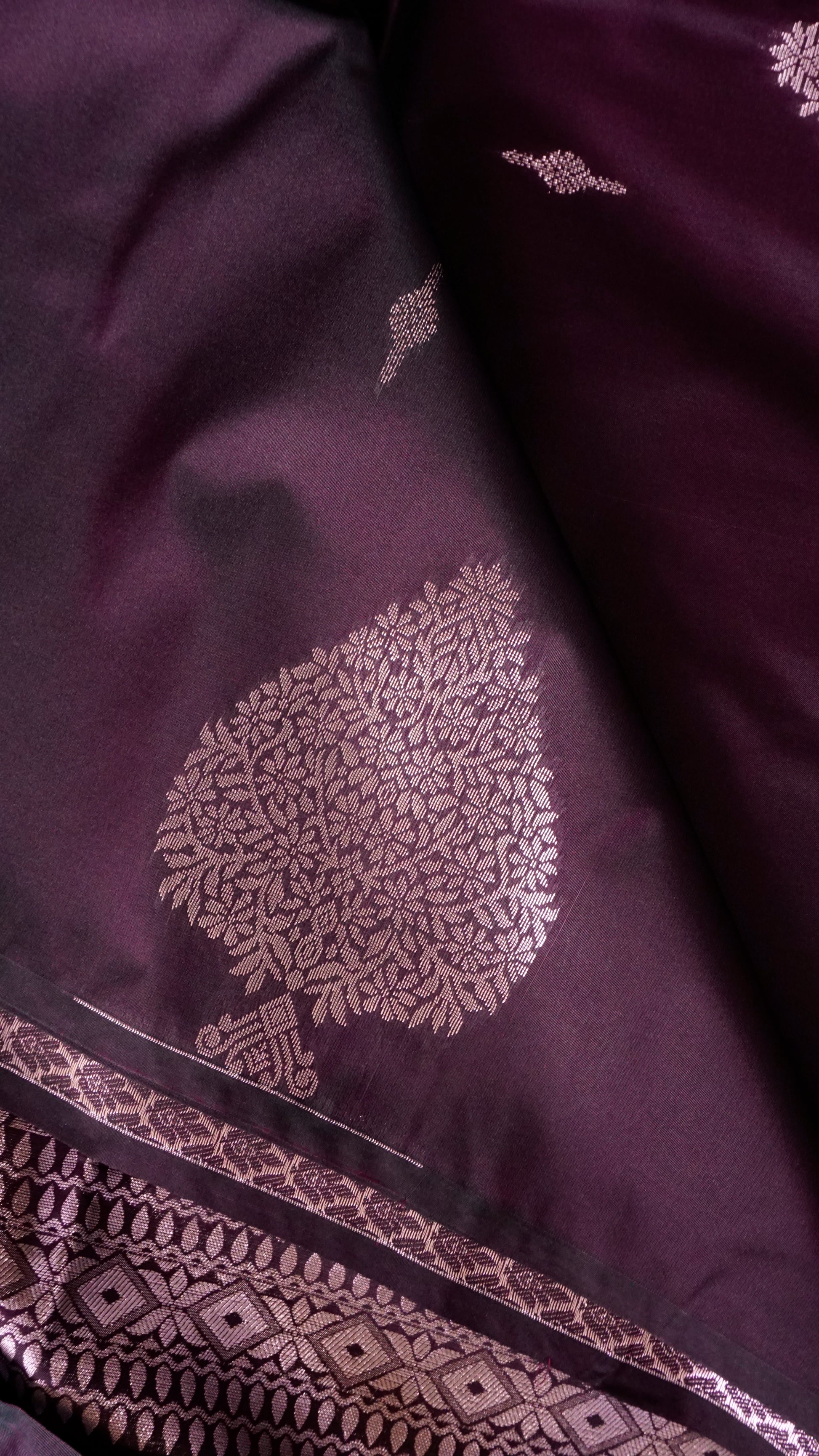 The body has a silver zari leaf motif throughout, which adds a textured yet elegant look.  The silver zari border, which contrasts with diamond and leaf patterns, adds to the saree's allure.  Pallu: Ideal for festive events, this silver zari design features a towering tree motif that symbolizes prosperity and heritage.  Delicate black tassels are used to finish the piece for a timeless drape.